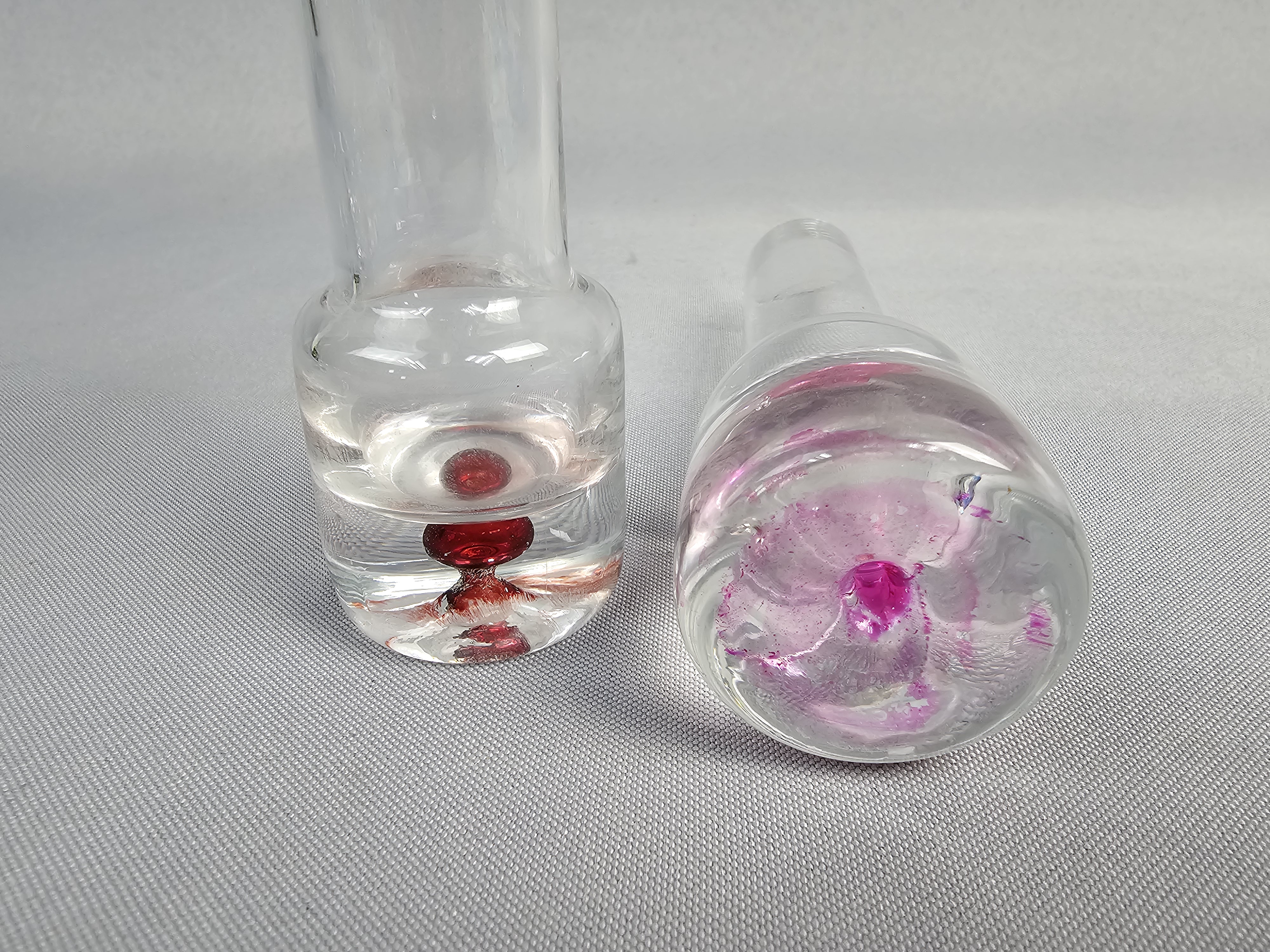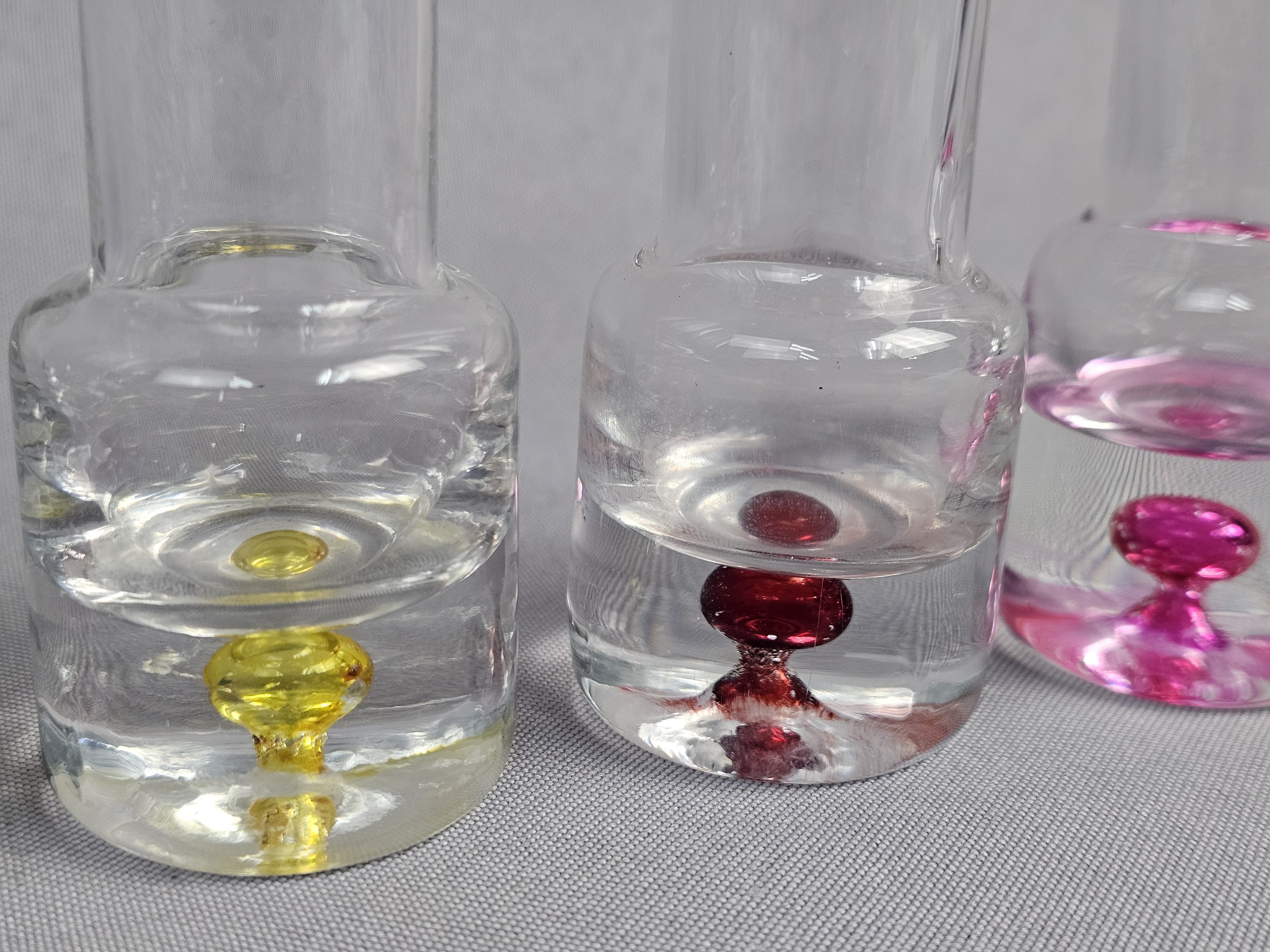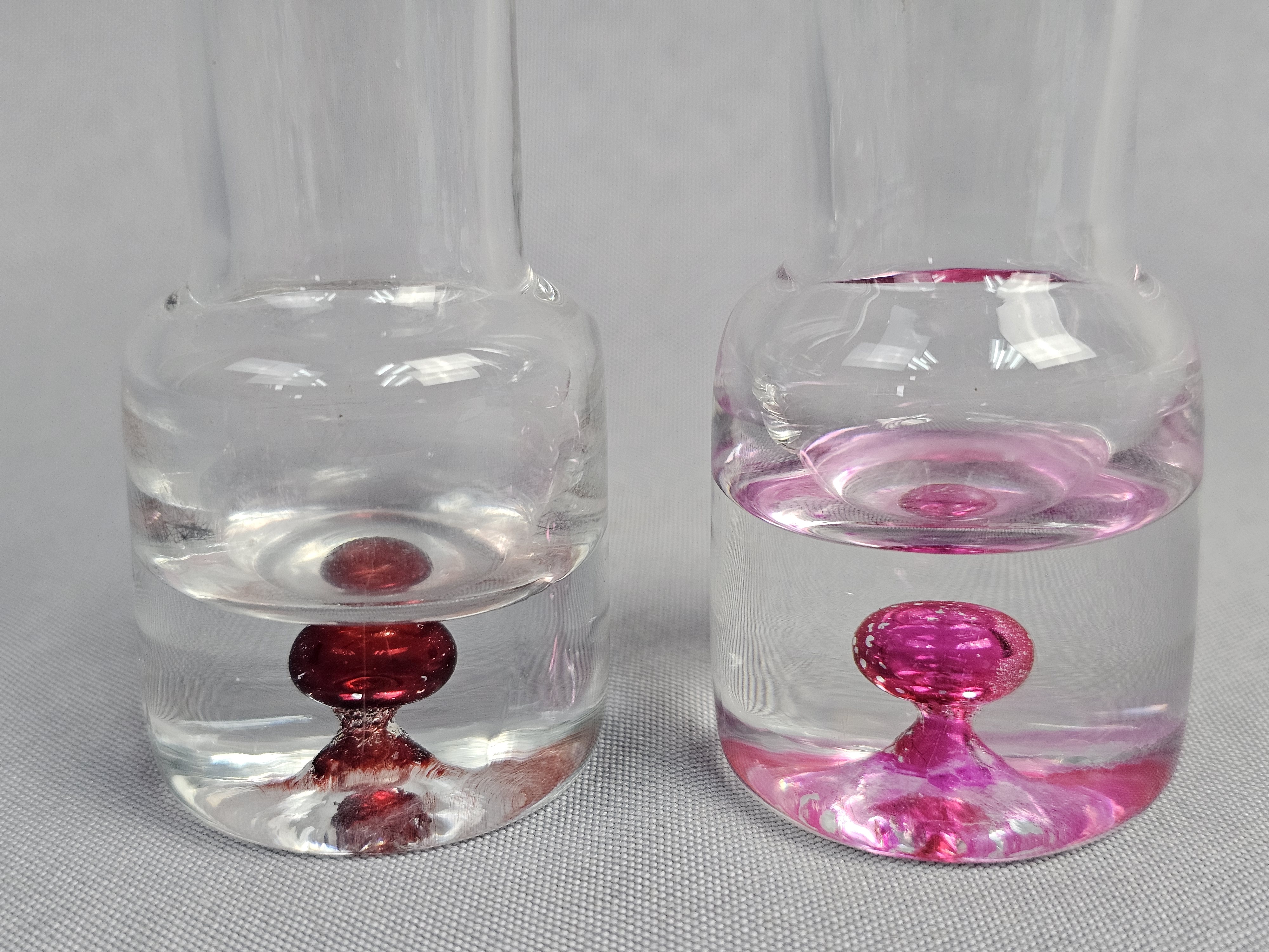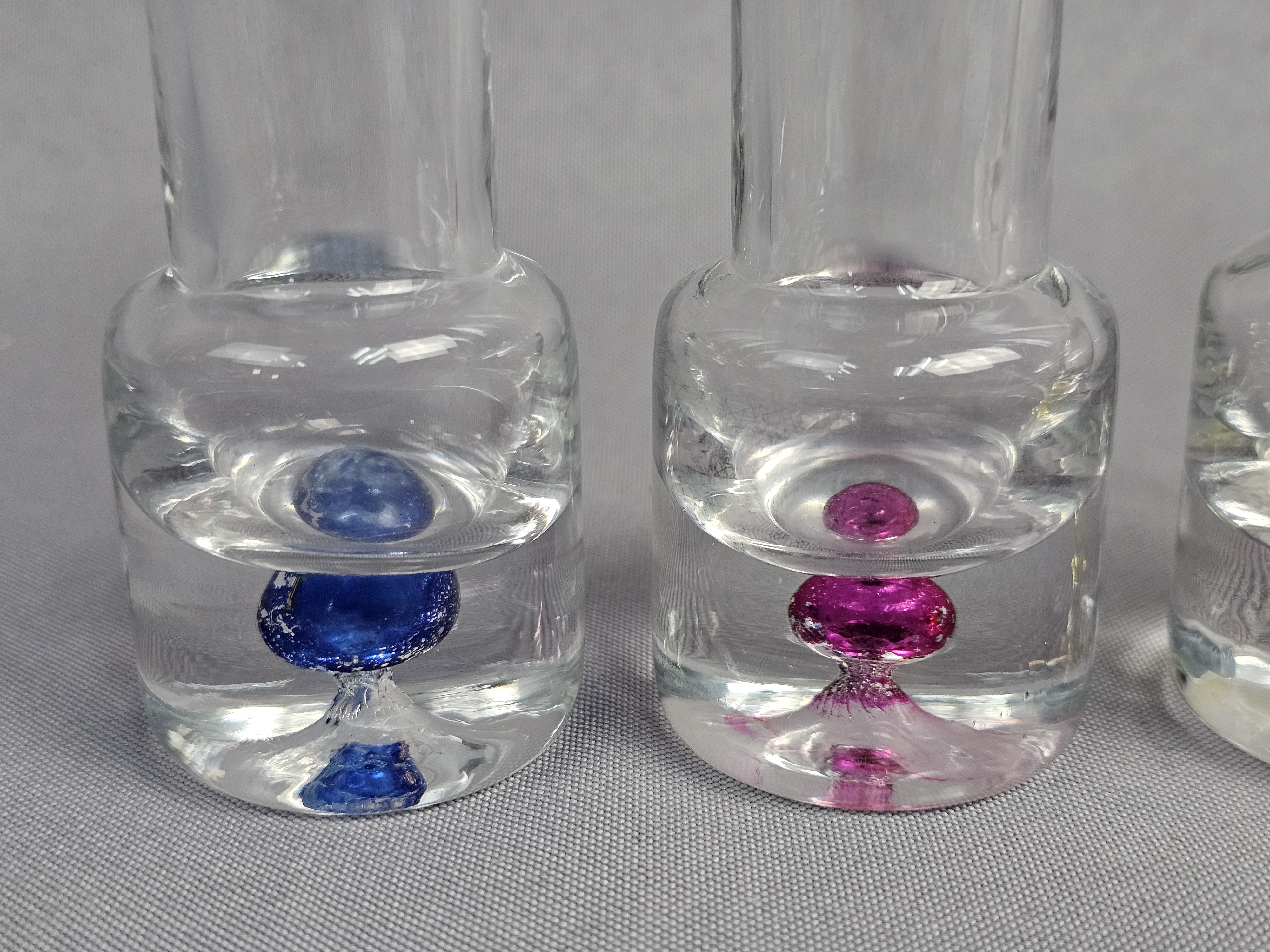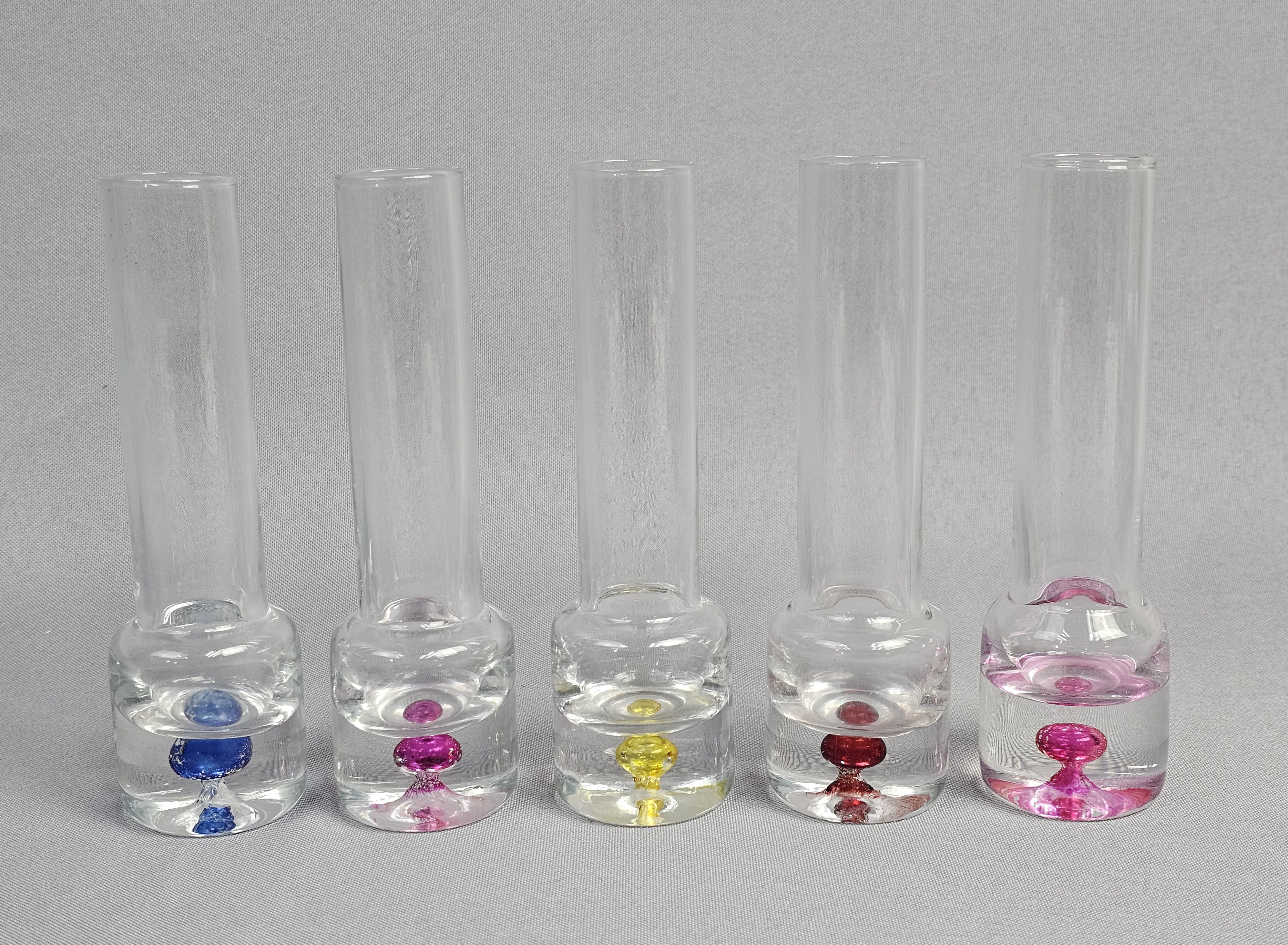 Each vessel is constructed with a tall, slender cylindrical neck and a weighted, solid clear glass base. The base of each features an encased sommerso style colored glass inclusion in a teardrop or controlled bubble form. Height: 5.5 inches The items are in good condition. There are no chips, cracks, or significant surface scratches visible.