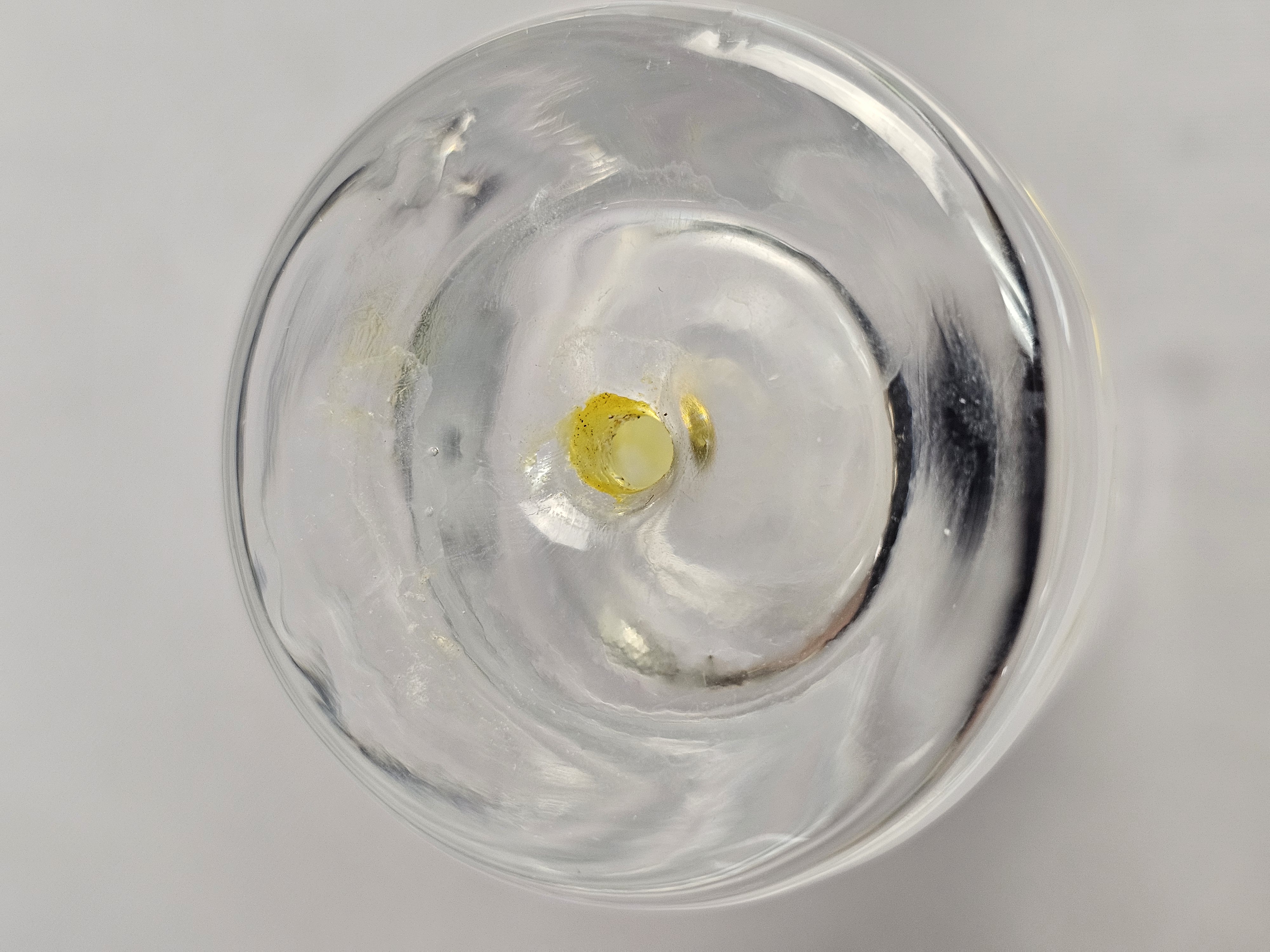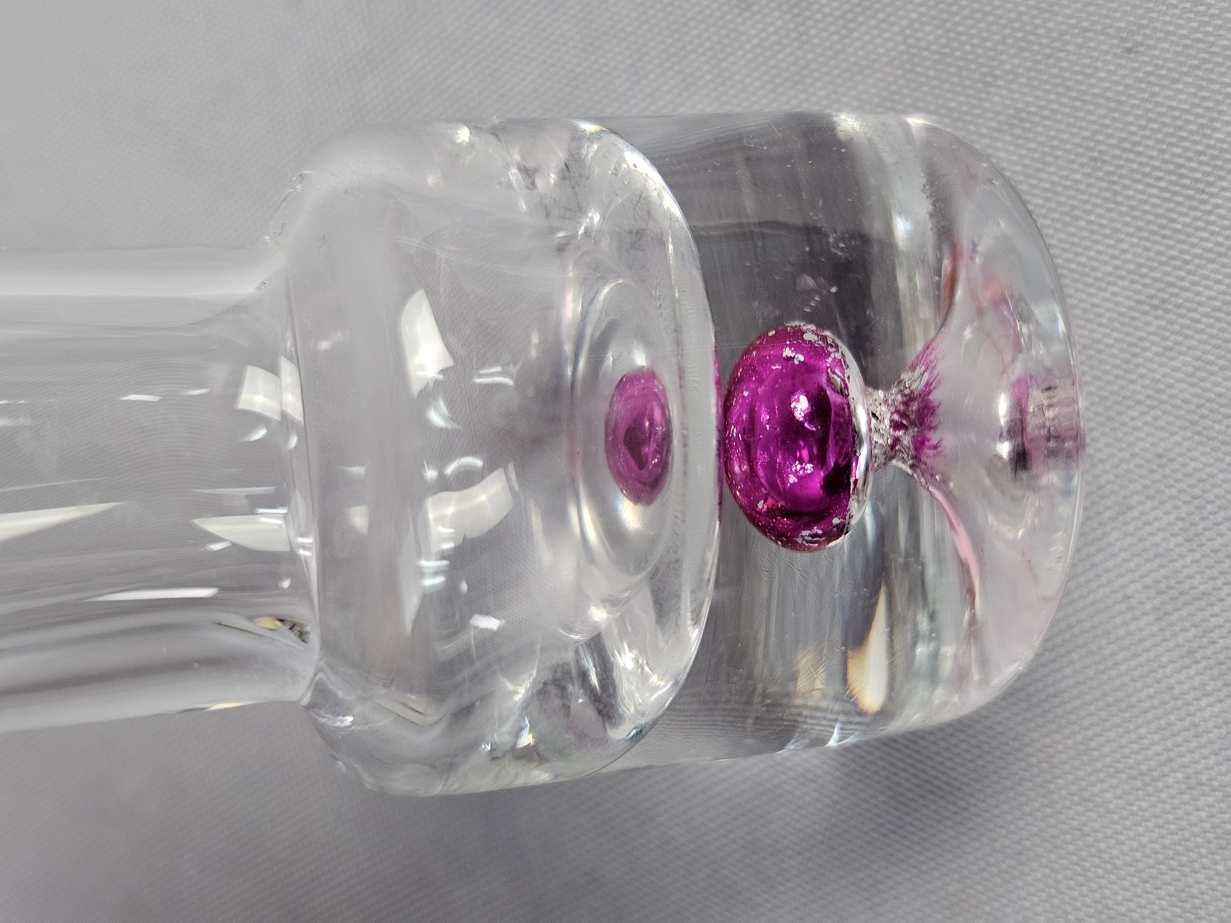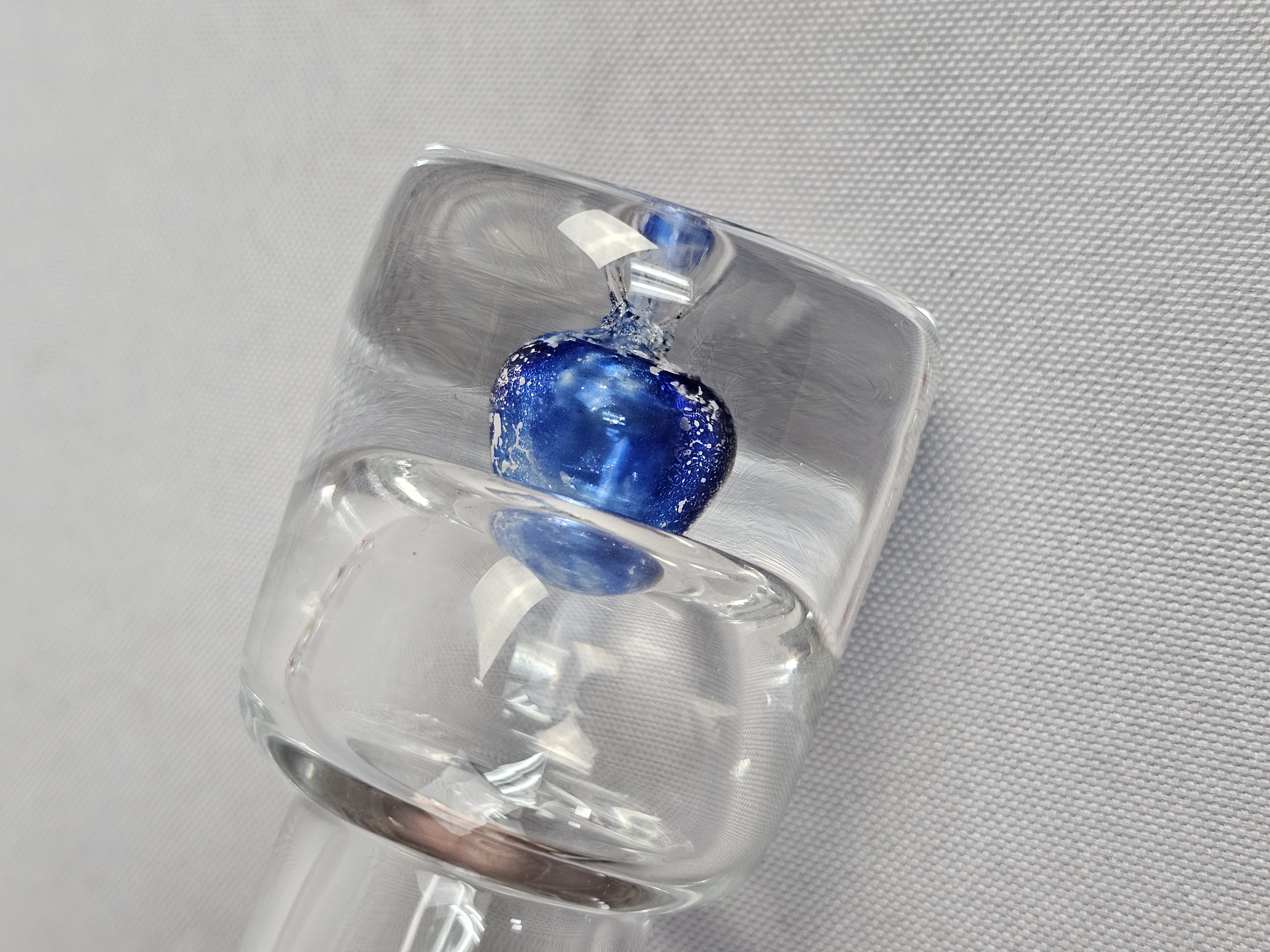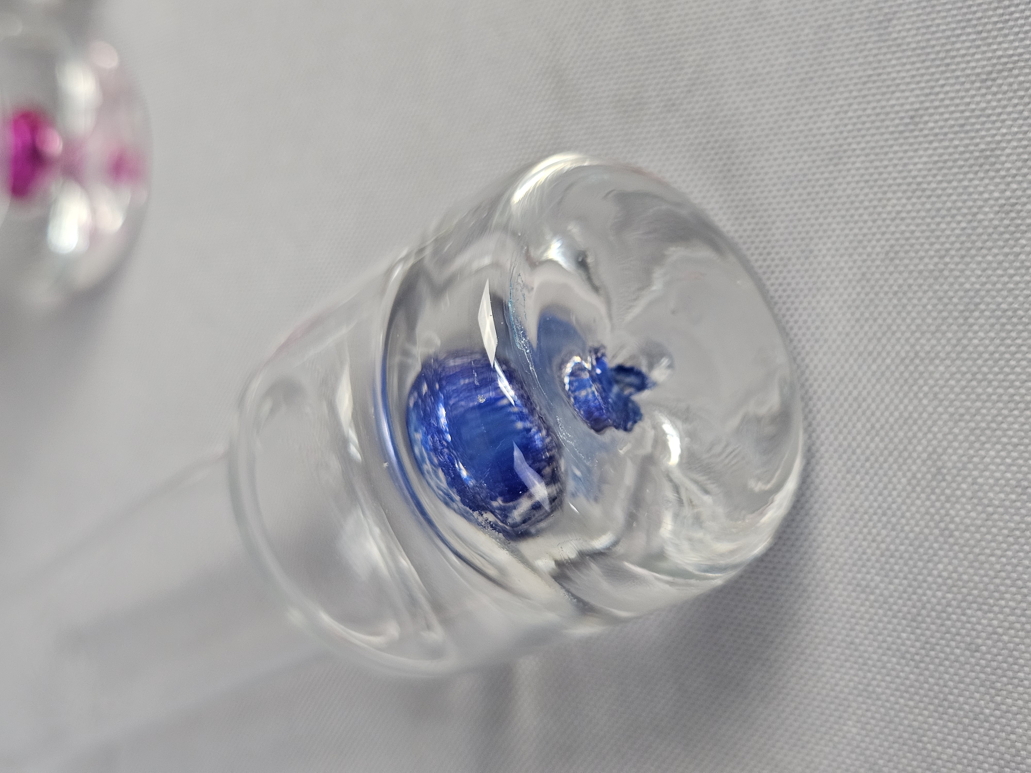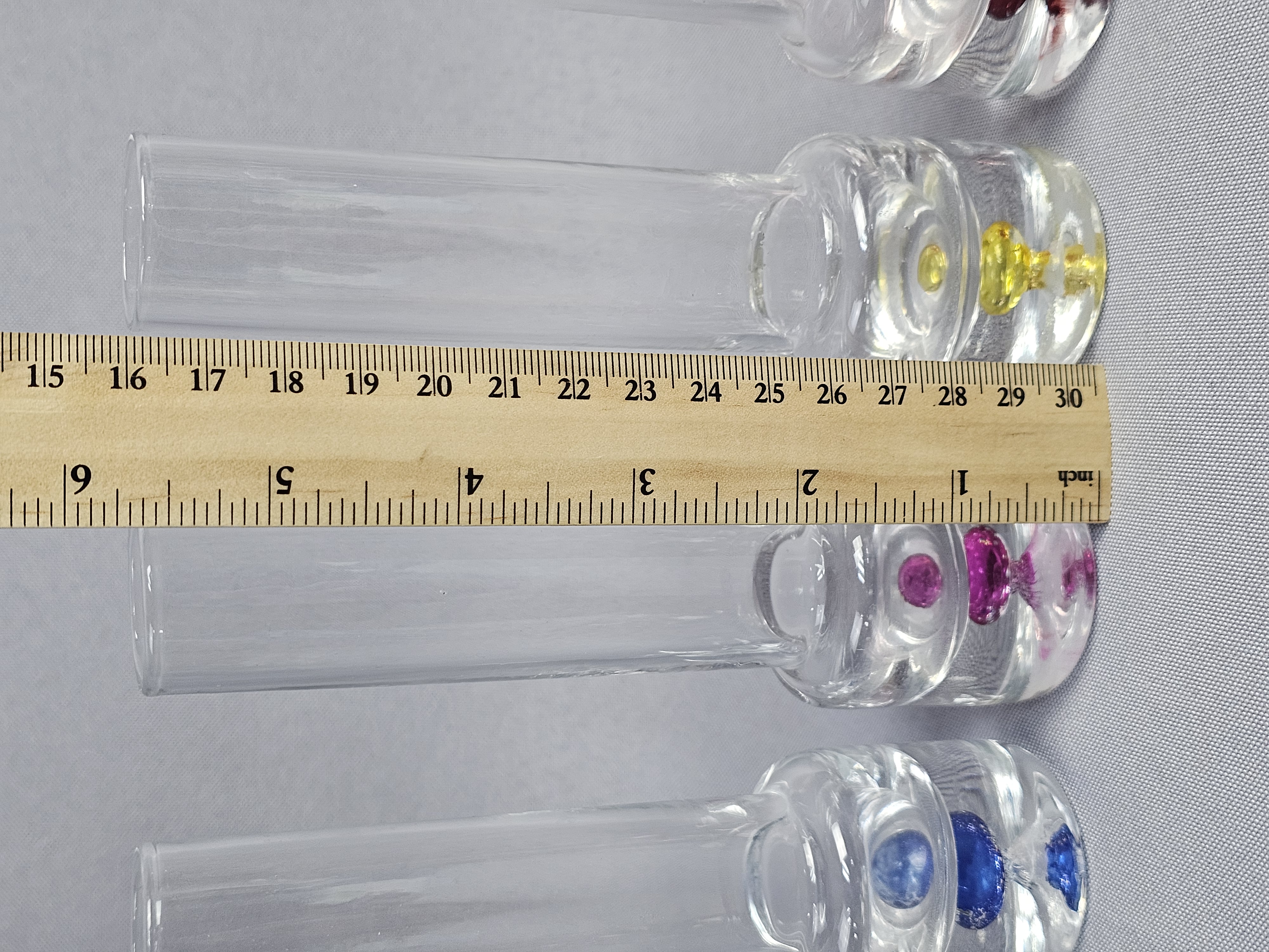 Each vessel is constructed with a tall, slender cylindrical neck and a weighted, solid clear glass base. The base of each features an encased sommerso style colored glass inclusion in a teardrop or controlled bubble form. Height: 5.5 inches The items are in good condition. There are no chips, cracks, or significant surface scratches visible.