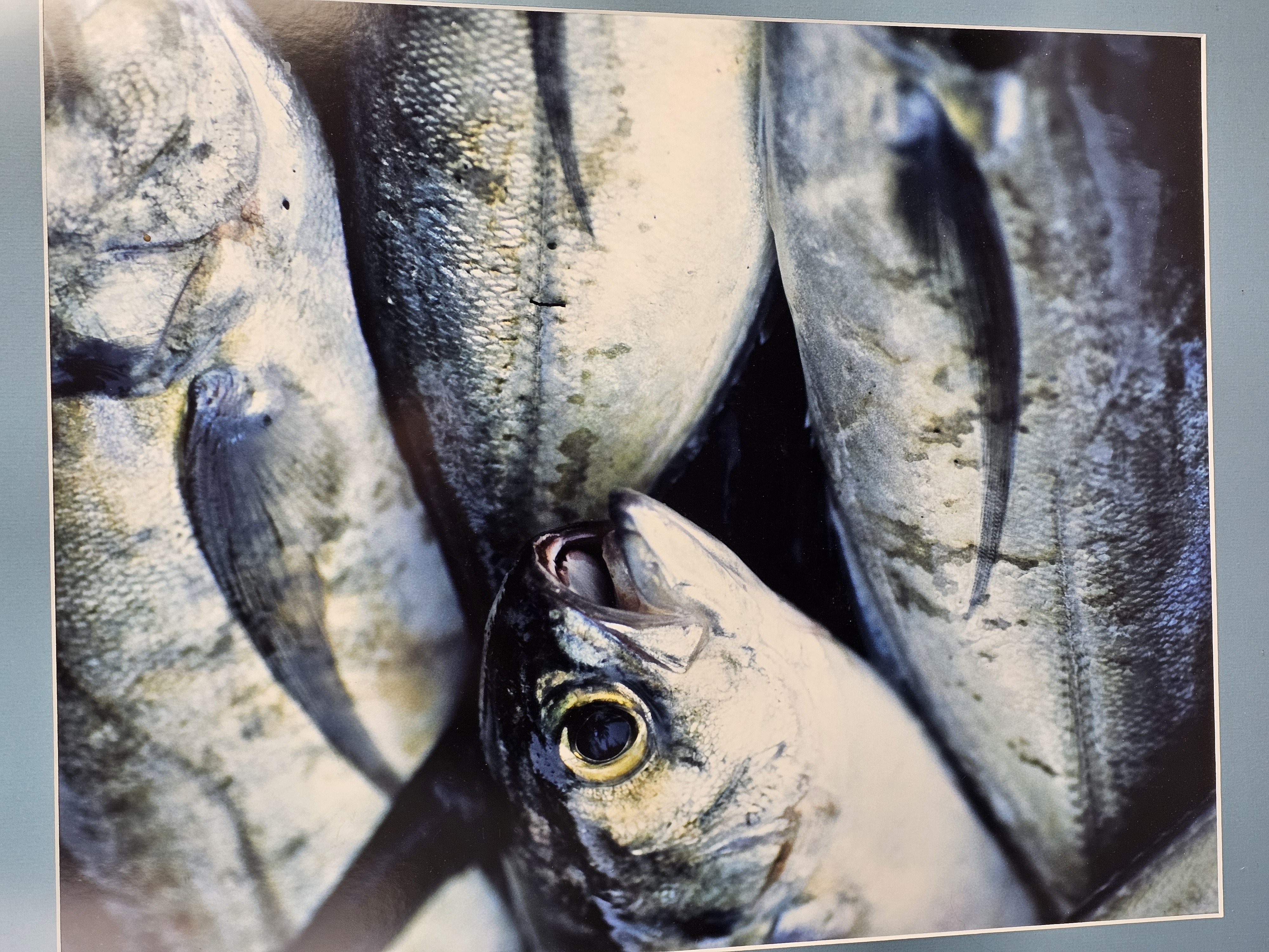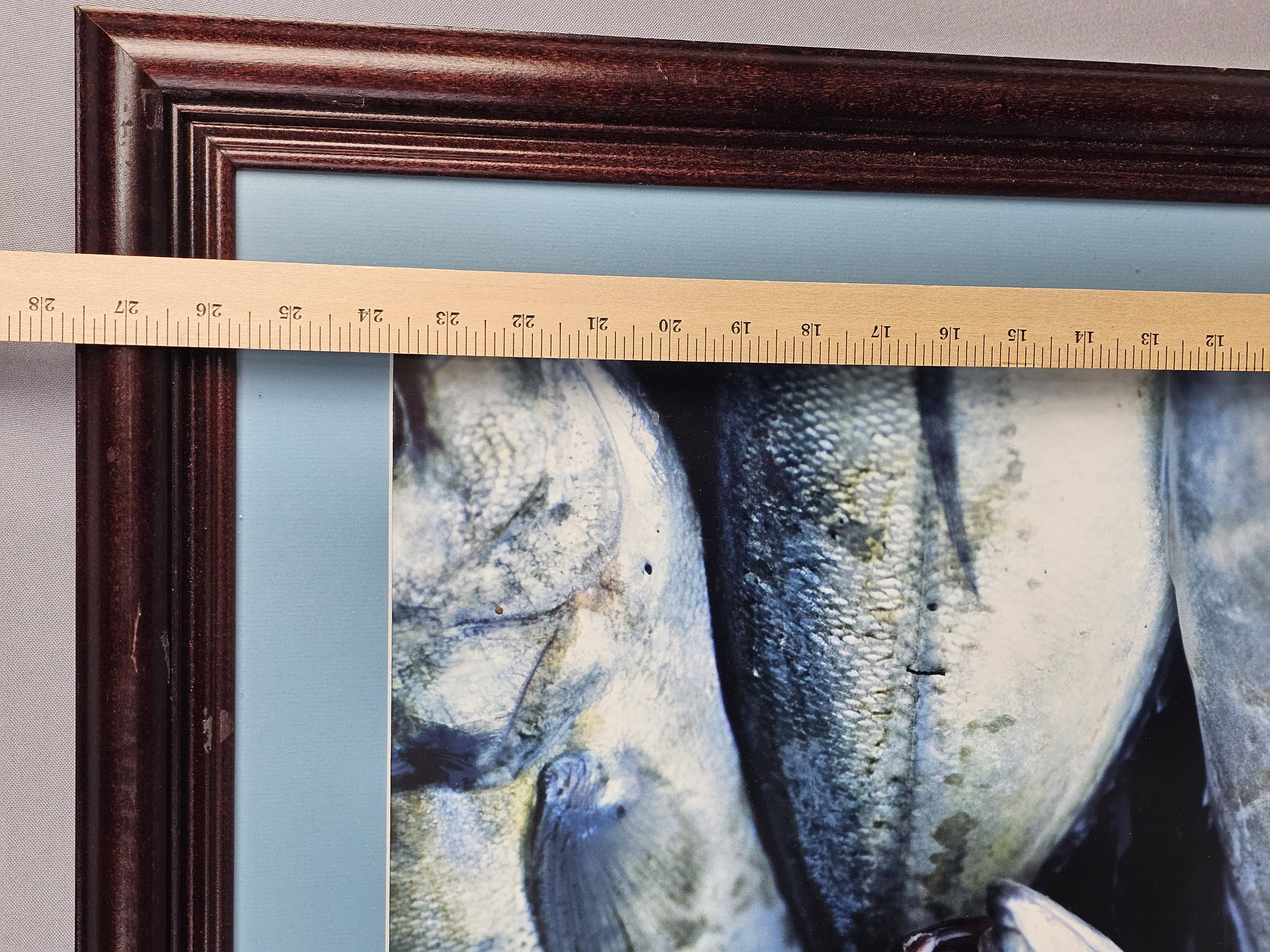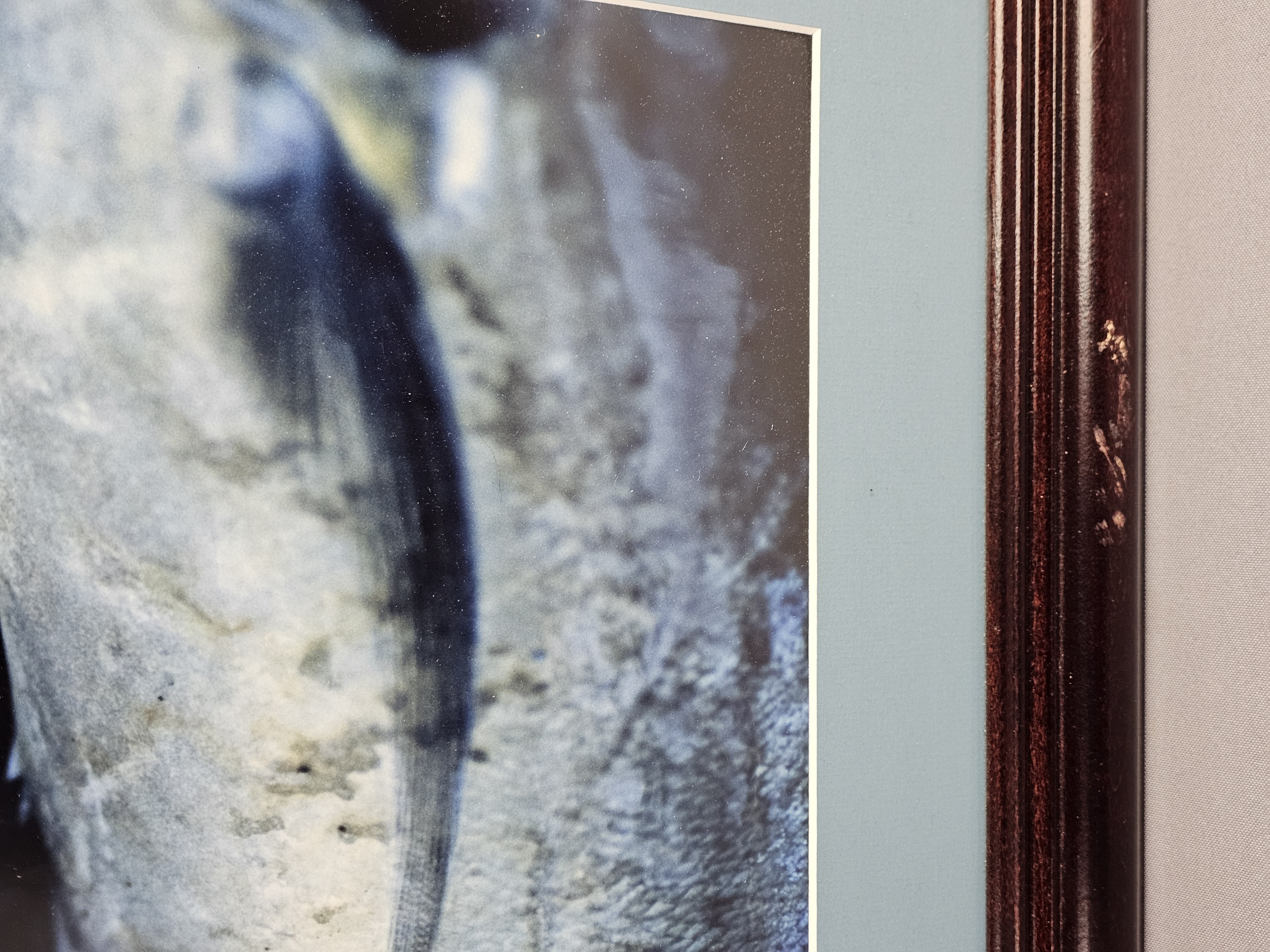 This color photograph depicts a close-up still life composition of fish. The image highlights the metallic and iridescent quality of the scales, focusing on a single fish with an open mouth. Frame measures 27.5 inches tall x 23.5 inches wide The frame shows minor surface wear and scuffs, particularly along the right side and bottom edges. A small puncture is present in the brown paper dust cover on the reverse. The photograph and matting appear to be in good condition.