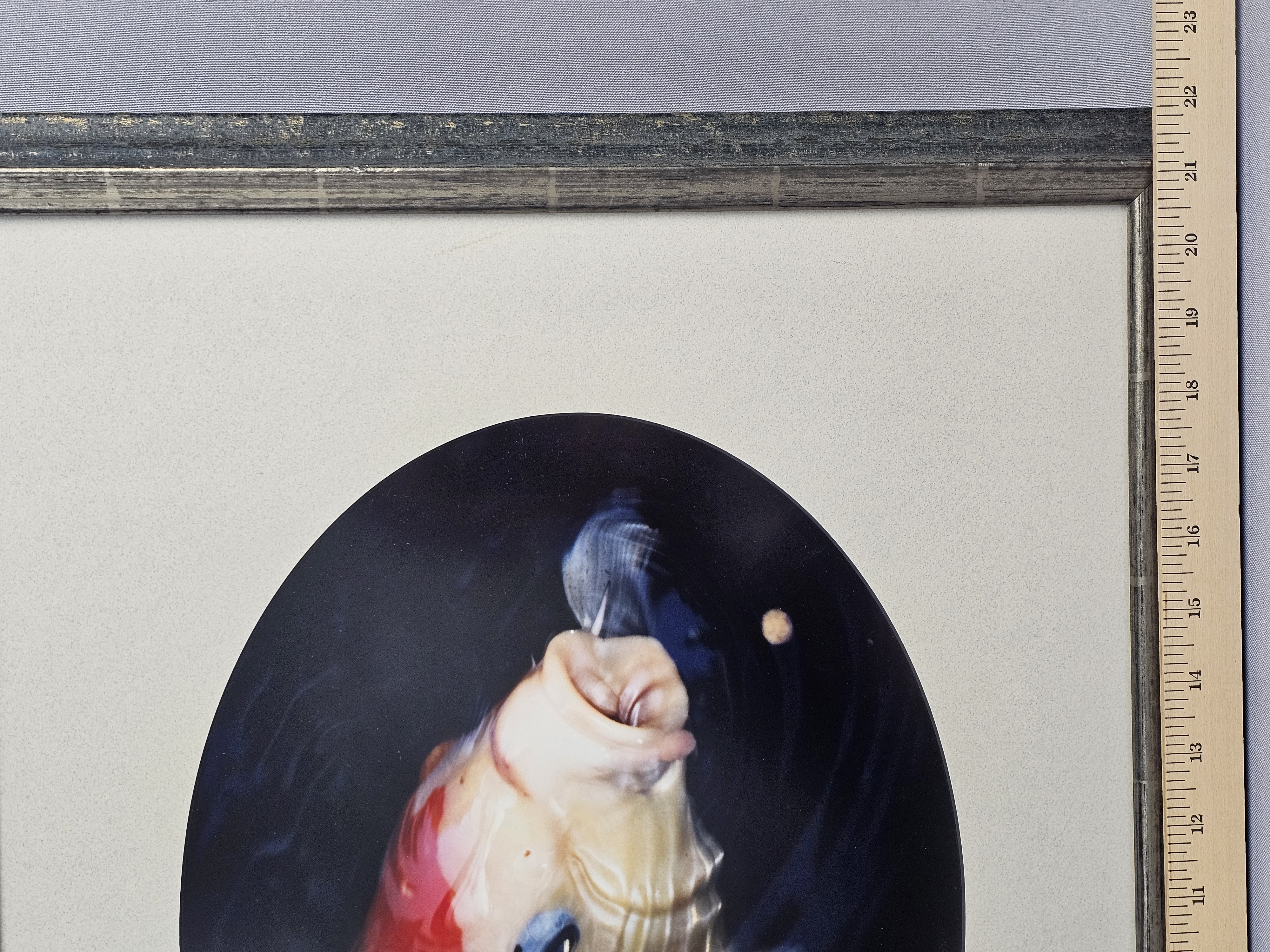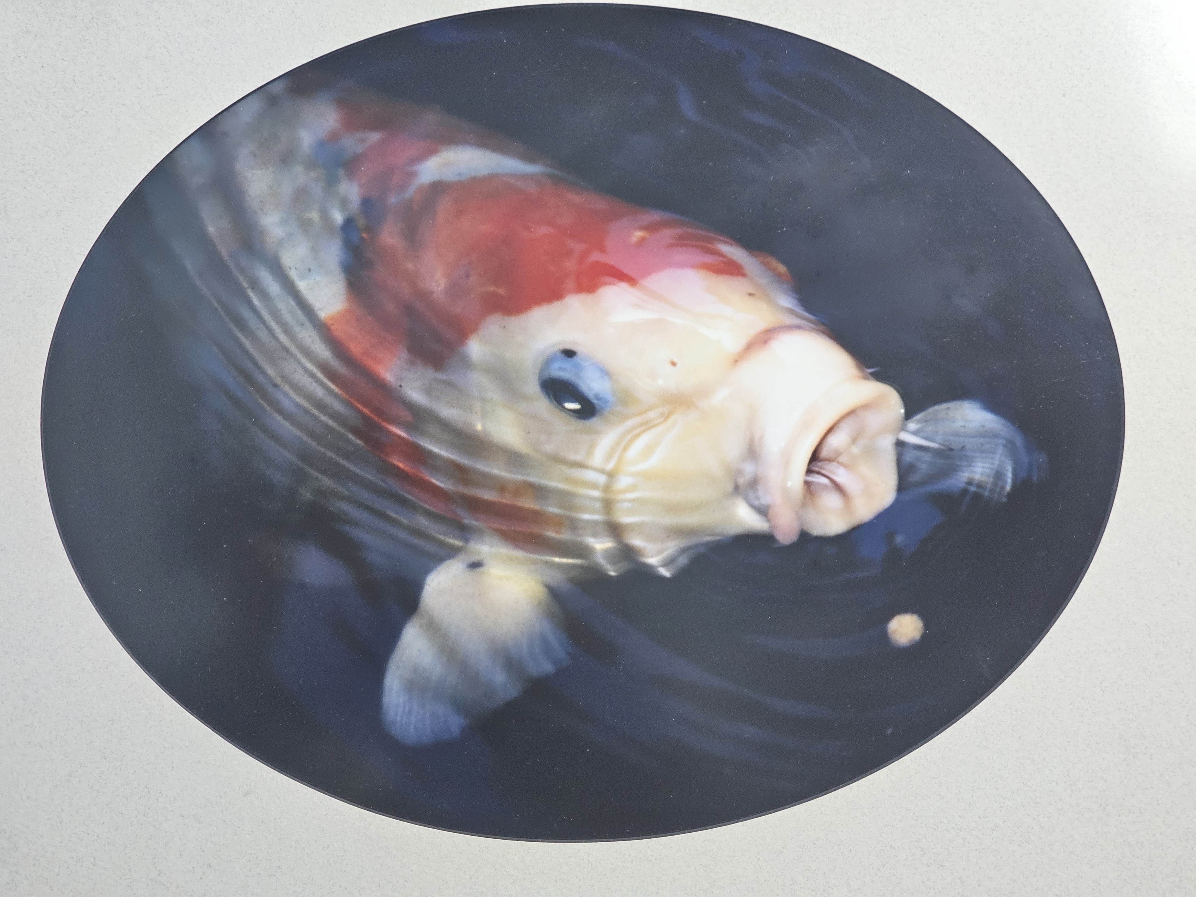 This color photograph depicts a close-up of a koi fish surfacing in dark water. The image is presented within an off-white oval-cut mat. The photograph is housed in a decorative silver and black-toned frame. Frame measures 18 x 22 inches The photograph appears to be in good condition with no significant fading or foxing. The frame shows minor surface wear, including small scuffs and paint loss. The paper backing on the reverse has a small triangular tear in the lower corner.