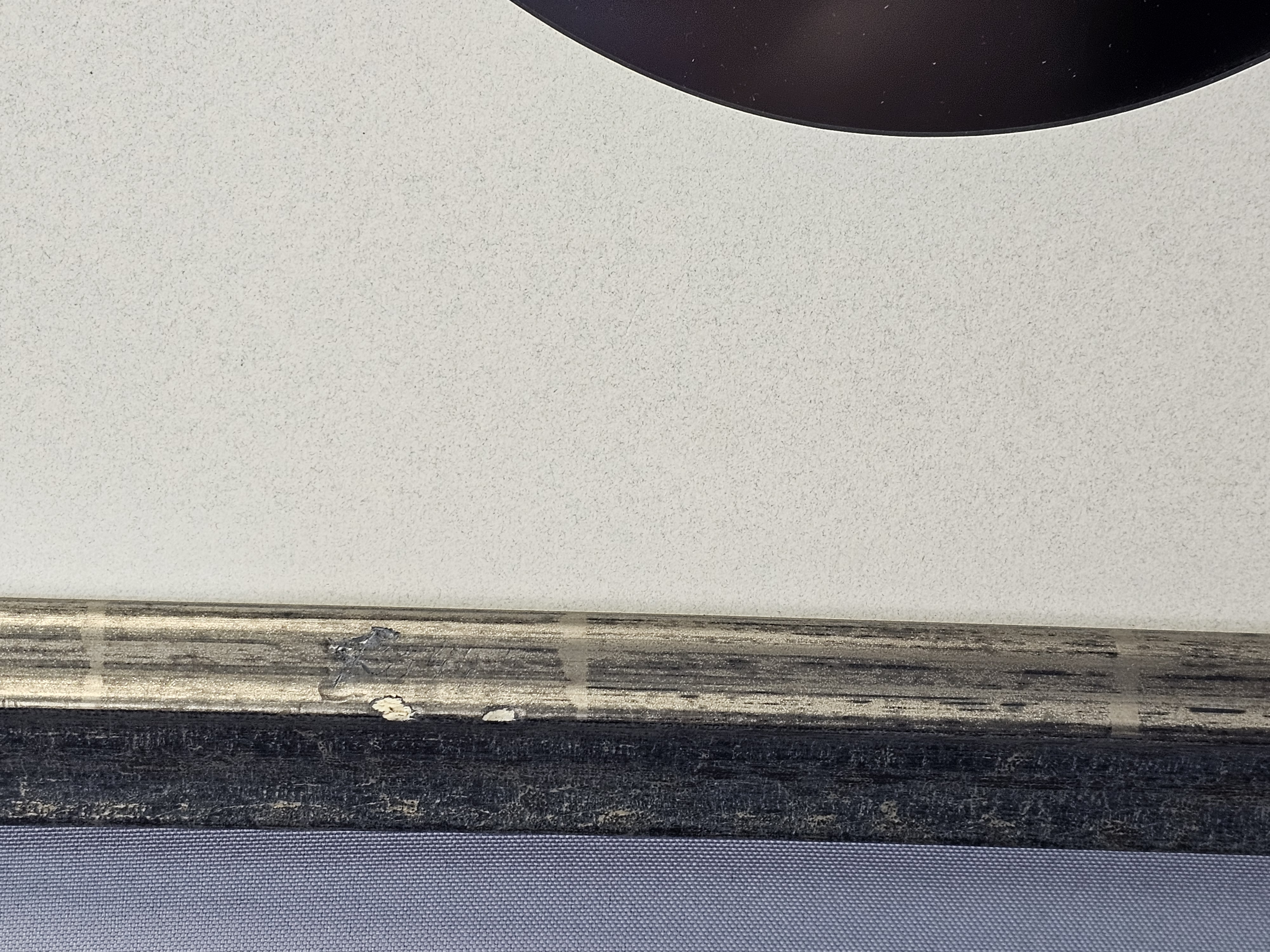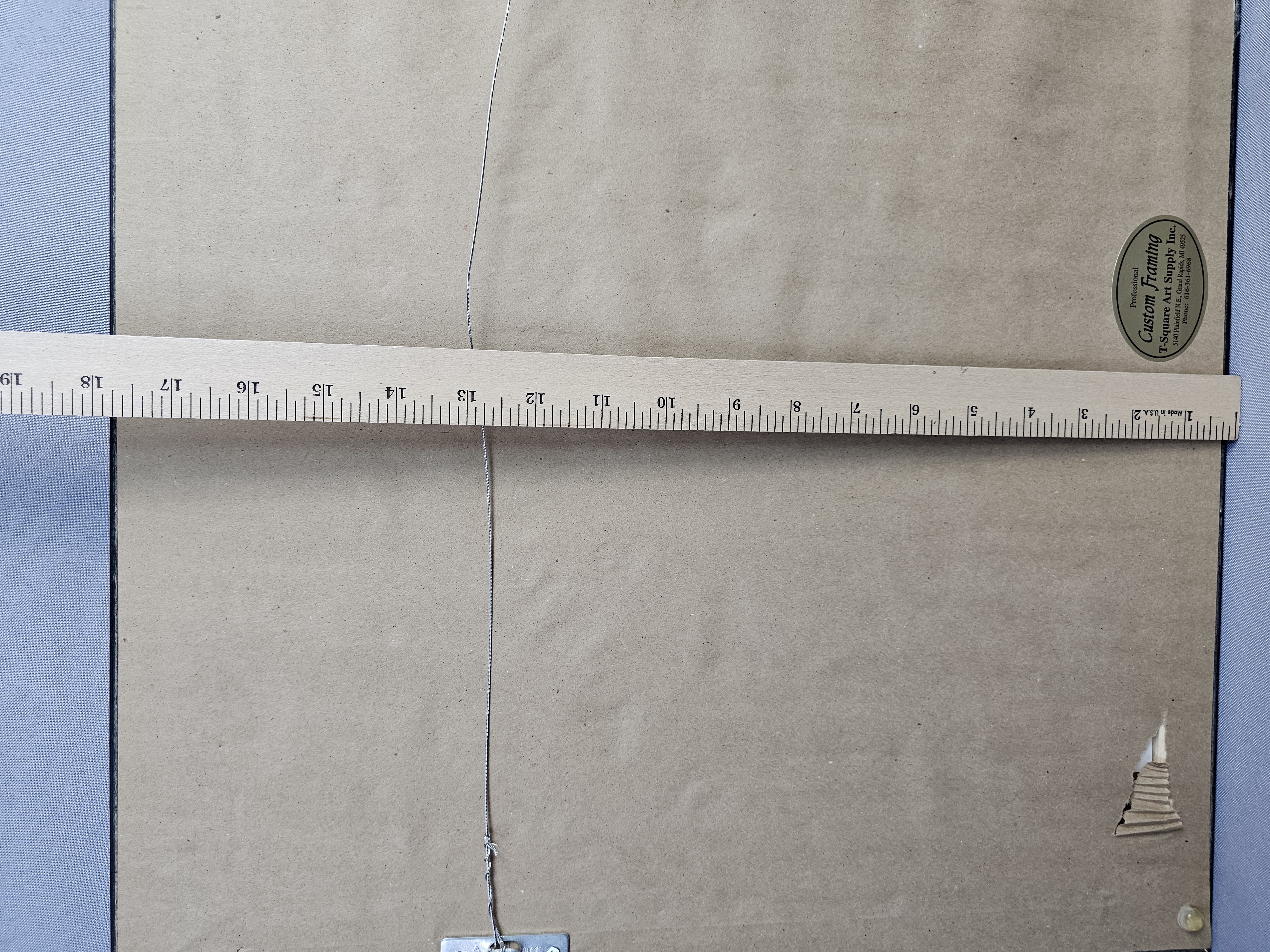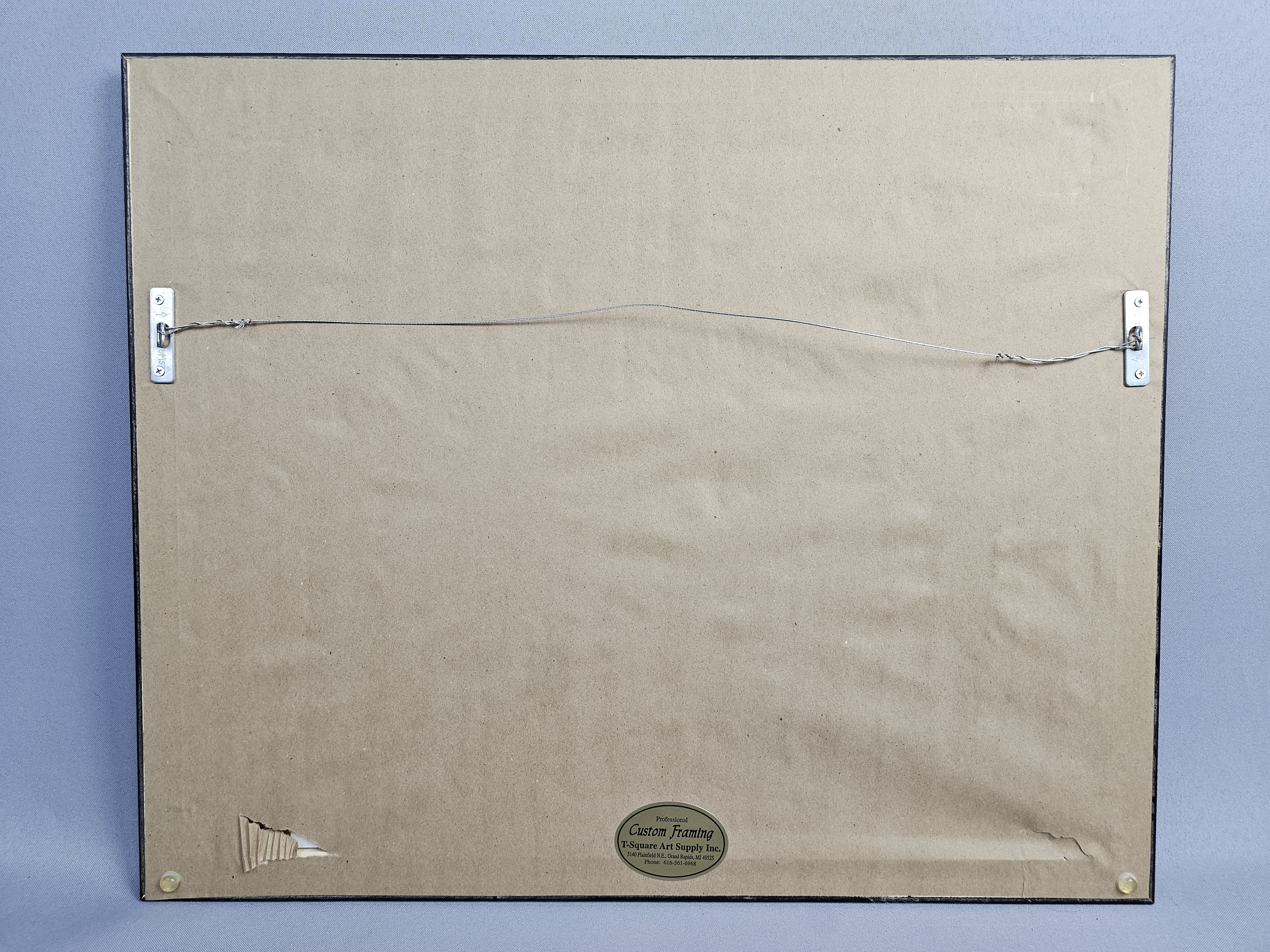 The photograph appears to be in good condition with no significant fading or foxing. The frame shows minor surface wear, including small scuffs and paint loss. The paper backing on the reverse has a small triangular tear in the lower corner.