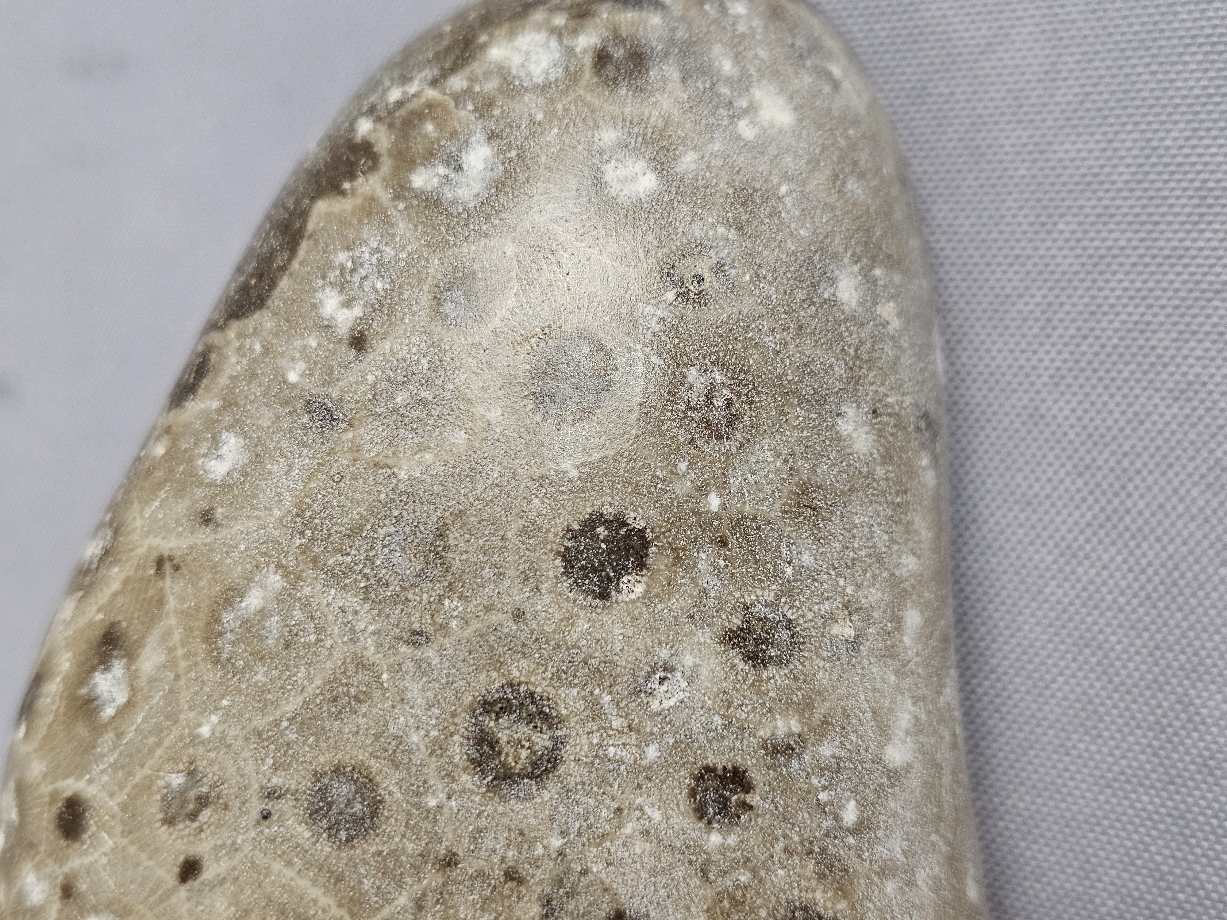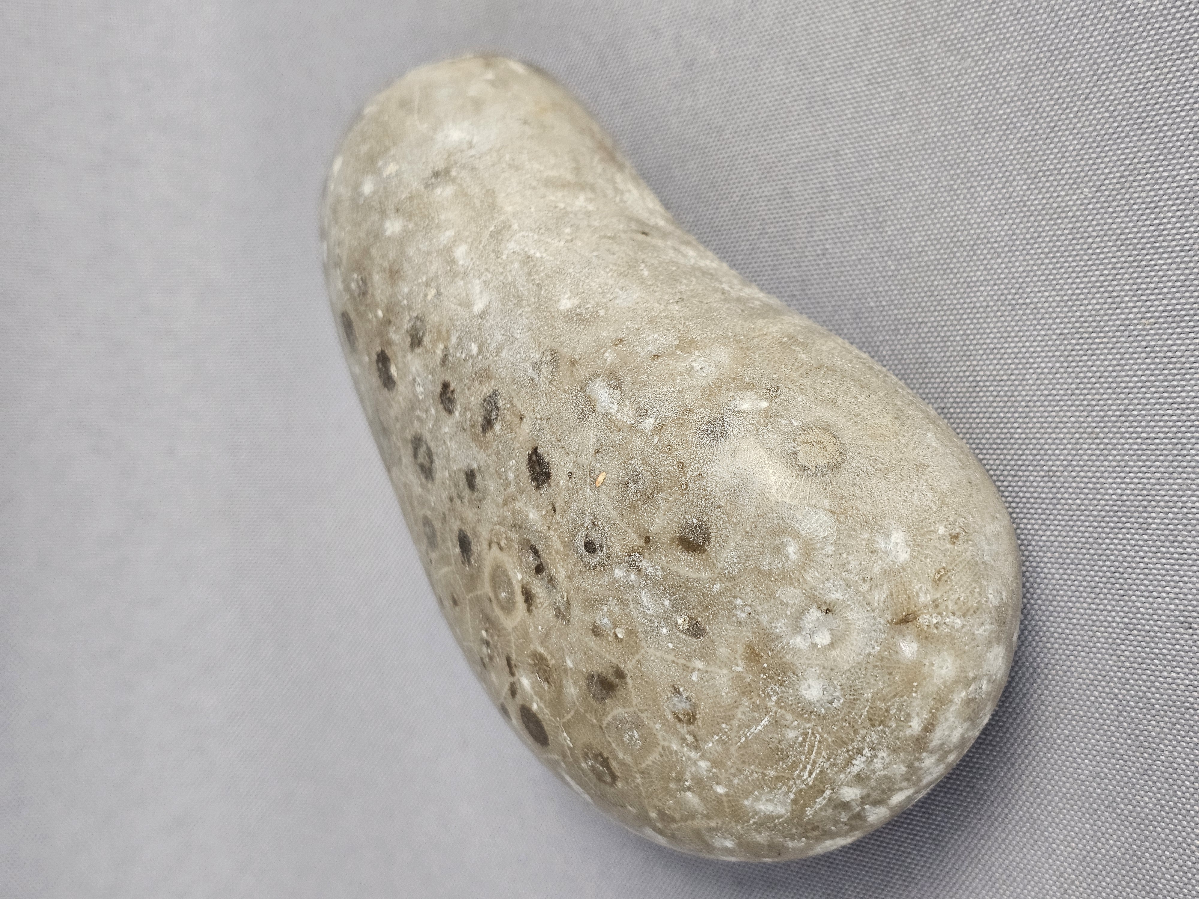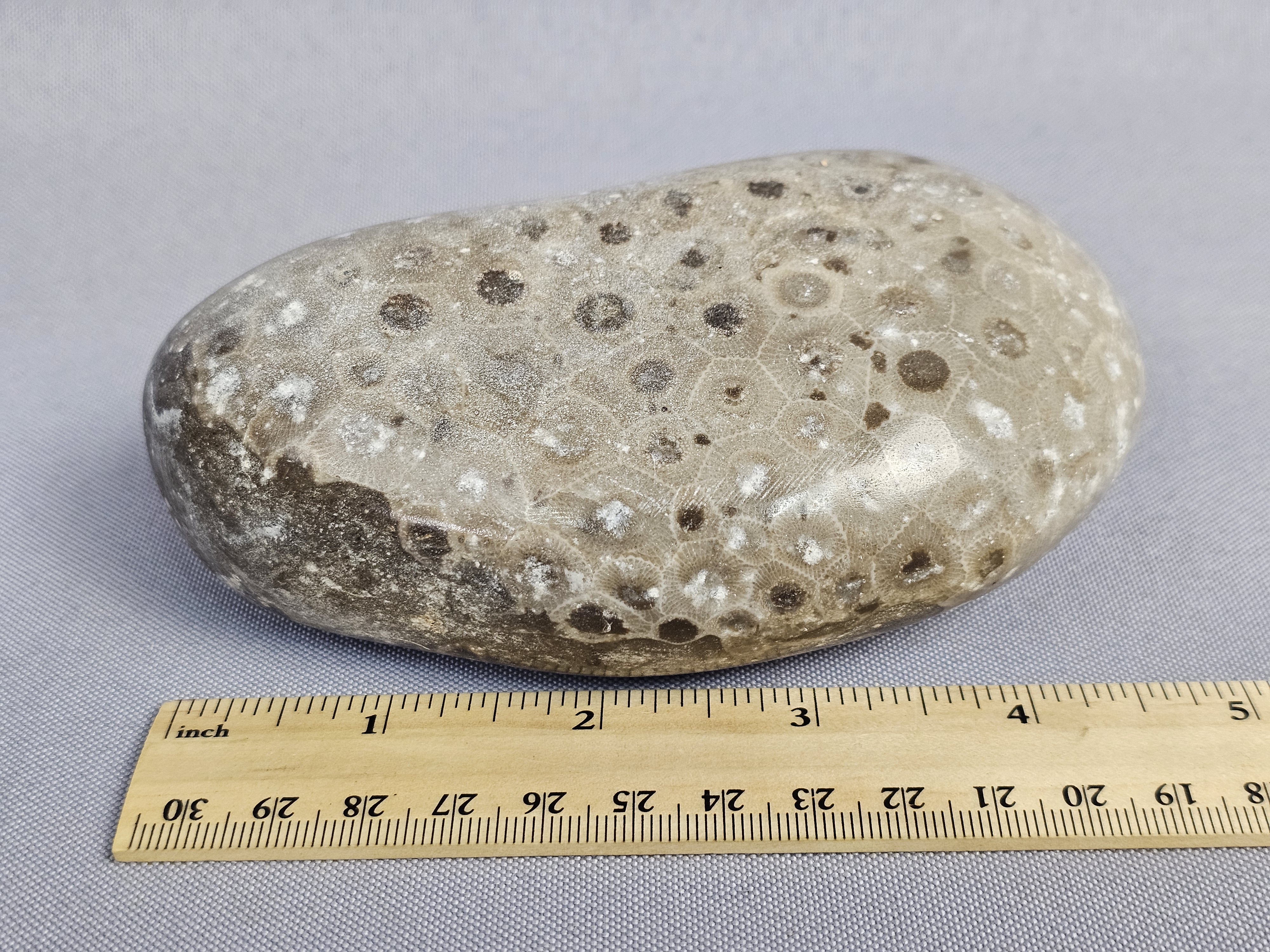 This specimen is a polished Petoskey stone, which is a fossilized rugose coral of the species Hexagonaria percarinata. Originating from the Great Lakes region of Michigan, the stone features a kidney-shaped form with a smooth, lustrous finish across the primary display surfaces. Length: 4.5 inches The specimen is in good condition with a high-polish finish. Surface inspection reveals minor abrasions, fine scratches, and small areas of natural geological pitting consistent with handling and the organic nature of the material.