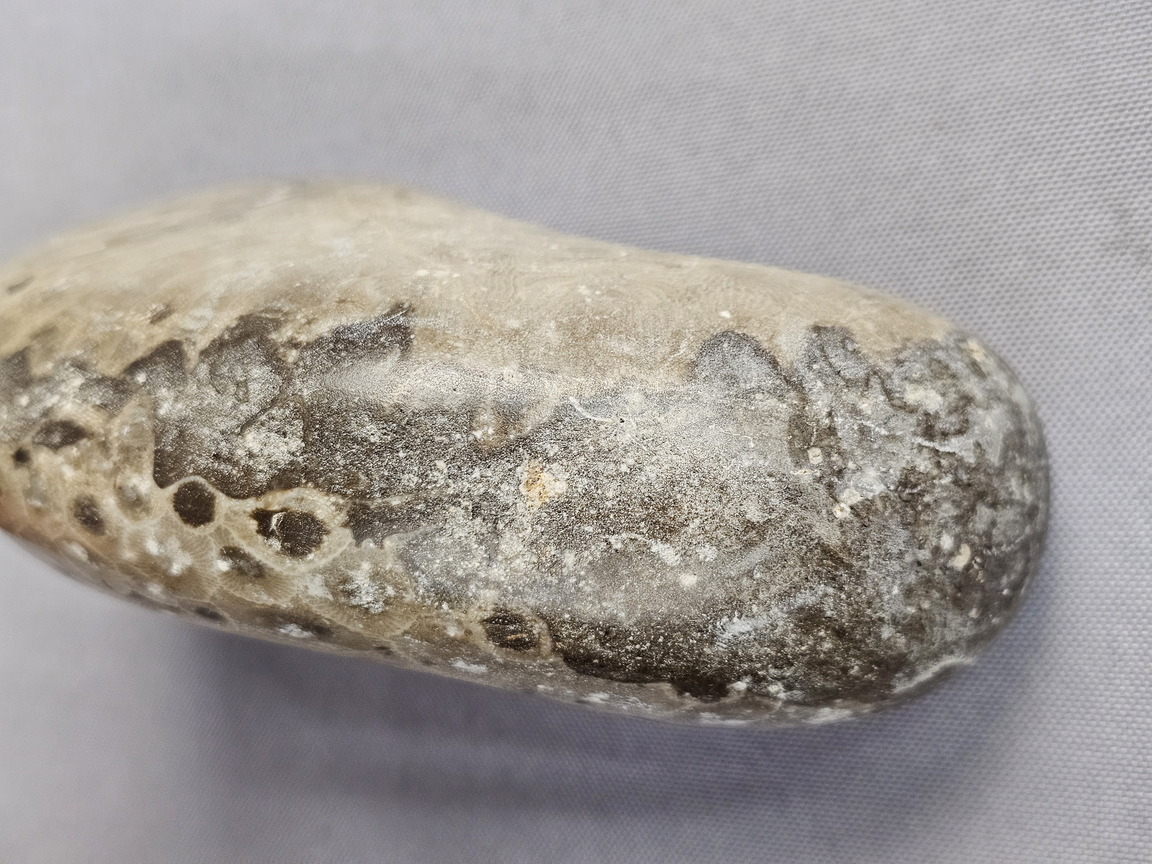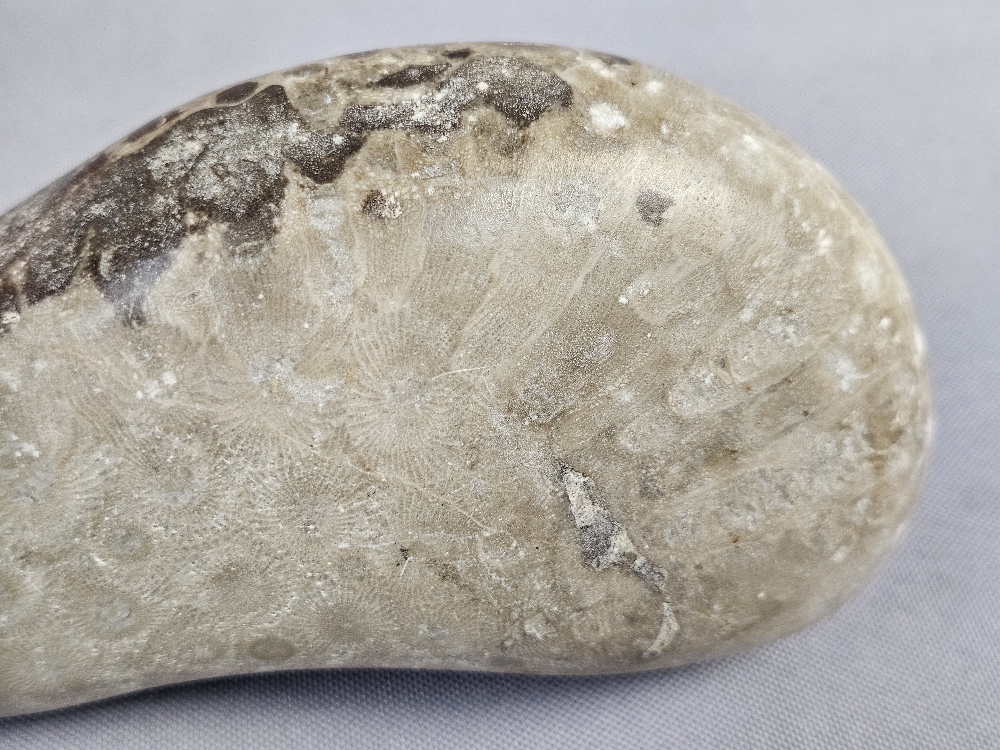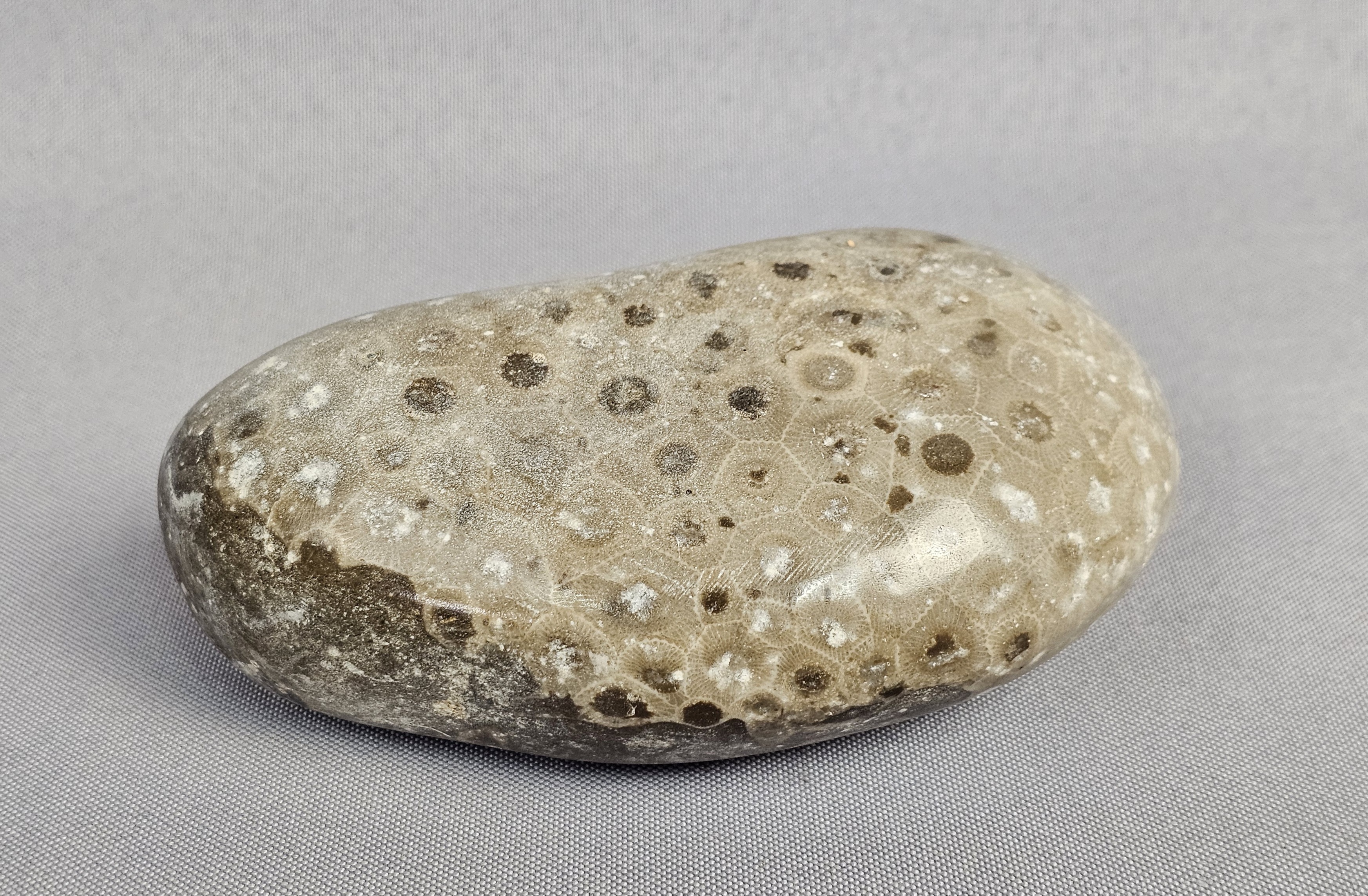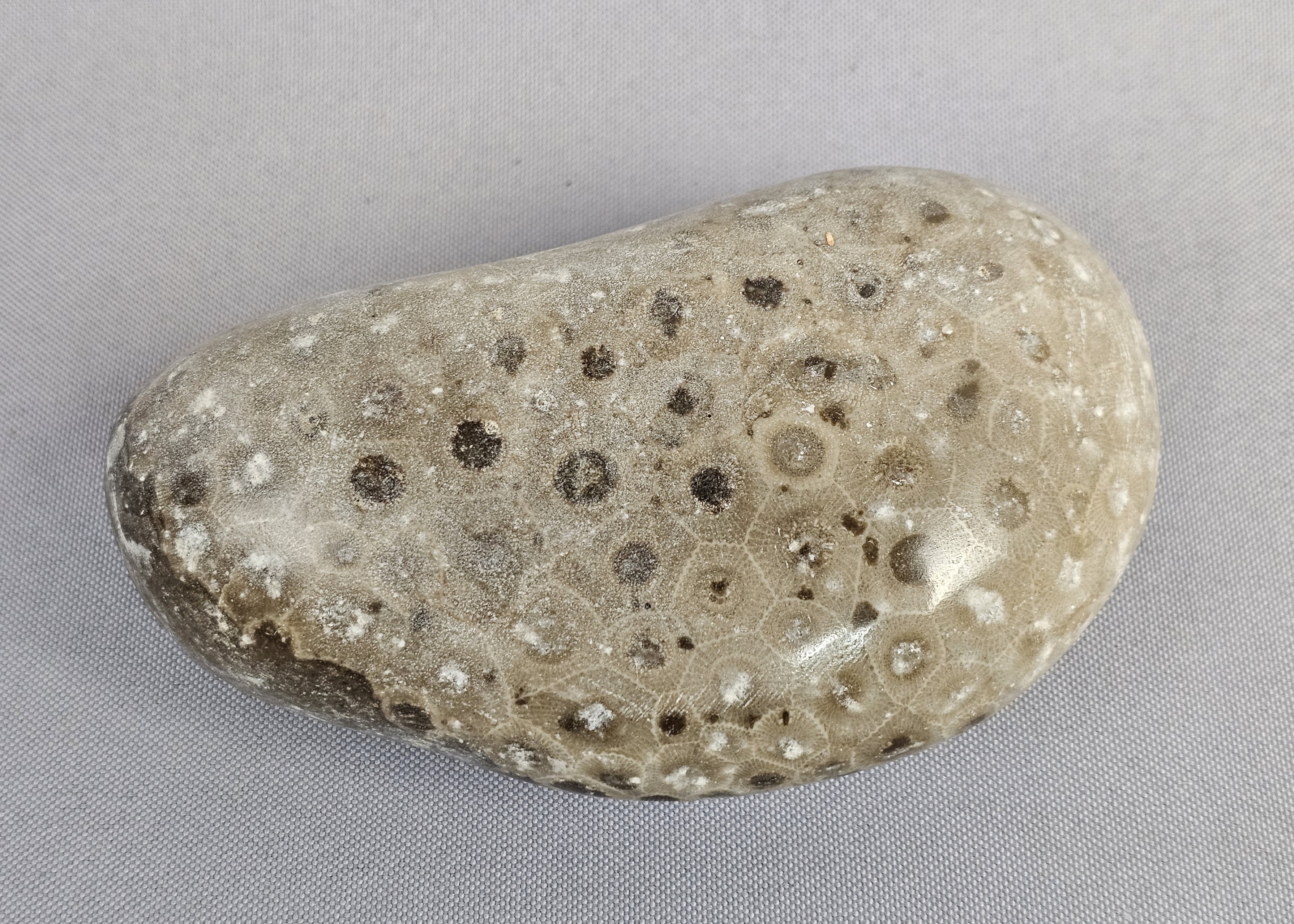 This specimen is a polished Petoskey stone, which is a fossilized rugose coral of the species Hexagonaria percarinata. Originating from the Great Lakes region of Michigan, the stone features a kidney-shaped form with a smooth, lustrous finish across the primary display surfaces. Length: 4.5 inches The specimen is in good condition with a high-polish finish. Surface inspection reveals minor abrasions, fine scratches, and small areas of natural geological pitting consistent with handling and the organic nature of the material.