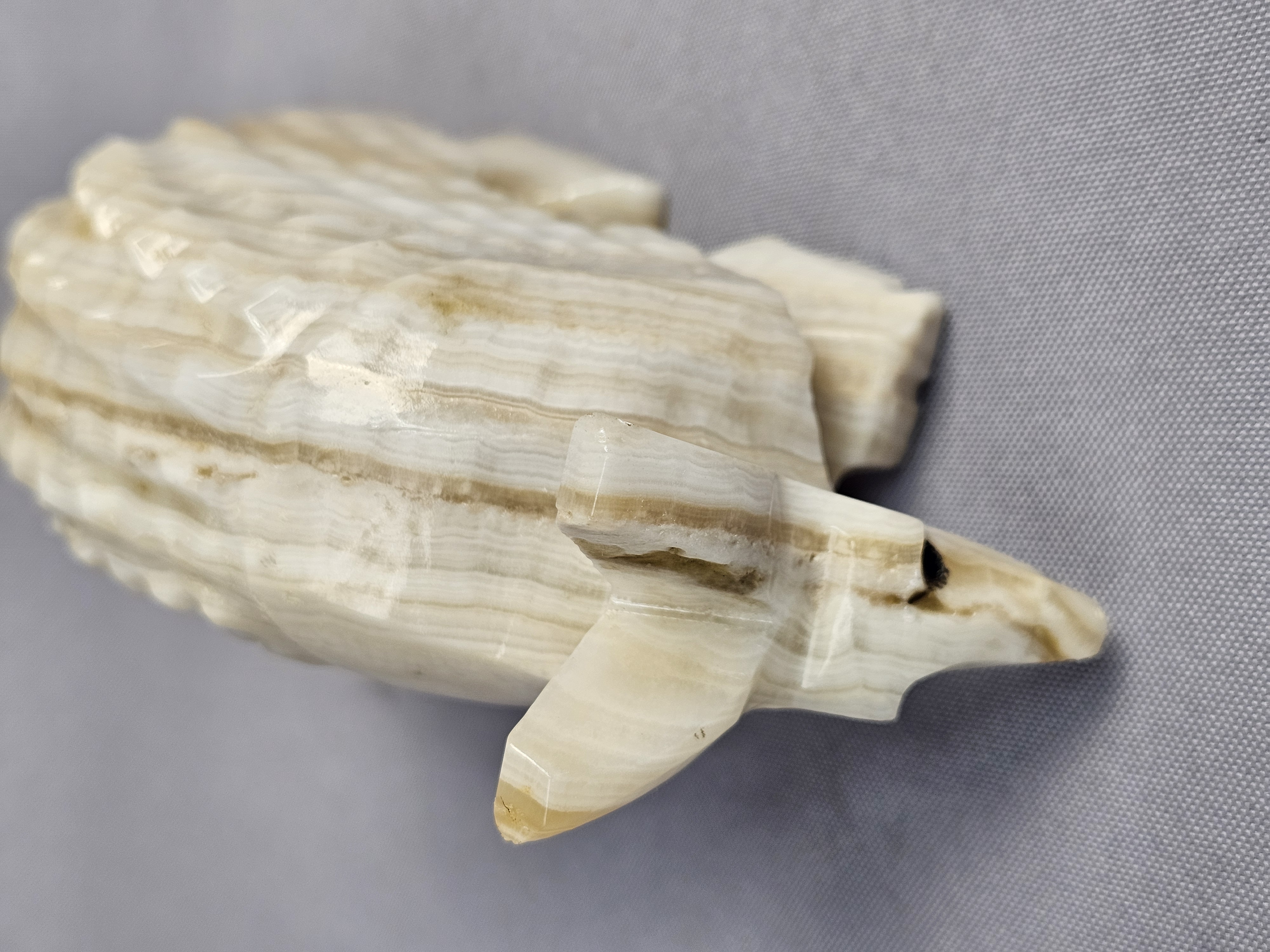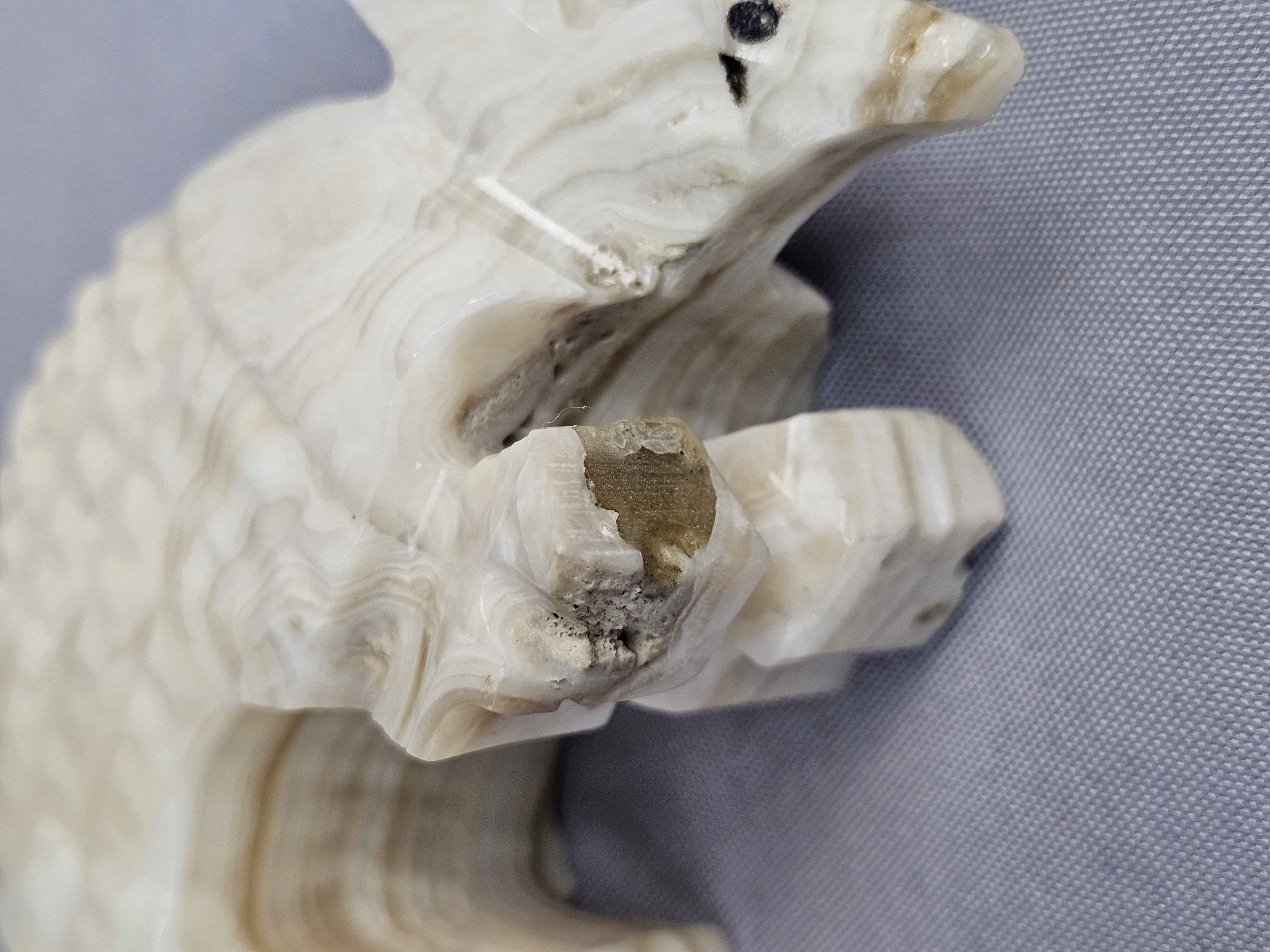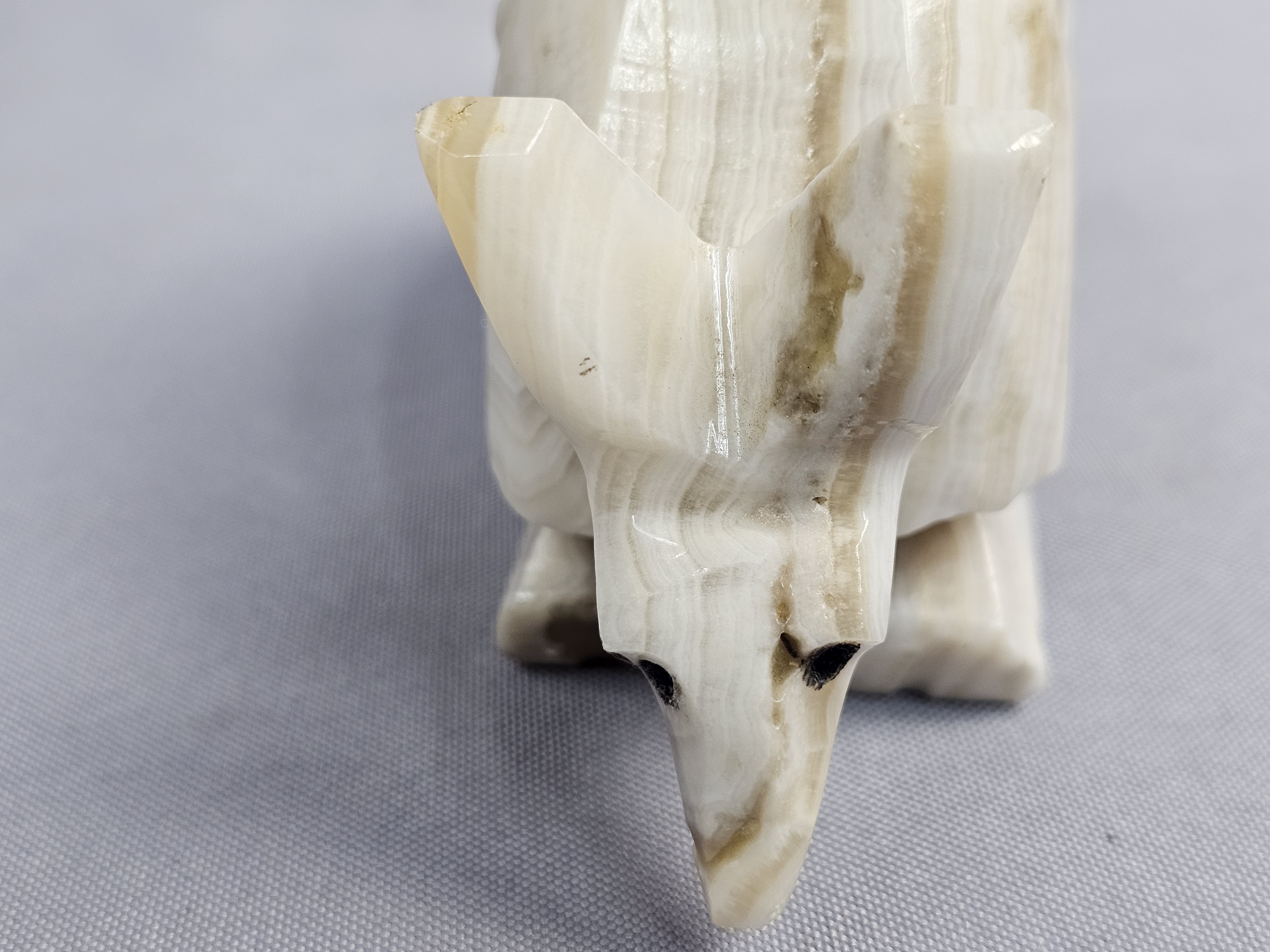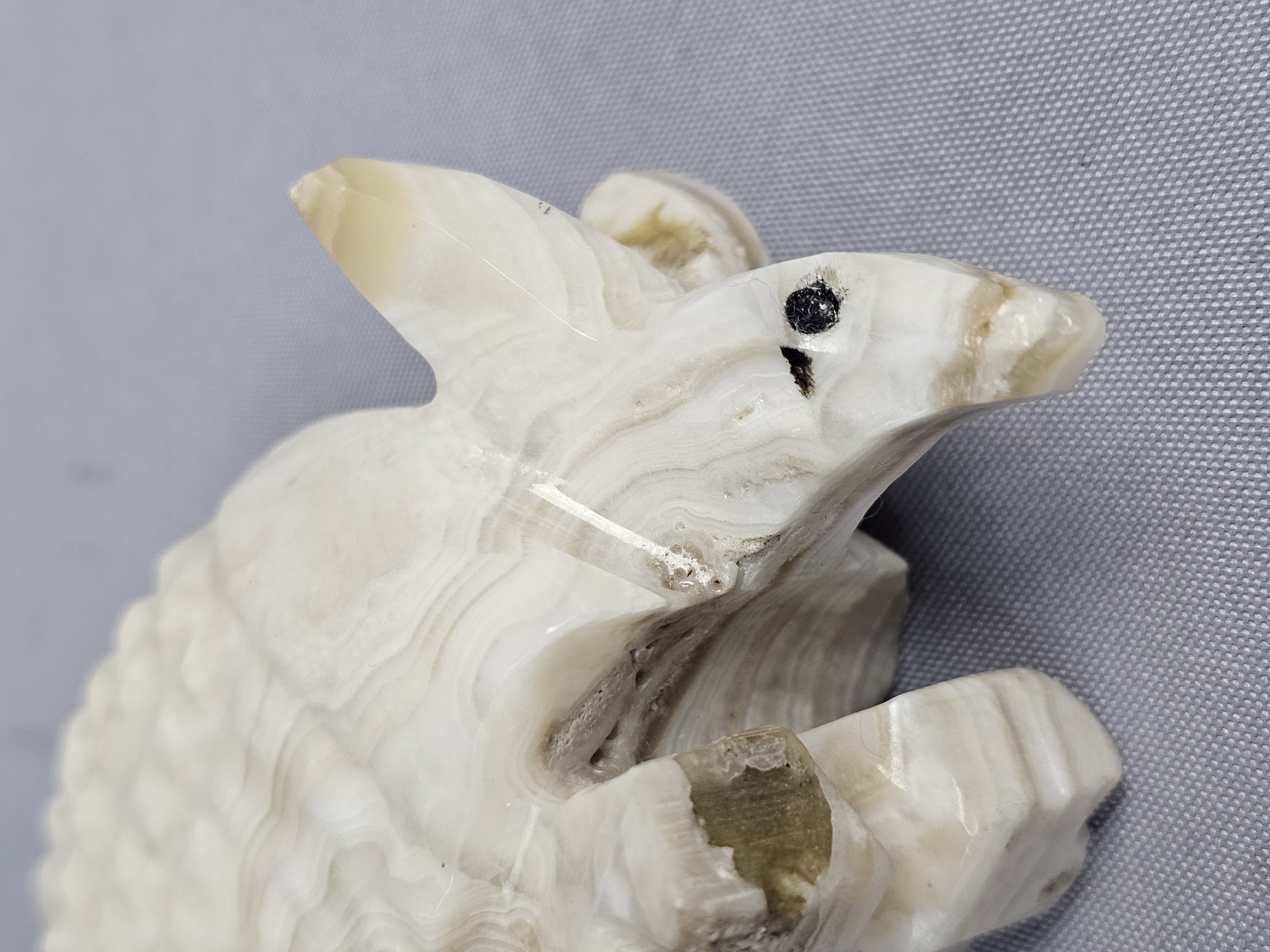 This hand-carved figurine represents an armadillo, executed in a style consistent with Southwestern United States and Mexican folk art, often categorized as a fetish carving. The item is carved from a translucent, banded stone, likely onyx or calcite, displaying natural sedimentary layers in varying shades of white, cream, and light tan. Length: 7.5 inches Height: 3 inches The figurine is in good condition with some signs of age and handling. There is a notable chip on the underside of one front foot. The surface shows light abrasions and minor scratches consistent with display.