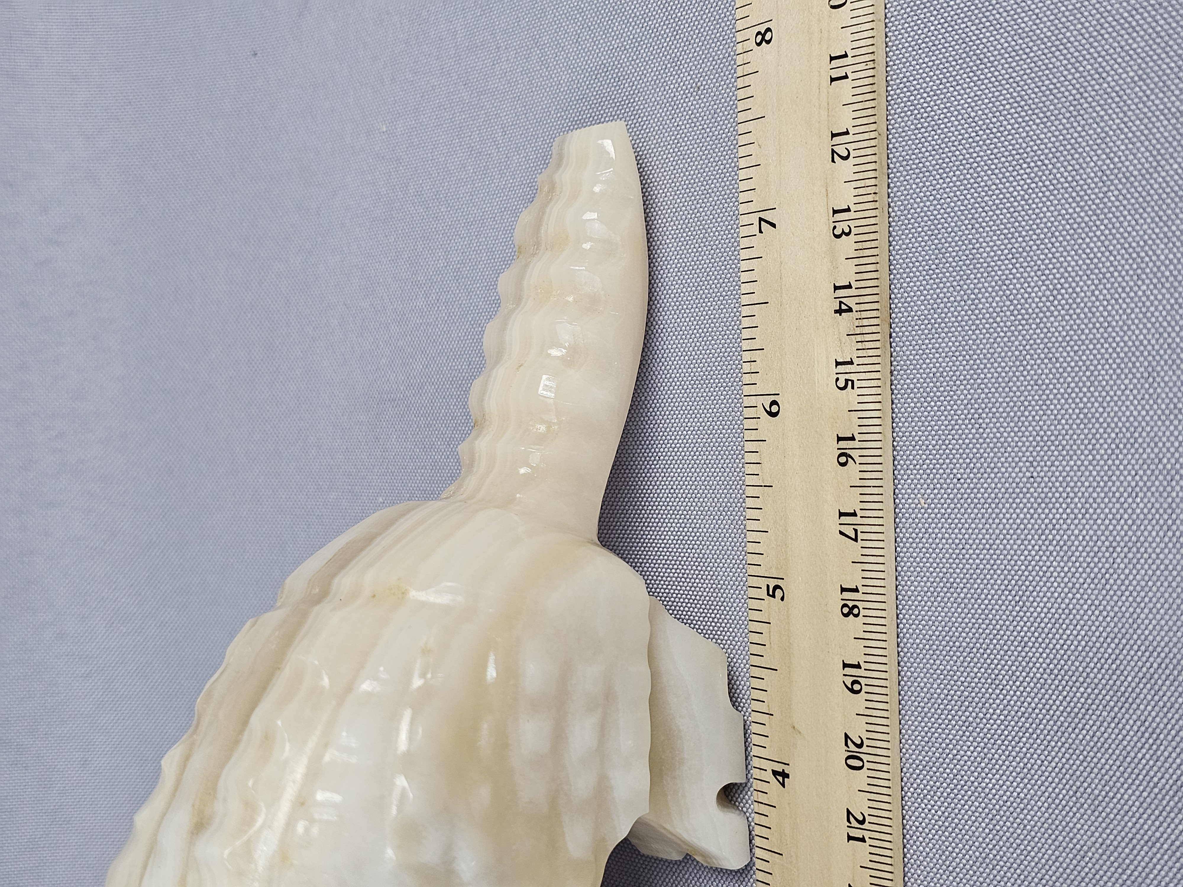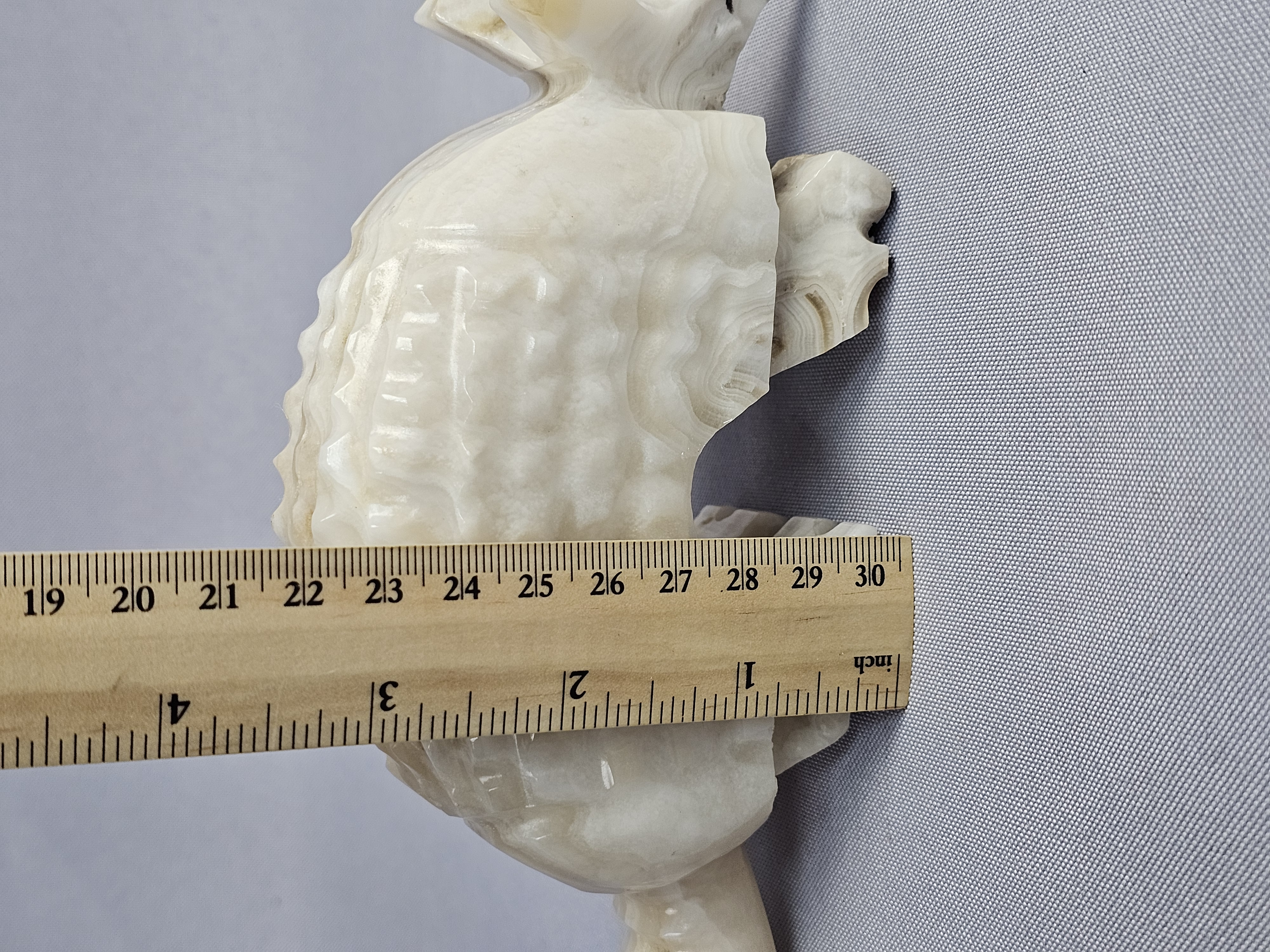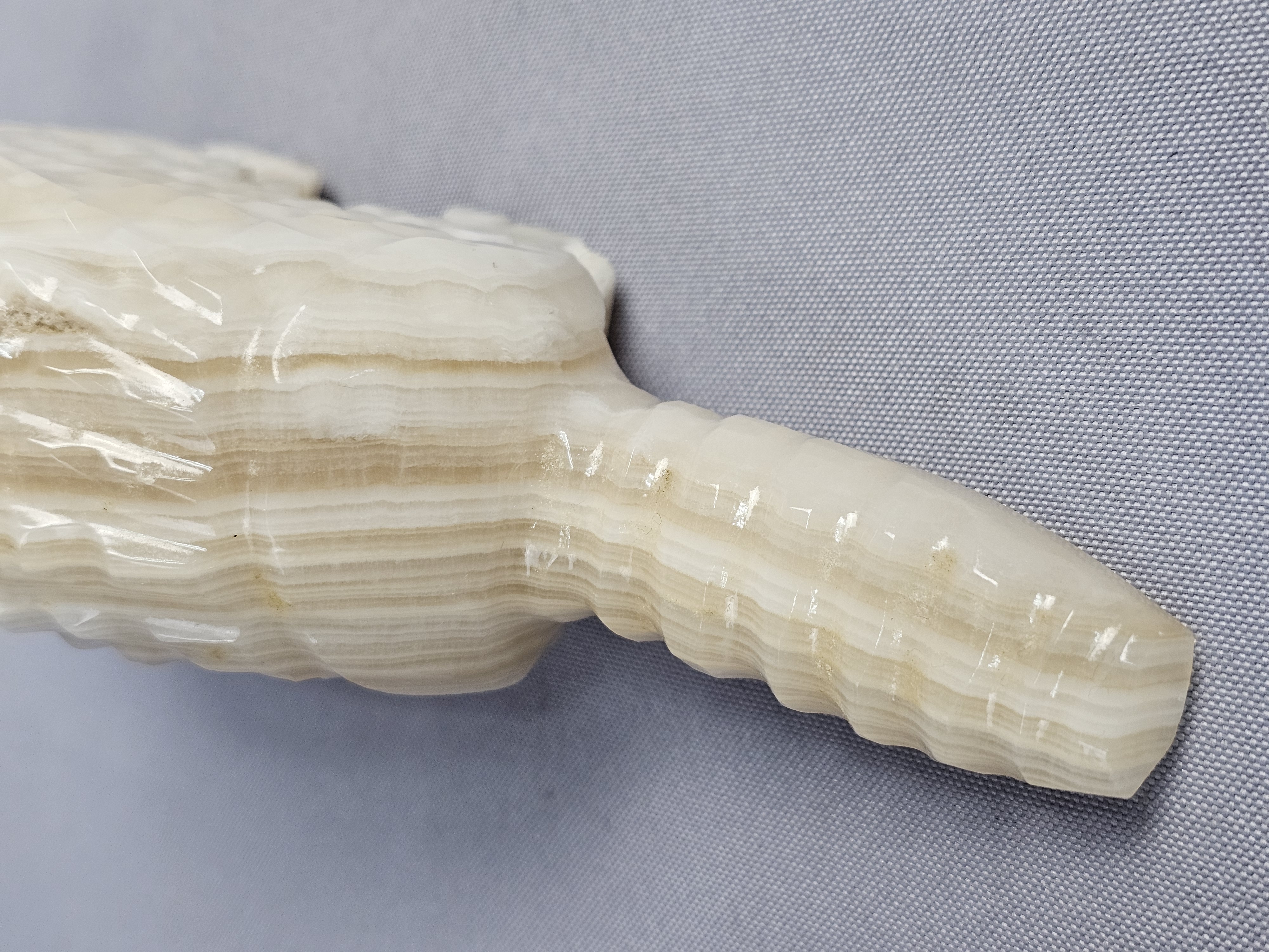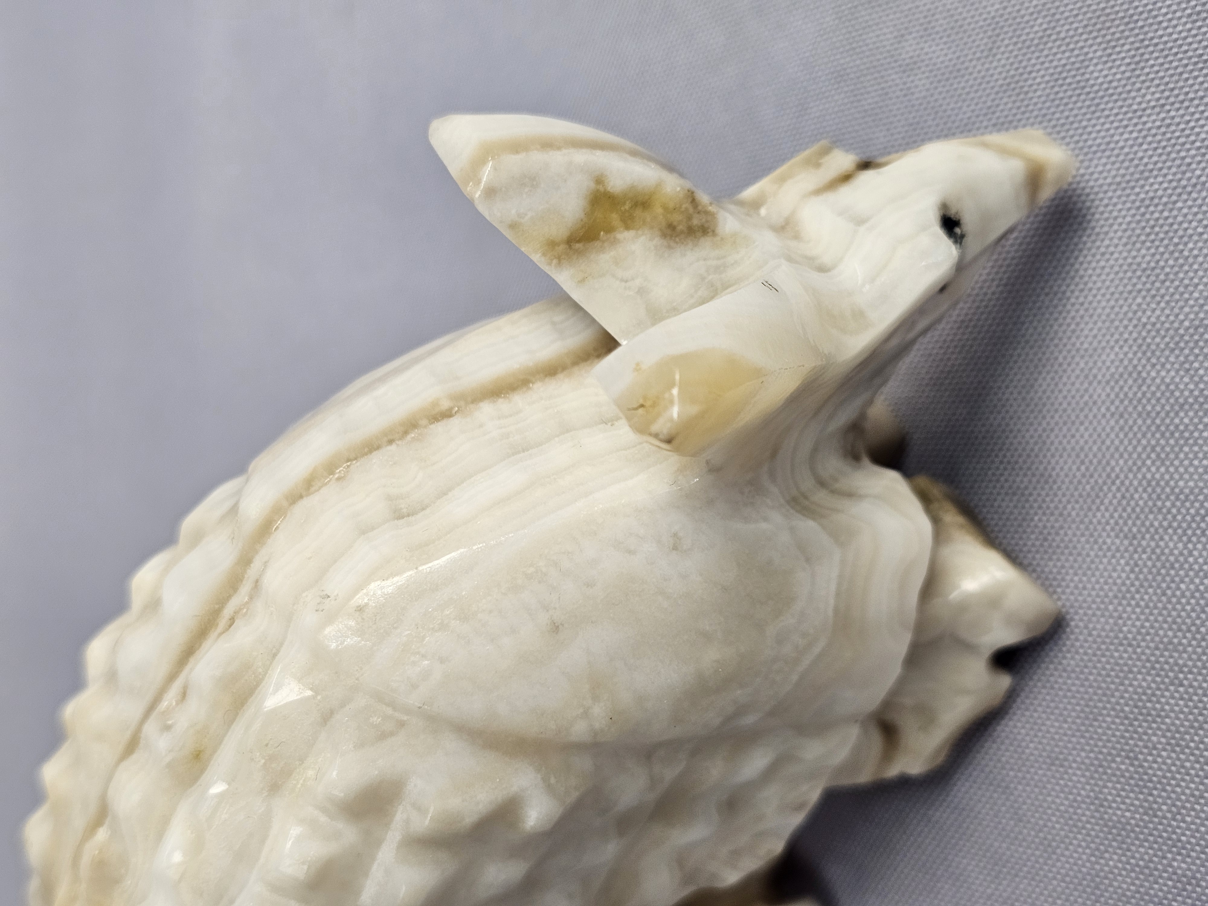 This hand-carved figurine represents an armadillo, executed in a style consistent with Southwestern United States and Mexican folk art, often categorized as a fetish carving. The item is carved from a translucent, banded stone, likely onyx or calcite, displaying natural sedimentary layers in varying shades of white, cream, and light tan. Length: 7.5 inches Height: 3 inches The figurine is in good condition with some signs of age and handling. There is a notable chip on the underside of one front foot. The surface shows light abrasions and minor scratches consistent with display.
