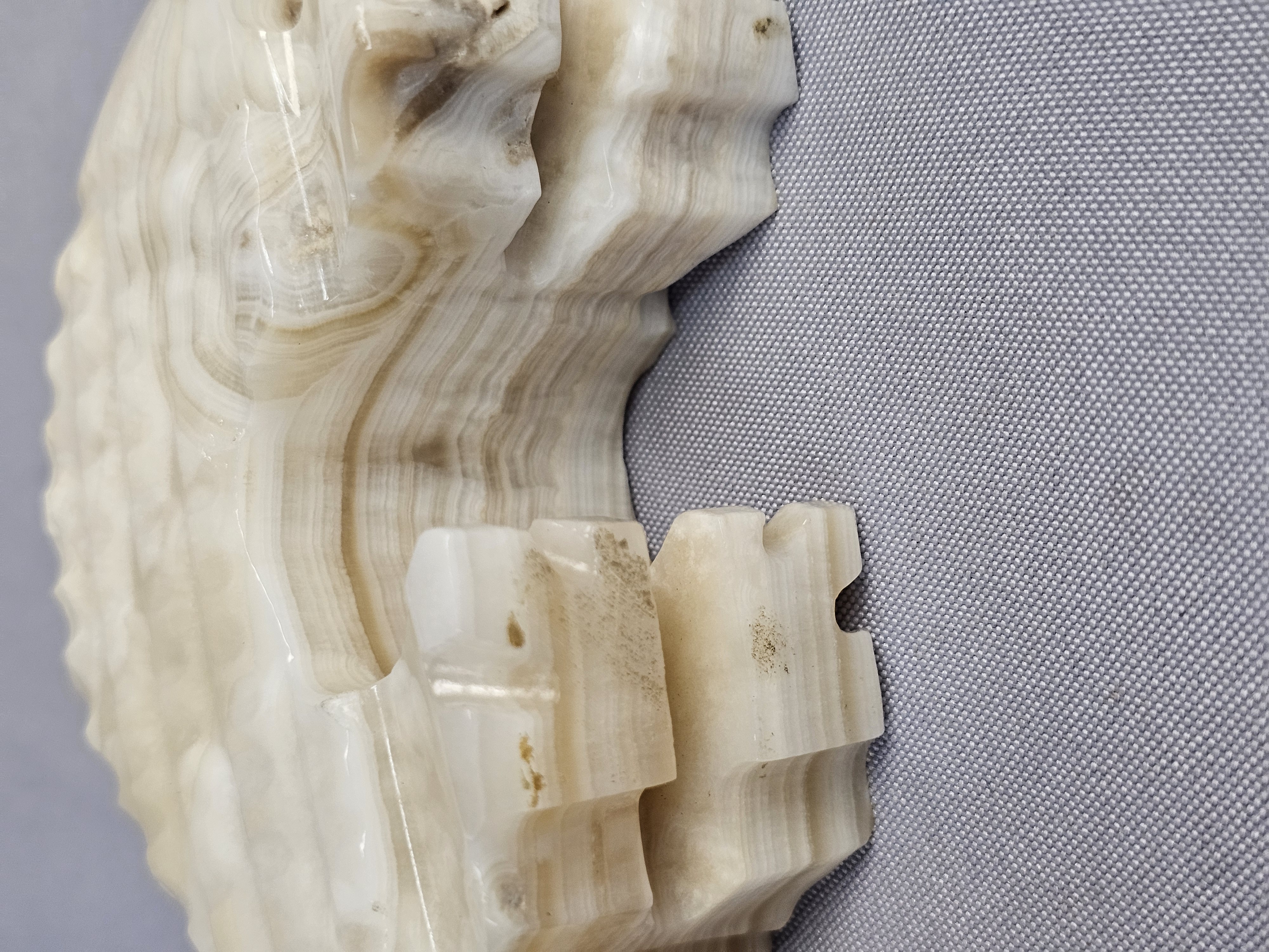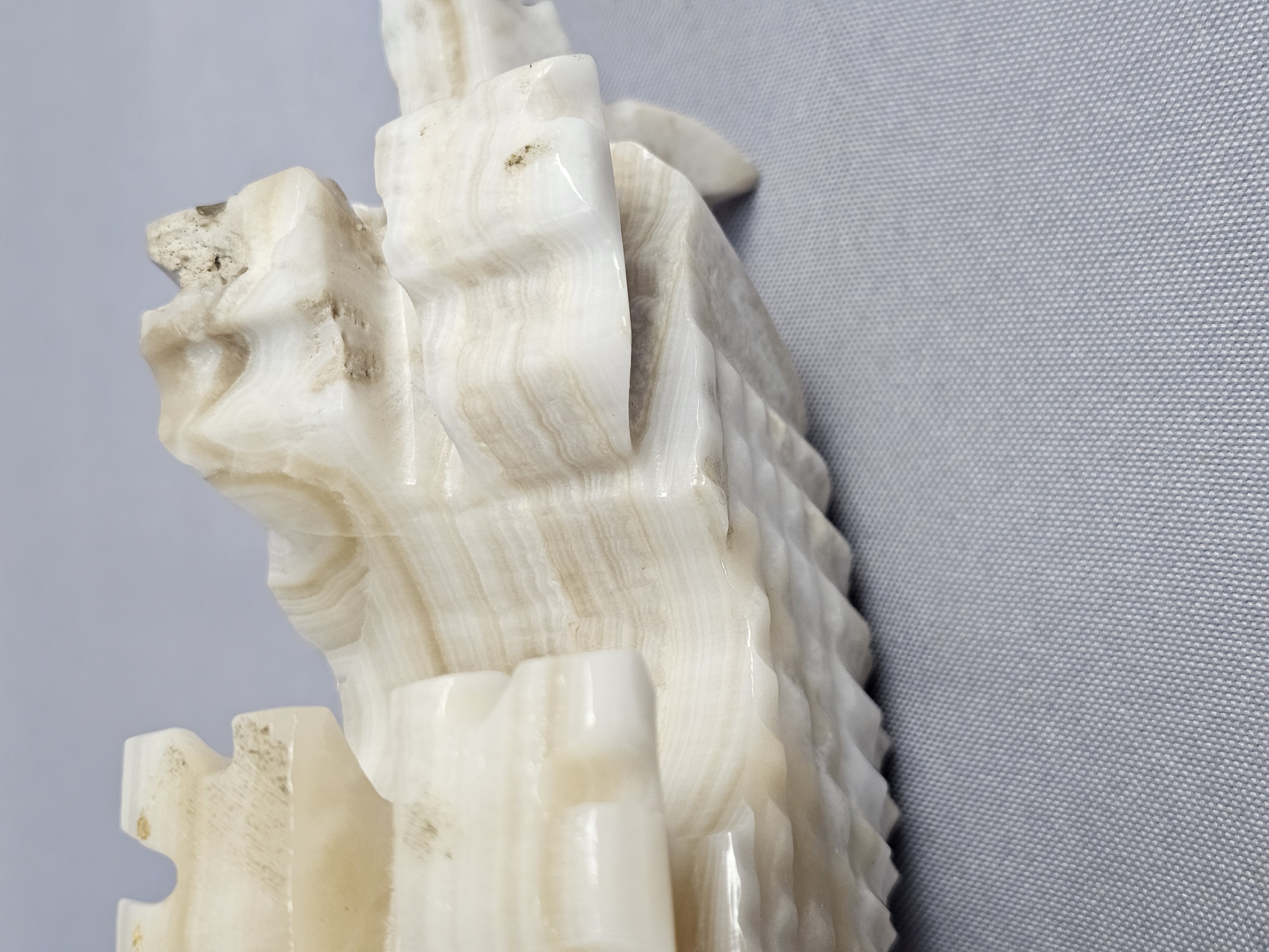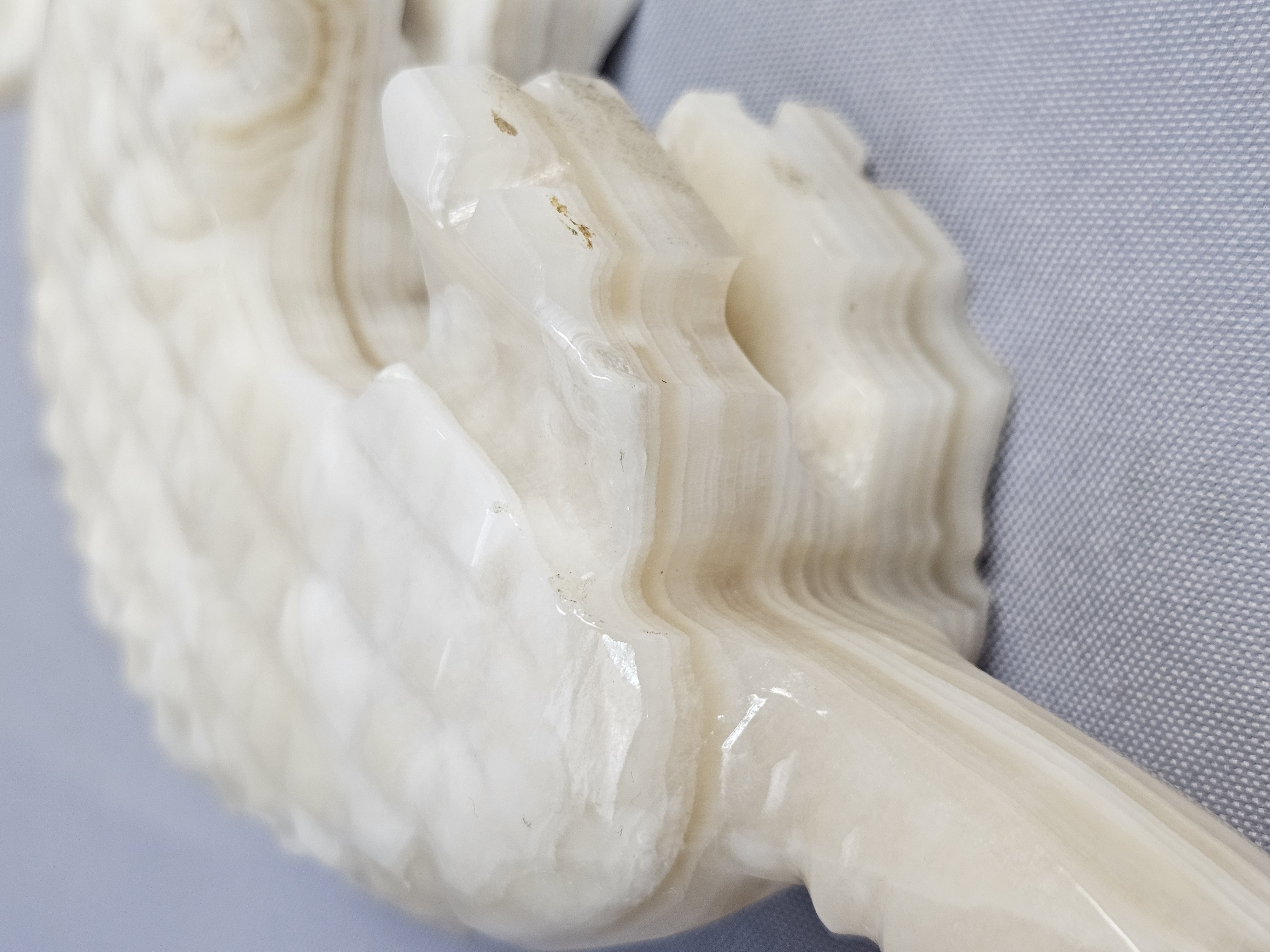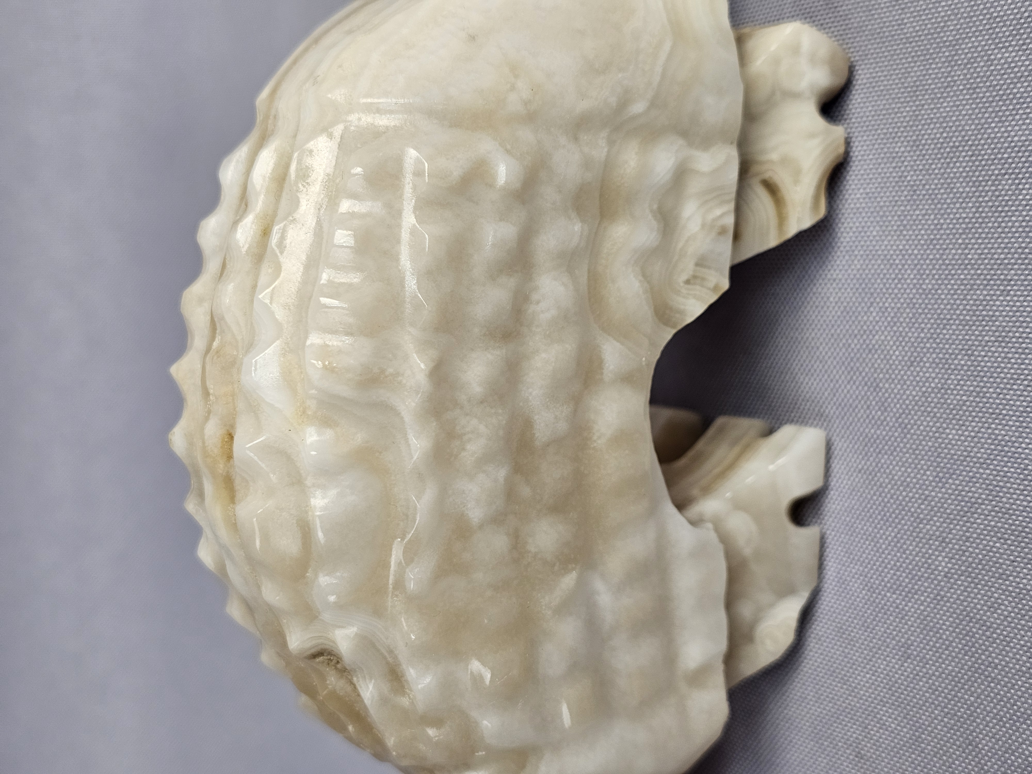 This hand-carved figurine represents an armadillo, executed in a style consistent with Southwestern United States and Mexican folk art, often categorized as a fetish carving. The item is carved from a translucent, banded stone, likely onyx or calcite, displaying natural sedimentary layers in varying shades of white, cream, and light tan. Length: 7.5 inches Height: 3 inches The figurine is in good condition with some signs of age and handling. There is a notable chip on the underside of one front foot. The surface shows light abrasions and minor scratches consistent with display.