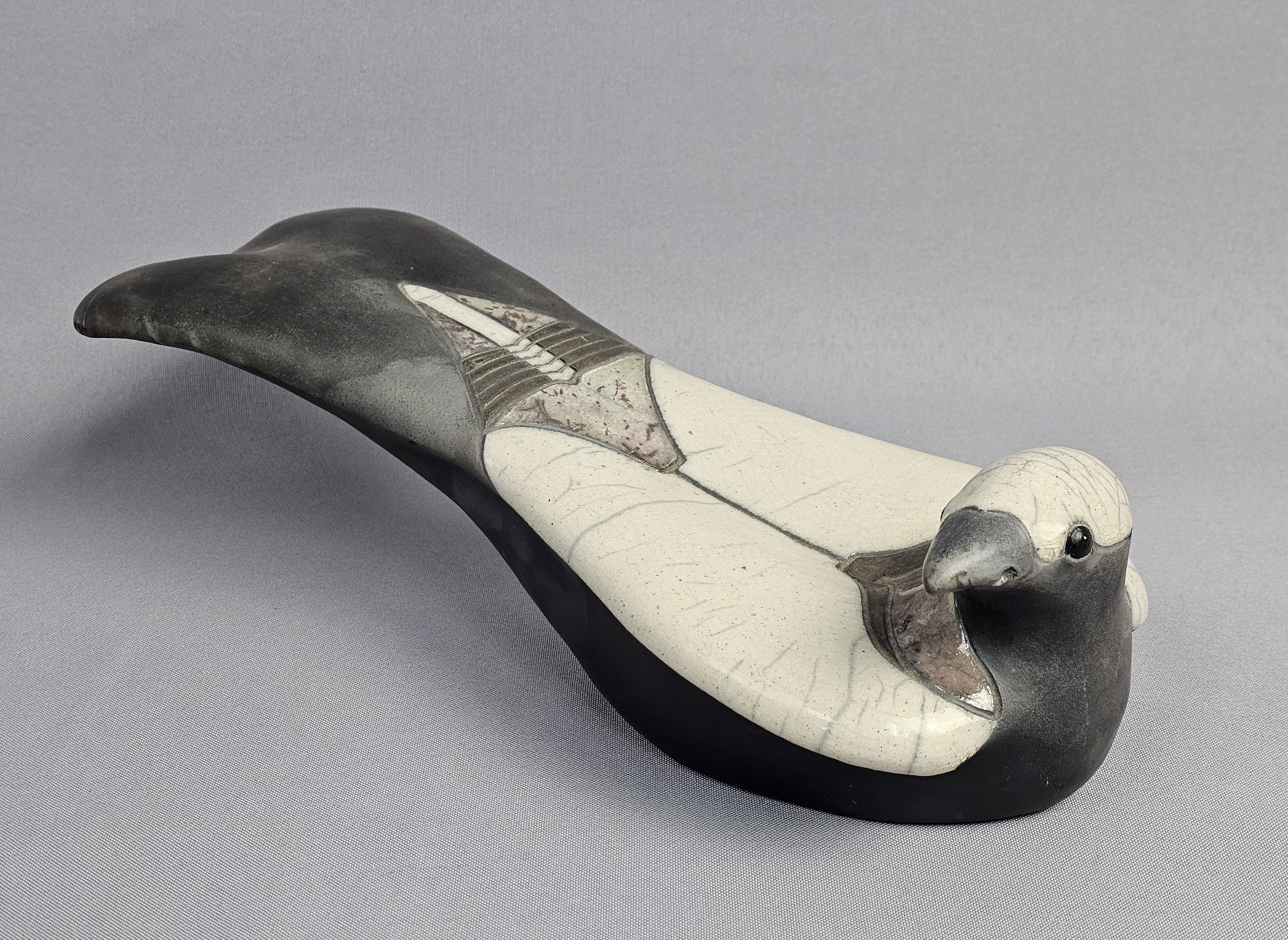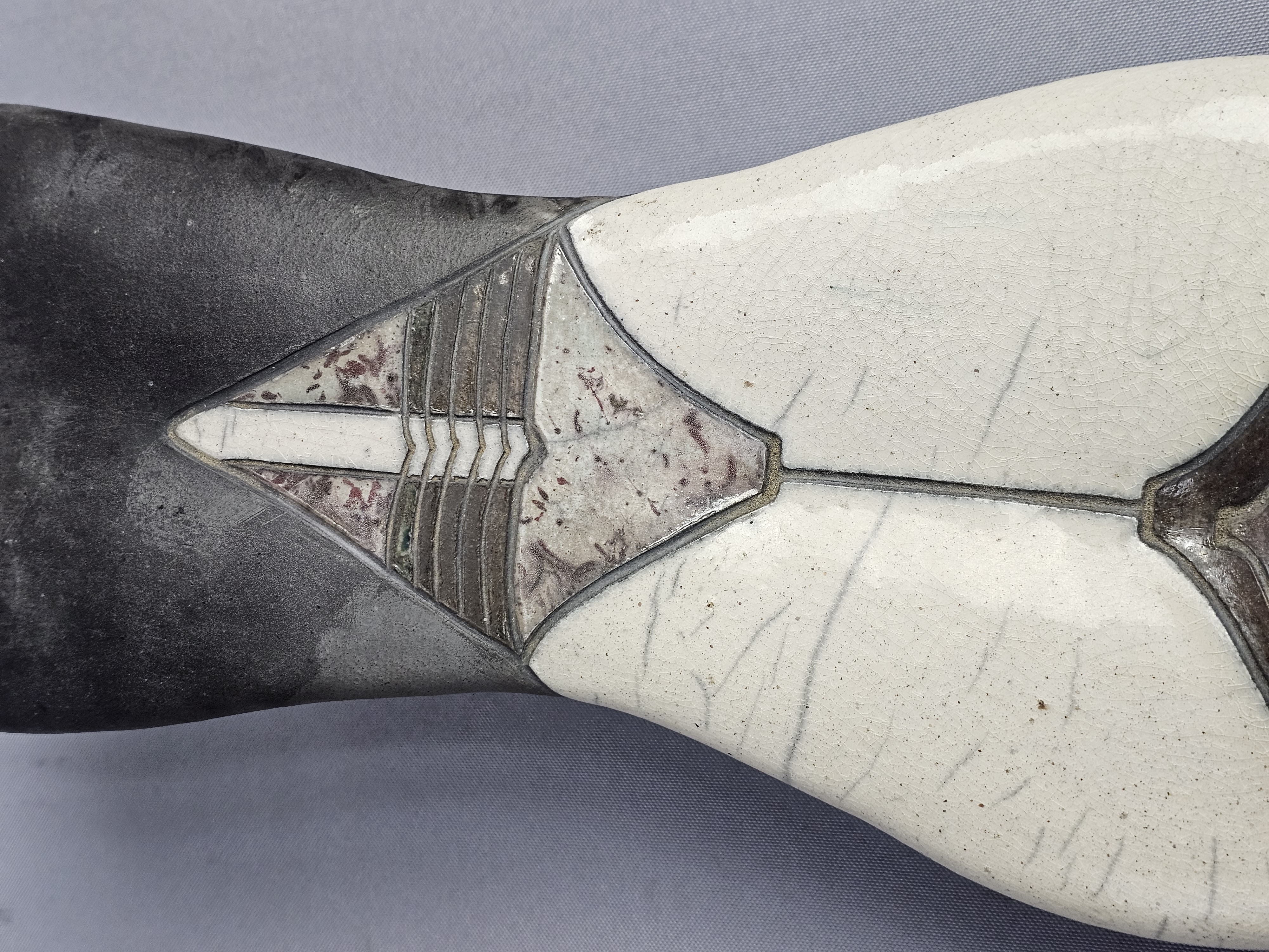A contemporary stylized ceramic bird sculpture featuring a modernist, streamlined form with the head turned back toward the body. The piece is constructed from ceramic and utilizes Raku firing techniques. Length: 12 inches The sculpture is in good overall condition. The extensive craquelure is an intended result of the Raku firing process. There is a small, shallow chip on the tip of the beak. The matte black body shows minor surface scuffs and shelf wear consistent with handling.