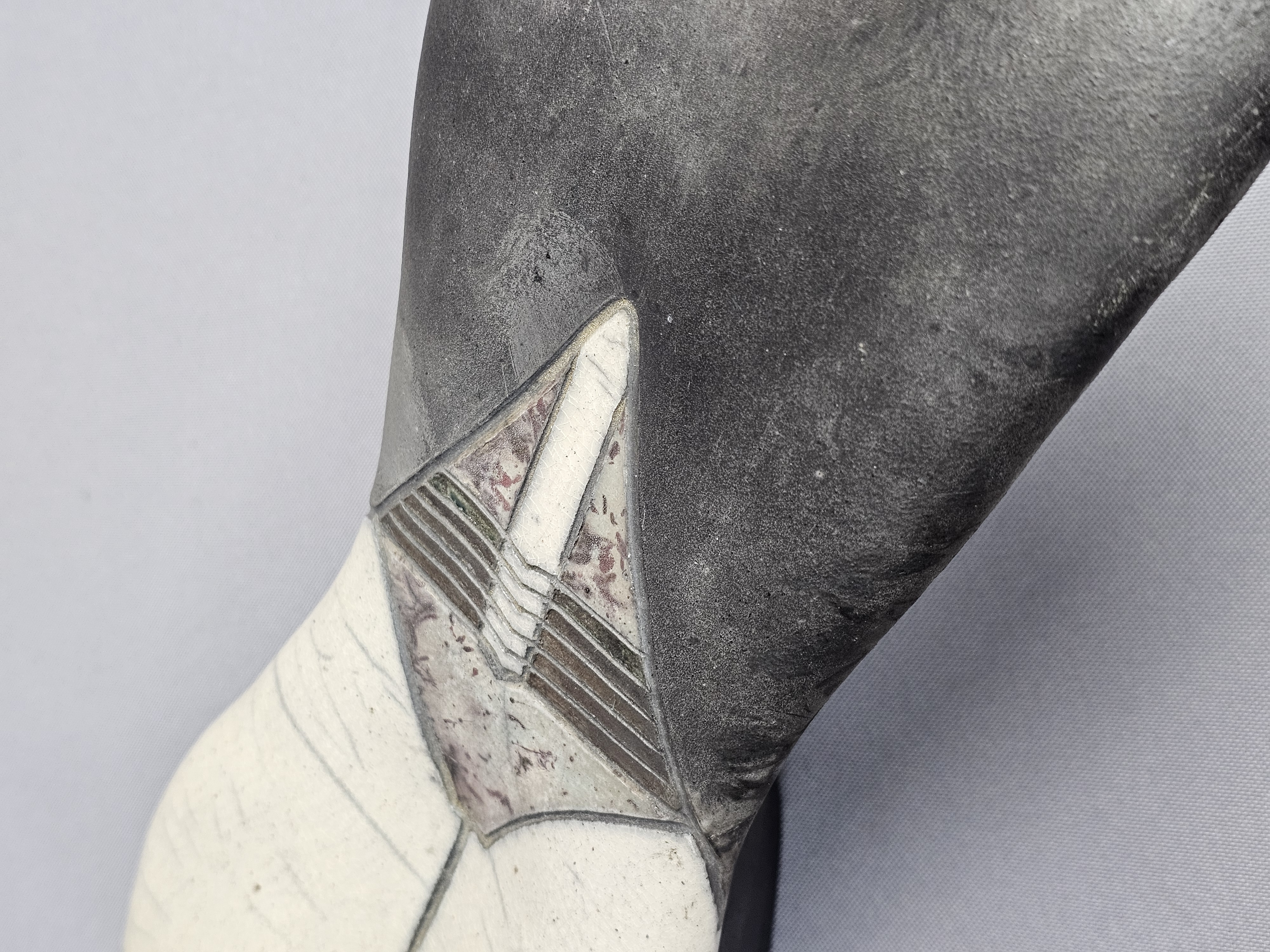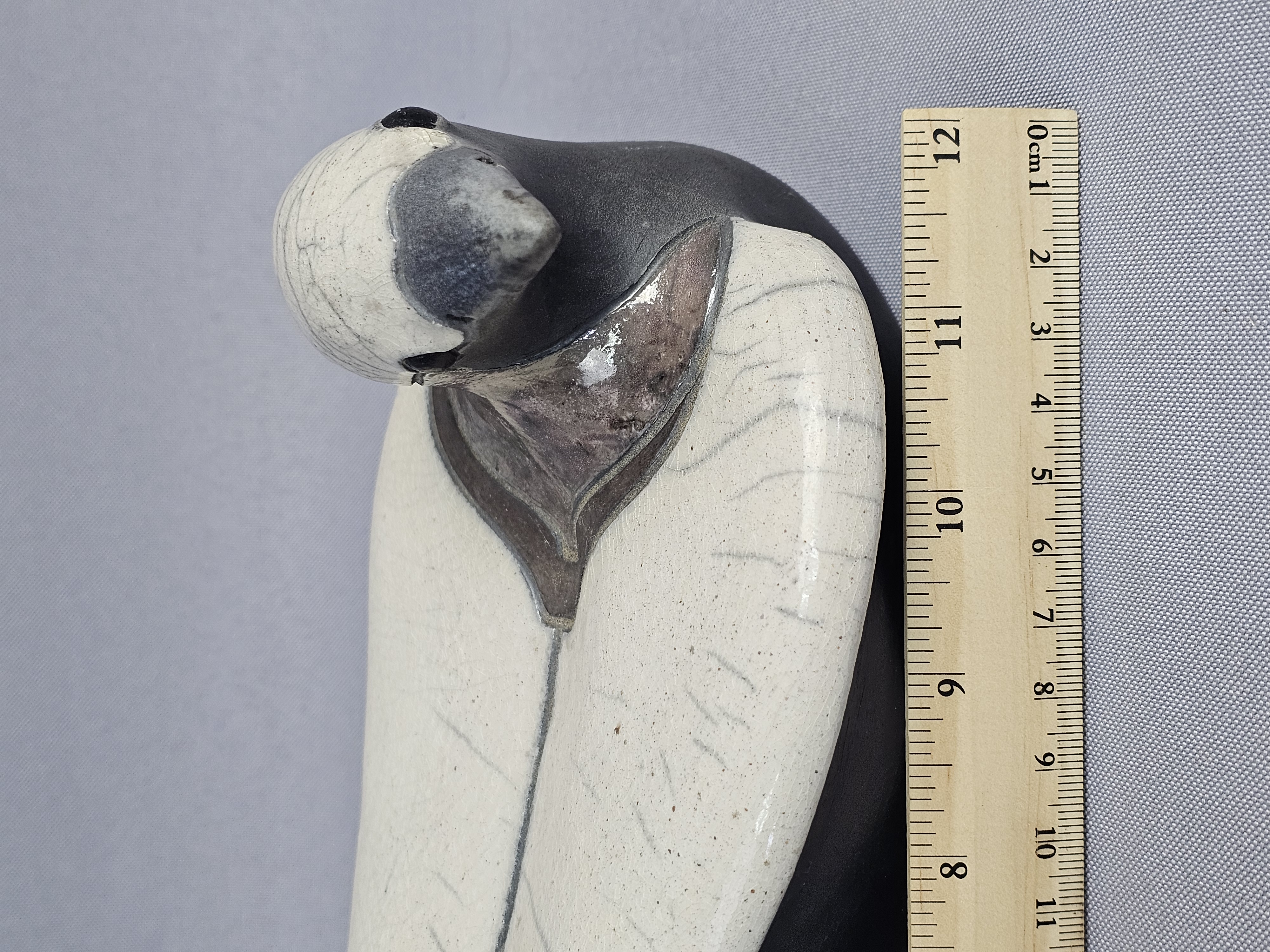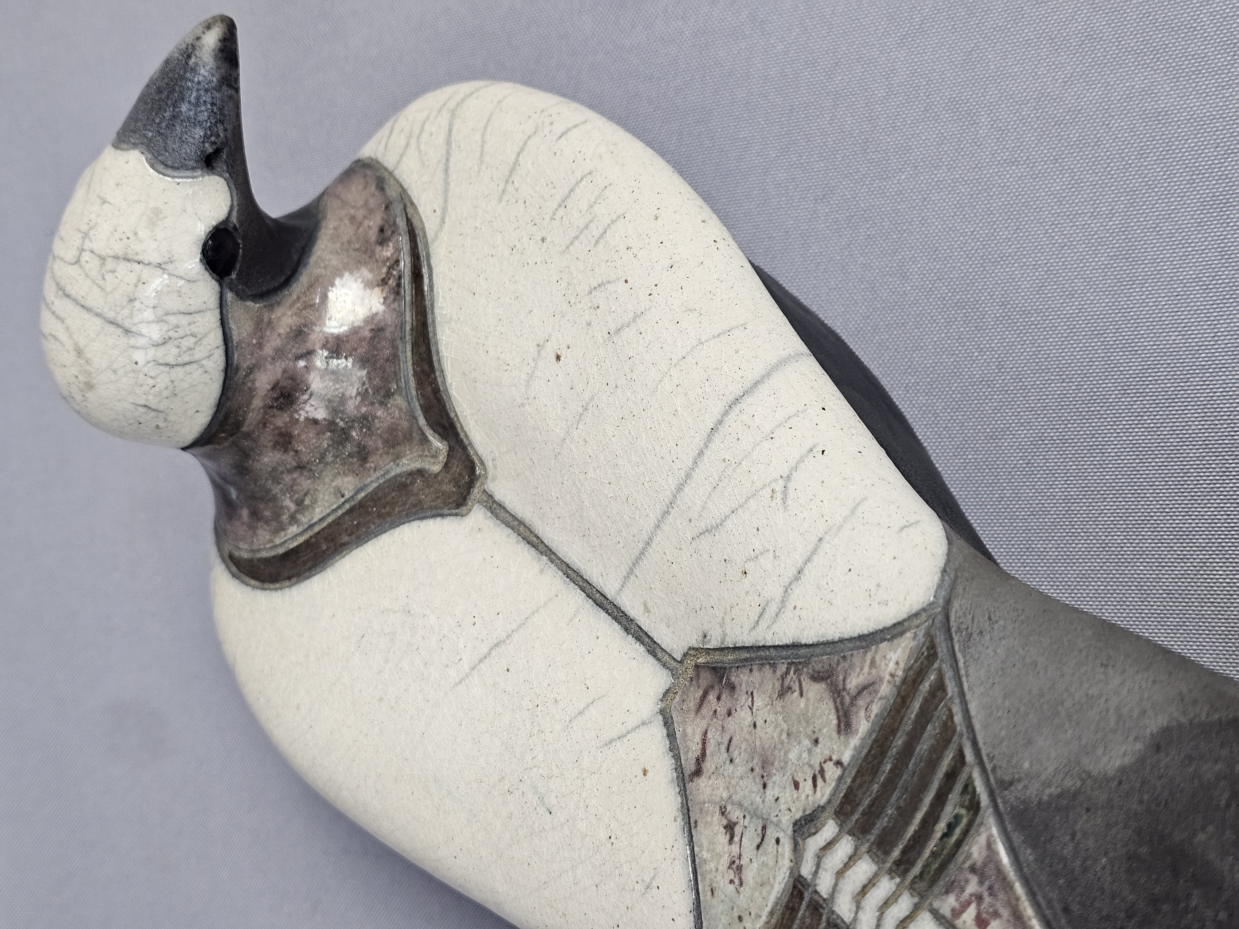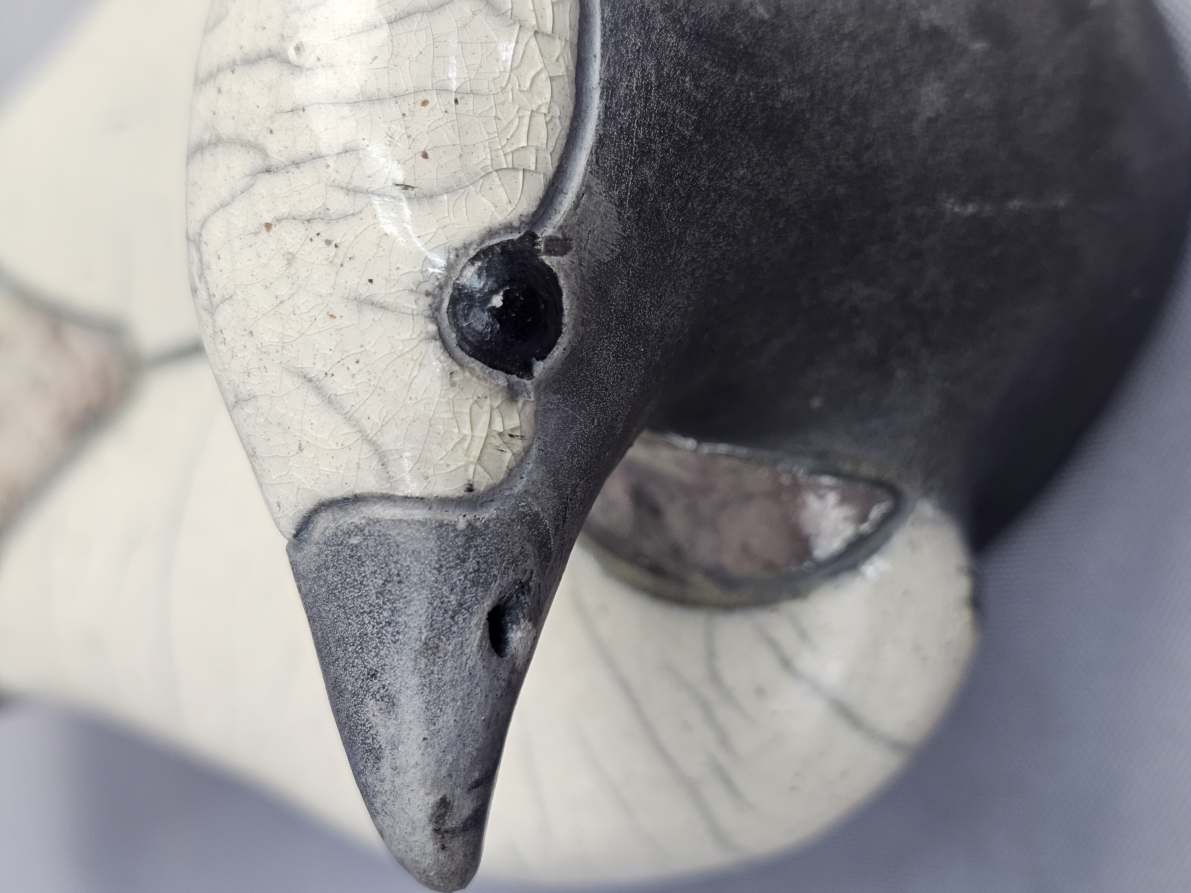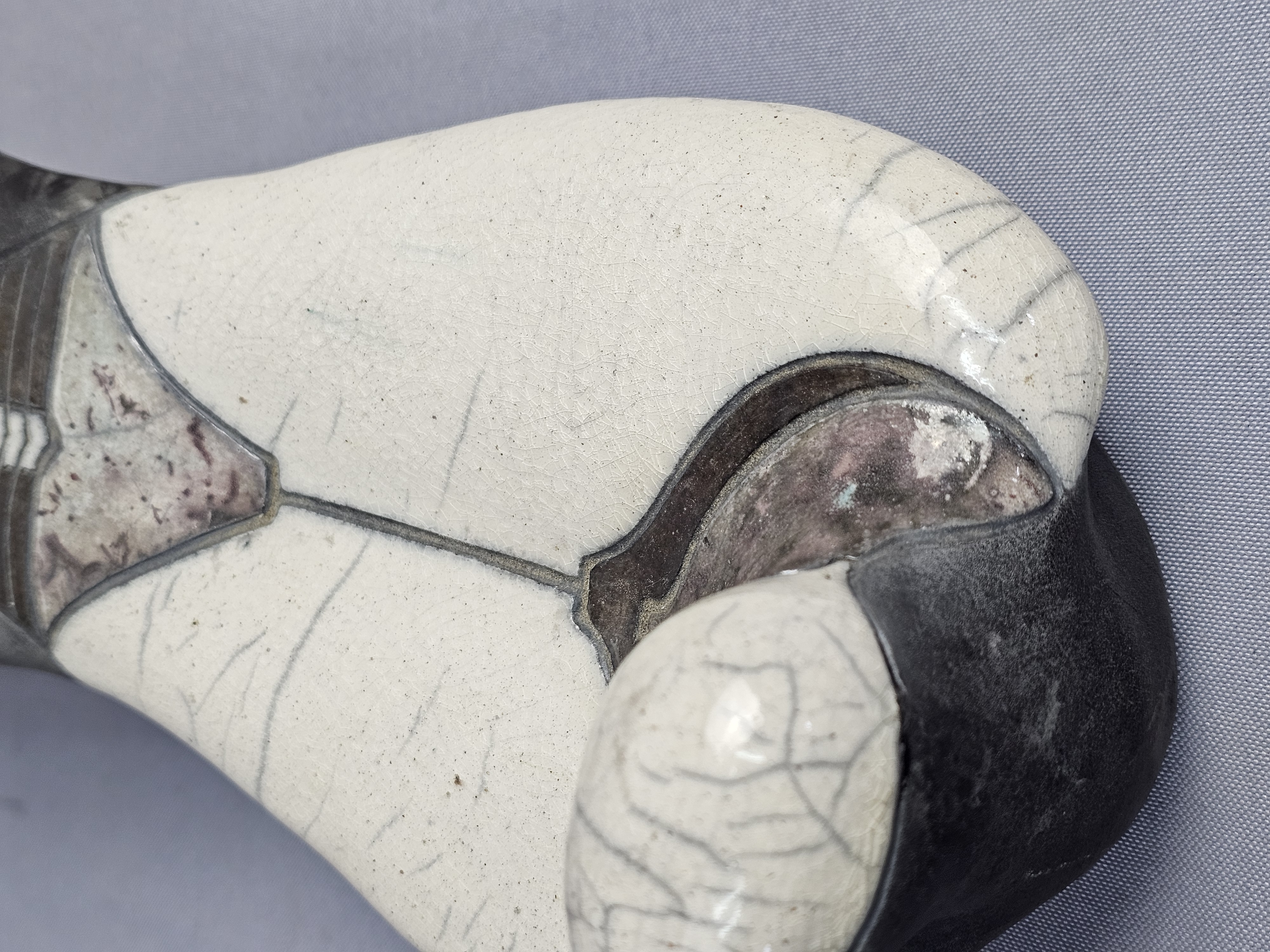 The sculpture is in good overall condition. The extensive craquelure is an intended result of the Raku firing process. There is a small, shallow chip on the tip of the beak. The matte black body shows minor surface scuffs and shelf wear consistent with handling.