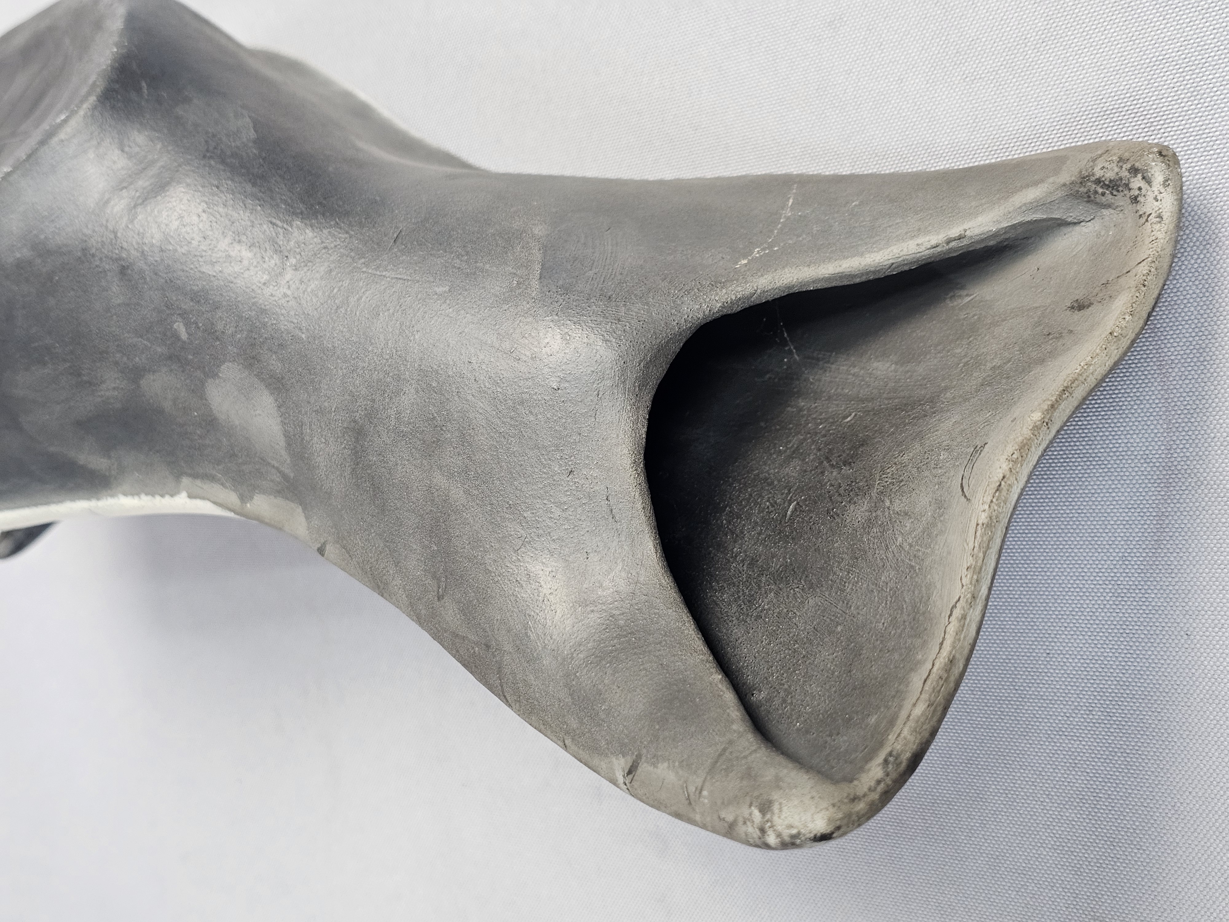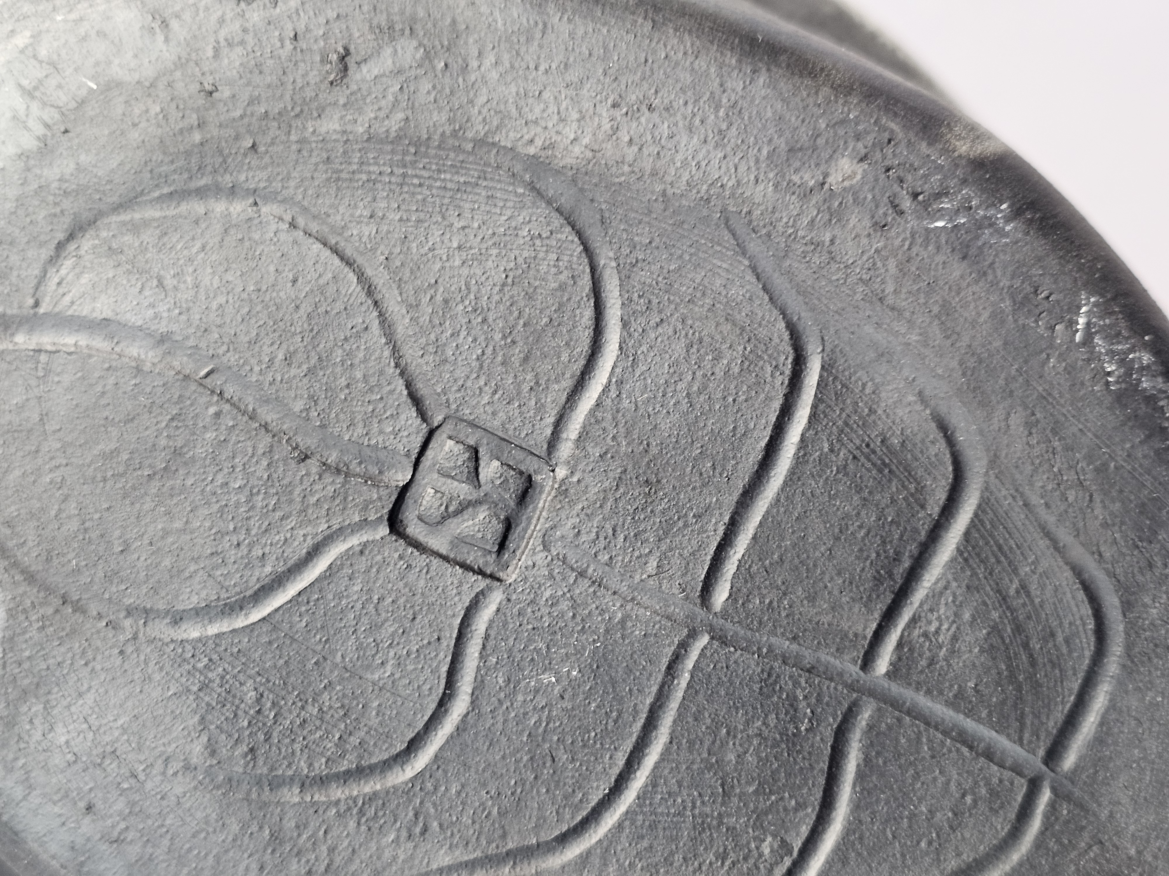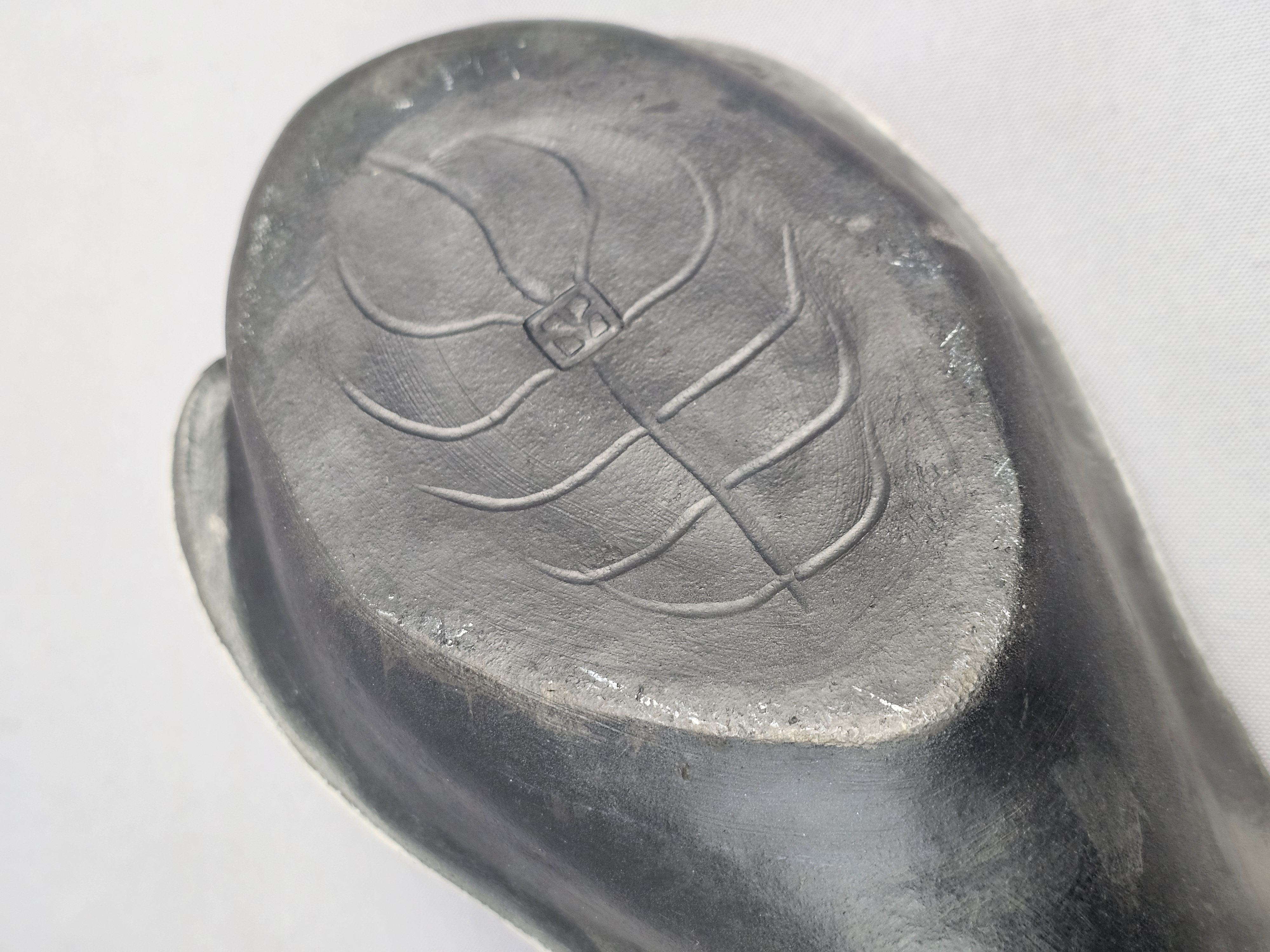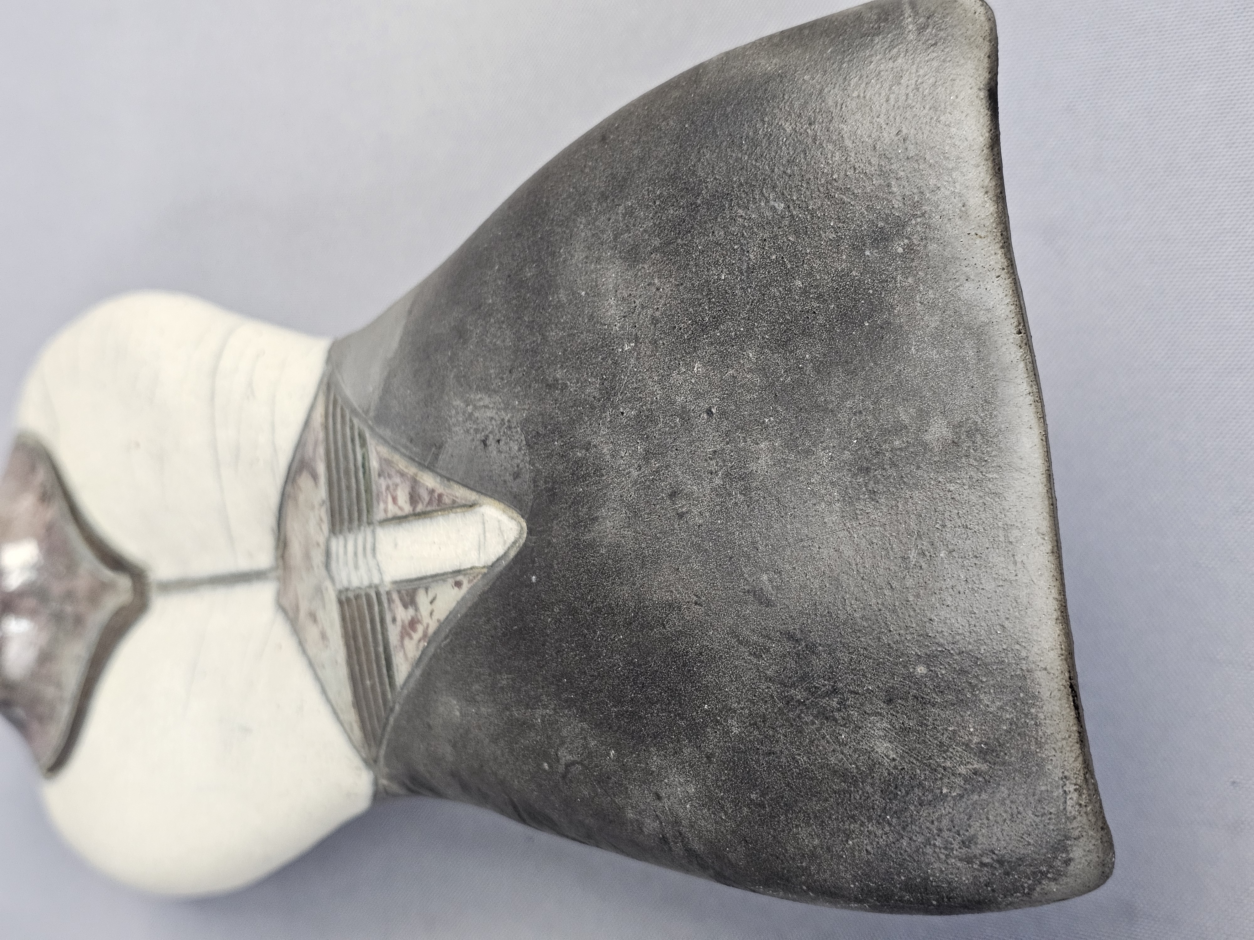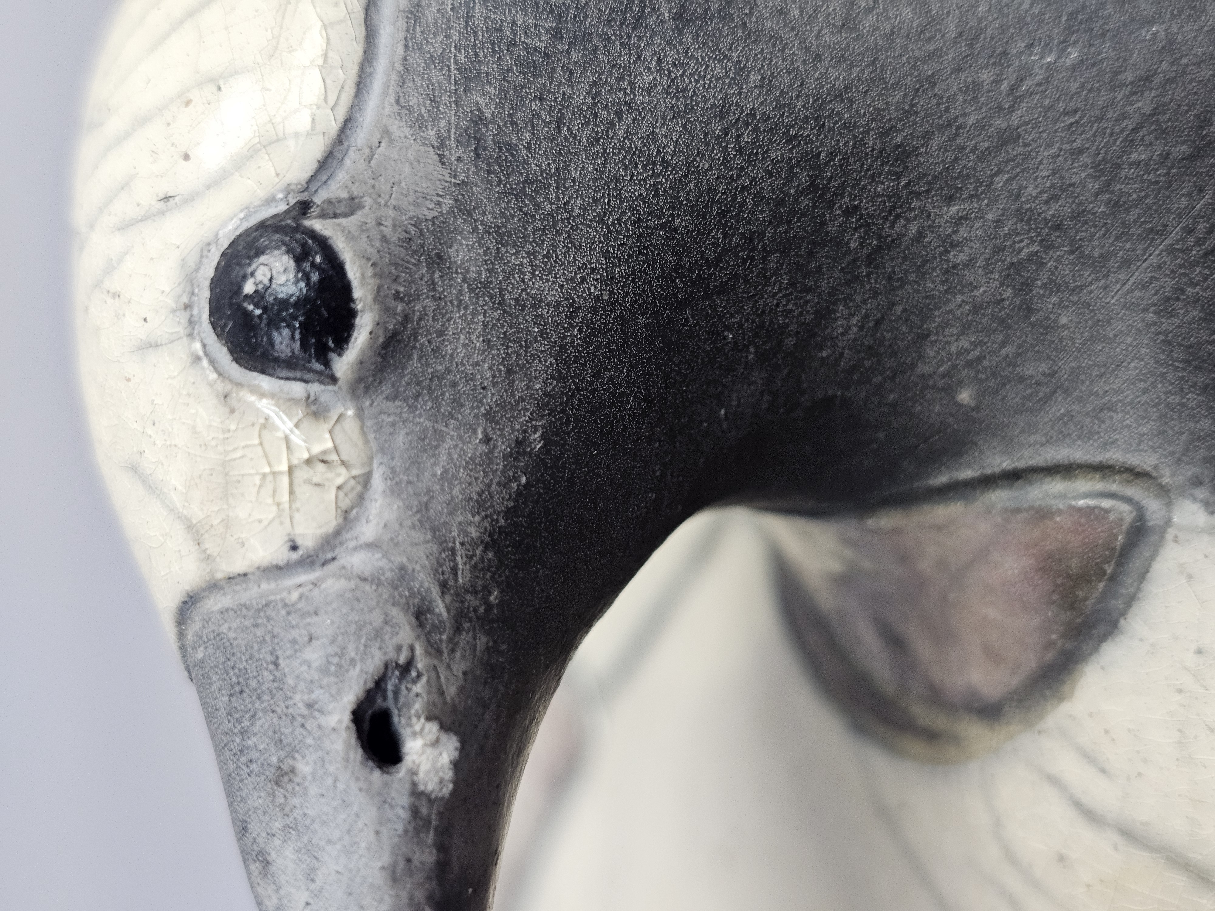 The sculpture is in good overall condition. The extensive craquelure is an intended result of the Raku firing process. There is a small, shallow chip on the tip of the beak. The matte black body shows minor surface scuffs and shelf wear consistent with handling.