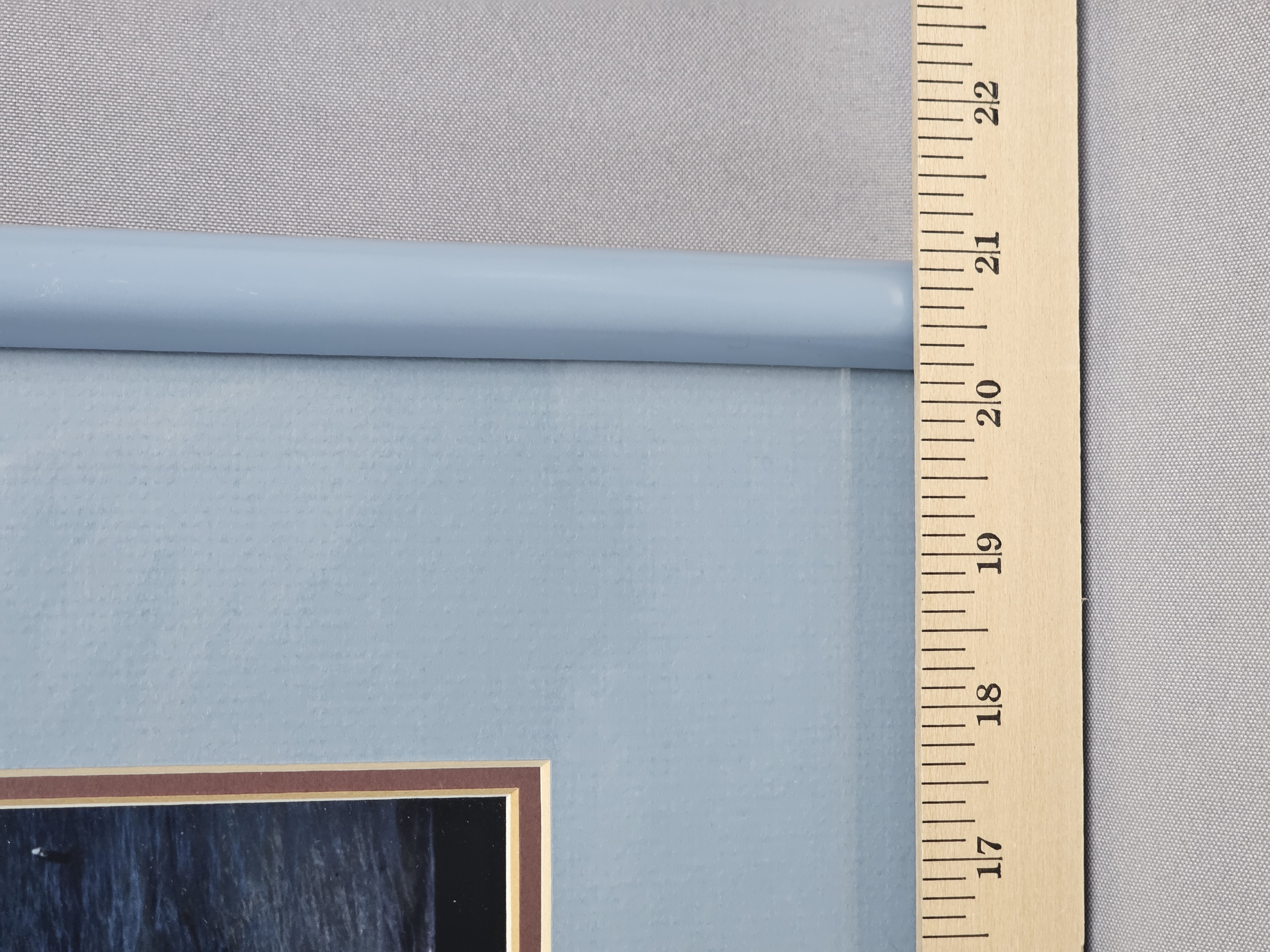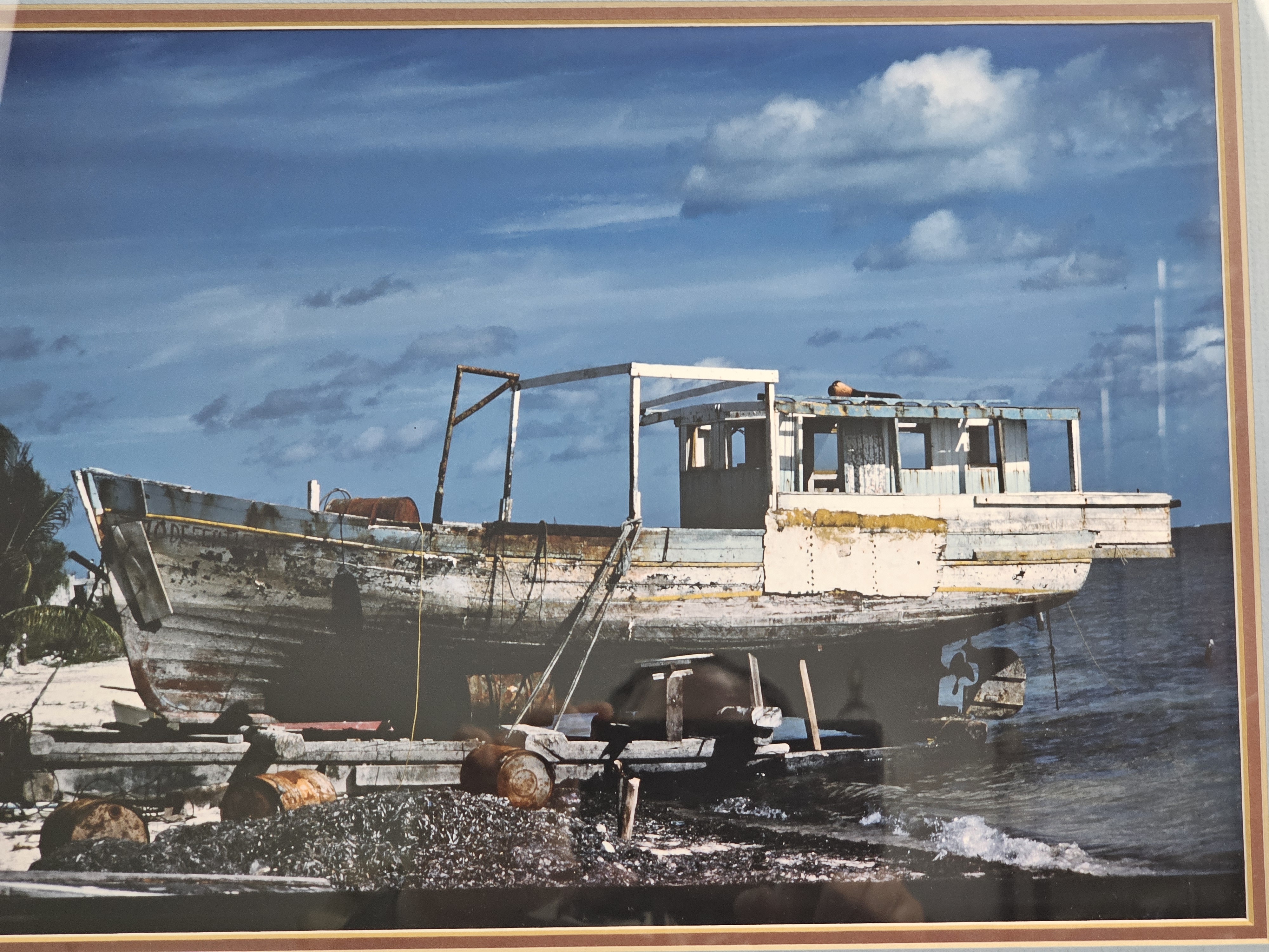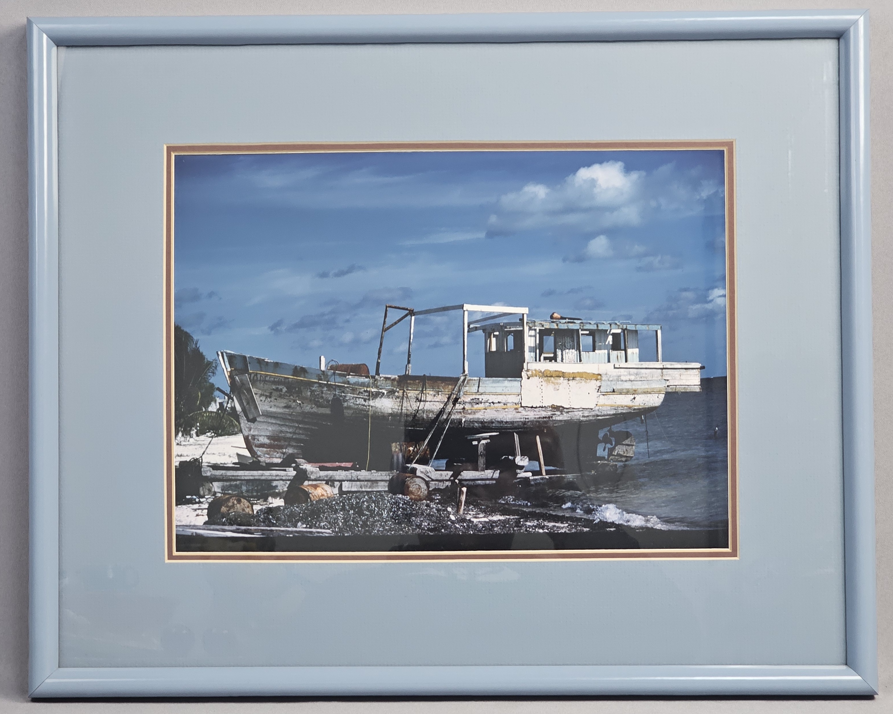 This color photograph depicts a weathered wooden boat dry-docked on a rocky shoreline under a bright blue sky with scattered clouds. The piece is matted in blue and brown and set within a light blue frame. Overall framed dimensions: 21 x 17 inches tall The photograph appears to be in good condition with no apparent fading, foxing, or surface damage. The frame exhibits minor signs of age and wear, including small nicks and paint loss at the corners. There is a puncture in the brown paper backing.