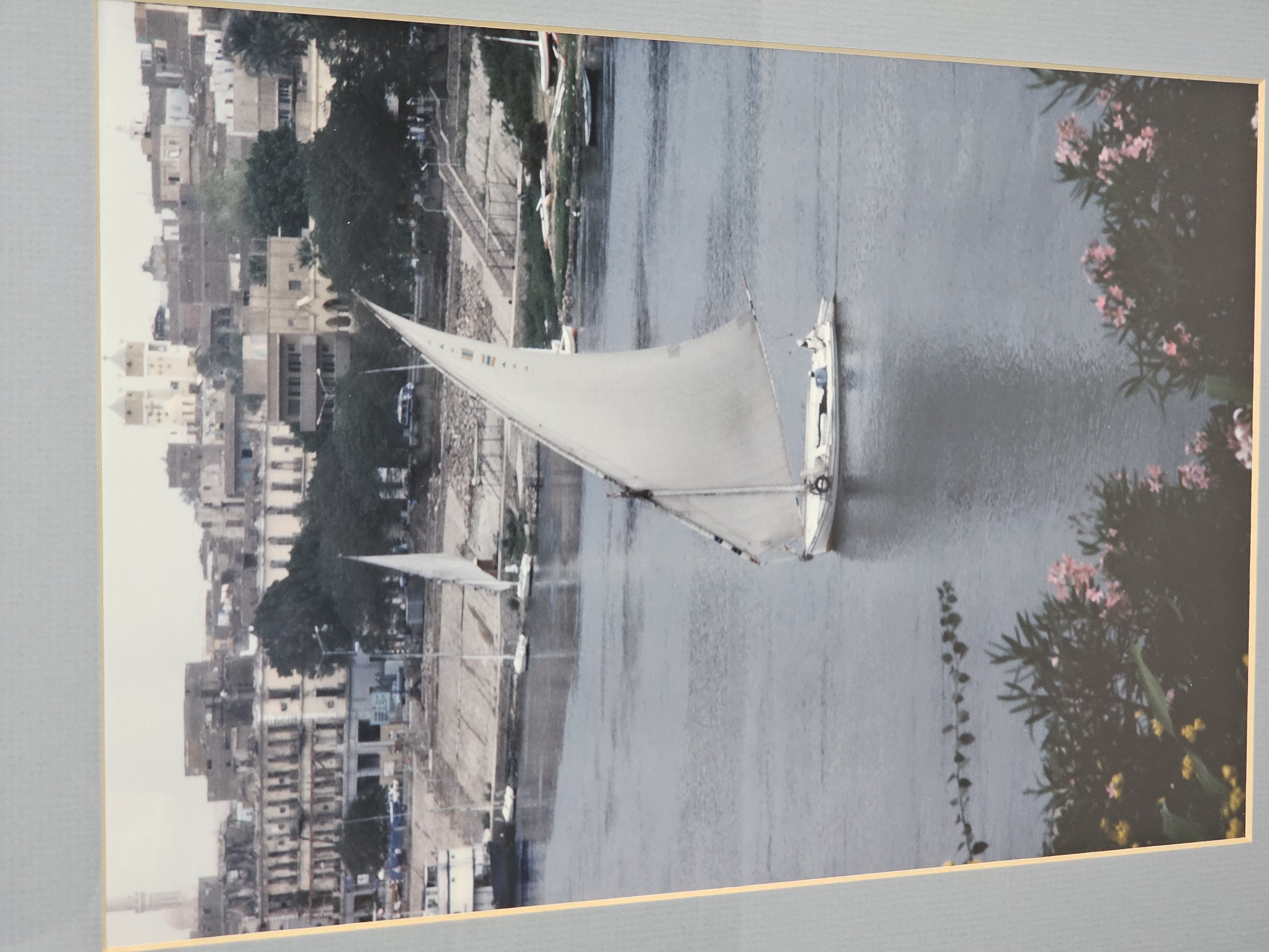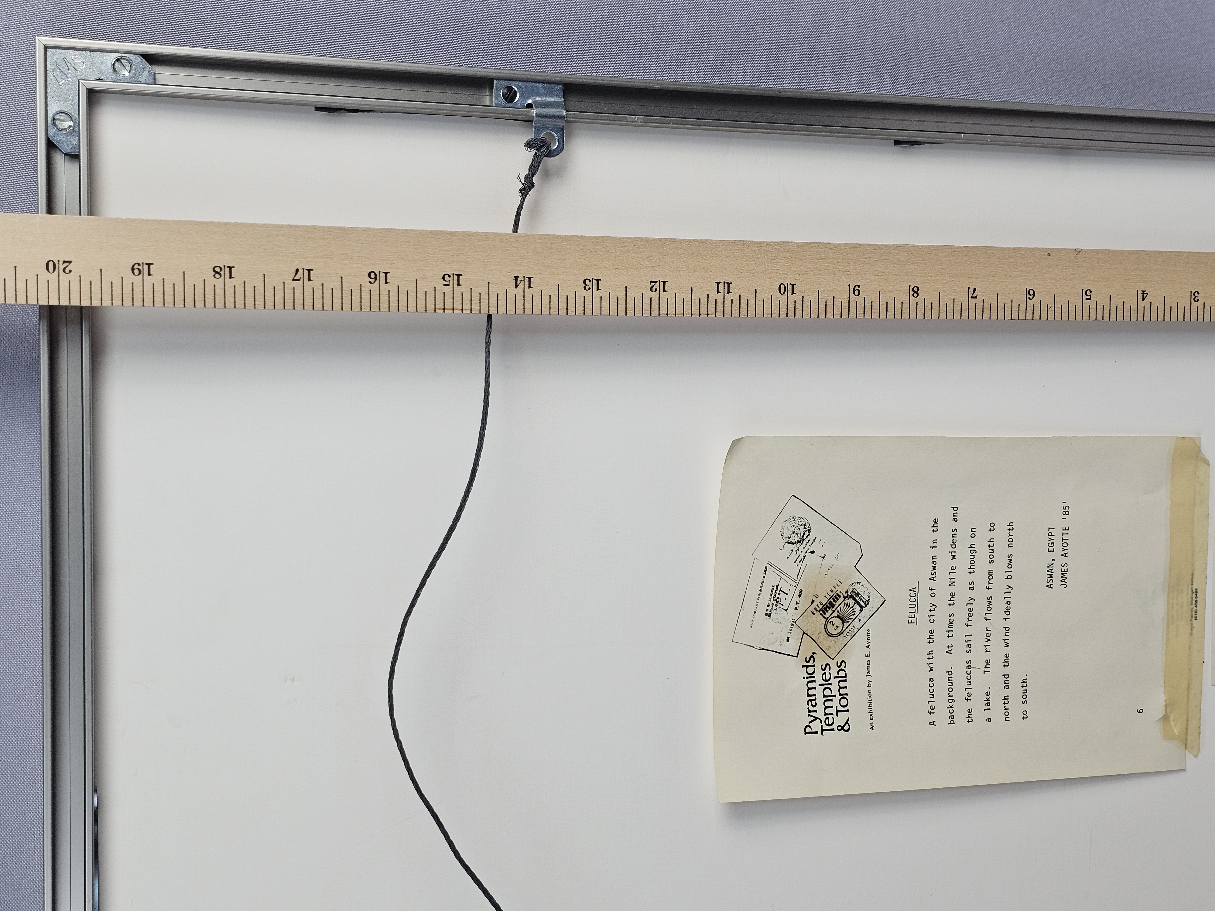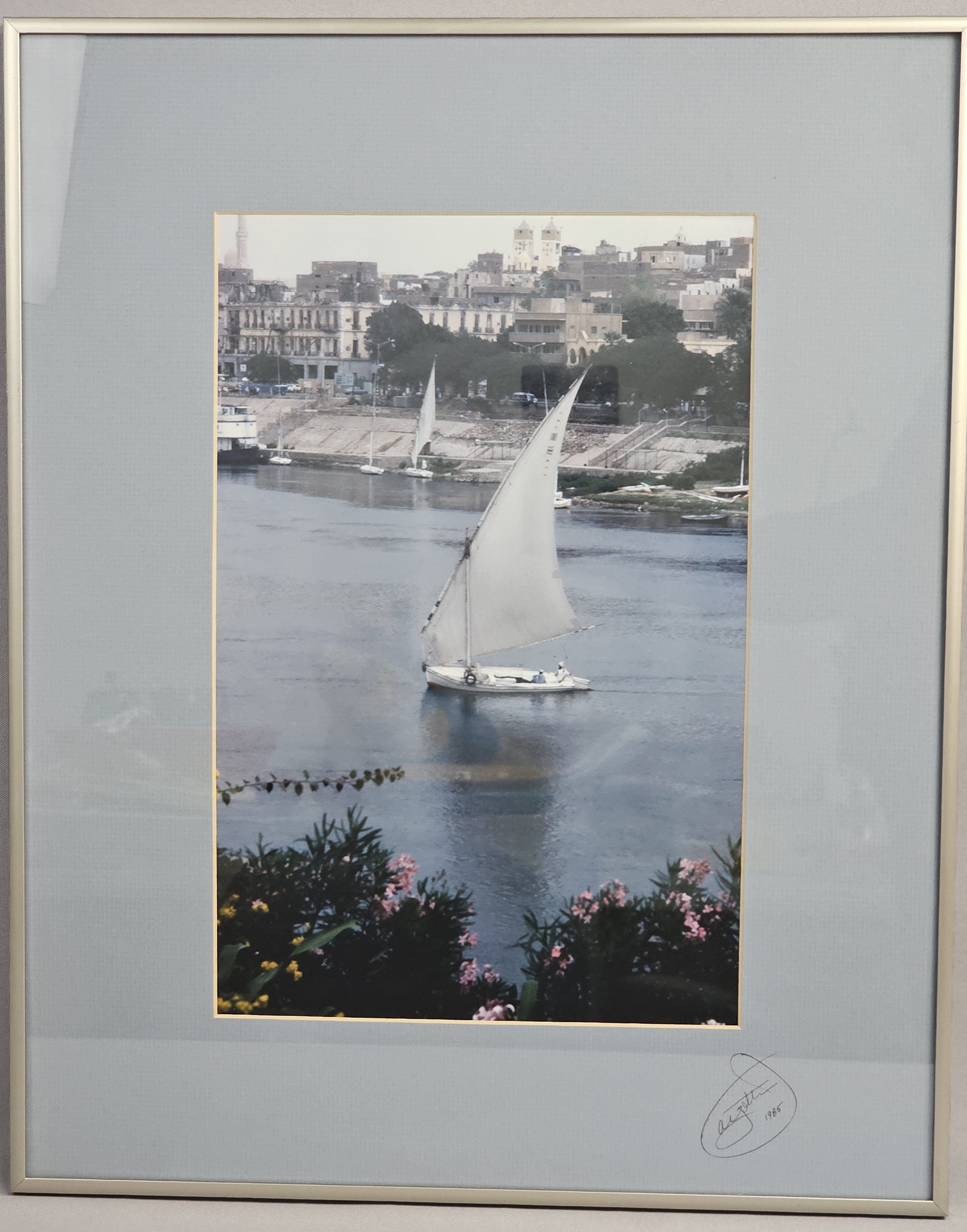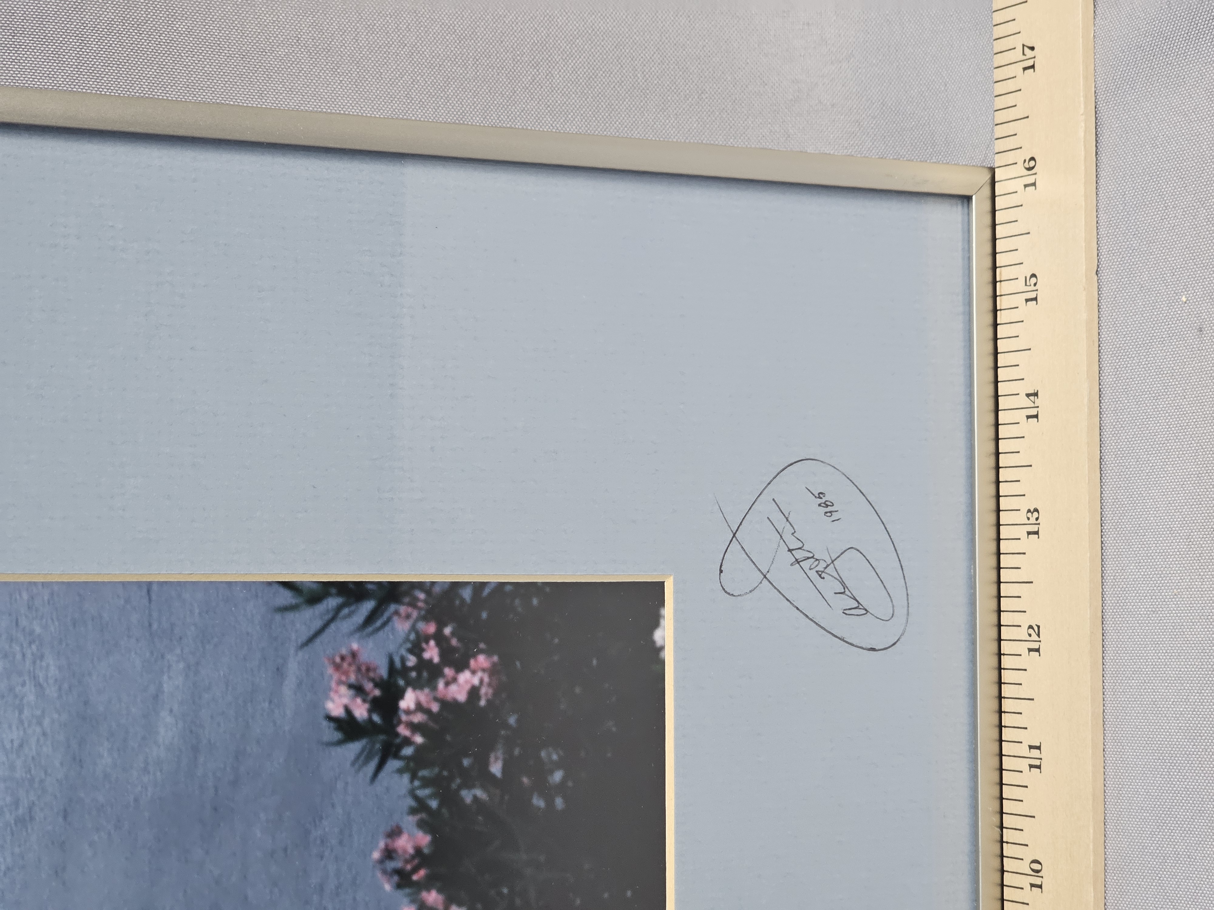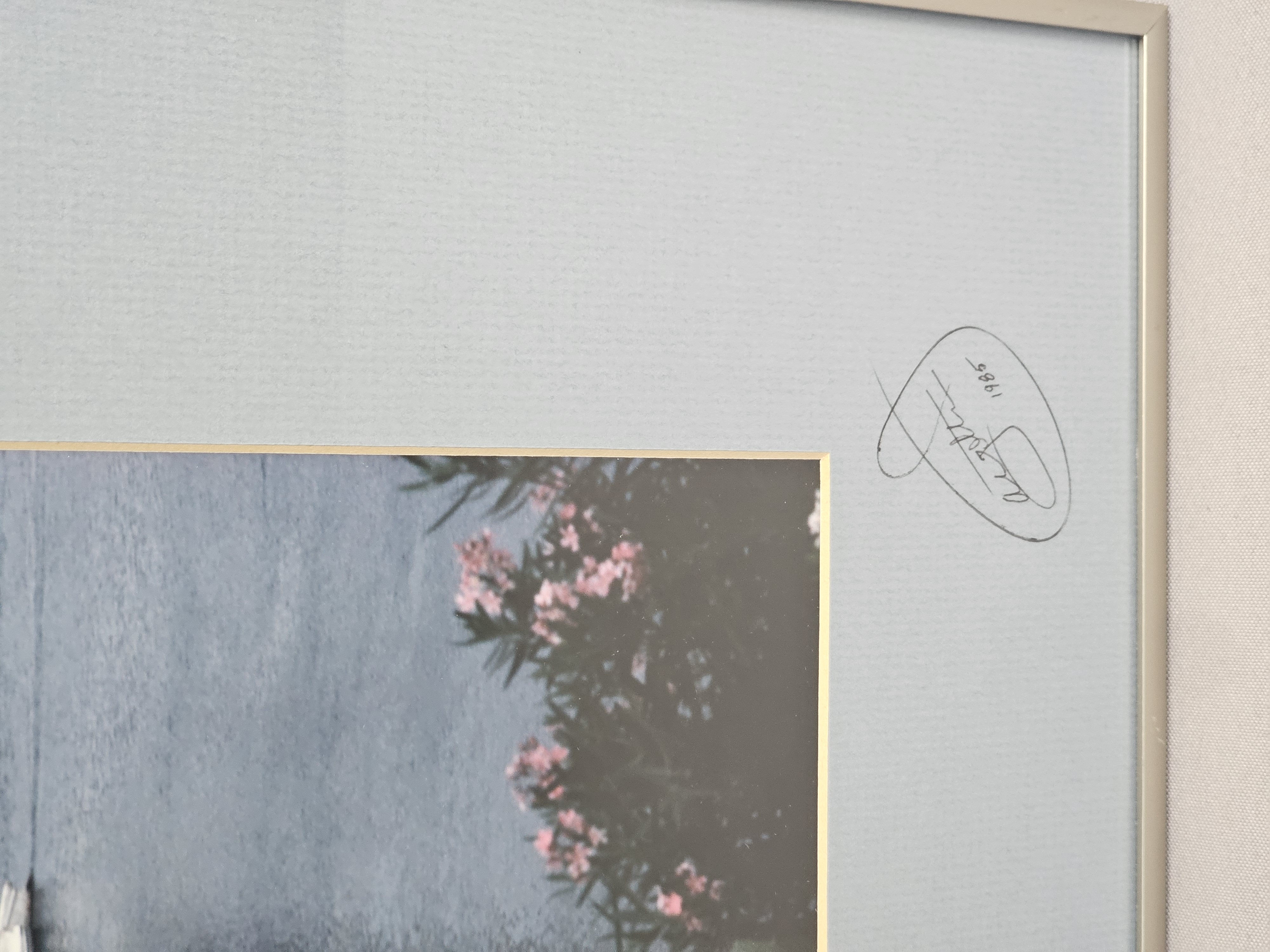 The work is hand-signed in black ink. The photograph is mounted behind a double mat with a light blue-grey outer layer and a gold-toned inner edge. It is housed in a silver-toned metal gallery frame under glazing. Frame: 20 x 16 inches The print is in good condition with no visible signs of fading, silvering, or foxing. The frame exhibits minor superficial wear consistent with age and handling.