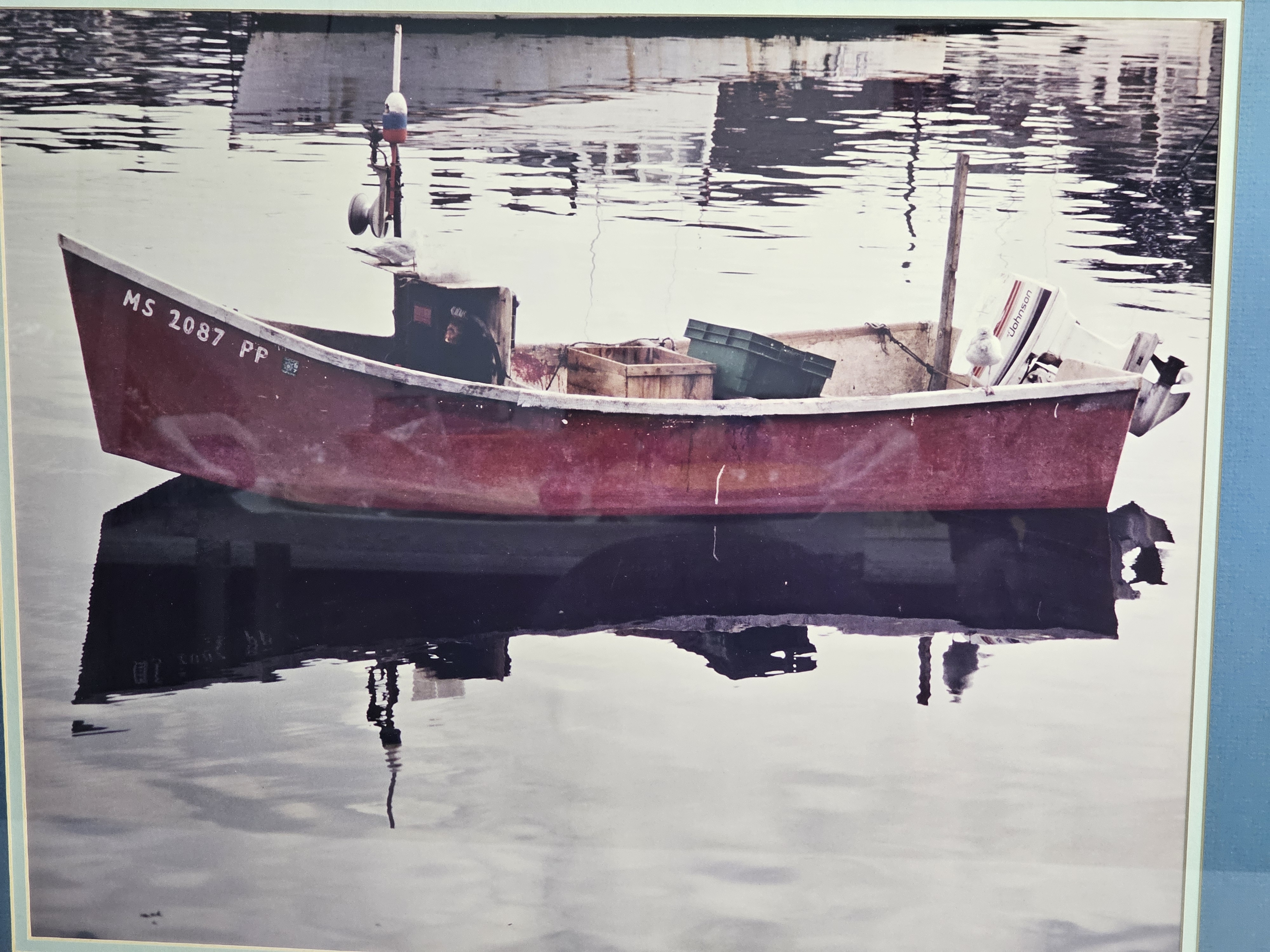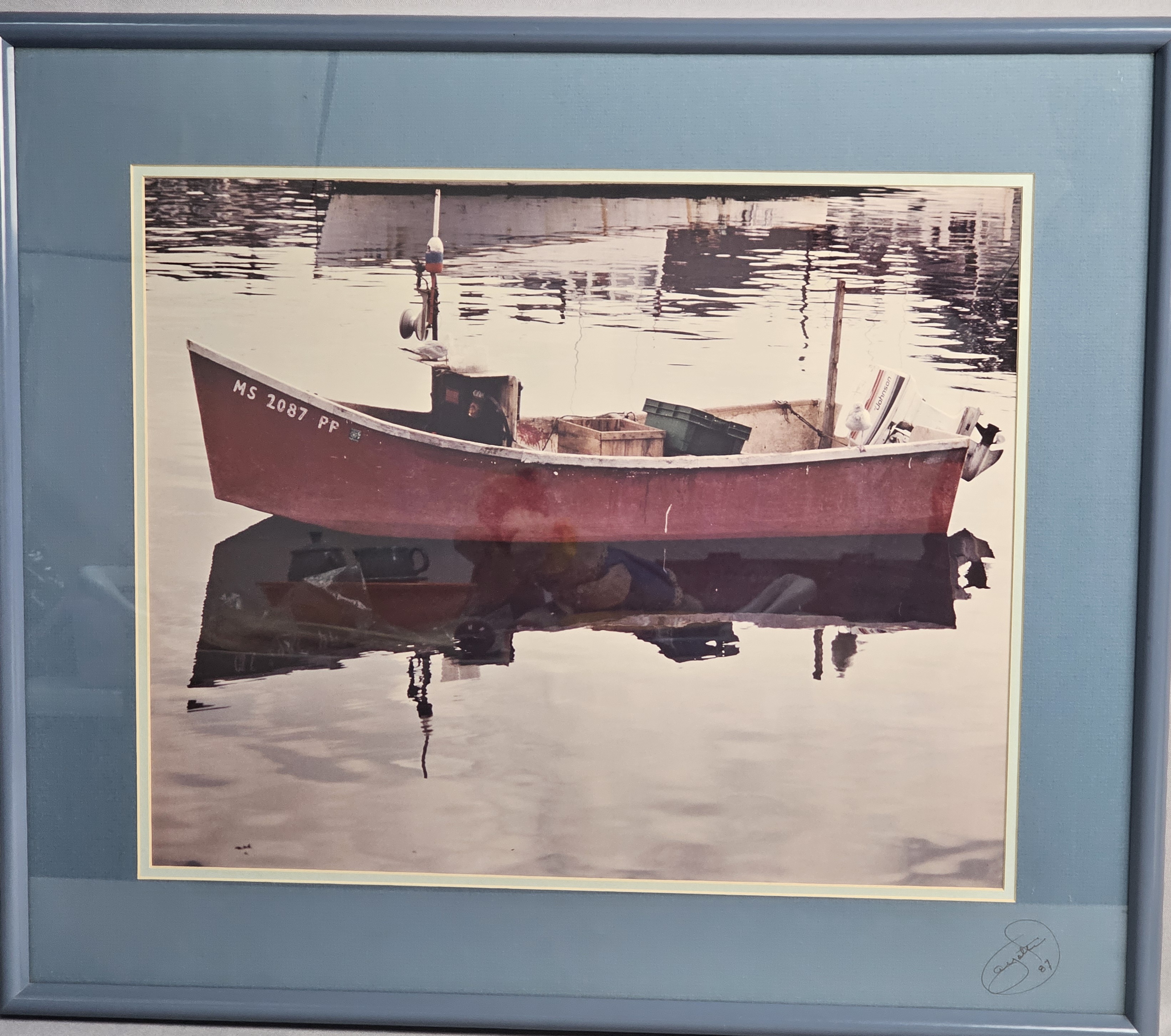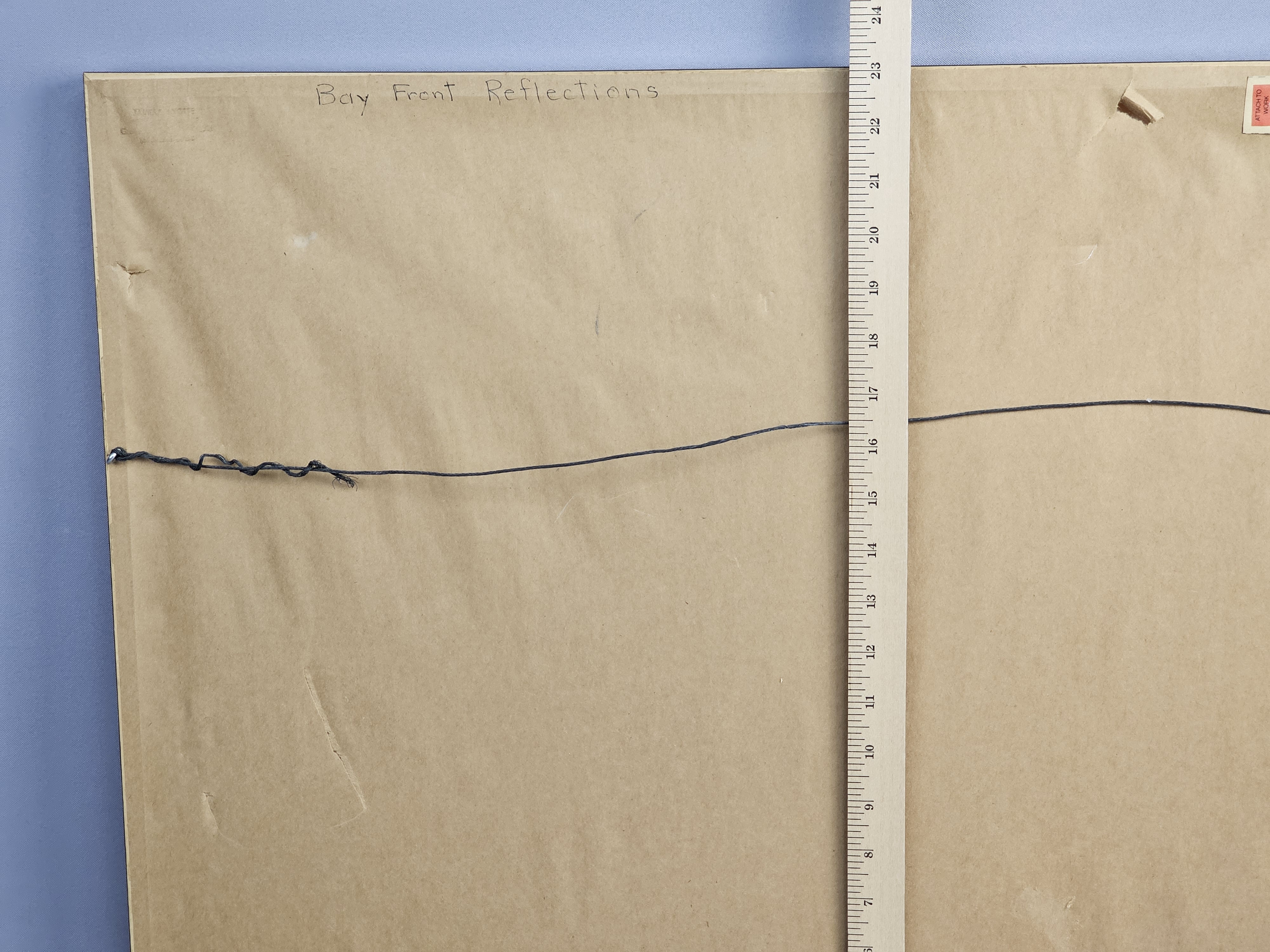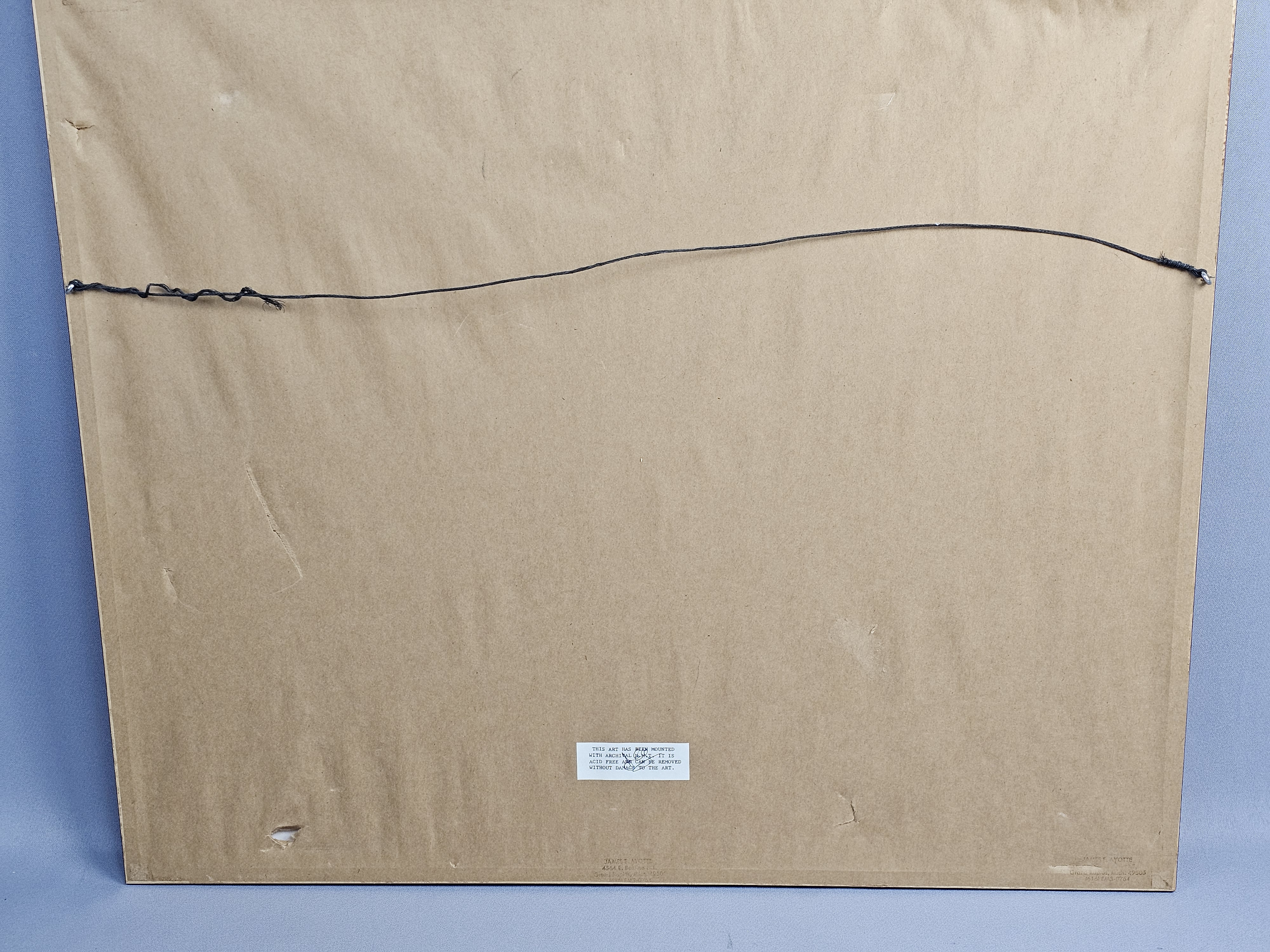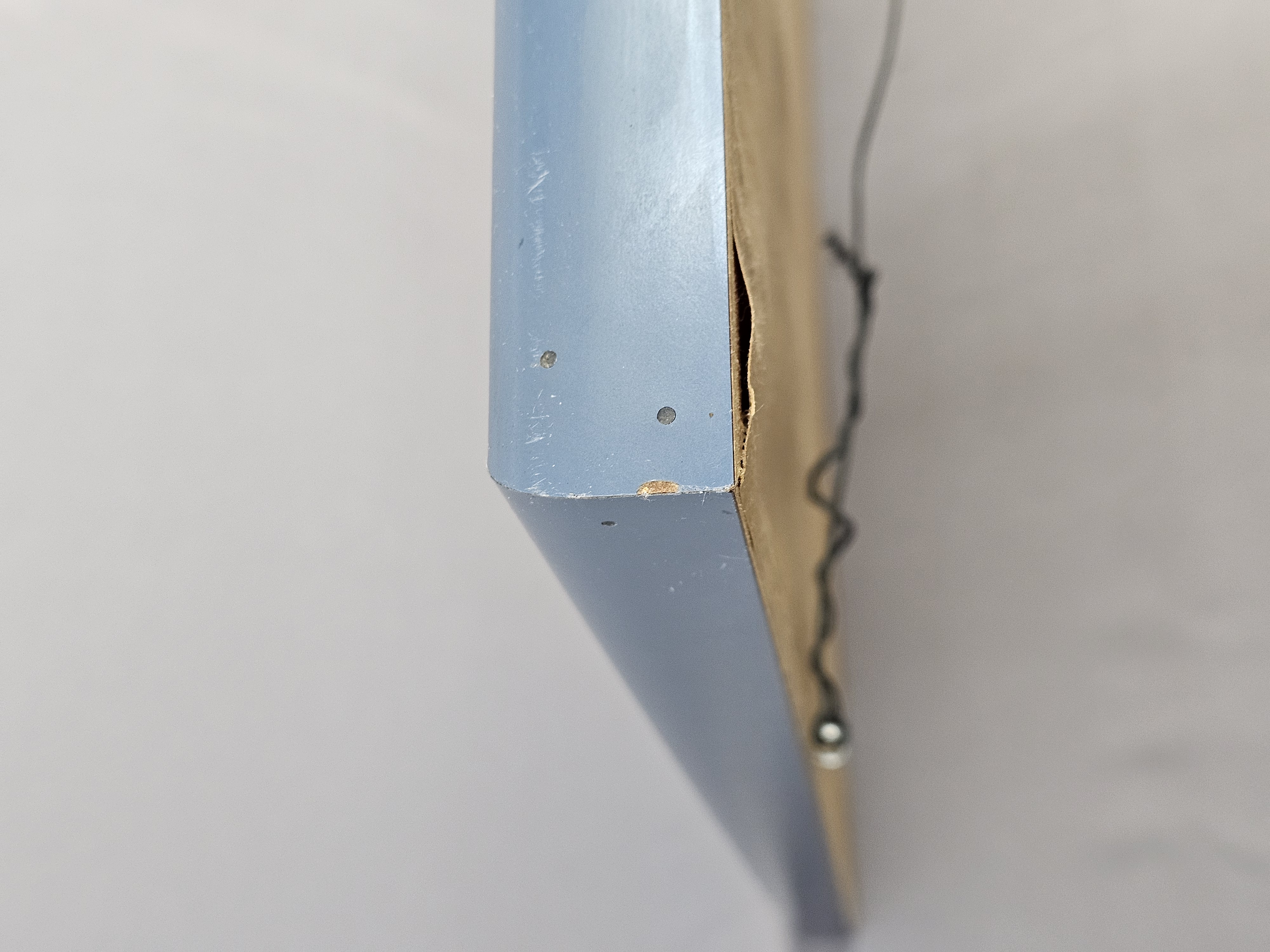 The frame exhibits scuffing and small chips to the paint, primarily at the corners. The paper backing has several tears and punctures.