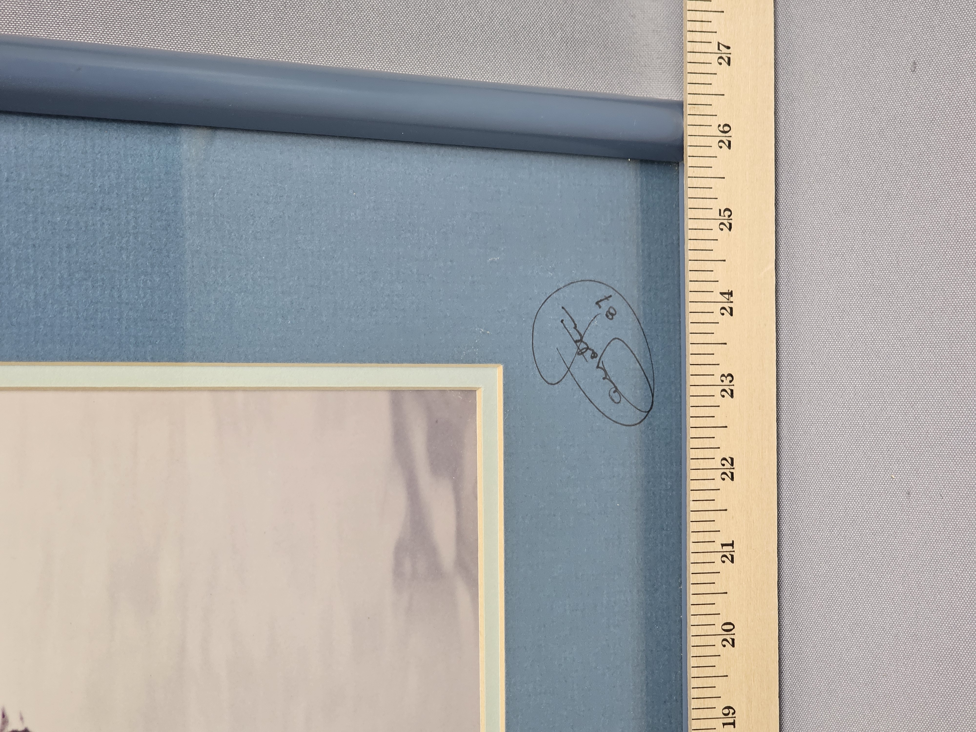 Frame: 26.5 x 23 inches tall The frame exhibits scuffing and small chips to the paint, primarily at the corners. The paper backing has several tears and punctures.