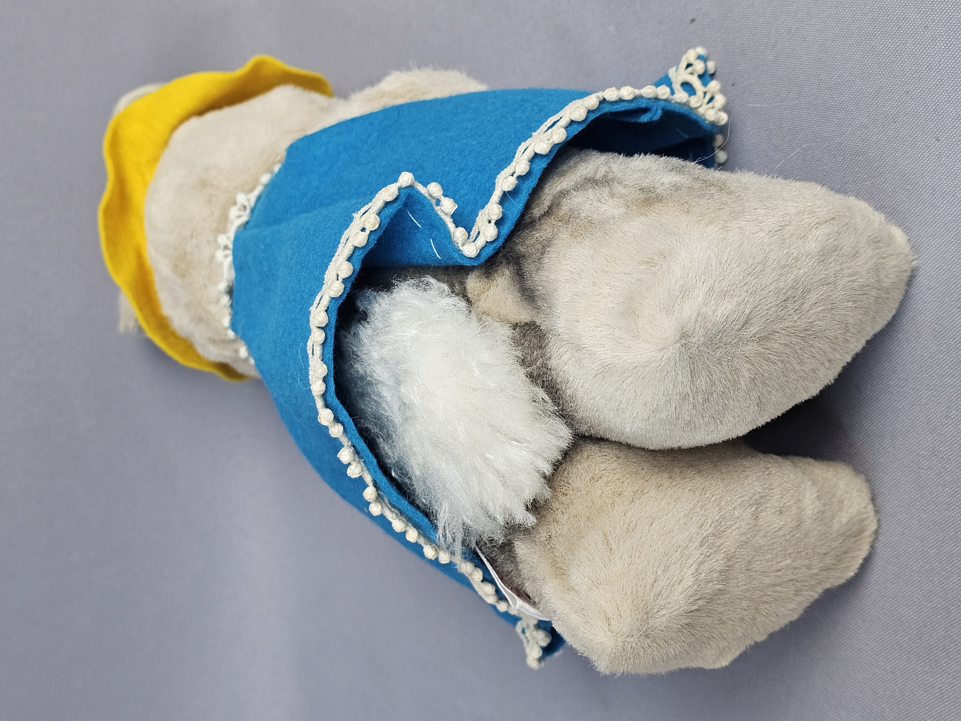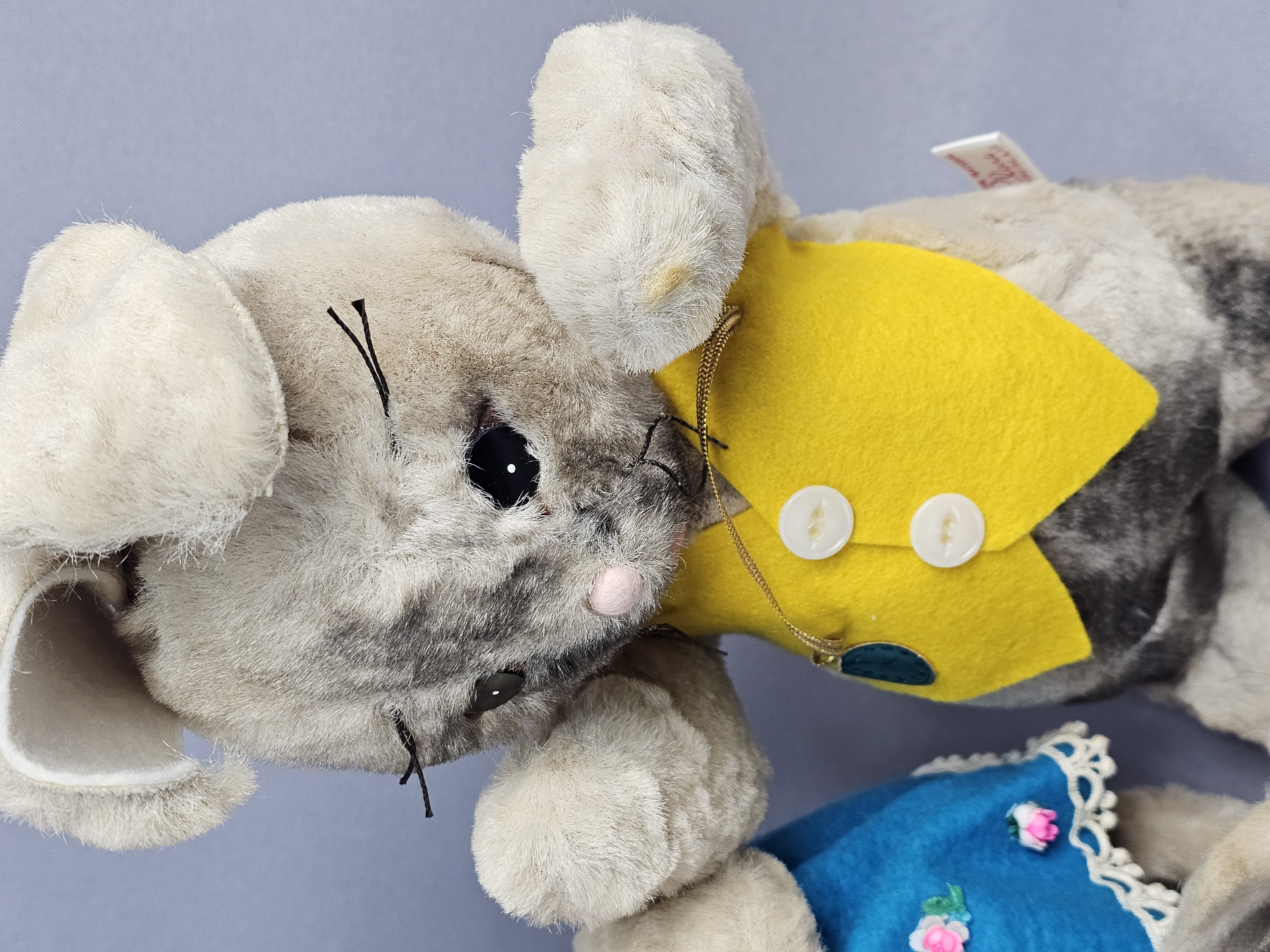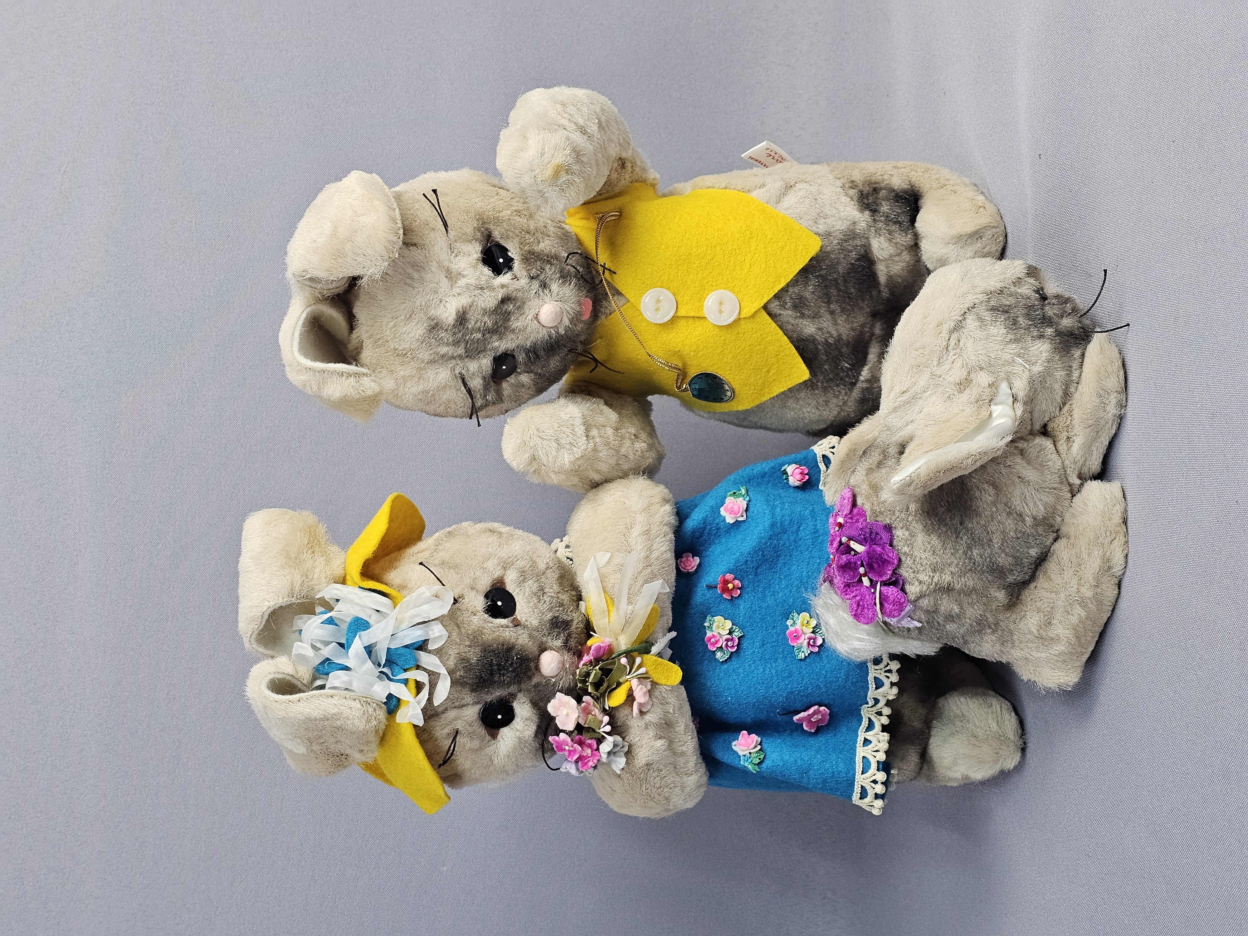 The items are in good vintage condition. The plush fabric exhibits minor matting and surface wear consistent with age. The felt clothing is intact with vibrant colors. Manufacturer tags are present and clearly legible. No original packaging is included.