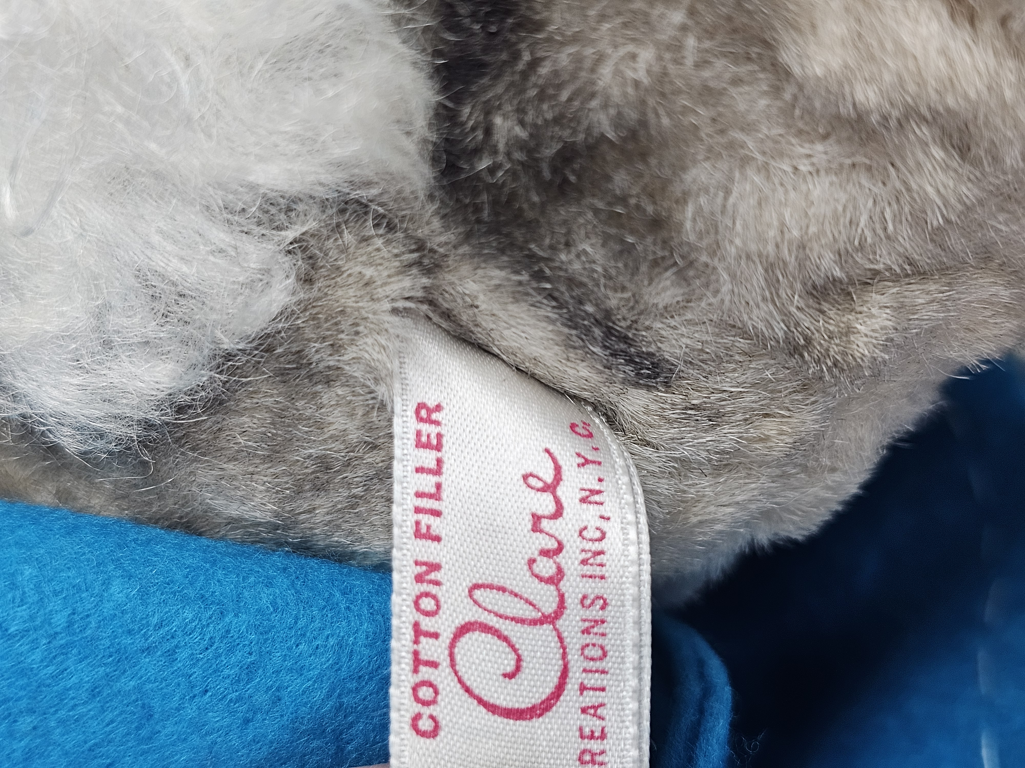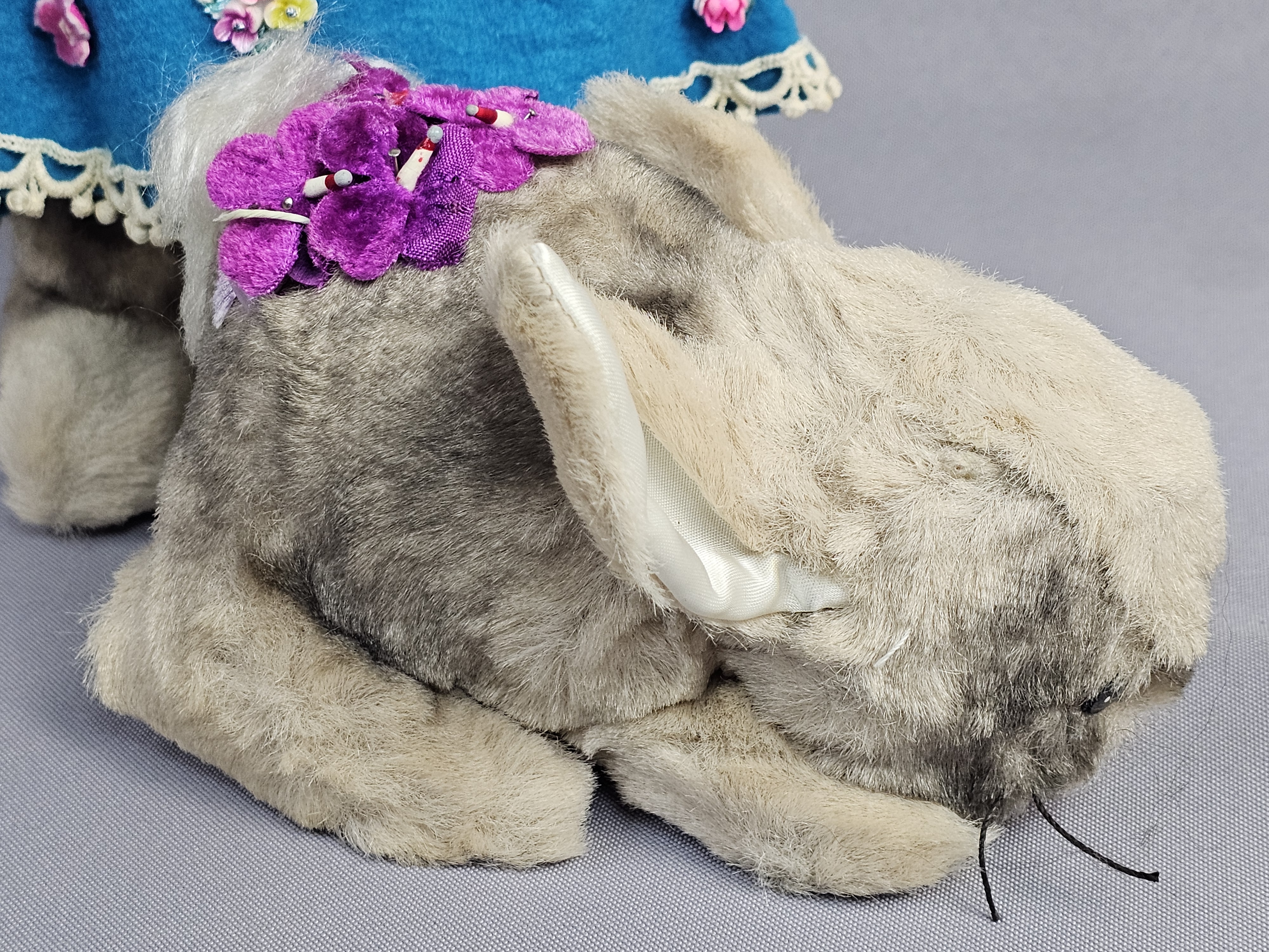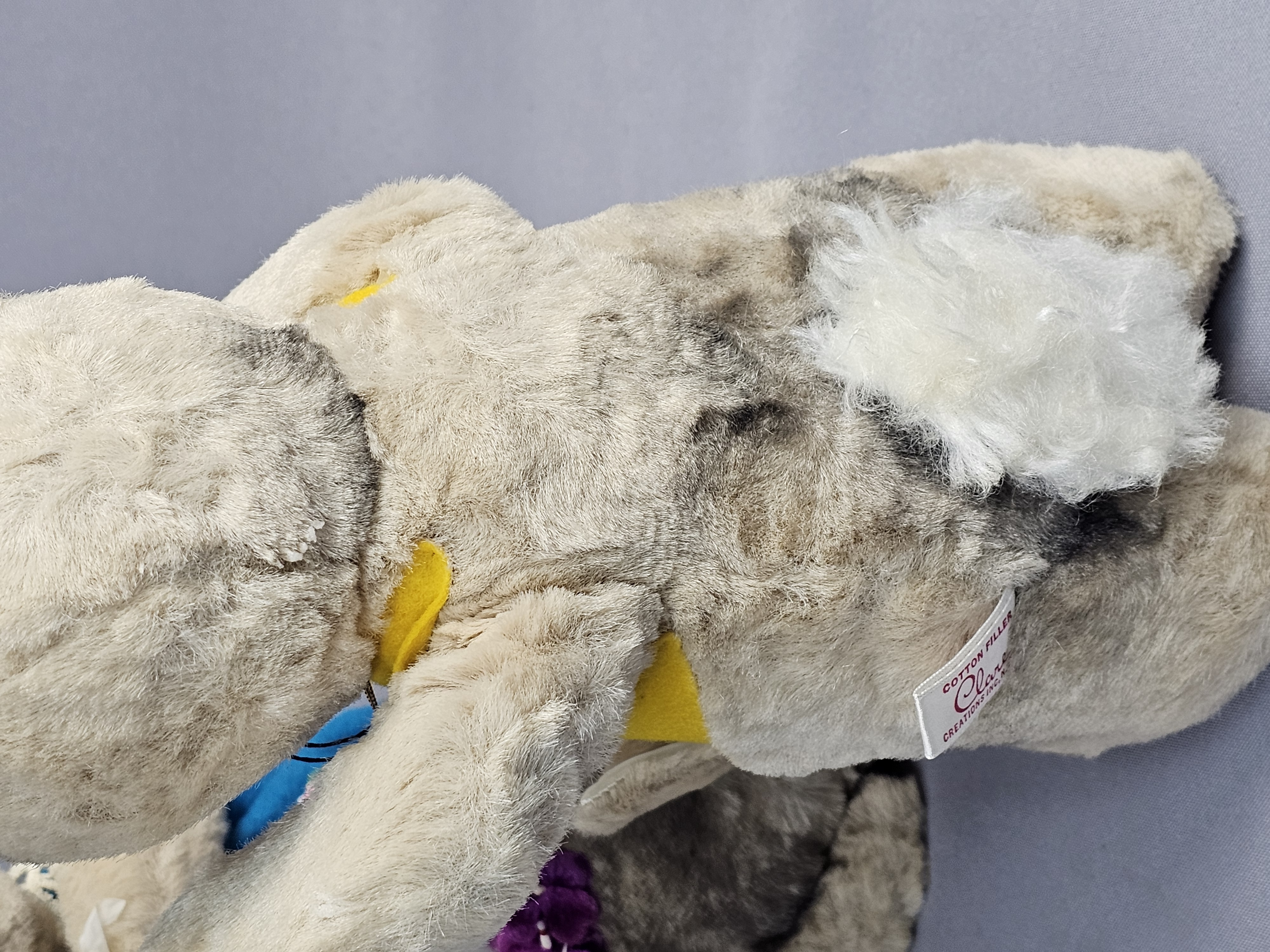 The items are in good vintage condition. The plush fabric exhibits minor matting and surface wear consistent with age. The felt clothing is intact with vibrant colors. Manufacturer tags are present and clearly legible. No original packaging is included.