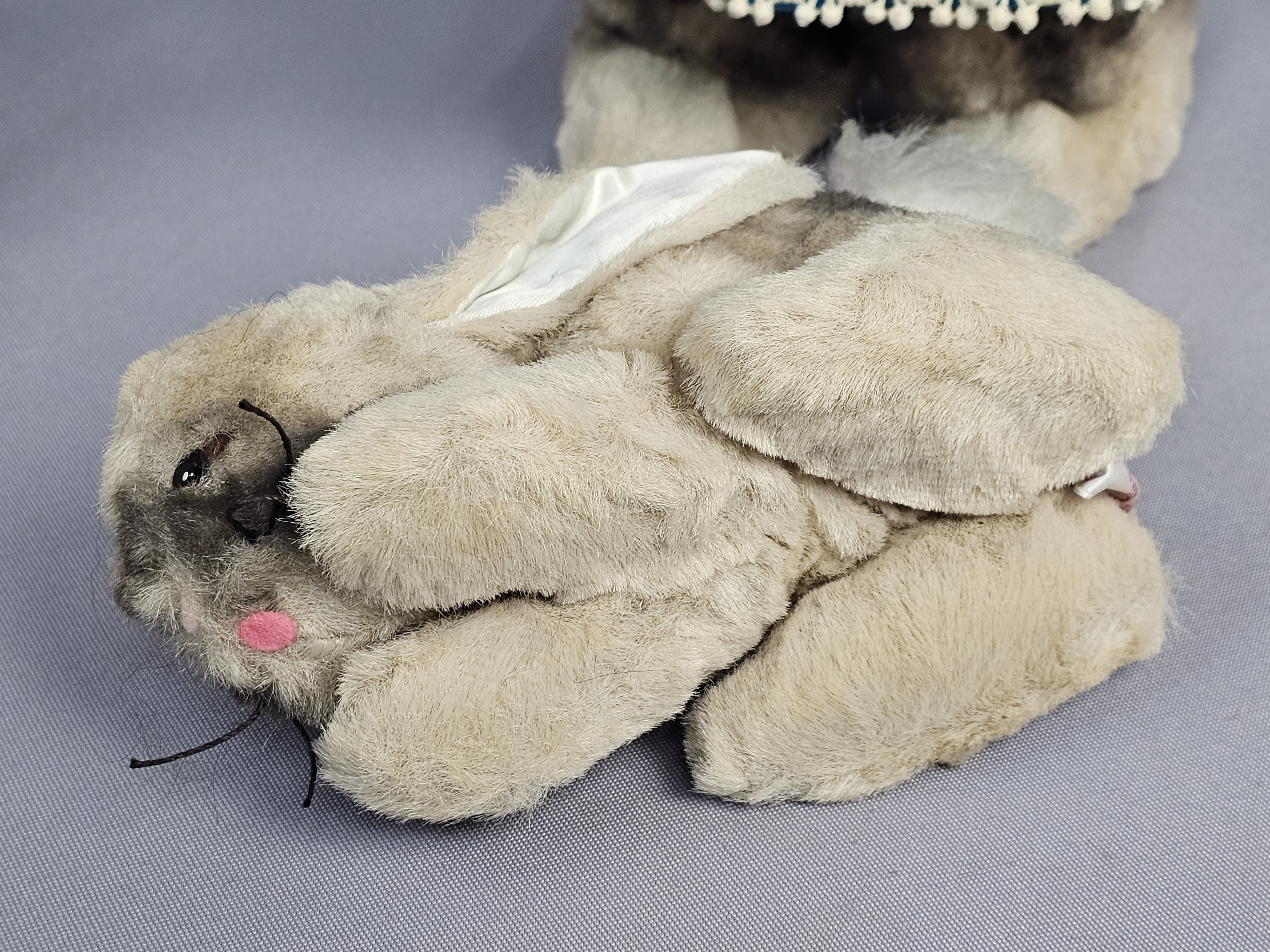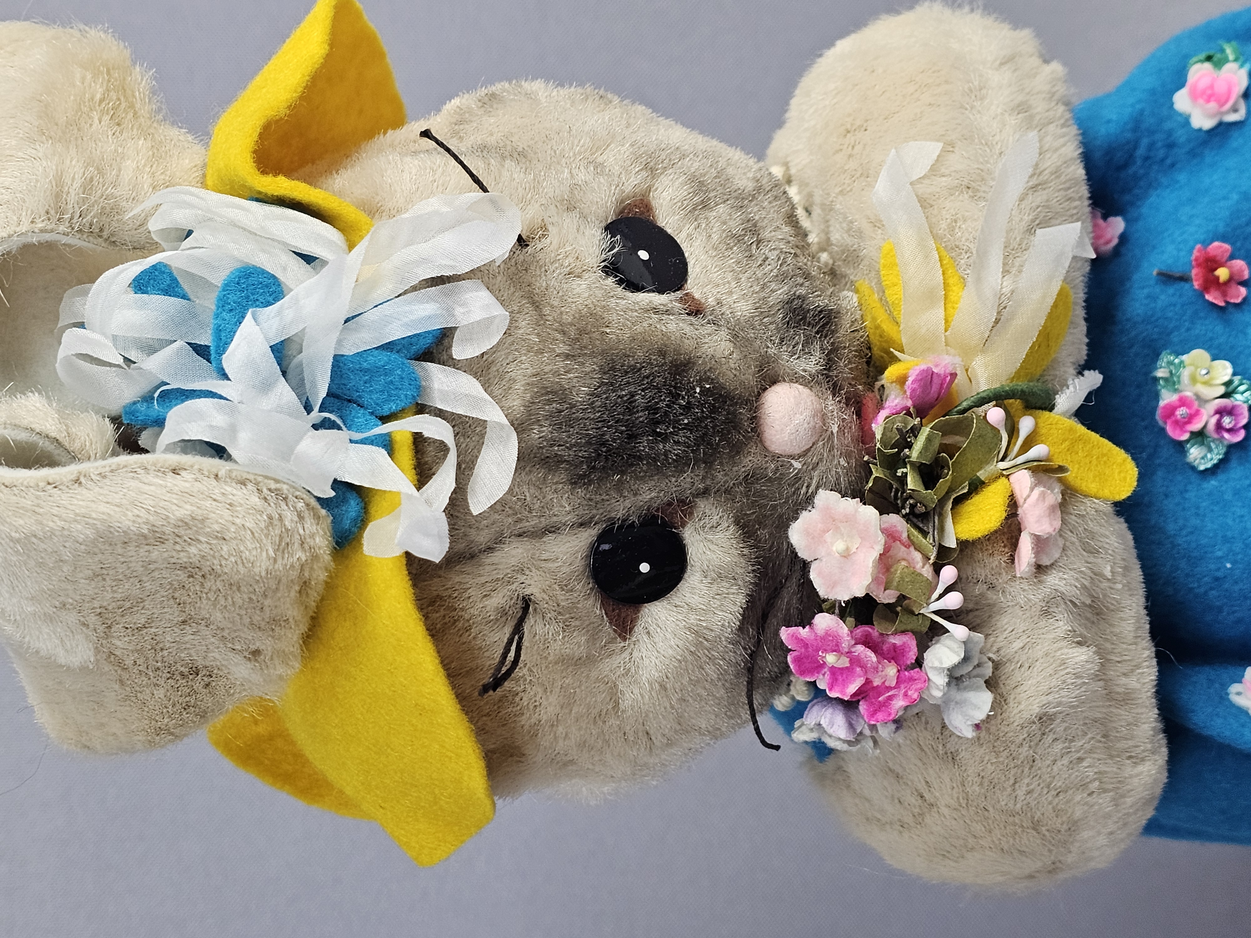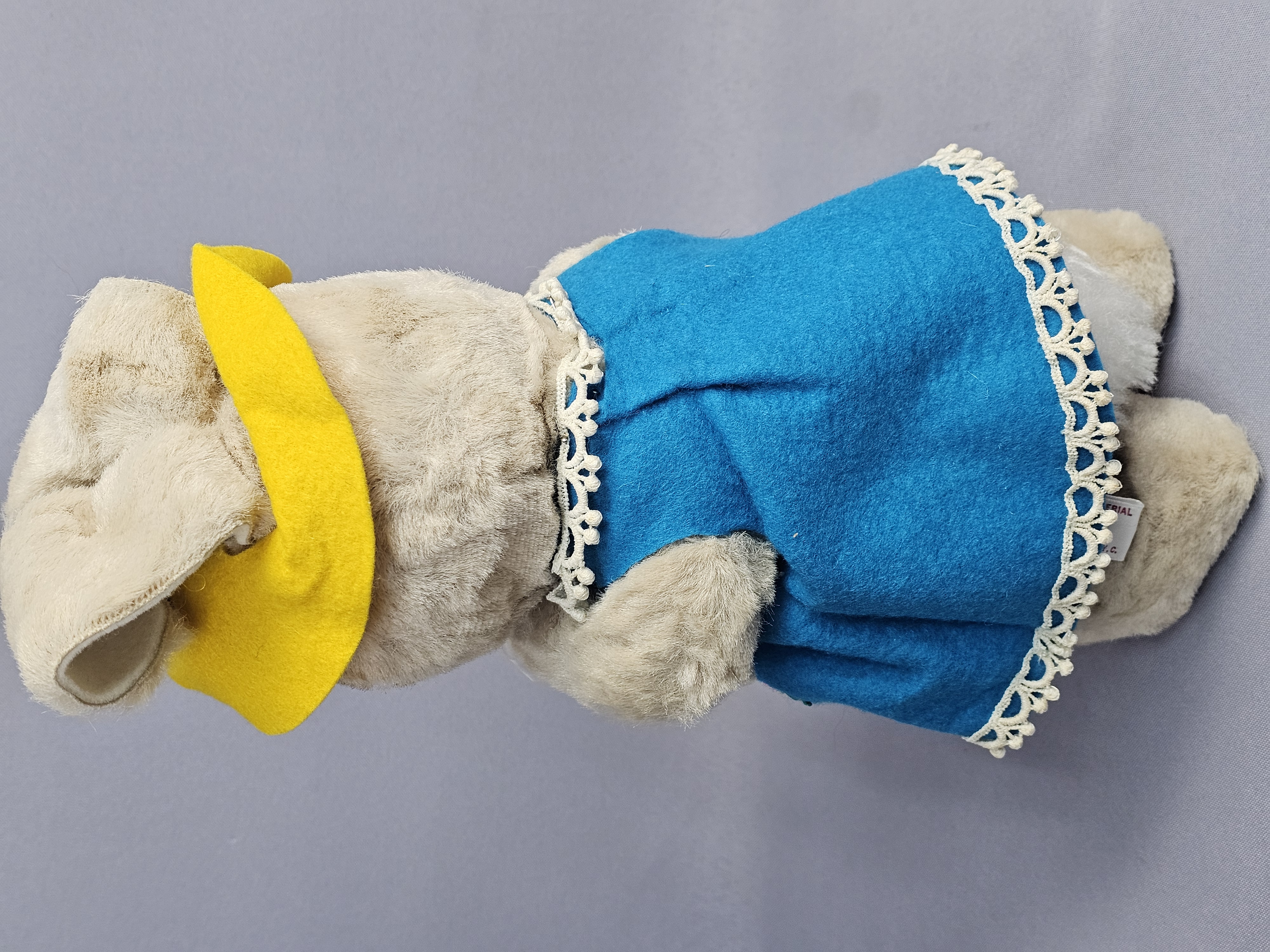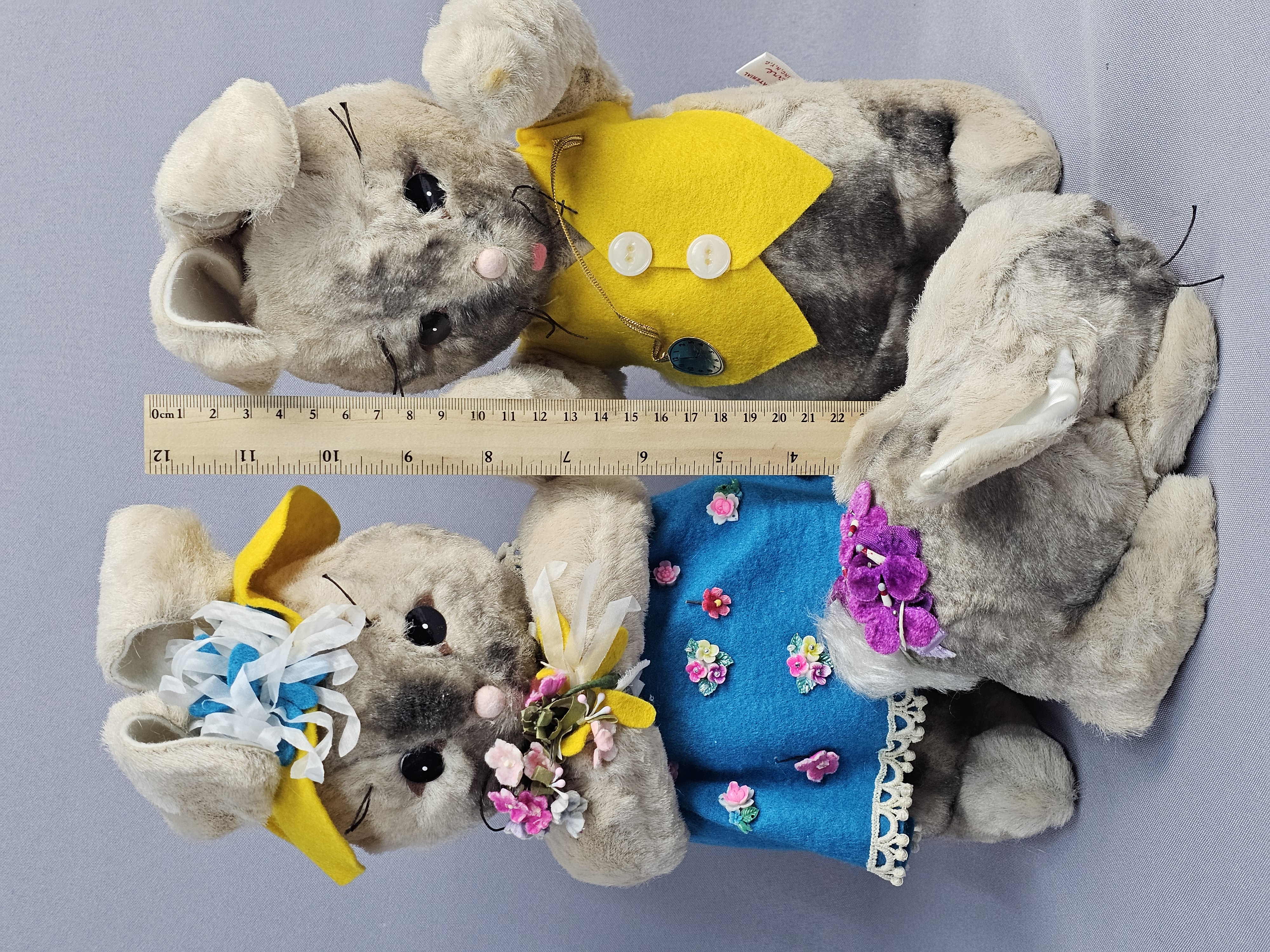Dimensions: Approximately 12 inches tall The items are in good vintage condition. The plush fabric exhibits minor matting and surface wear consistent with age. The felt clothing is intact with vibrant colors. Manufacturer tags are present and clearly legible. No original packaging is included.