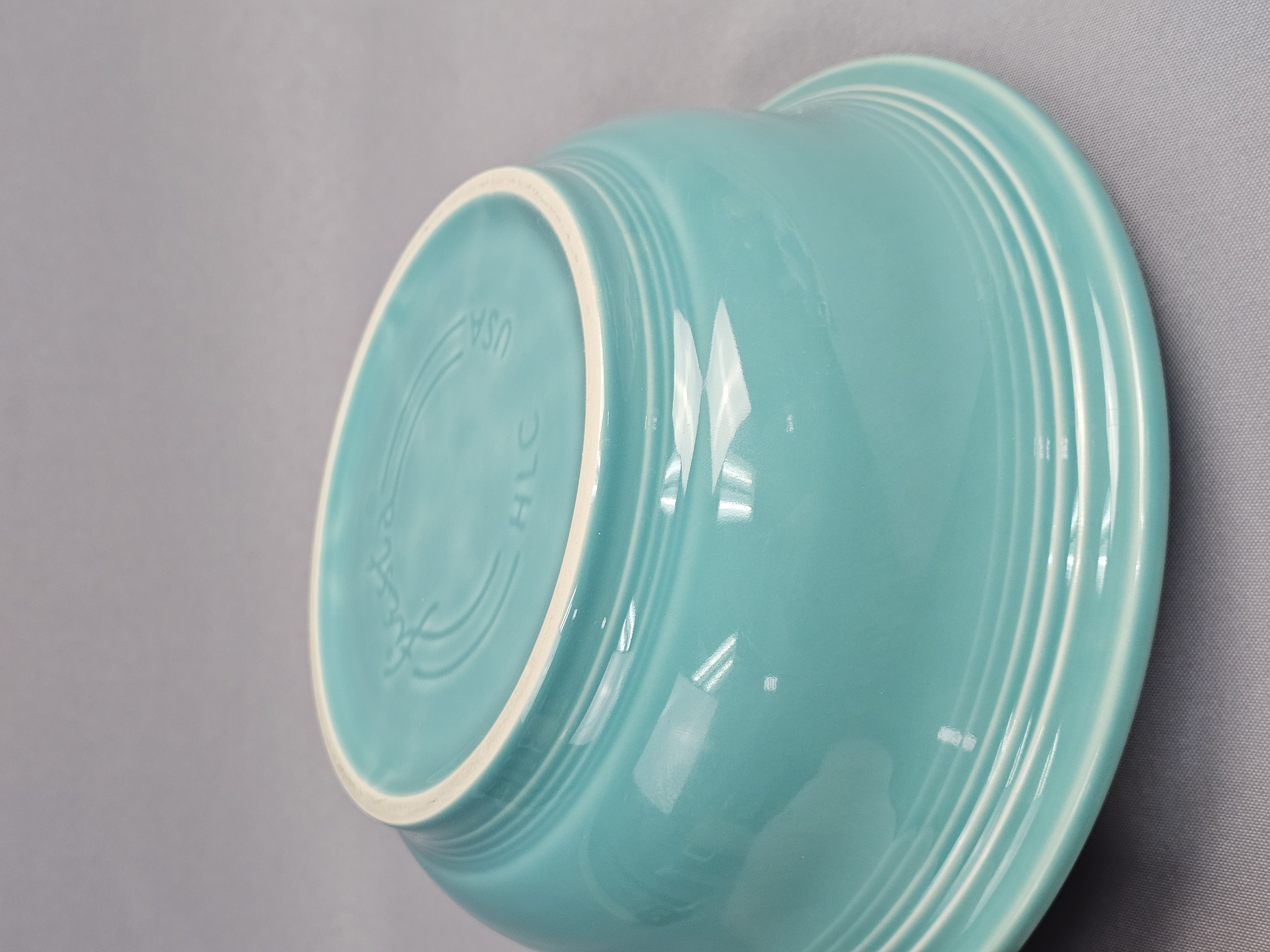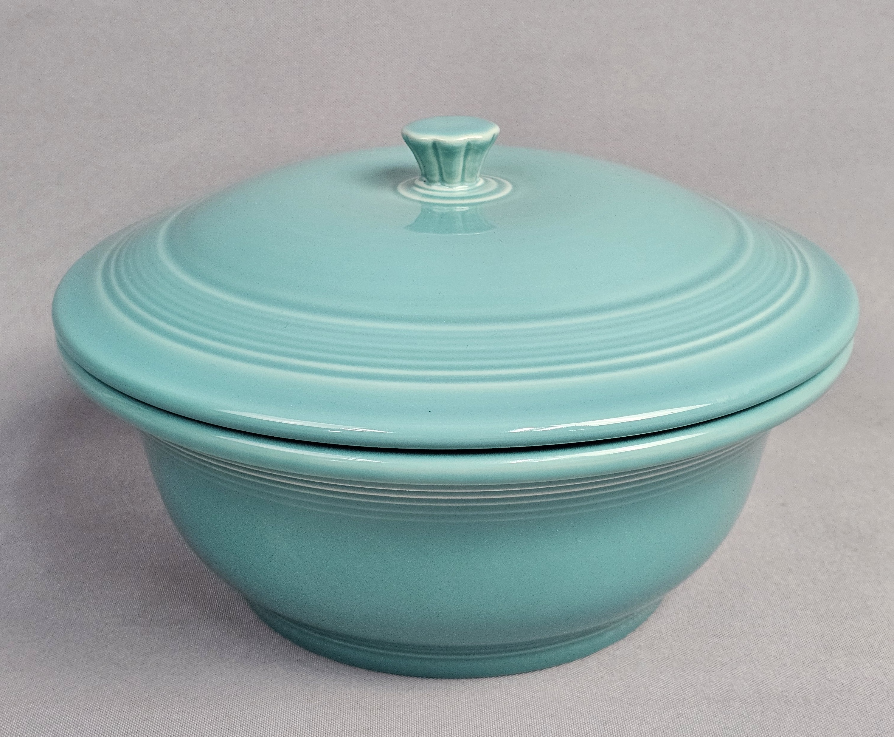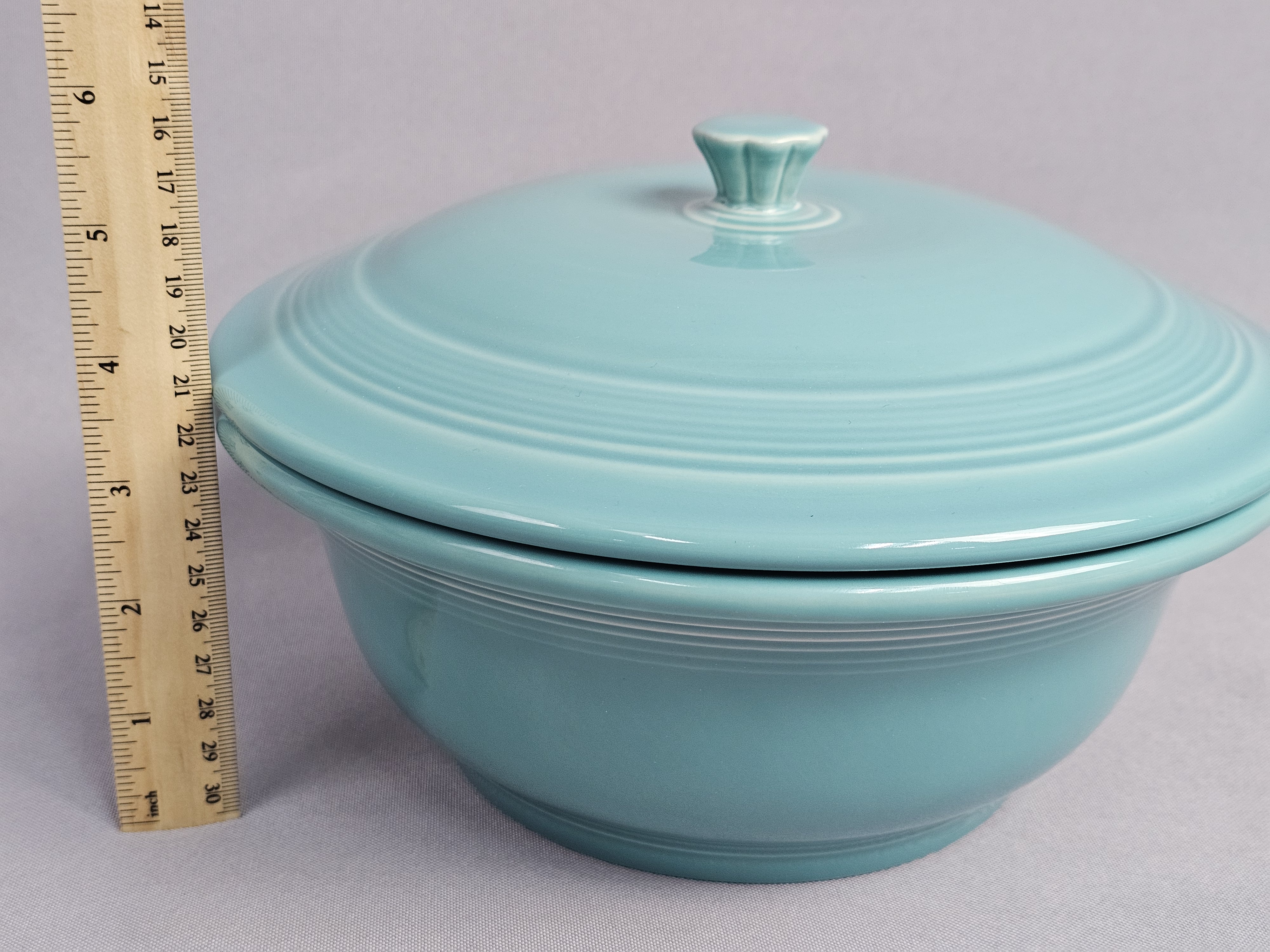This ceramic item is a Fiesta round covered casserole manufactured by the Homer Laughlin China Company. The piece is made of vitrified stoneware and finished in a solid turquoise blue glaze. Height: 5.75 inches Diameter: 9 inches The item is in good condition. There are no visible chips, cracks, or signs of previous restoration. The glaze is bright and consistent throughout.