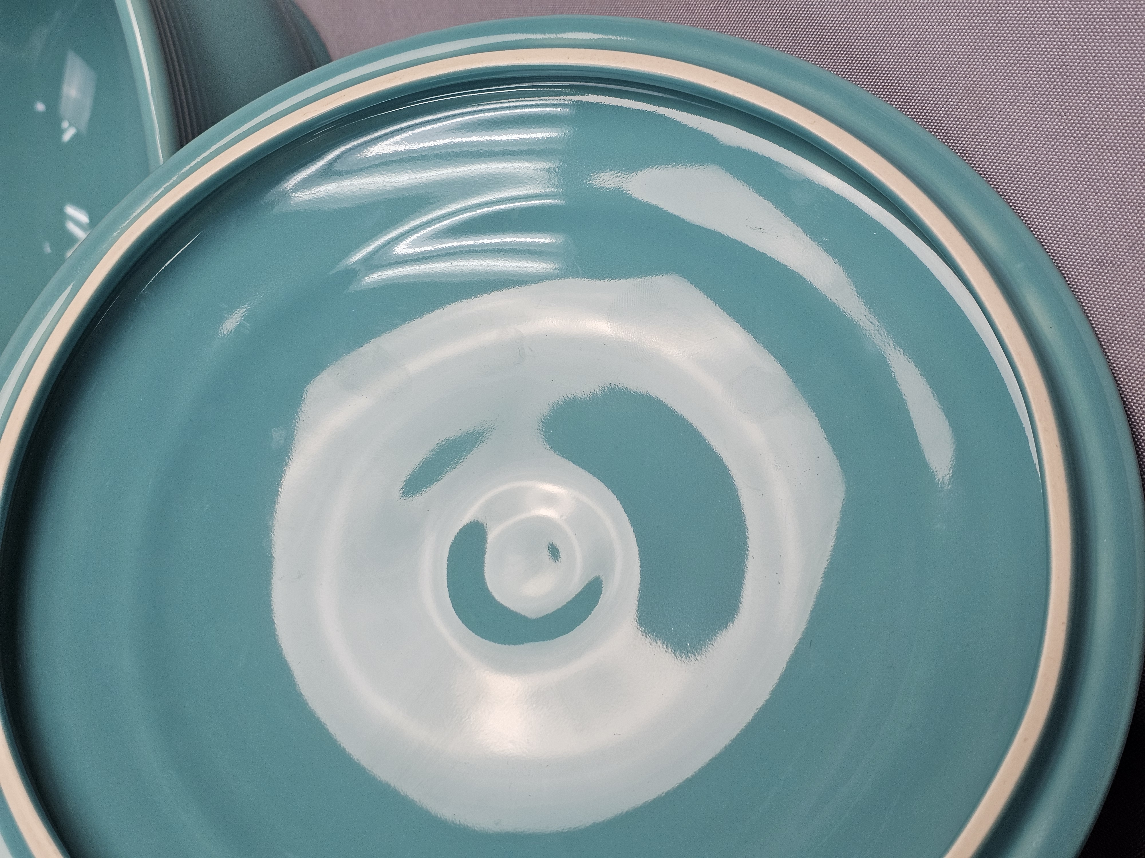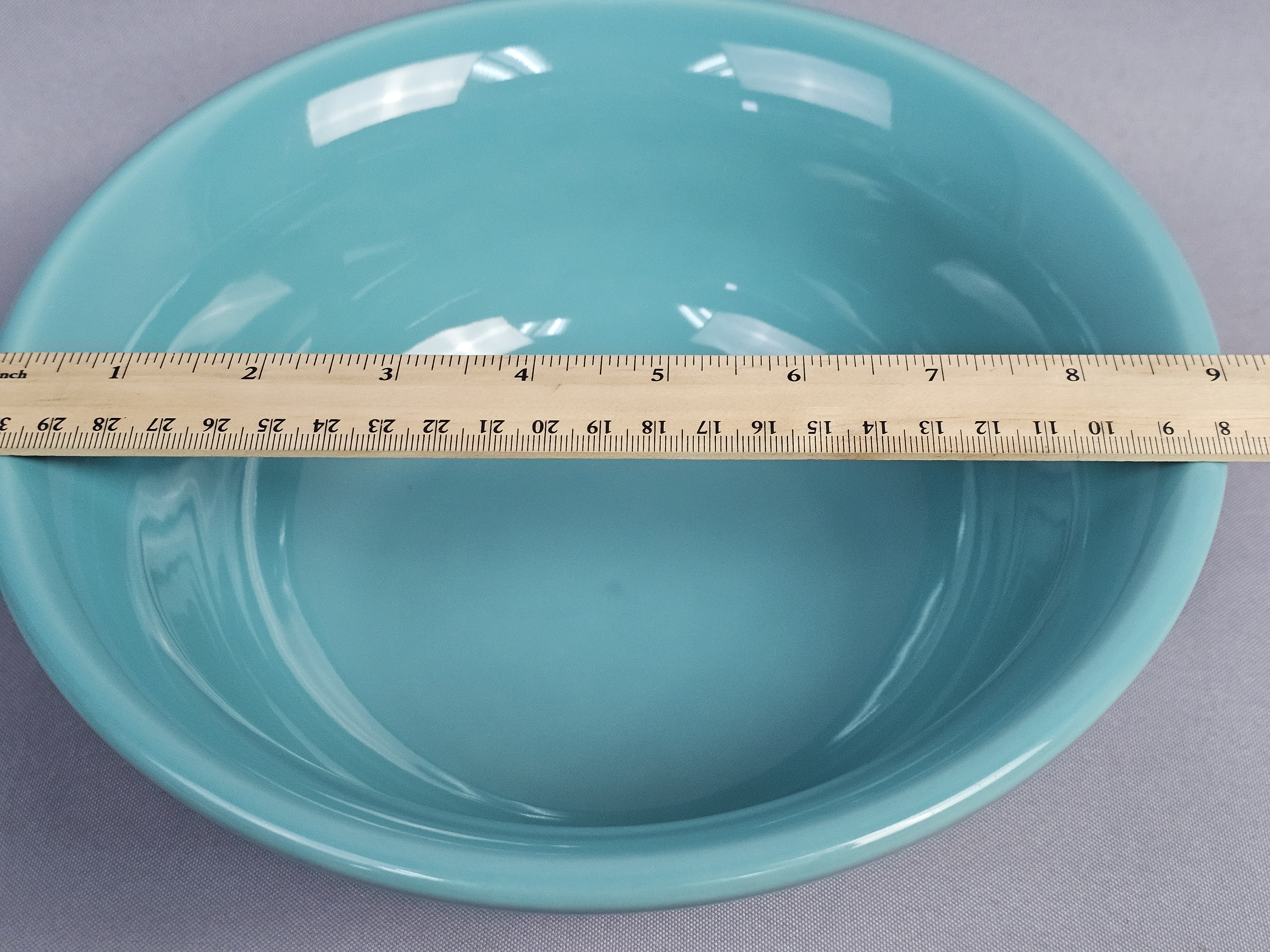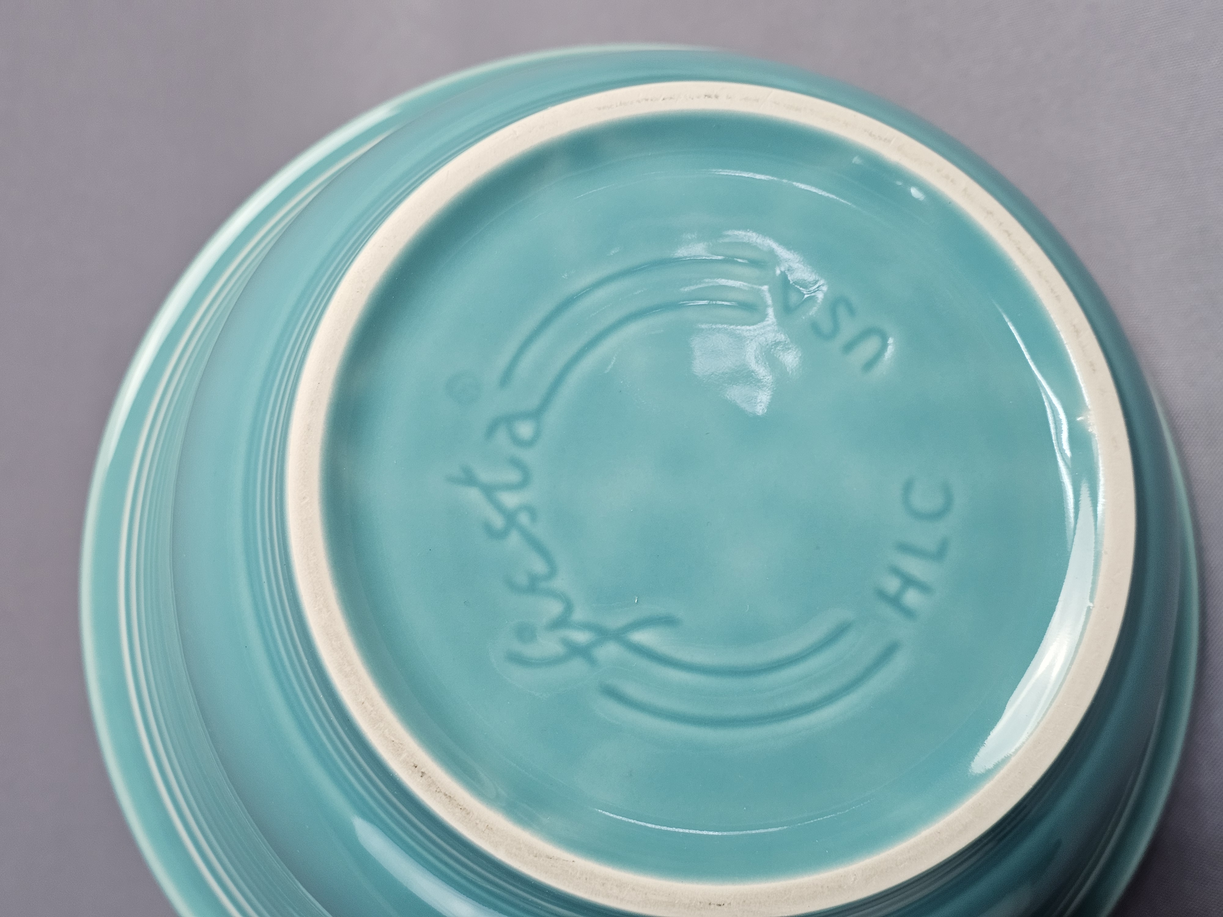 This ceramic item is a Fiesta round covered casserole manufactured by the Homer Laughlin China Company. The piece is made of vitrified stoneware and finished in a solid turquoise blue glaze. Height: 5.75 inches Diameter: 9 inches The item is in good condition. There are no visible chips, cracks, or signs of previous restoration. The glaze is bright and consistent throughout.