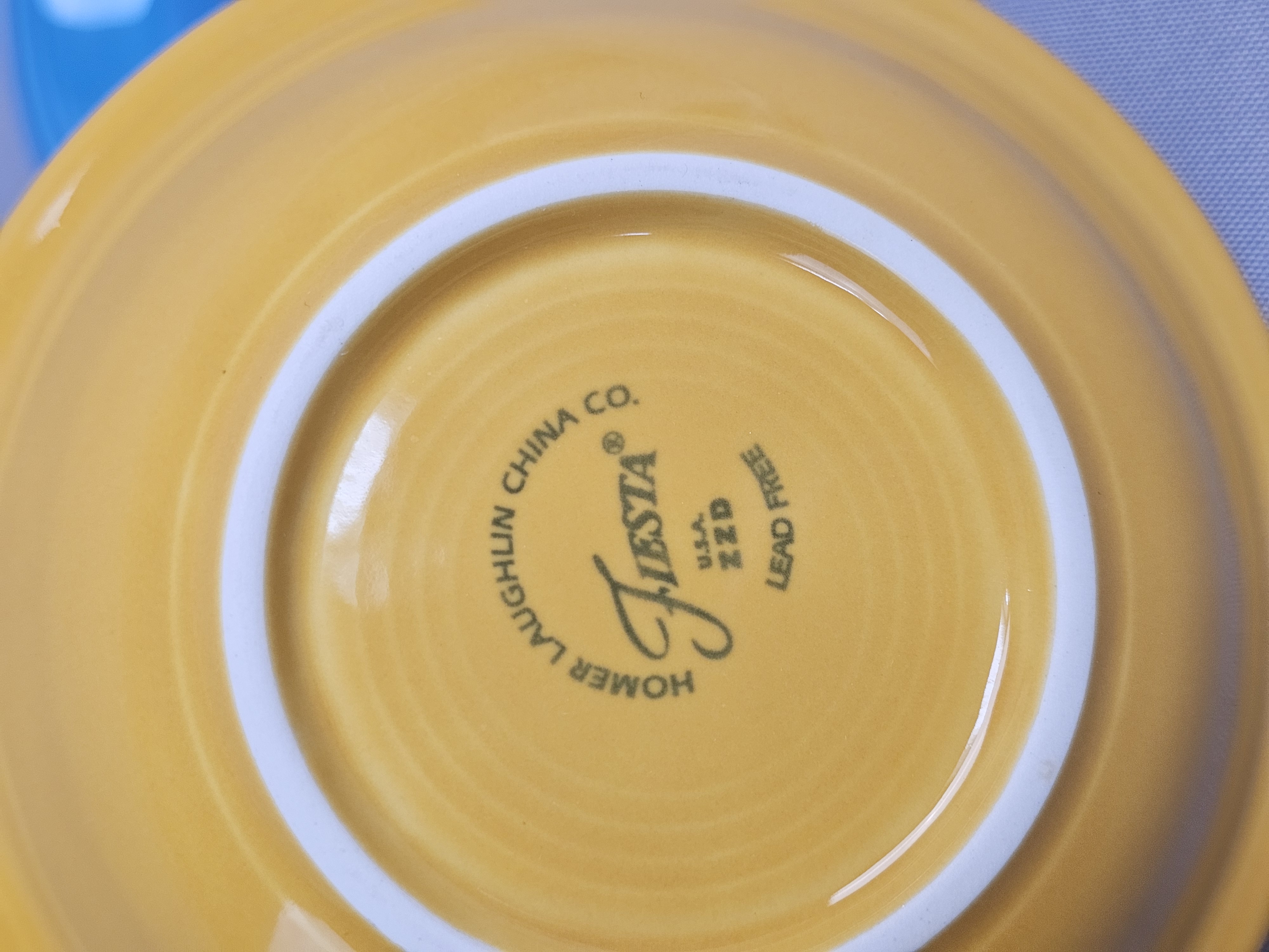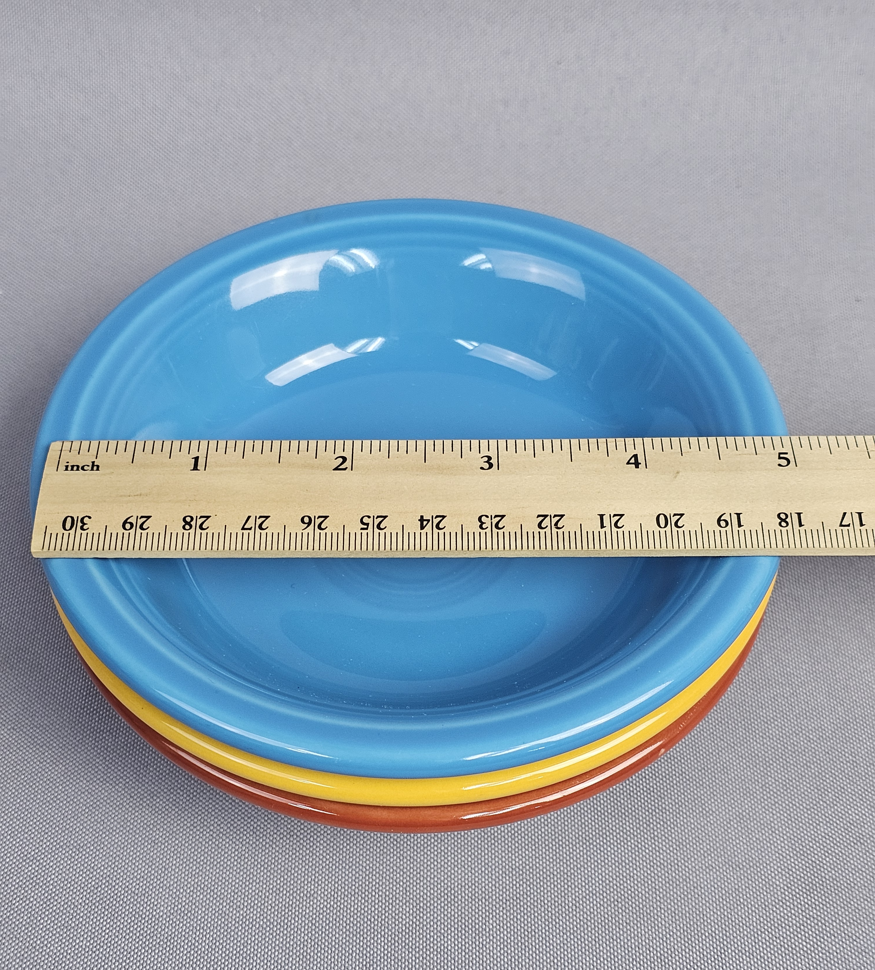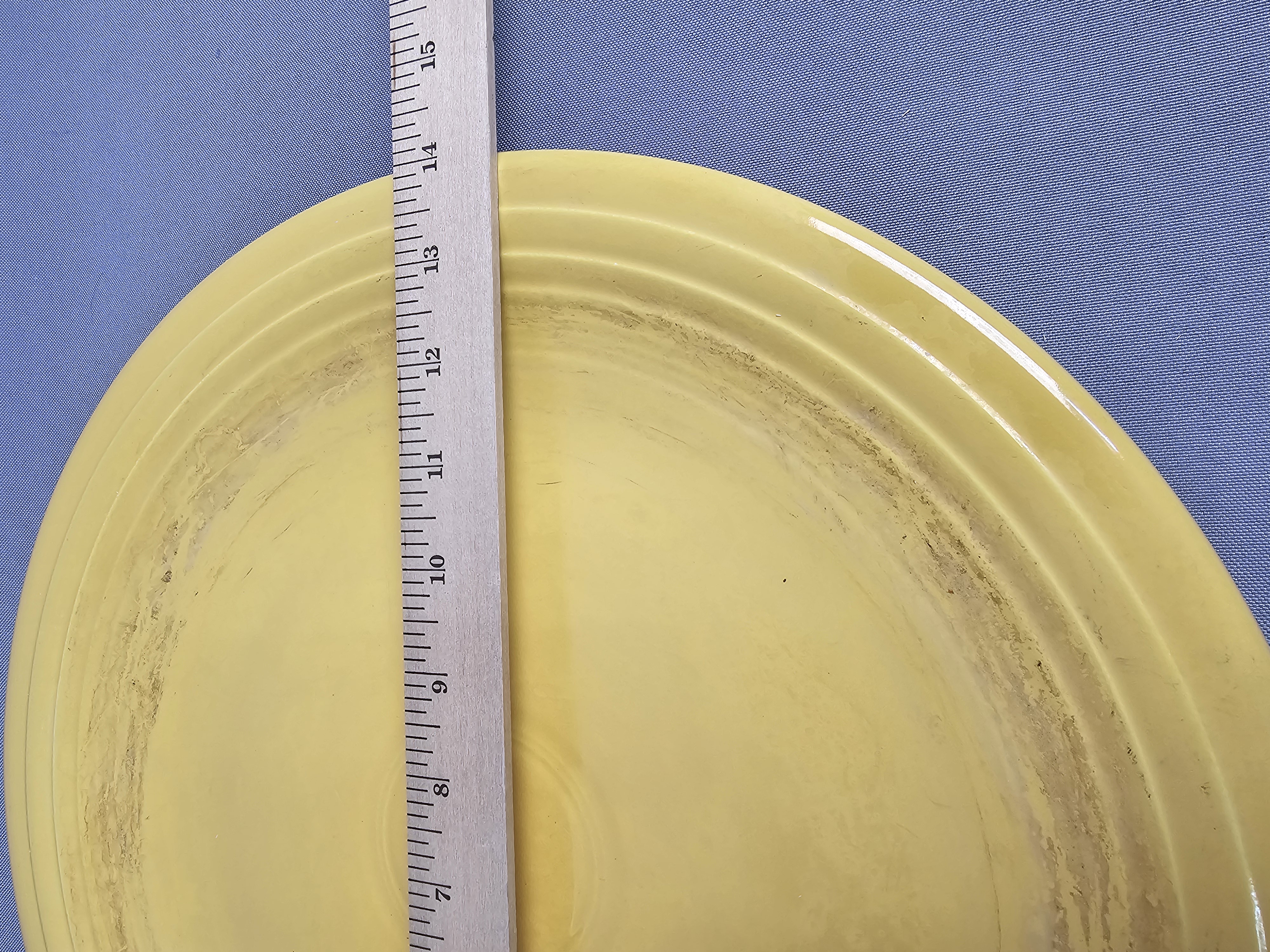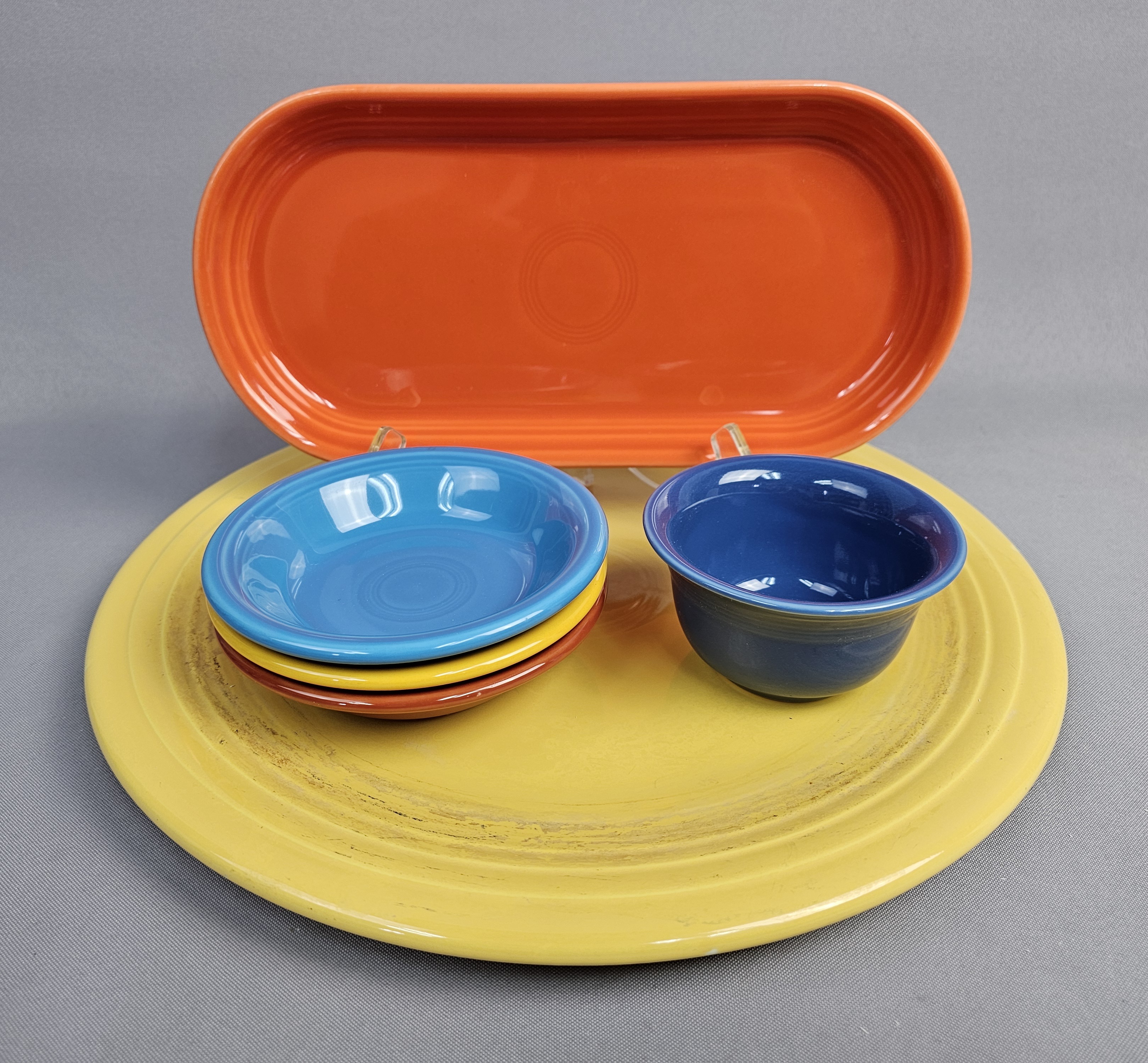 Large Round Platter: 14 inches diameter Oblong Sandwich Tray: 11.75 inches length Small Bowls: 5 inches diameter Medium Tapered Bowl: 2 inches tall The large yellow platter displays significant dark scuffing and utensil marks to the center well and several prominent chips on the underside of the rim. The remaining items appear to be in generally good condition with light surface wear and minor shelf wear to the bases consistent with age and use.