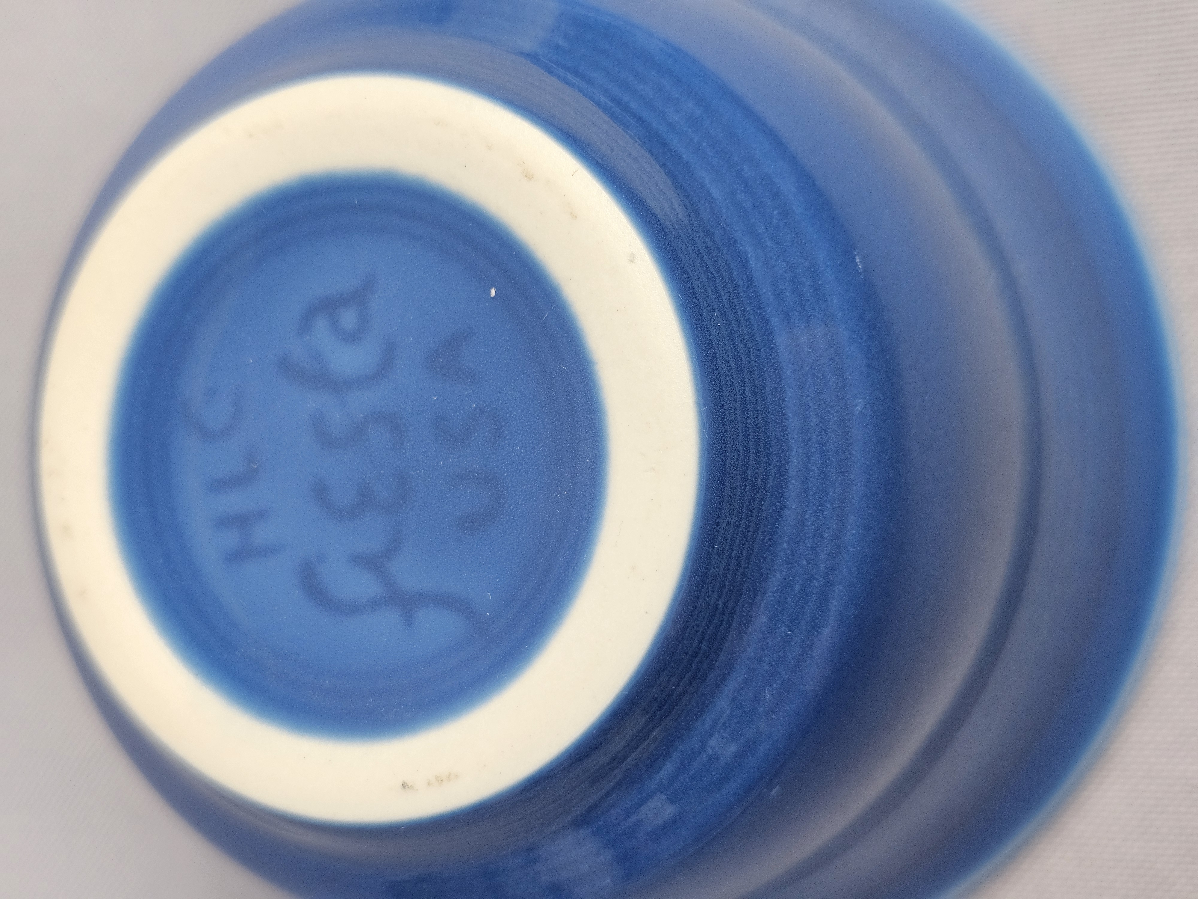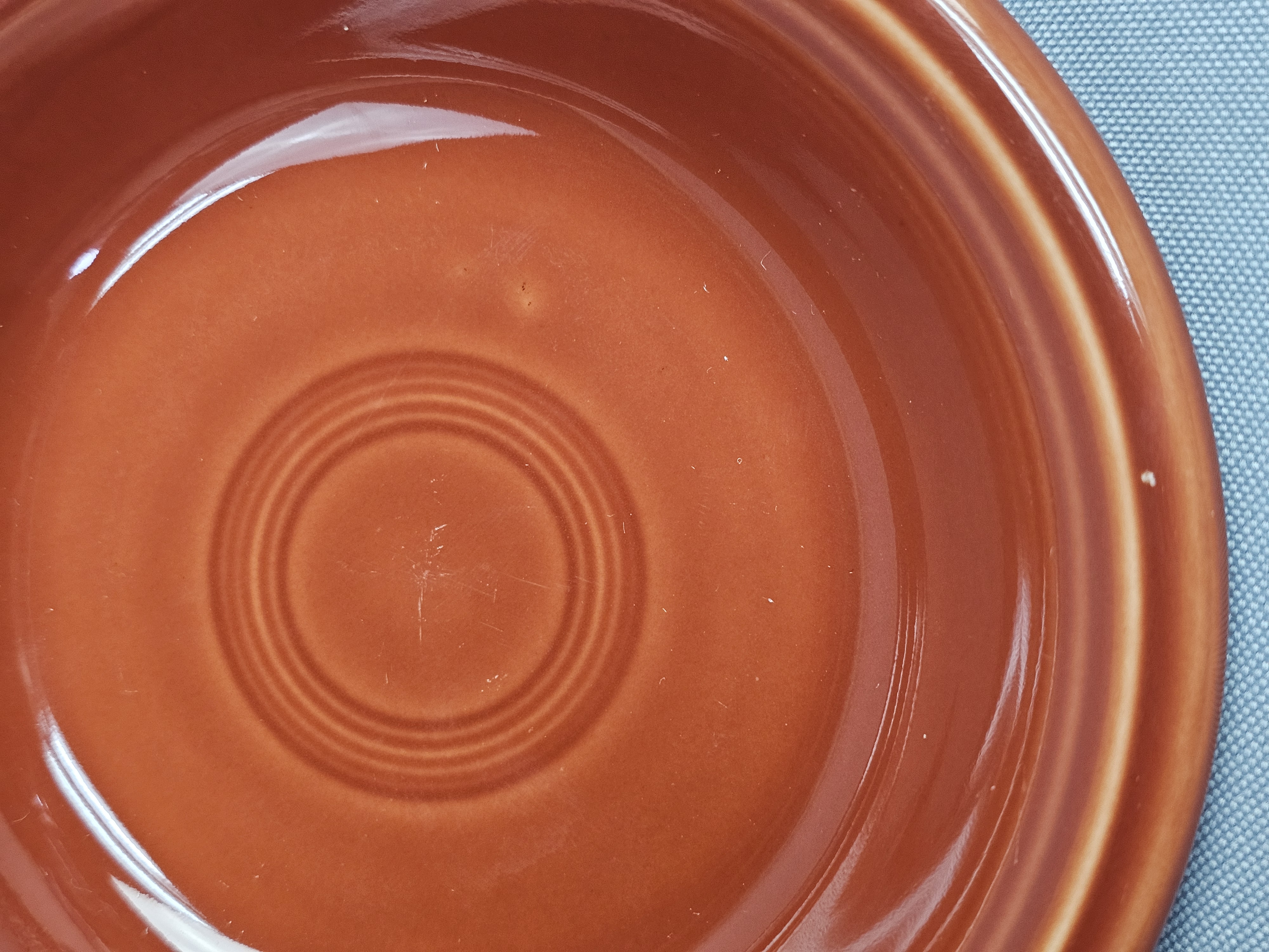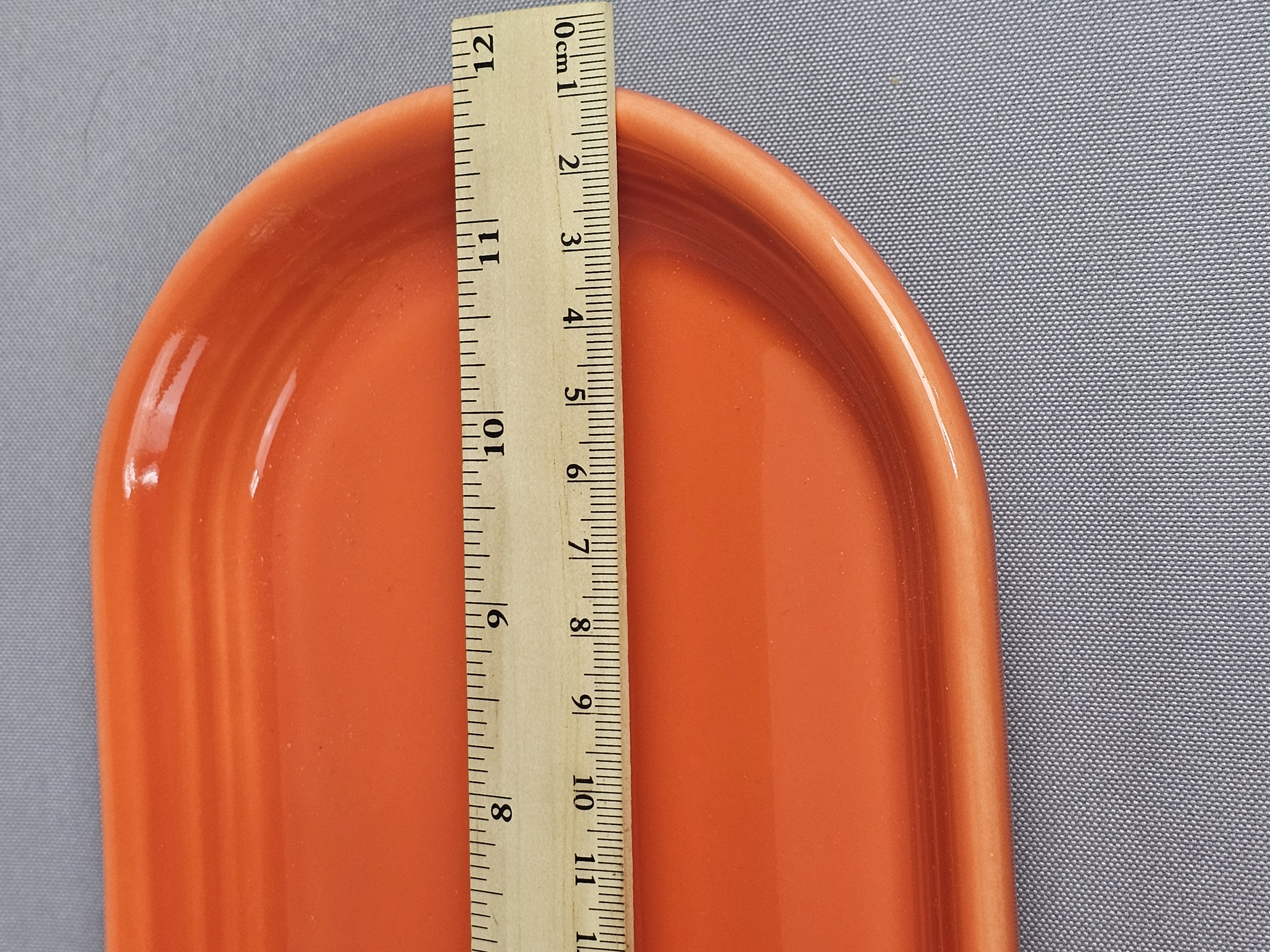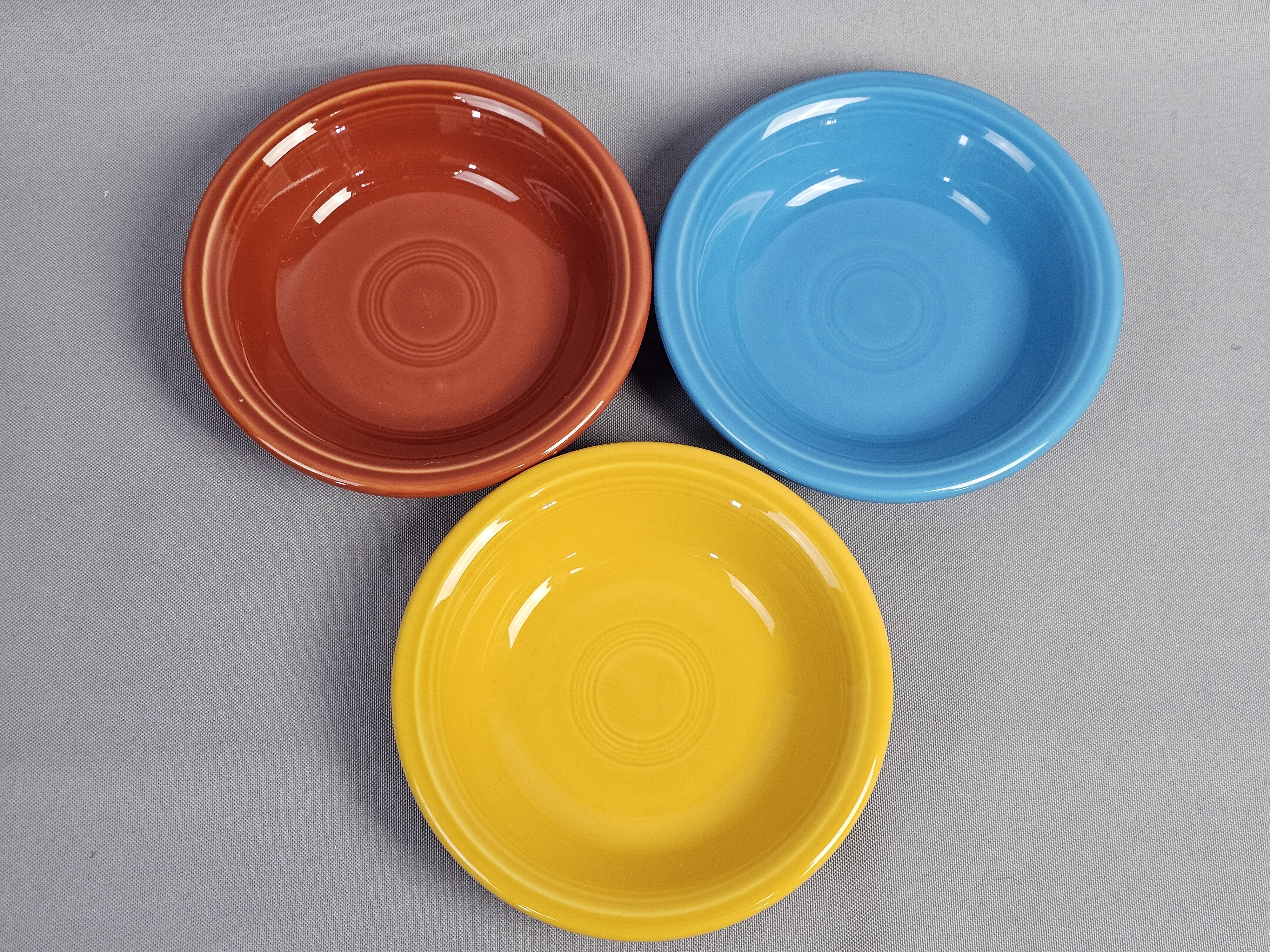 Large Round Platter: 14 inches diameter Oblong Sandwich Tray: 11.75 inches length Small Bowls: 5 inches diameter Medium Tapered Bowl: 2 inches tall The large yellow platter displays significant dark scuffing and utensil marks to the center well and several prominent chips on the underside of the rim. The remaining items appear to be in generally good condition with light surface wear and minor shelf wear to the bases consistent with age and use.
