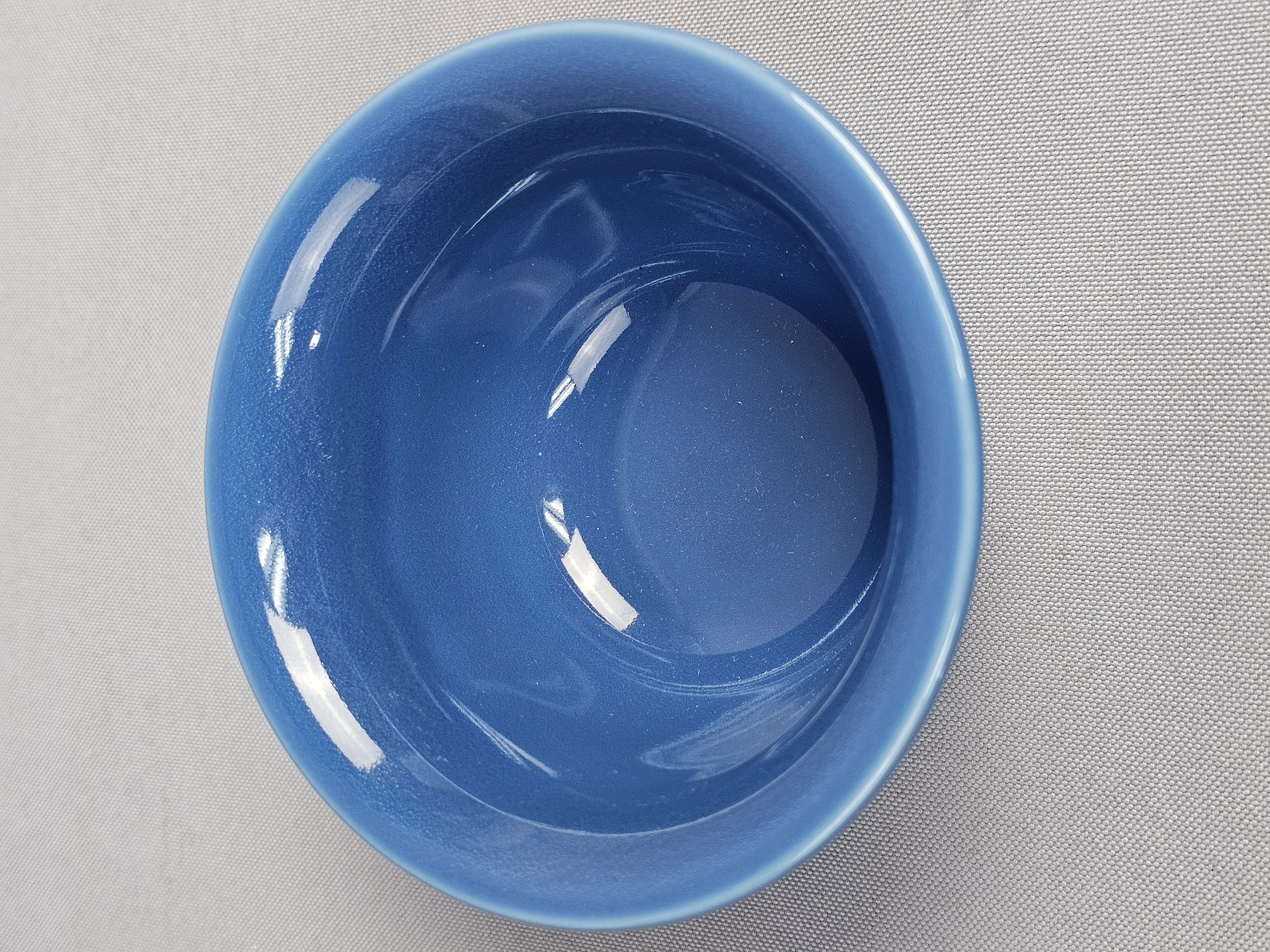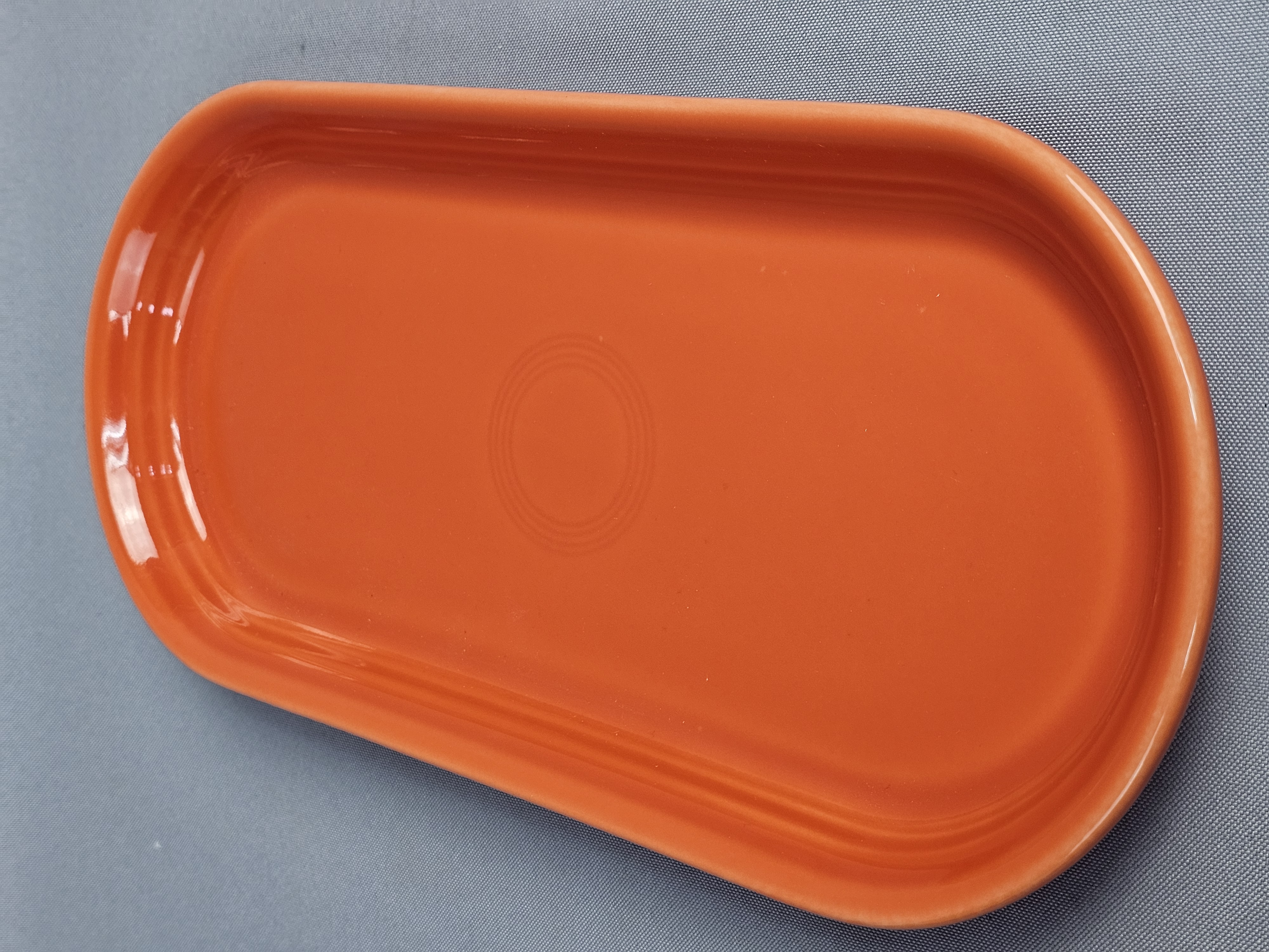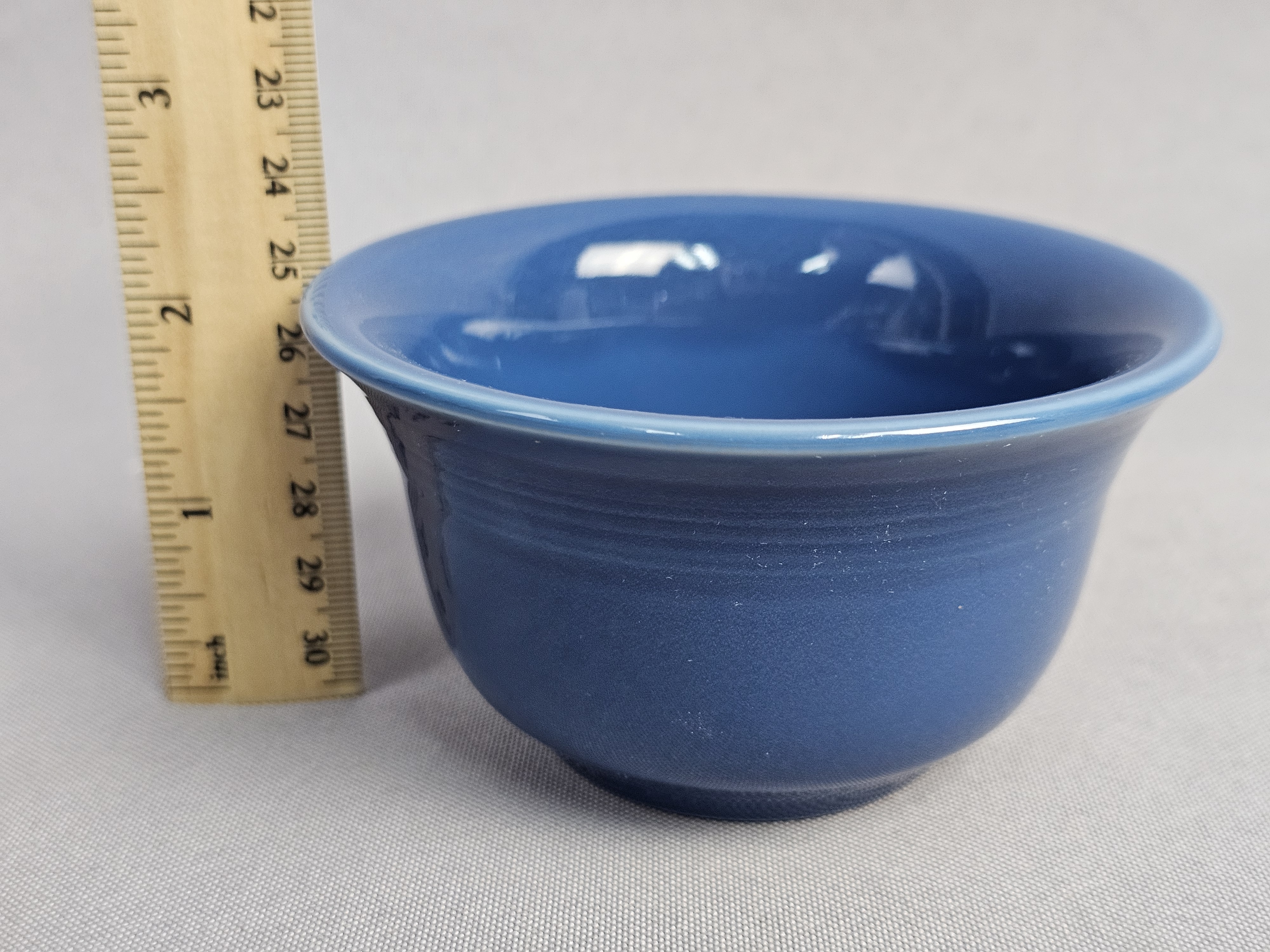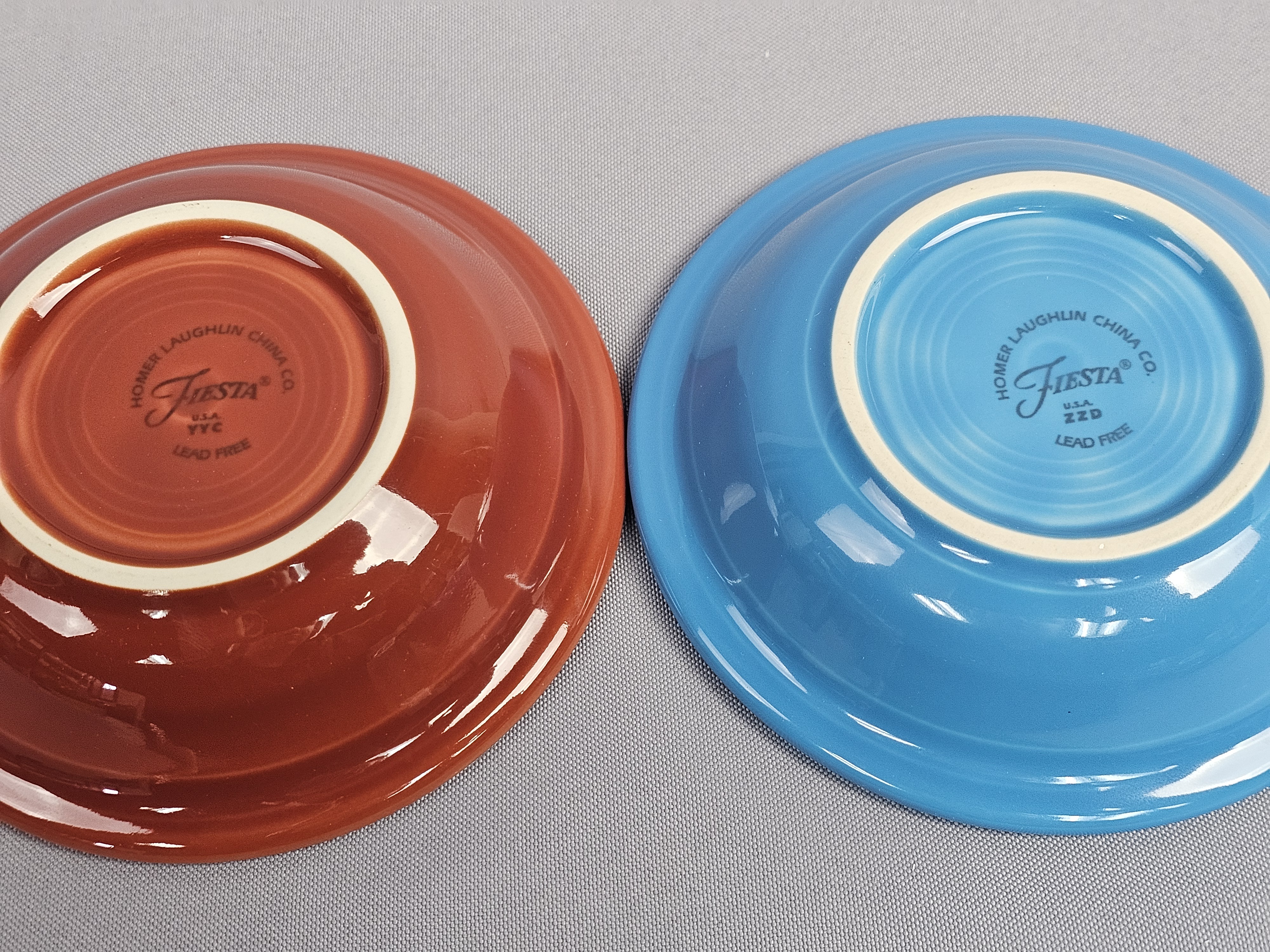 Large Round Platter: 14 inches diameter Oblong Sandwich Tray: 11.75 inches length Small Bowls: 5 inches diameter Medium Tapered Bowl: 2 inches tall The large yellow platter displays significant dark scuffing and utensil marks to the center well and several prominent chips on the underside of the rim. The remaining items appear to be in generally good condition with light surface wear and minor shelf wear to the bases consistent with age and use.