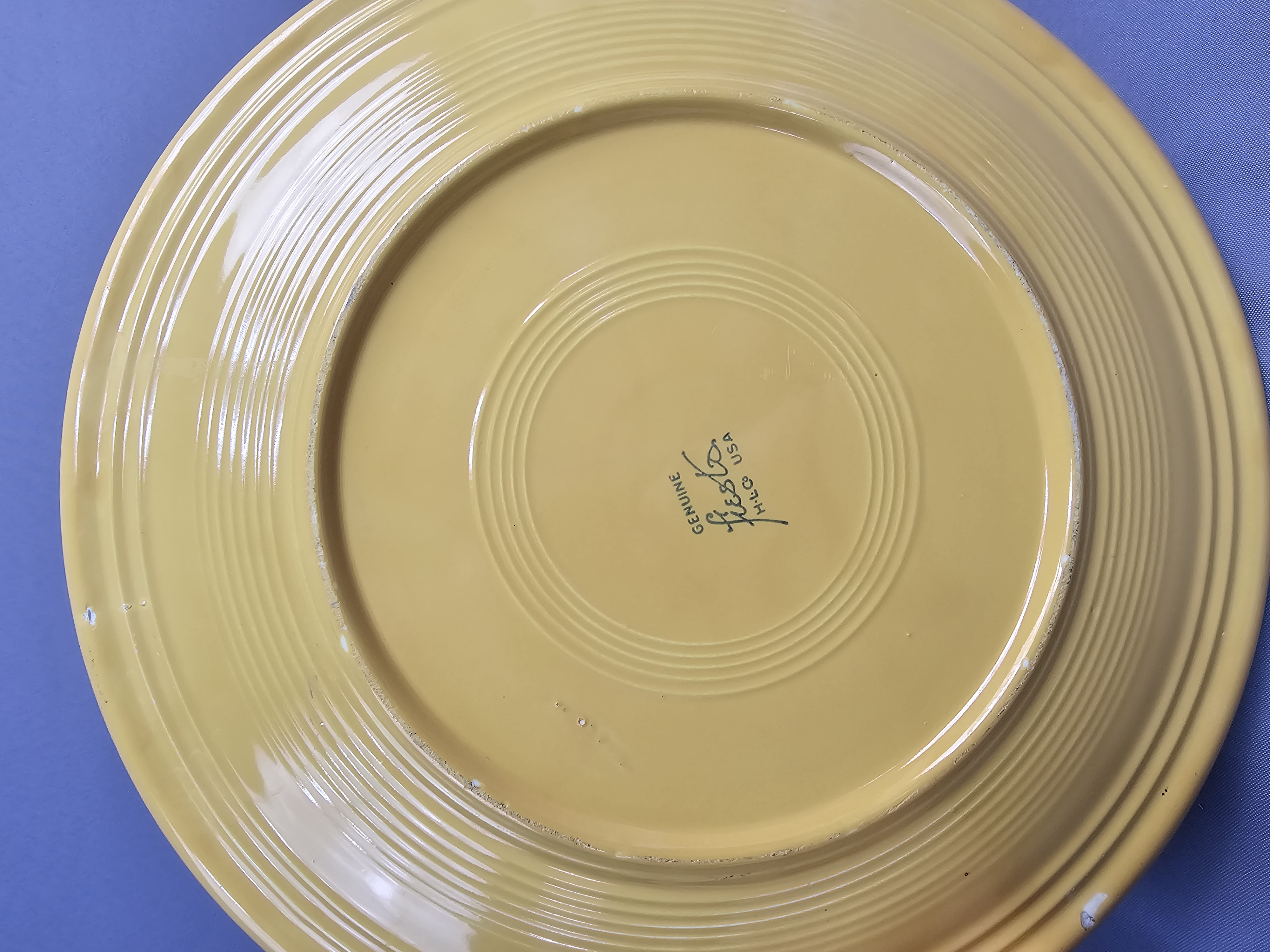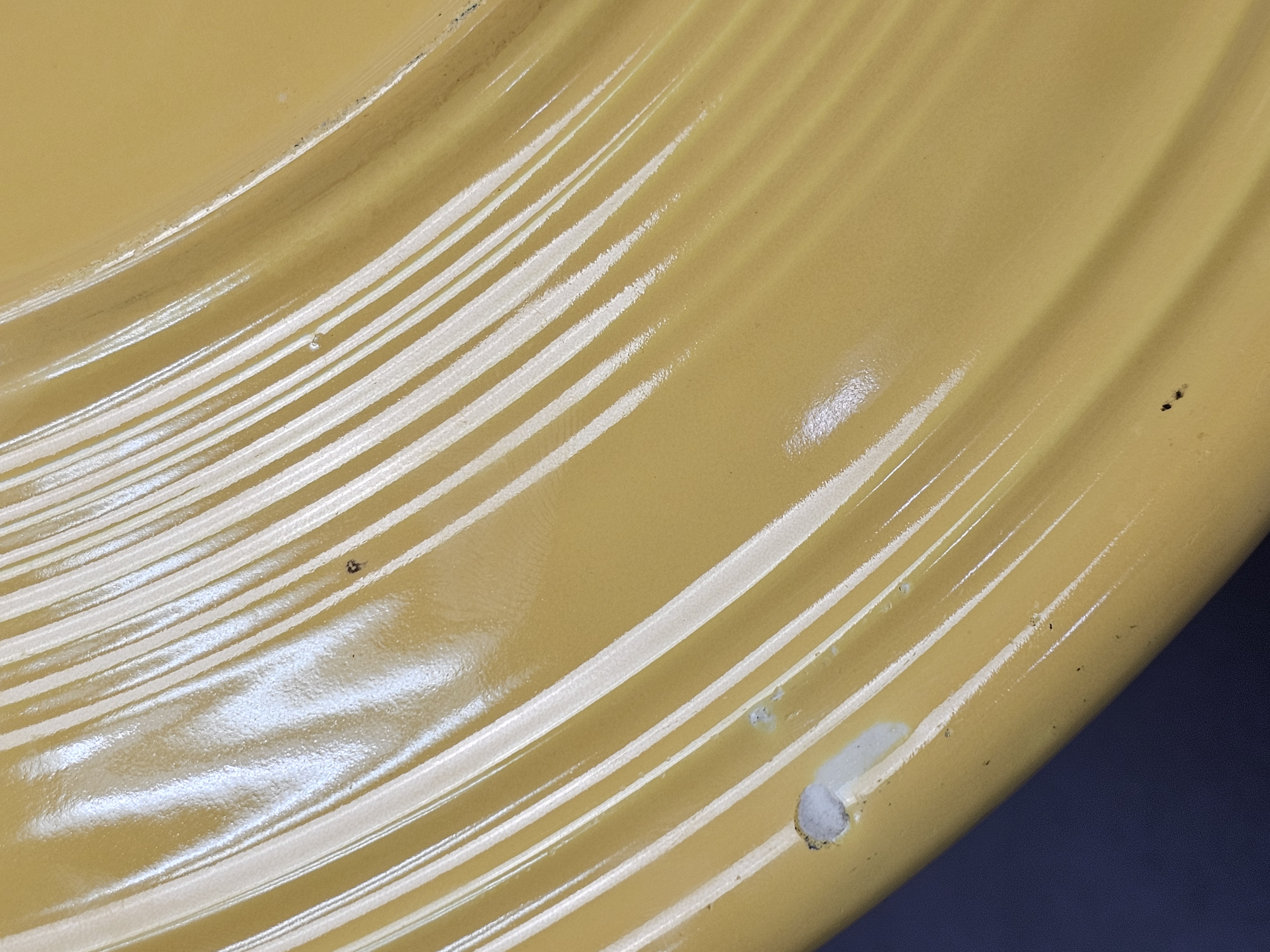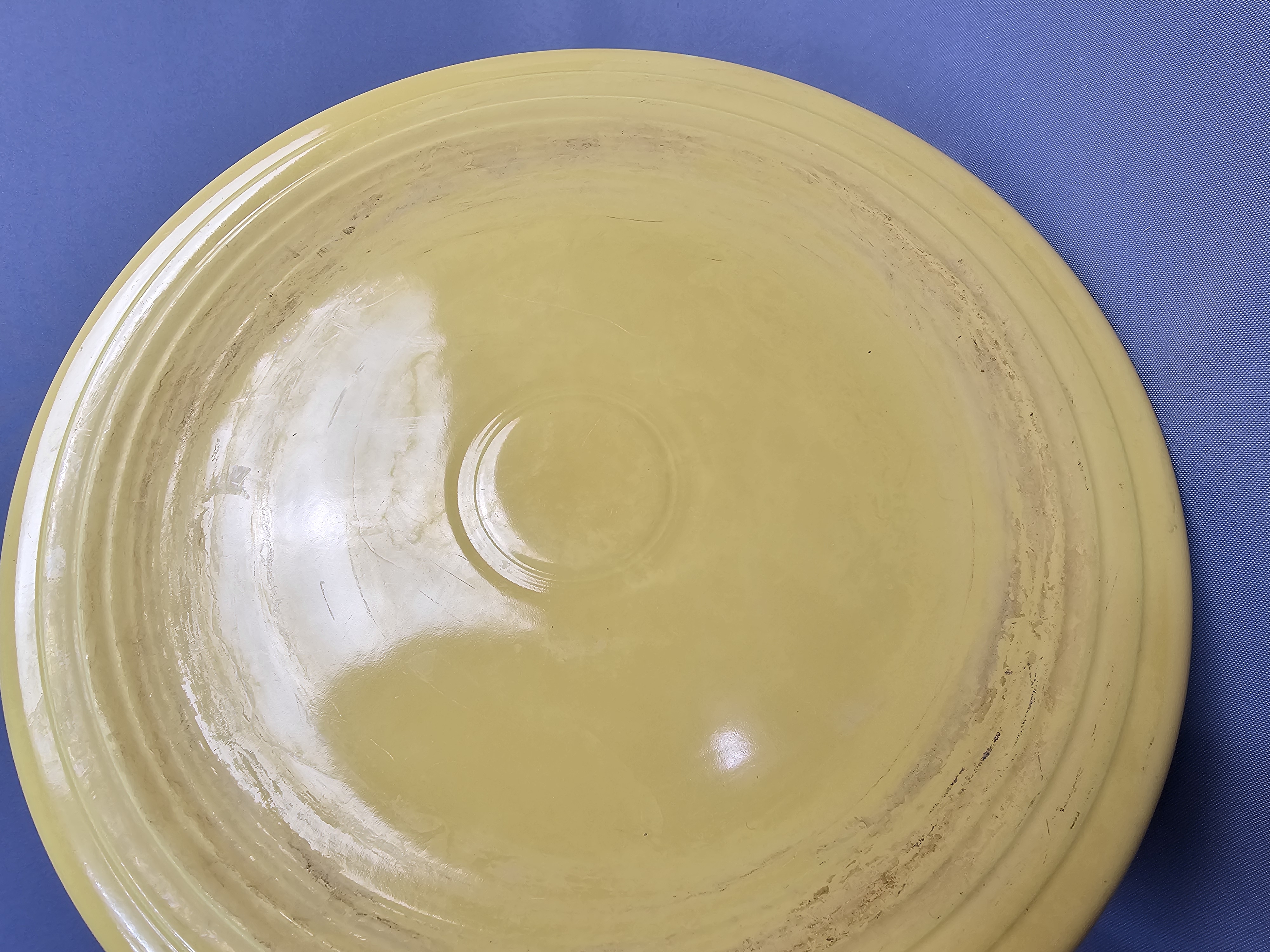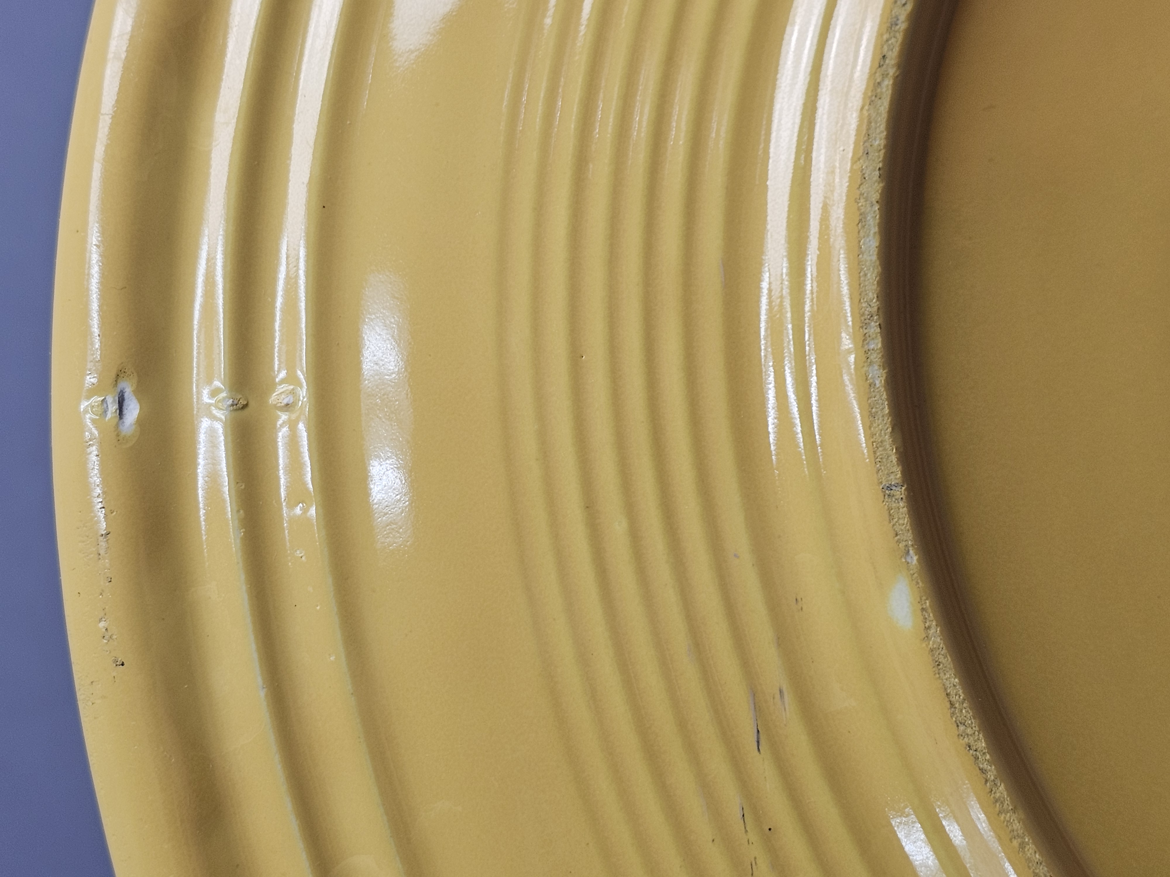 The large yellow platter displays significant dark scuffing and utensil marks to the center well and several prominent chips on the underside of the rim. The remaining items appear to be in generally good condition with light surface wear and minor shelf wear to the bases consistent with age and use.