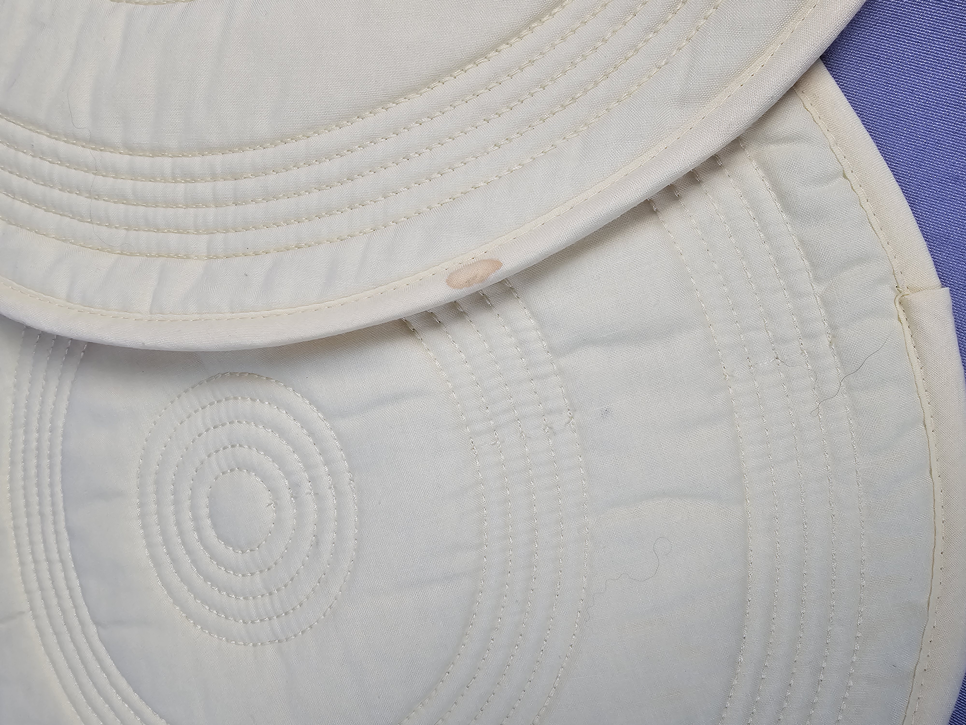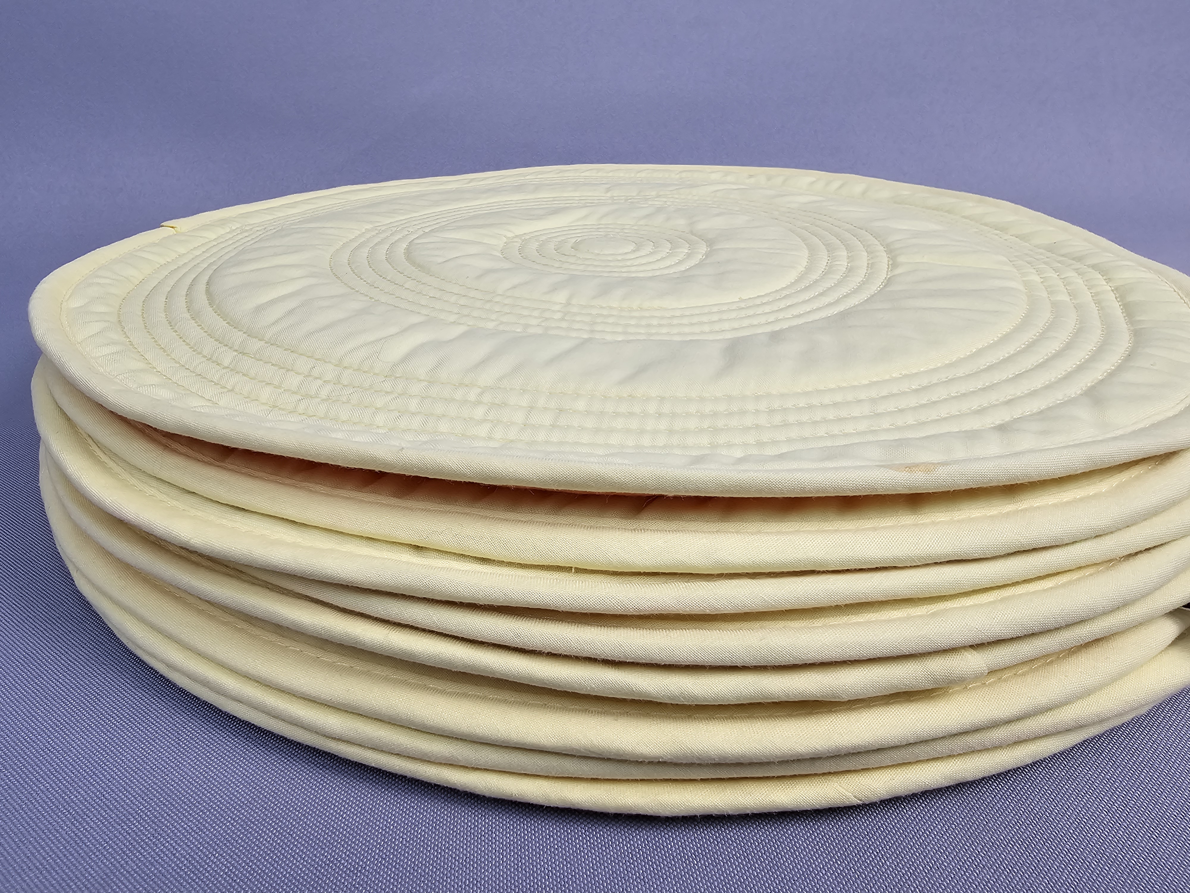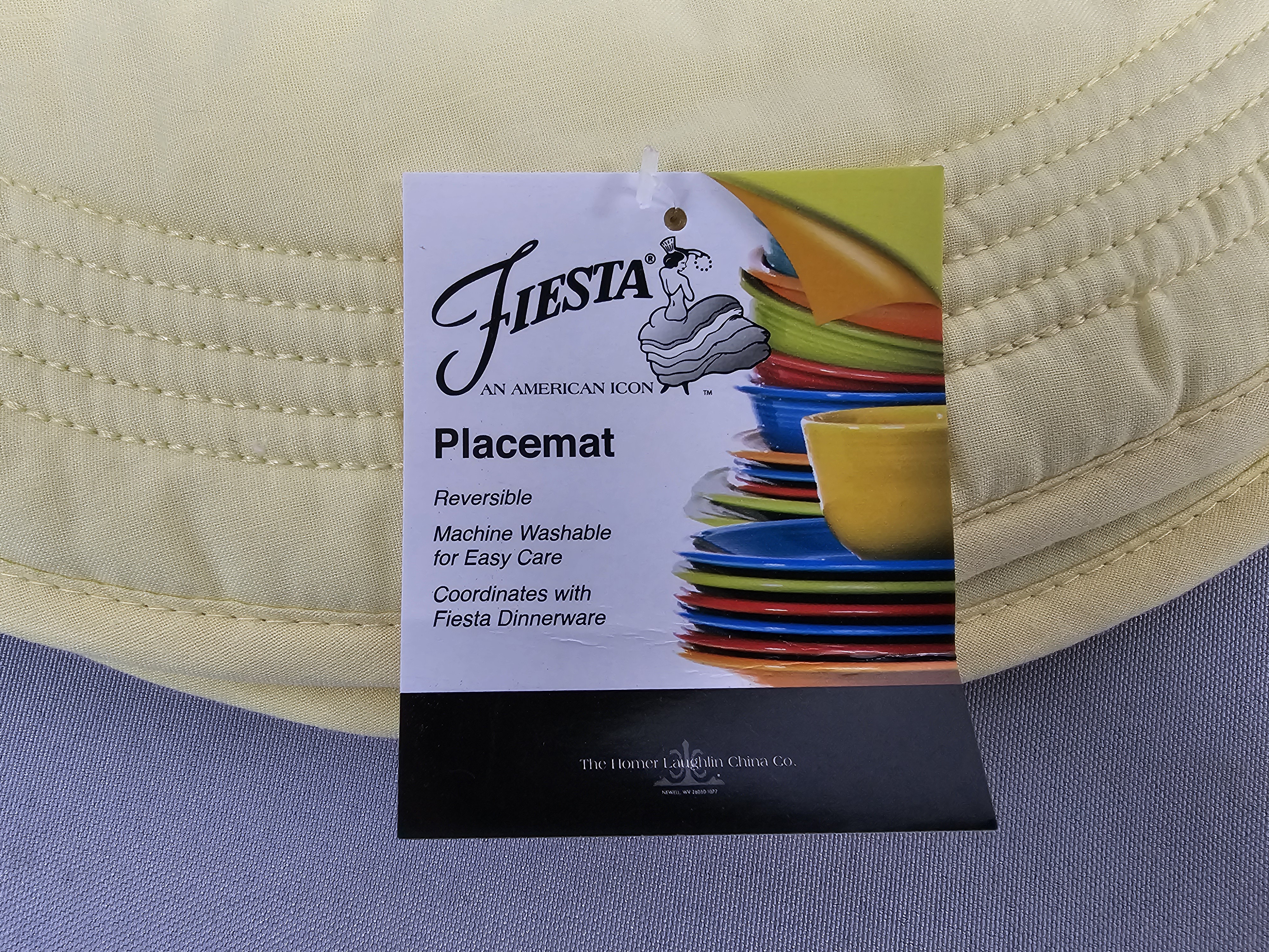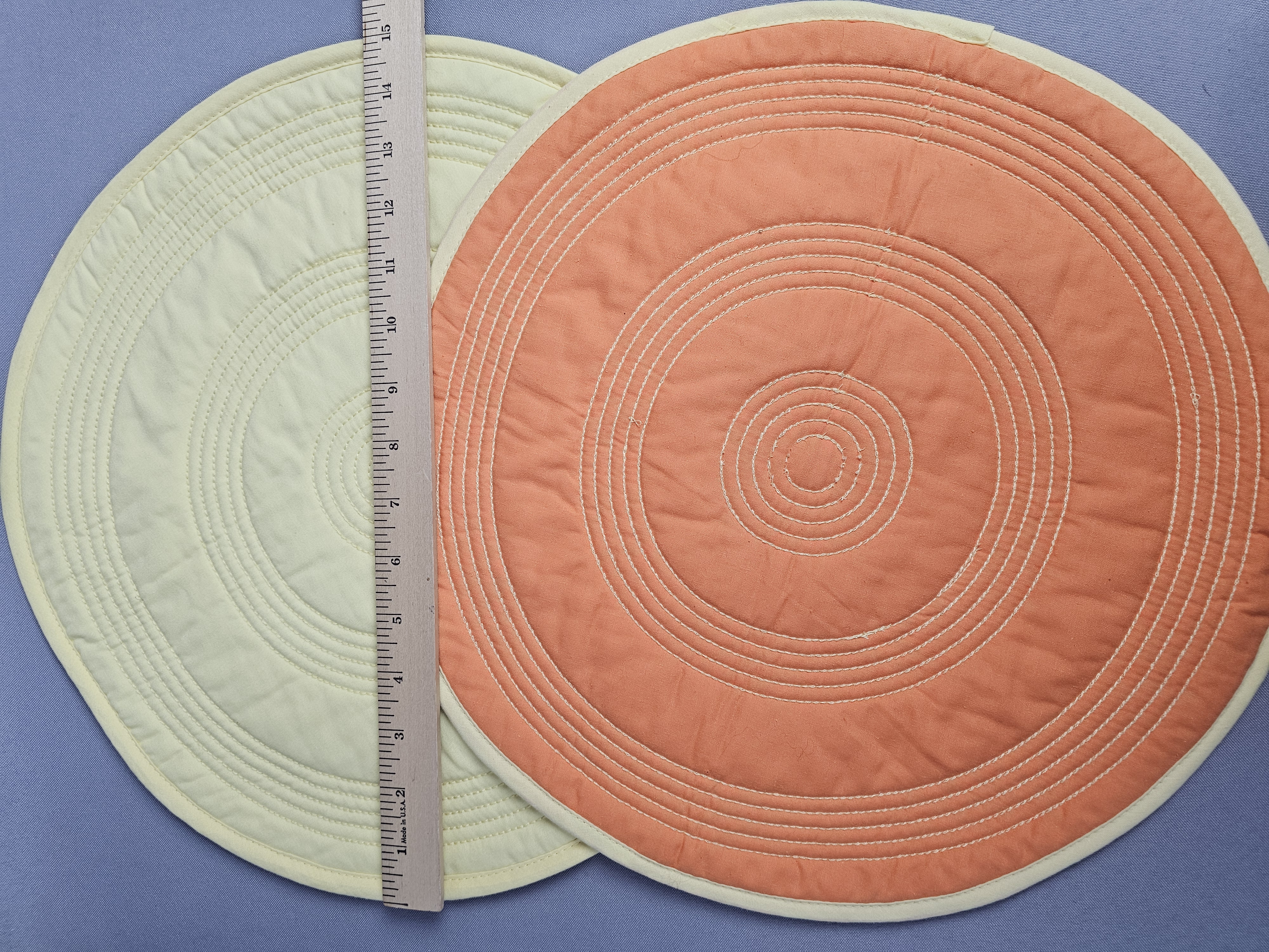 A set of eight reversible circular quilted placemats manufactured by The Homer Laughlin China Co. under the Fiesta brand. These textiles are constructed from a quilted fabric featuring machine-sewn concentric circular stitching. Each placemat is reversible, displaying a solid orange color on one side and a pale yellow color on the reverse. The edges are finished with a matching pale yellow fabric binding. One placemat retains the original manufacturer hangtag. Diameter: 15 inches each The set is in good pre-owned condition. One placemat has a small, light orange stain on the pale yellow side near the edge binding. Occasional loose threads and stray fibers are present, consistent with light use.