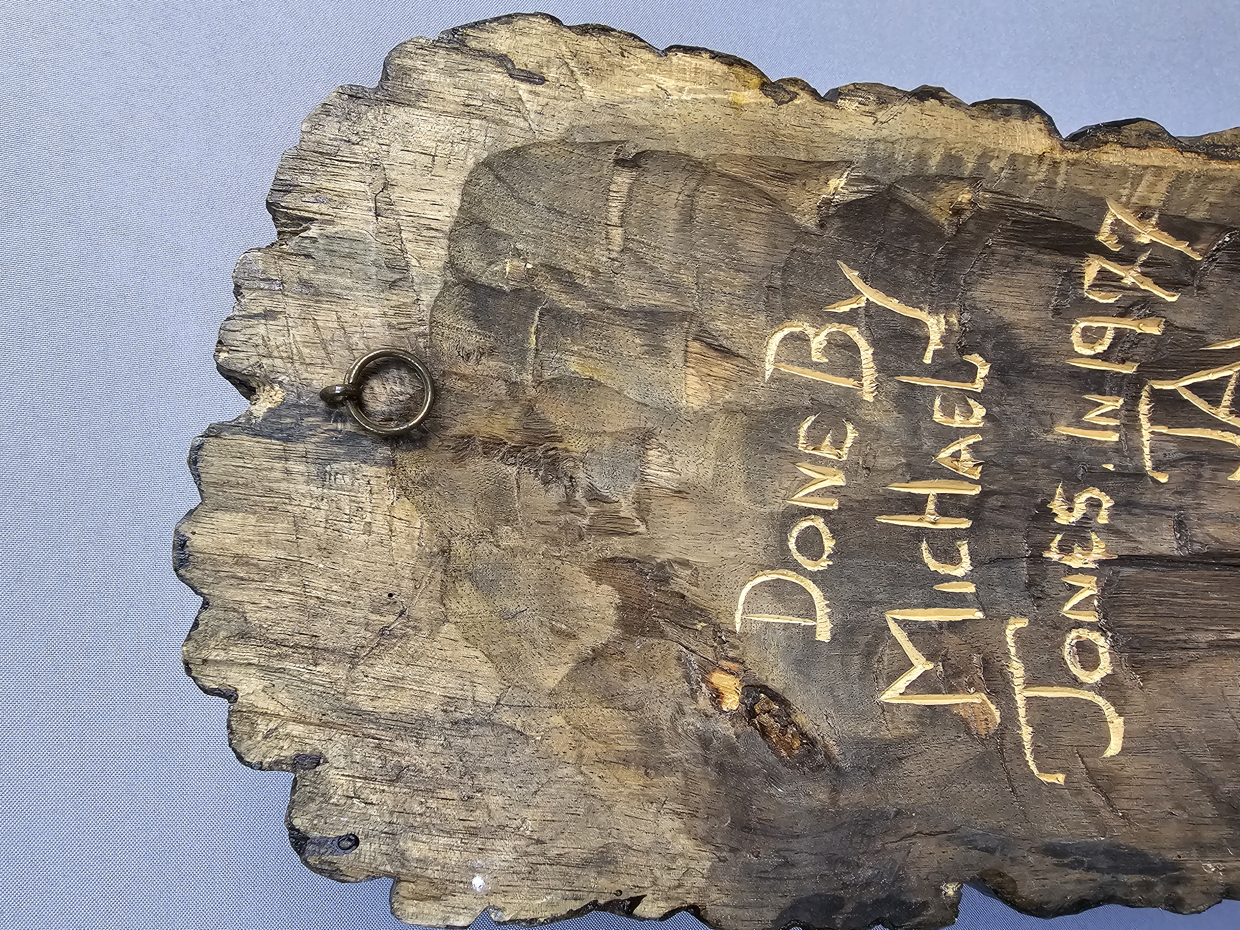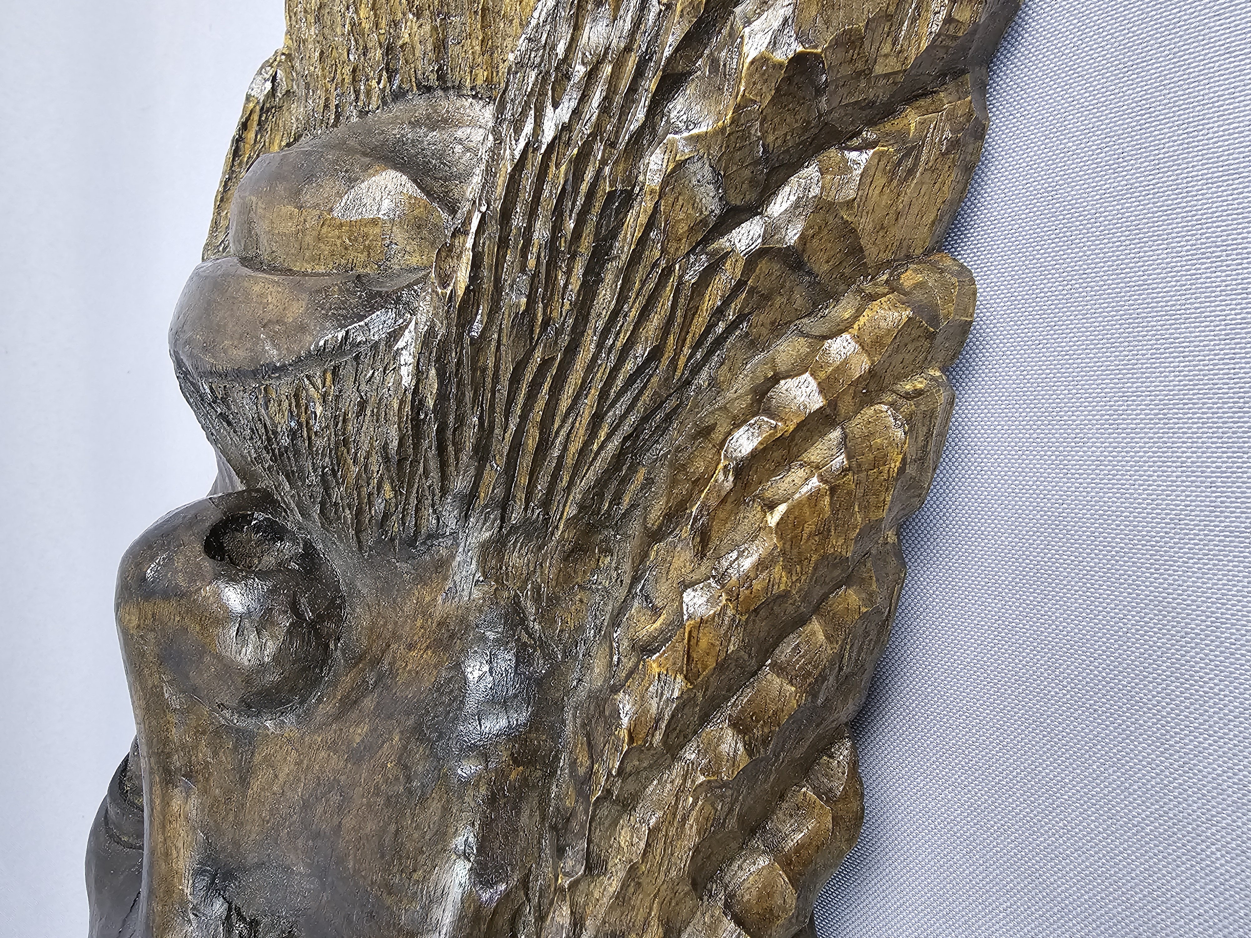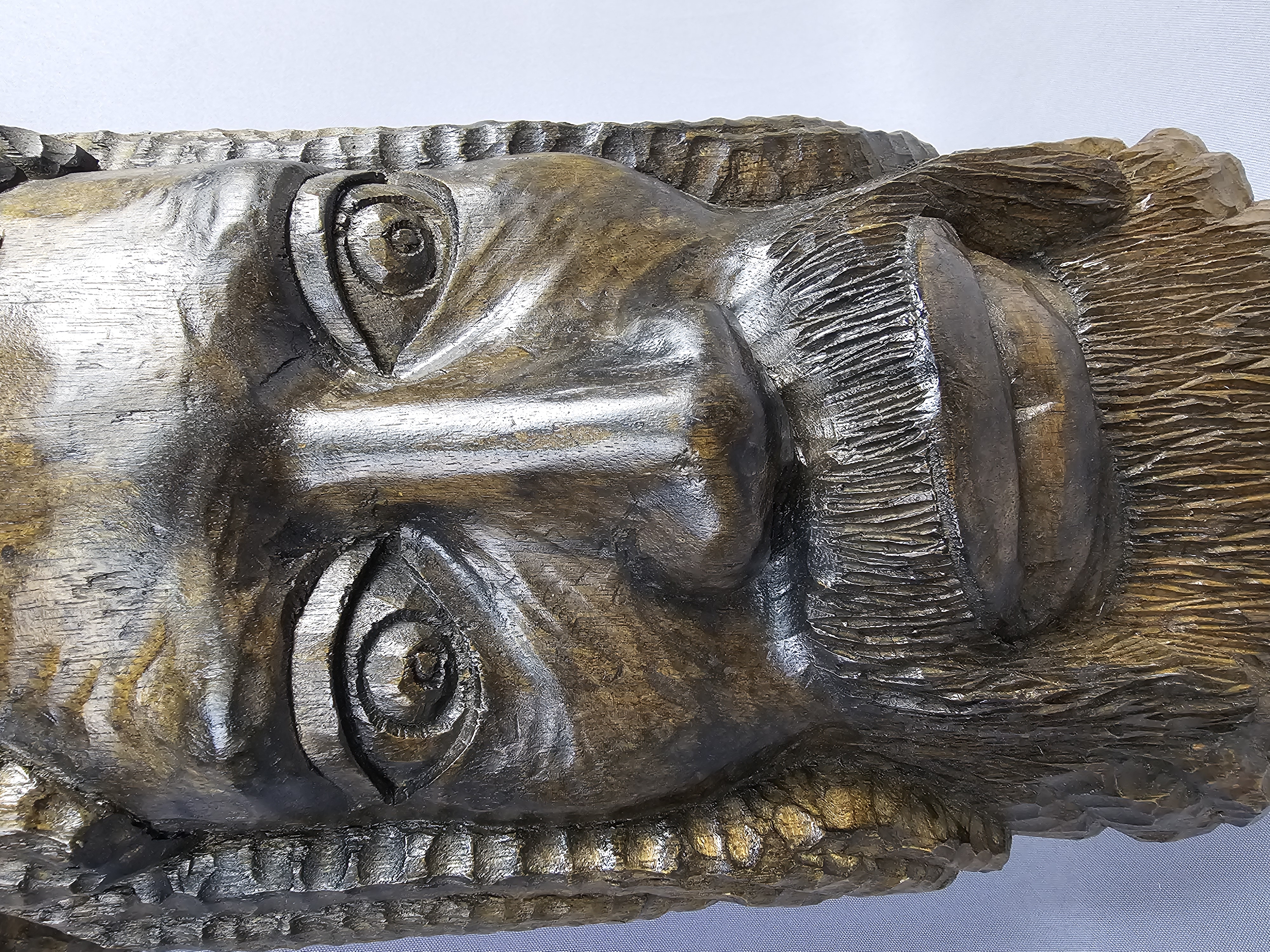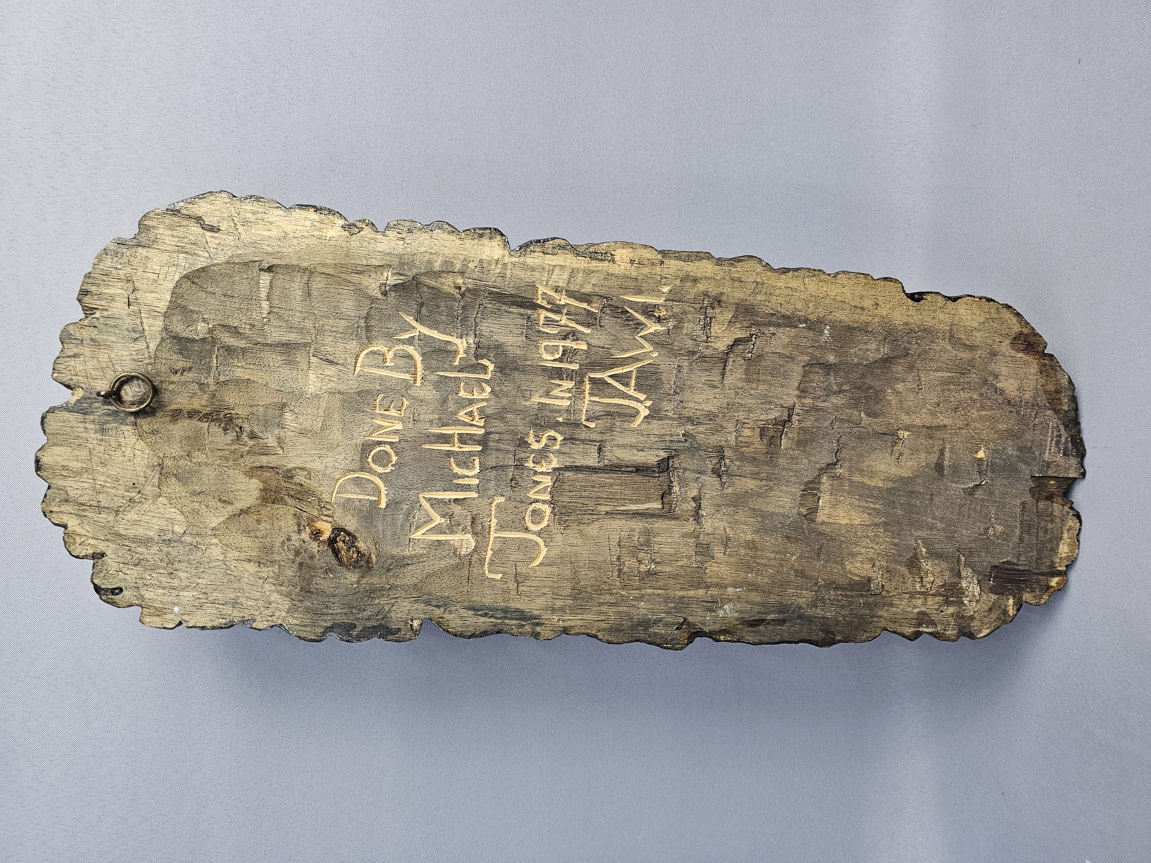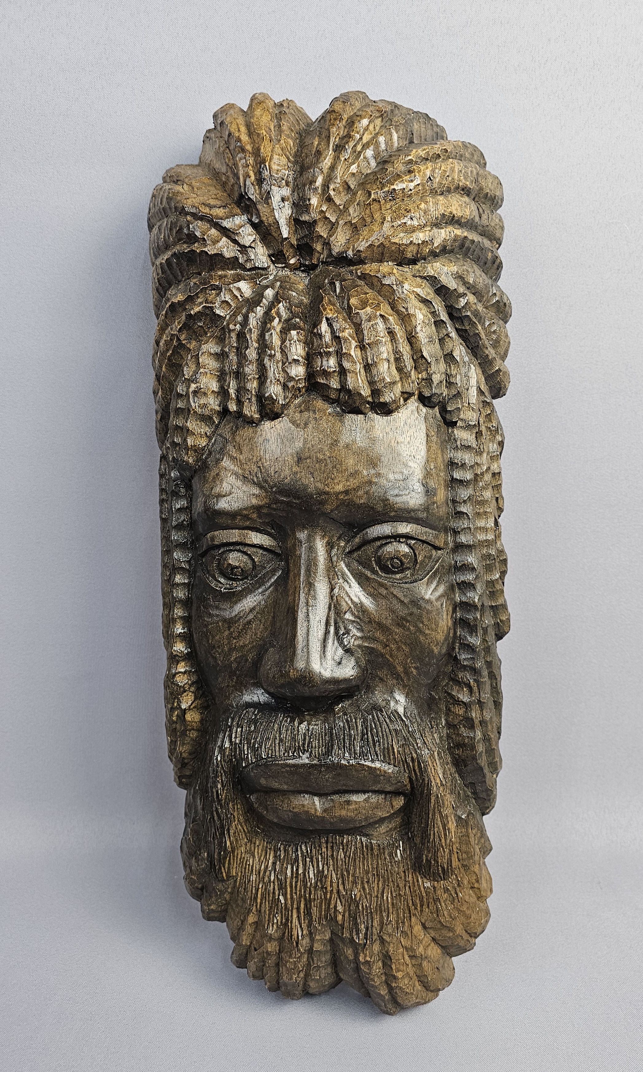 This hand-carved wood sculpture by Michael Jones depicts a stylized male head with a prominent beard, mustache, and deeply textured hair resembling dreadlocks. The work is executed in a folk art style with visible chisel marks throughout the surface, indicating manual construction. The wood is finished with a dark brown stain that highlights the depth of the carving. The reverse of the sculpture is flat and bears an incised inscription that reads Done By Michael Jones IN 1977 JA W I. A small metal ring is attached to the upper reverse for wall mounting. Approximately 21 inches tall The sculpture is in good overall condition. There is minor surface wear and small abrasions consistent with age and material.