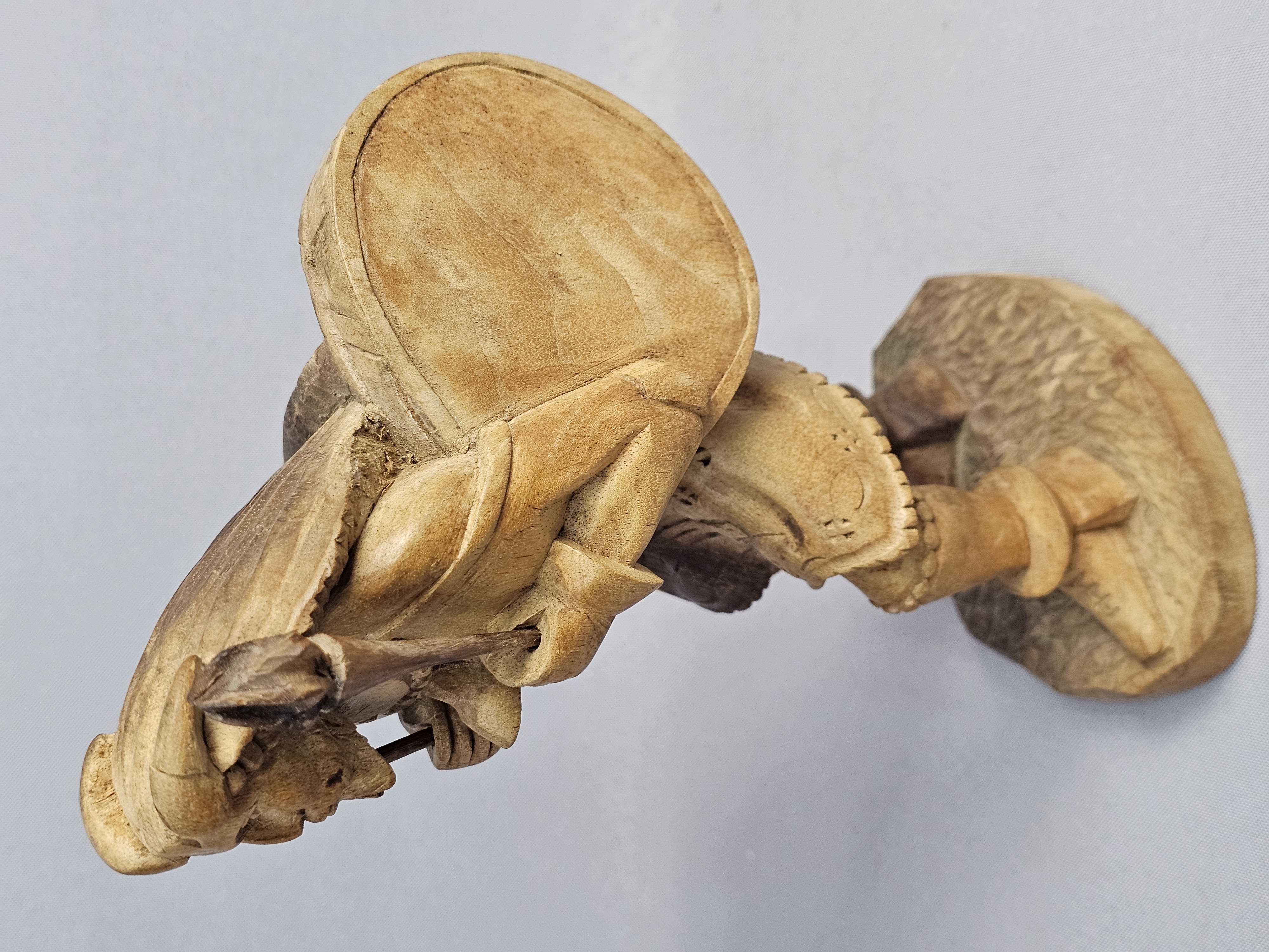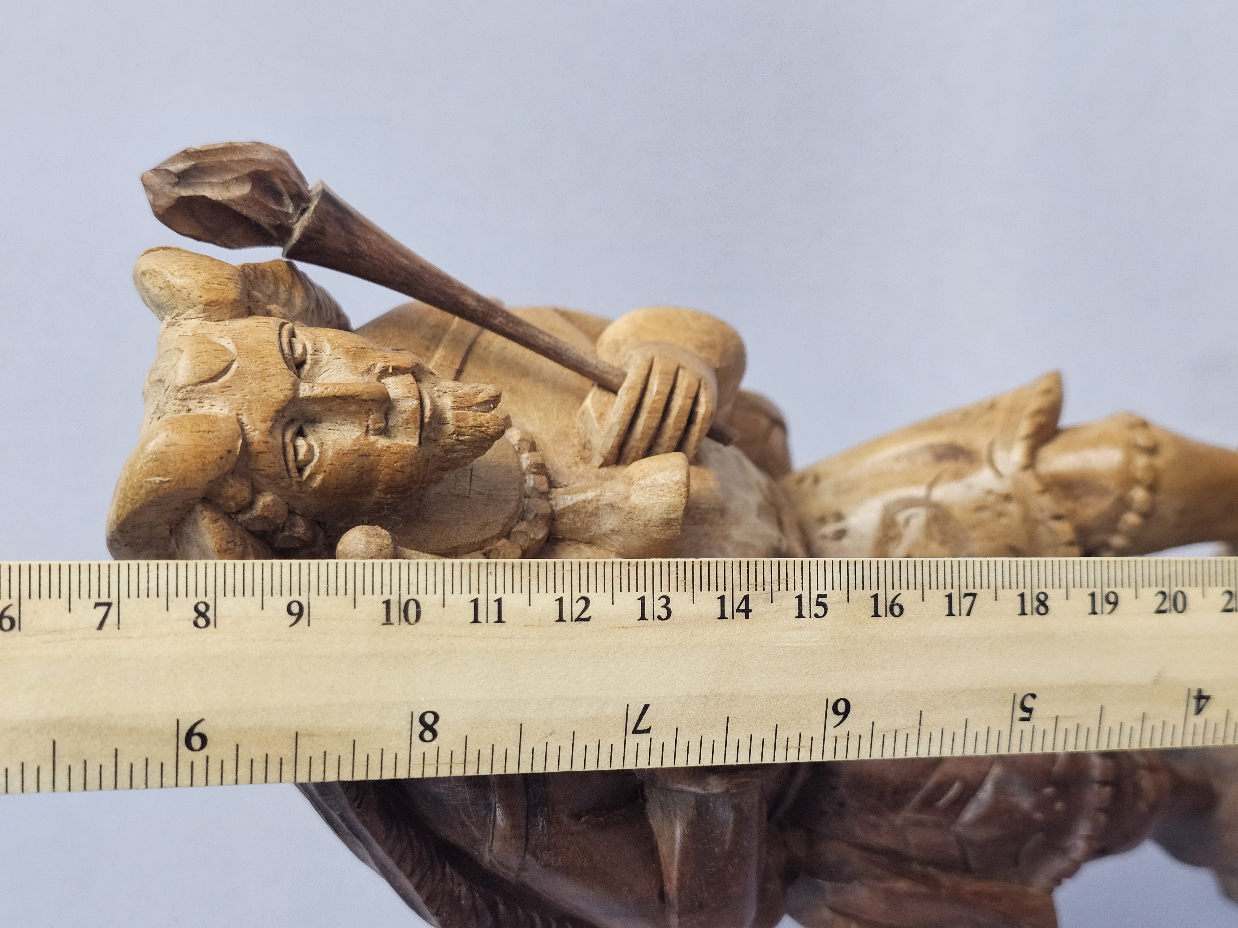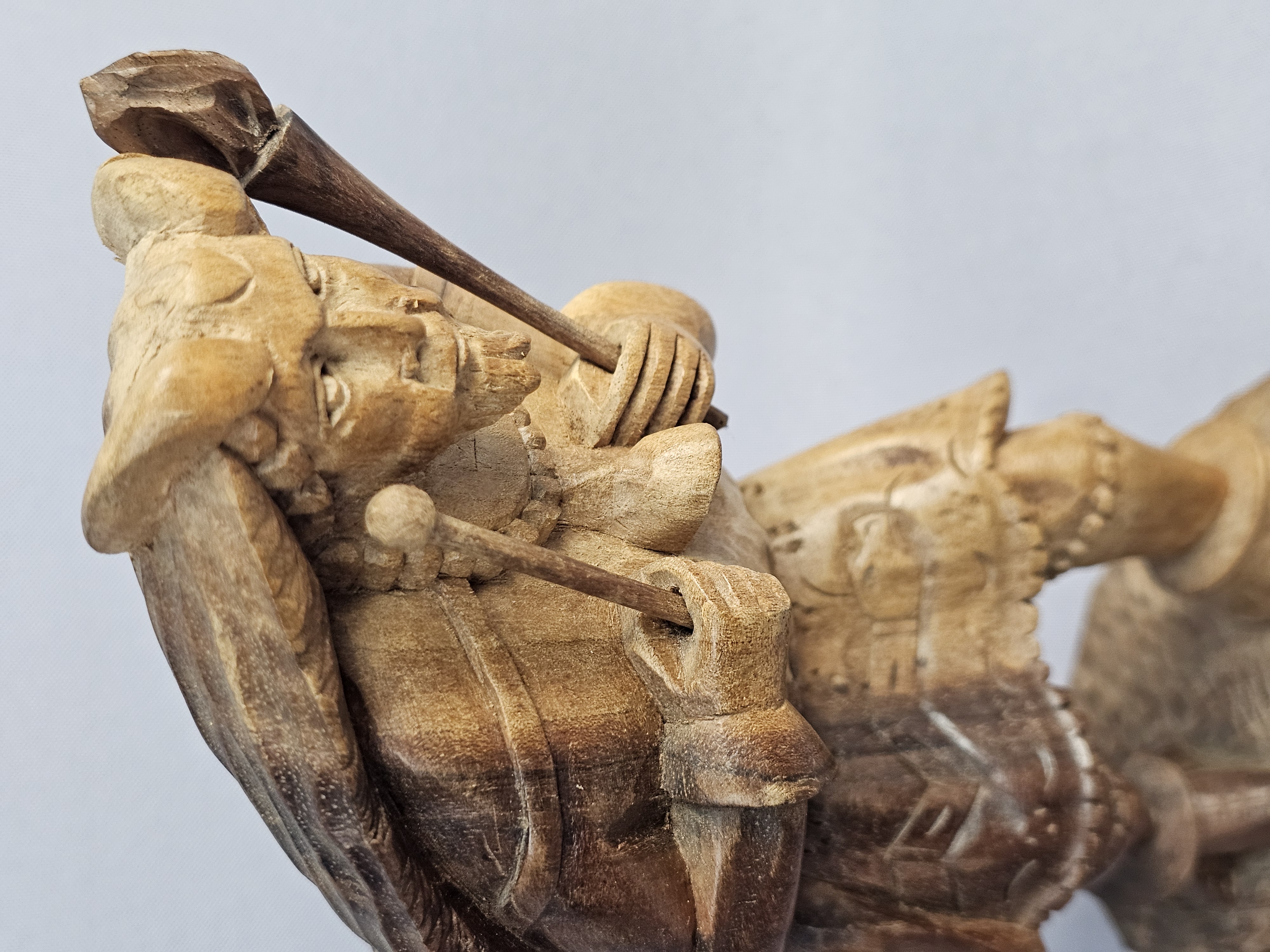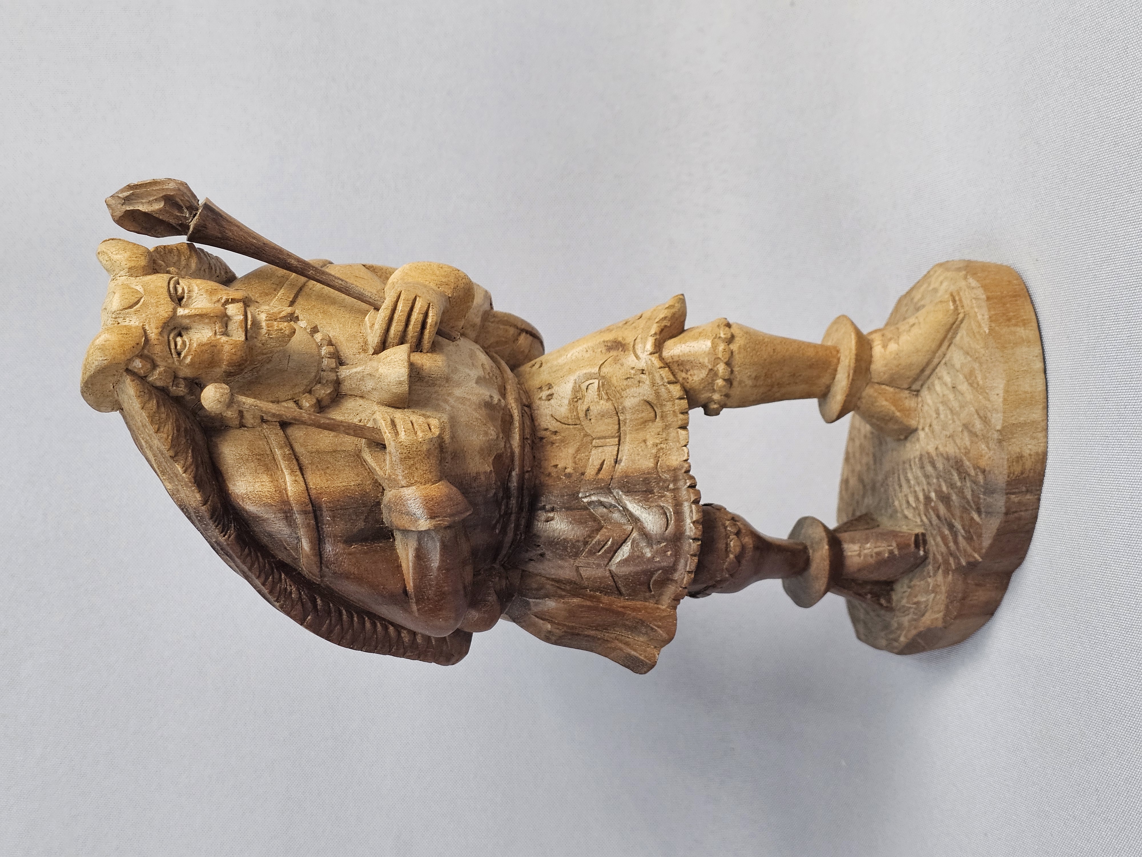 This hand-carved wood sculpture depicts a male musician in traditional folk-style dress, playing a pipe and a drum. The figure is characterized by a pointed beard and a peaked cap, with a large round drum or shield carried on the back. The piece is executed in a rustic manner with visible chisel marks and a natural wood patina. The sculpture is set upon an integral, textured wooden base which has three green felt pads on the bottom. Height: 9 inches The sculpture is in good condition overall. There is a crack on one horn. There are minor surface marks and wear consistent with age.
