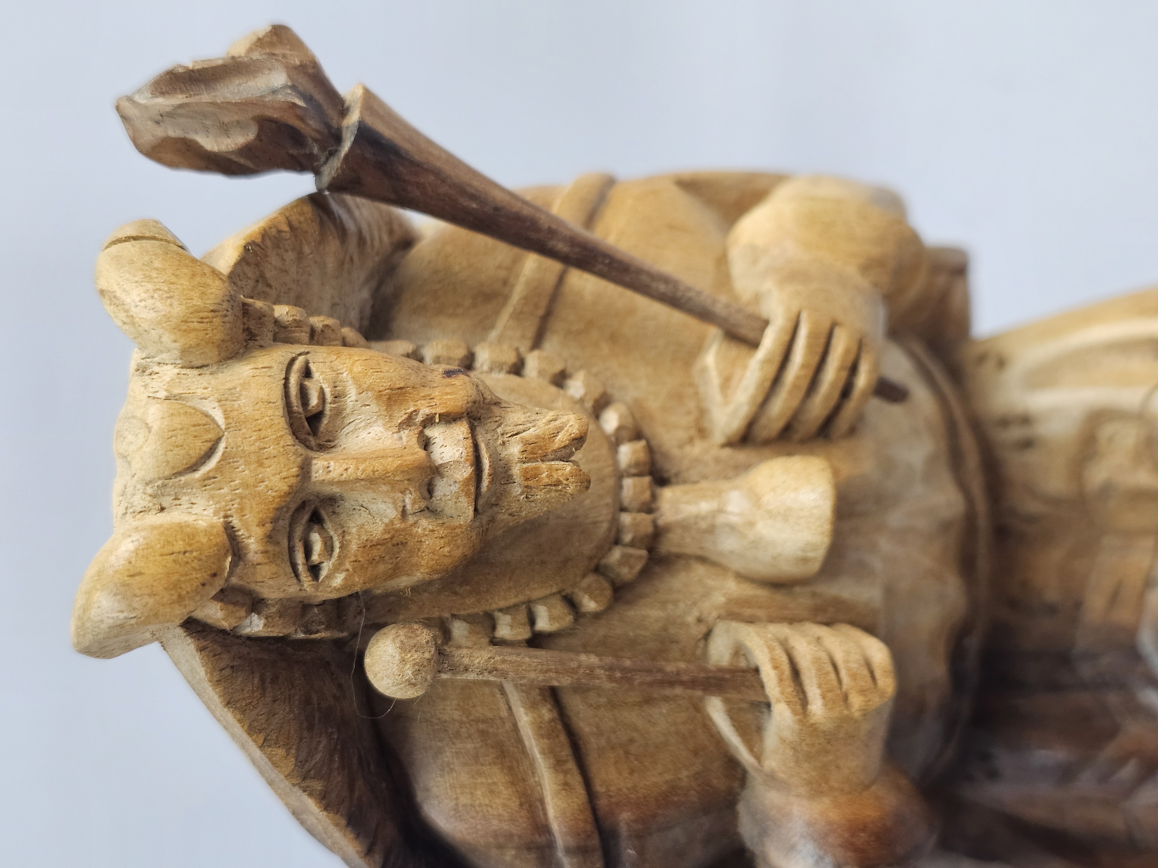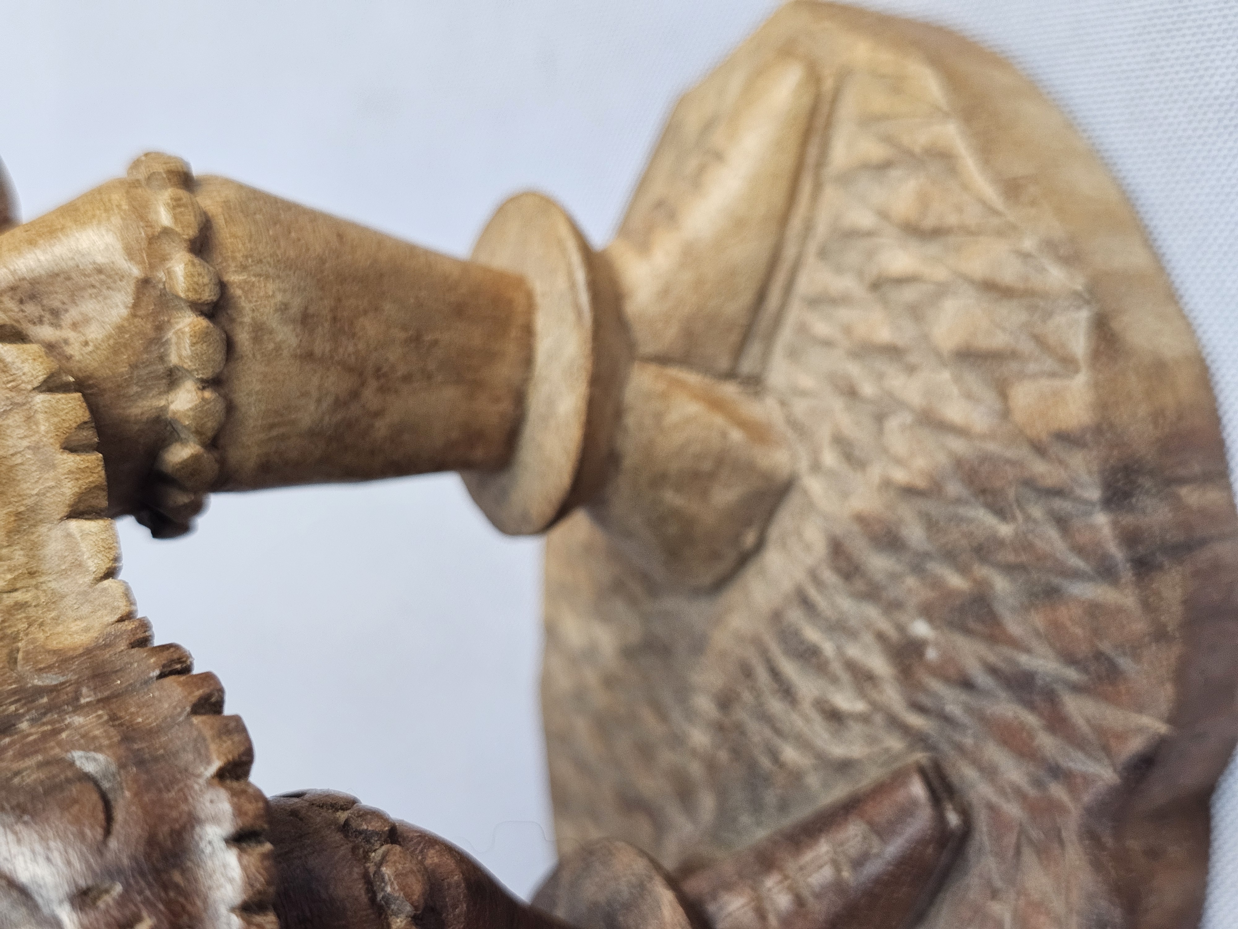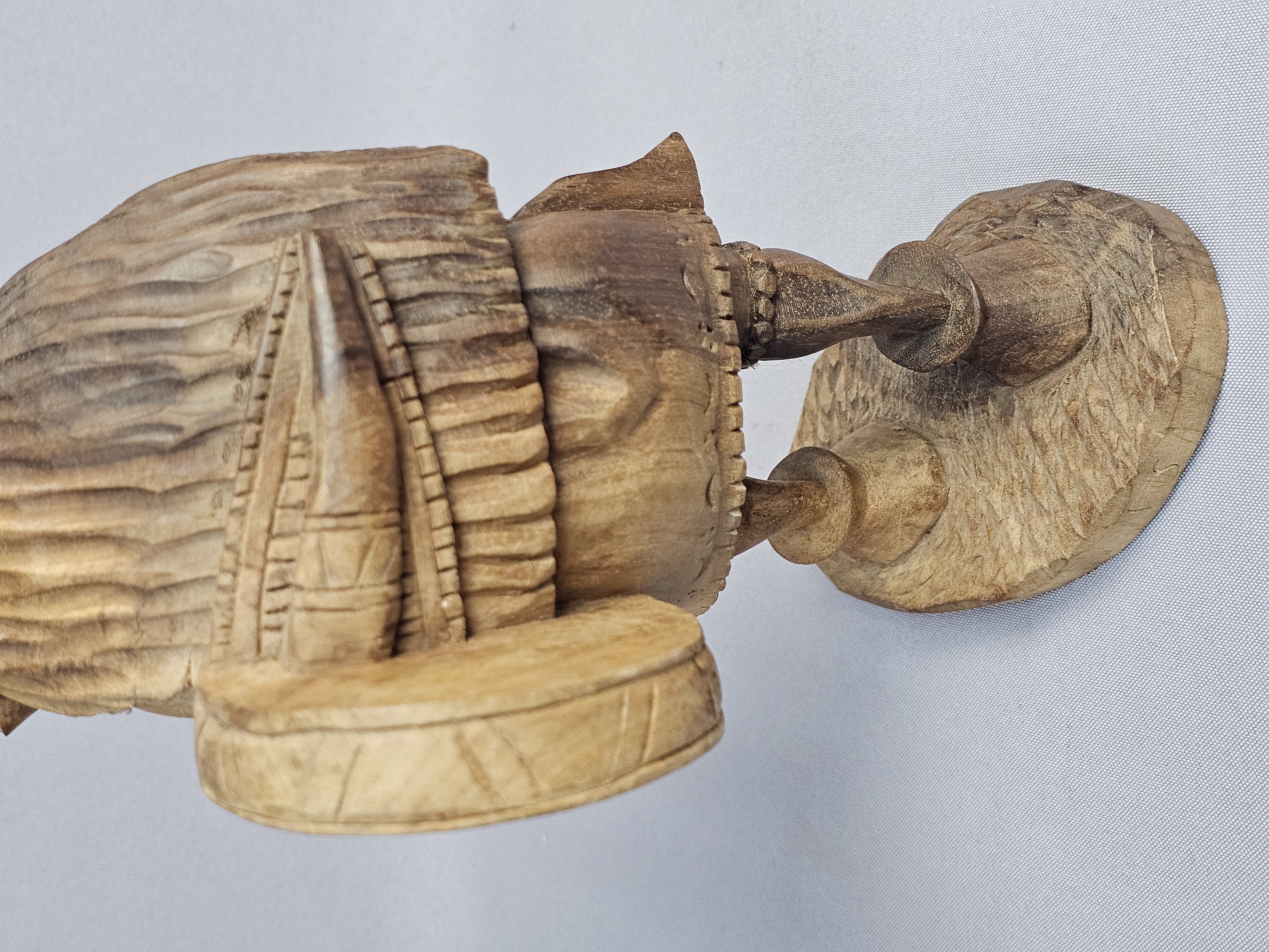 This hand-carved wood sculpture depicts a male musician in traditional folk-style dress, playing a pipe and a drum. The figure is characterized by a pointed beard and a peaked cap, with a large round drum or shield carried on the back. The piece is executed in a rustic manner with visible chisel marks and a natural wood patina. The sculpture is set upon an integral, textured wooden base which has three green felt pads on the bottom. Height: 9 inches The sculpture is in good condition overall. There is a crack on one horn. There are minor surface marks and wear consistent with age.