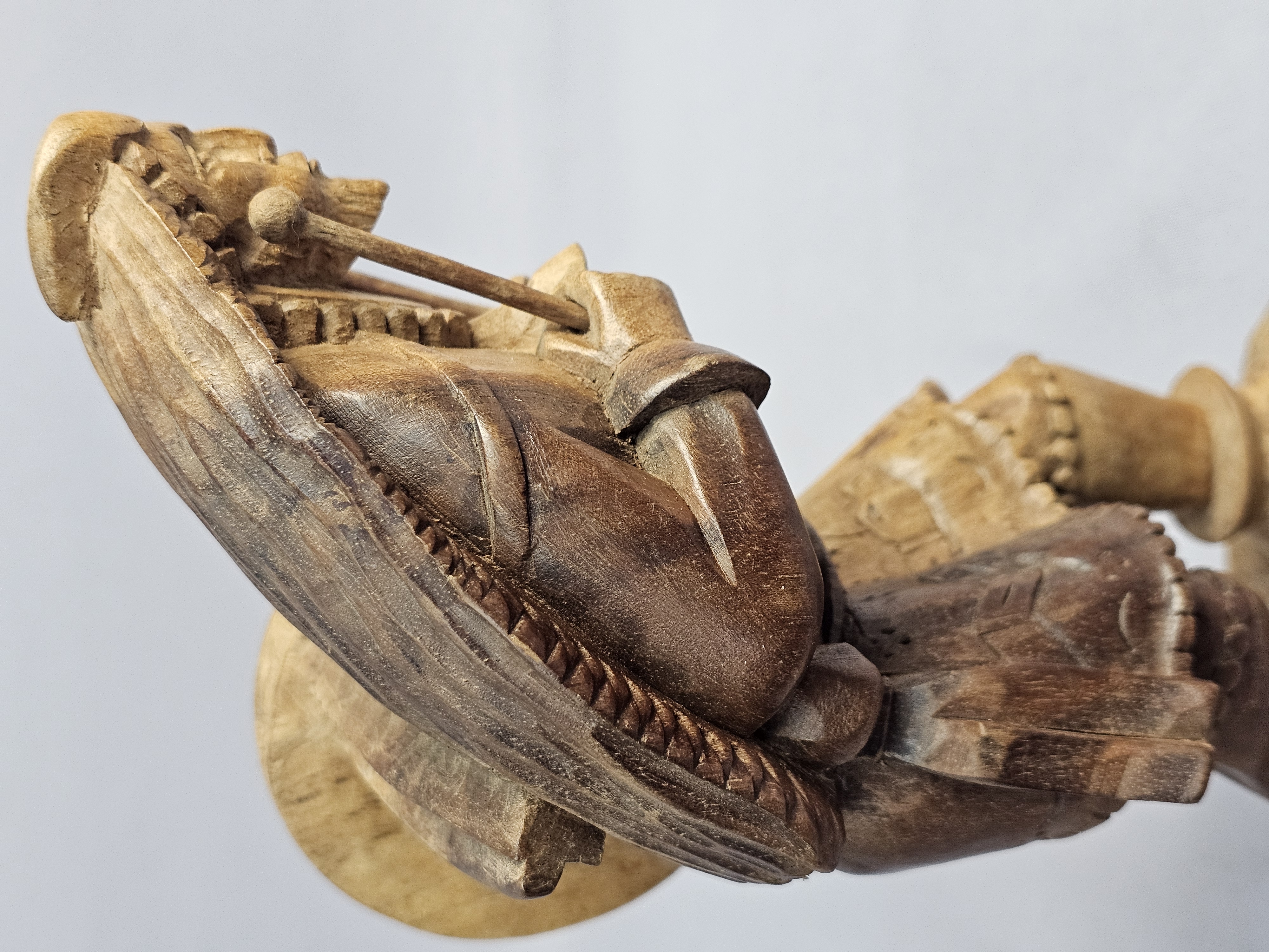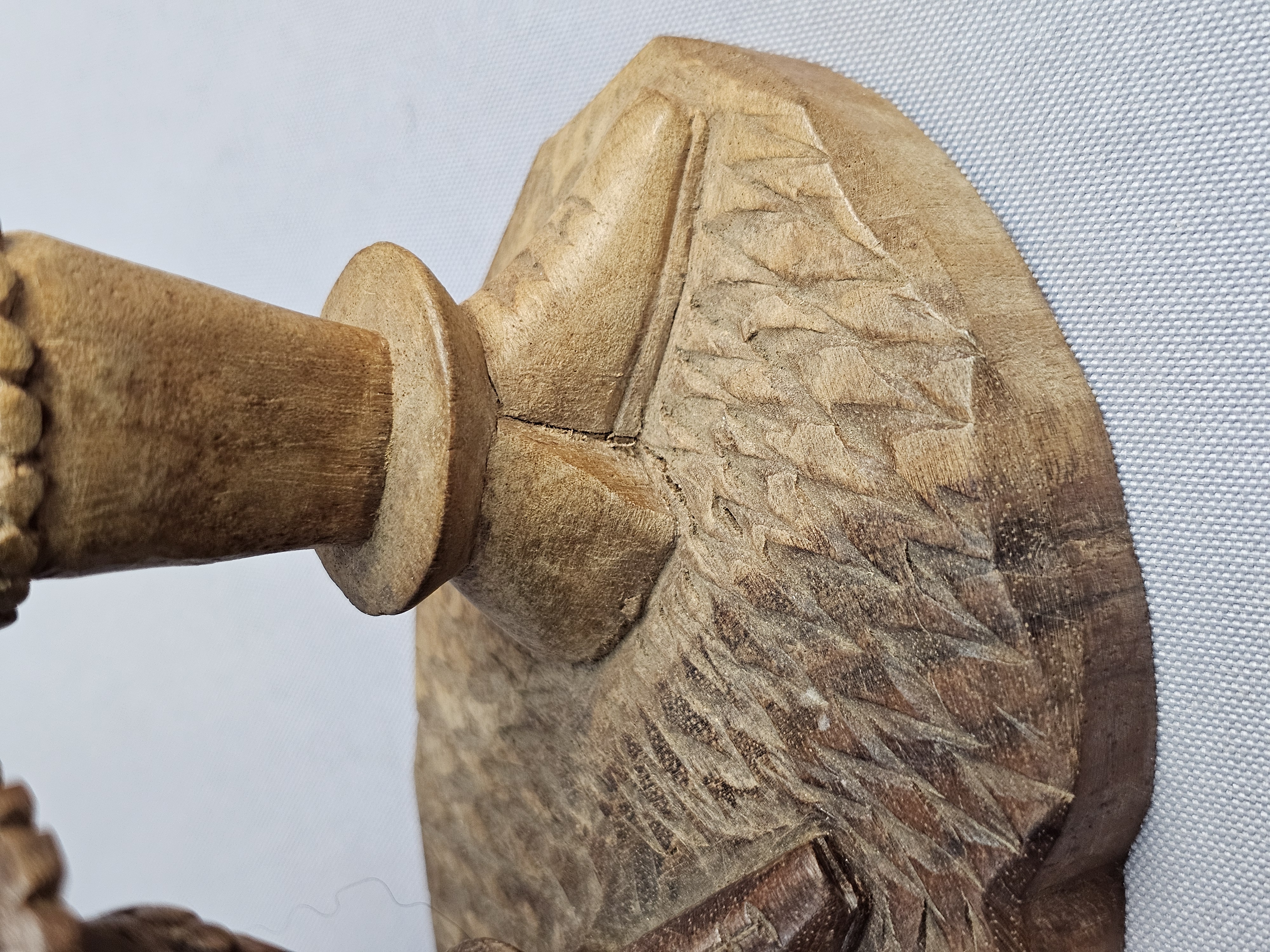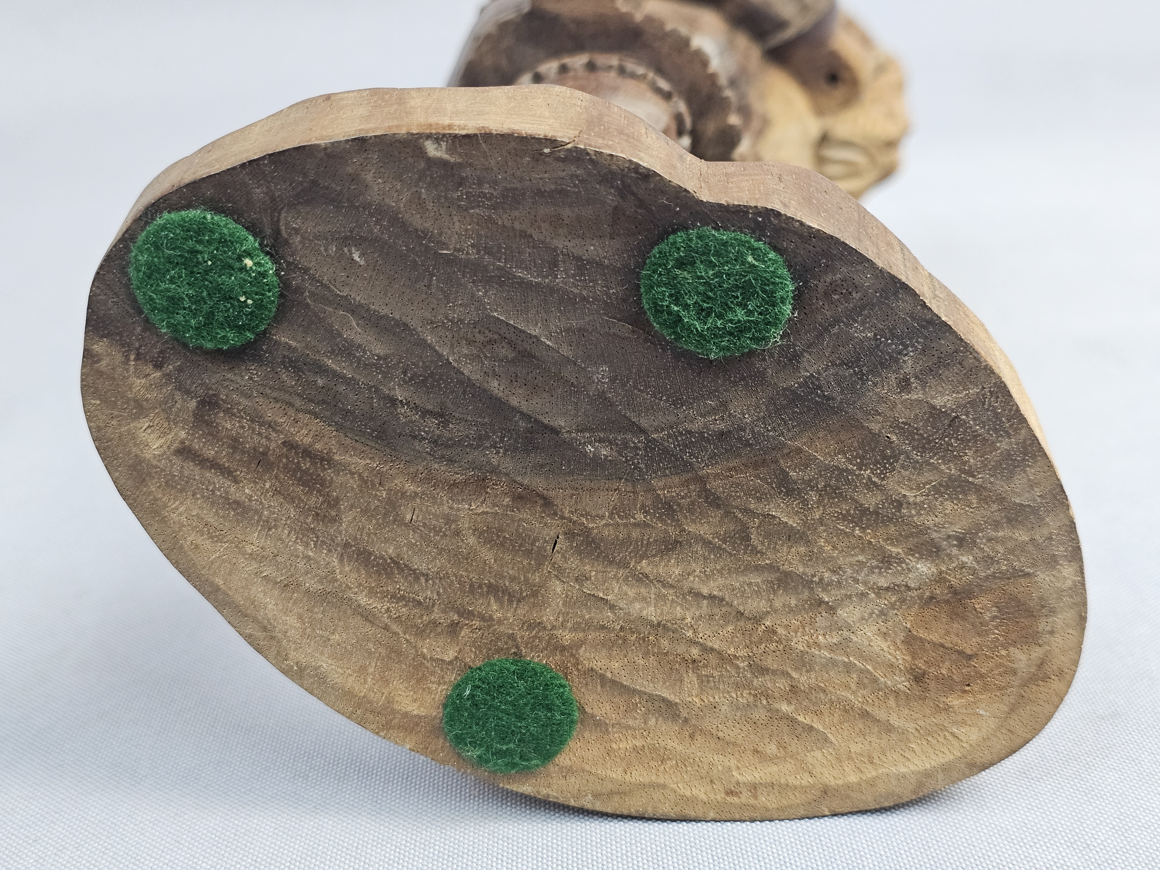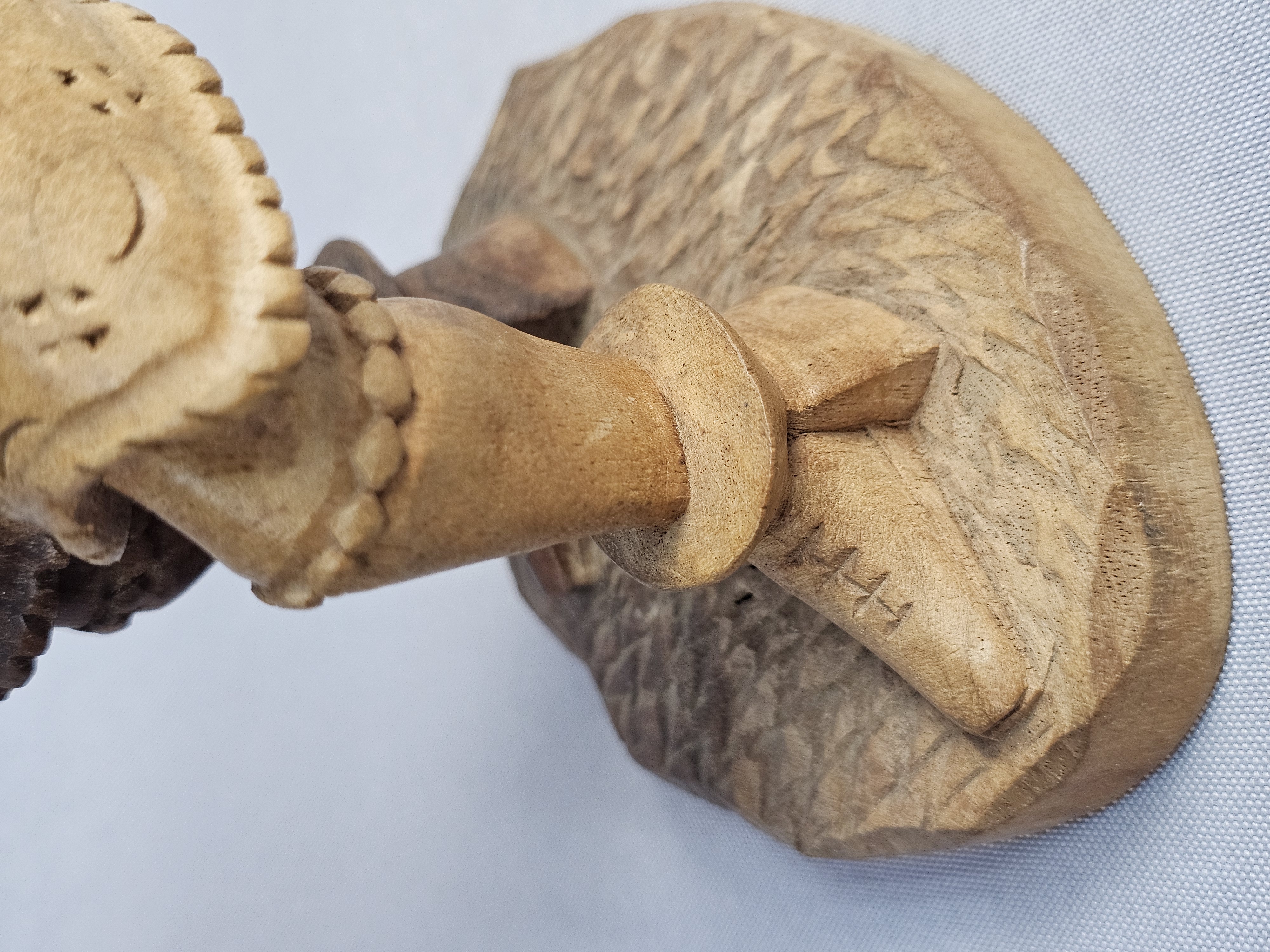 This hand-carved wood sculpture depicts a male musician in traditional folk-style dress, playing a pipe and a drum. The figure is characterized by a pointed beard and a peaked cap, with a large round drum or shield carried on the back. The piece is executed in a rustic manner with visible chisel marks and a natural wood patina. The sculpture is set upon an integral, textured wooden base which has three green felt pads on the bottom. Height: 9 inches The sculpture is in good condition overall. There is a crack on one horn. There are minor surface marks and wear consistent with age.