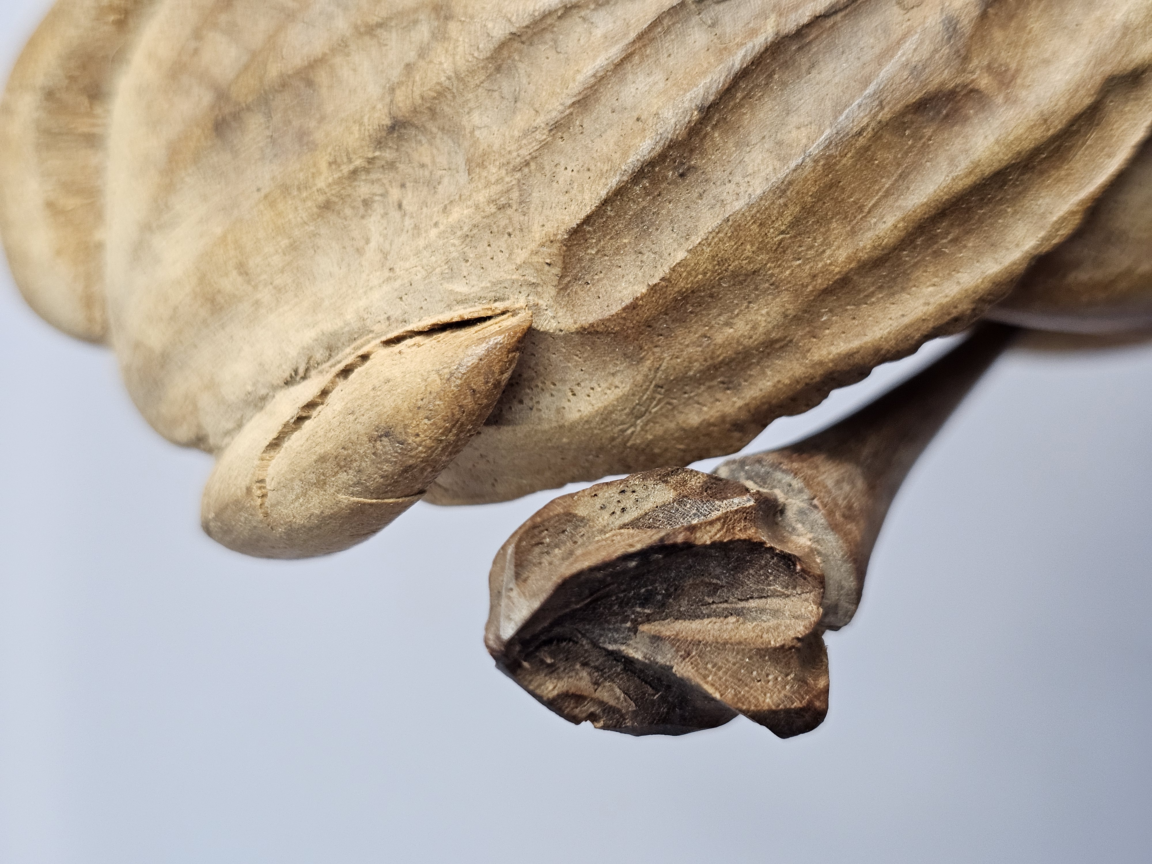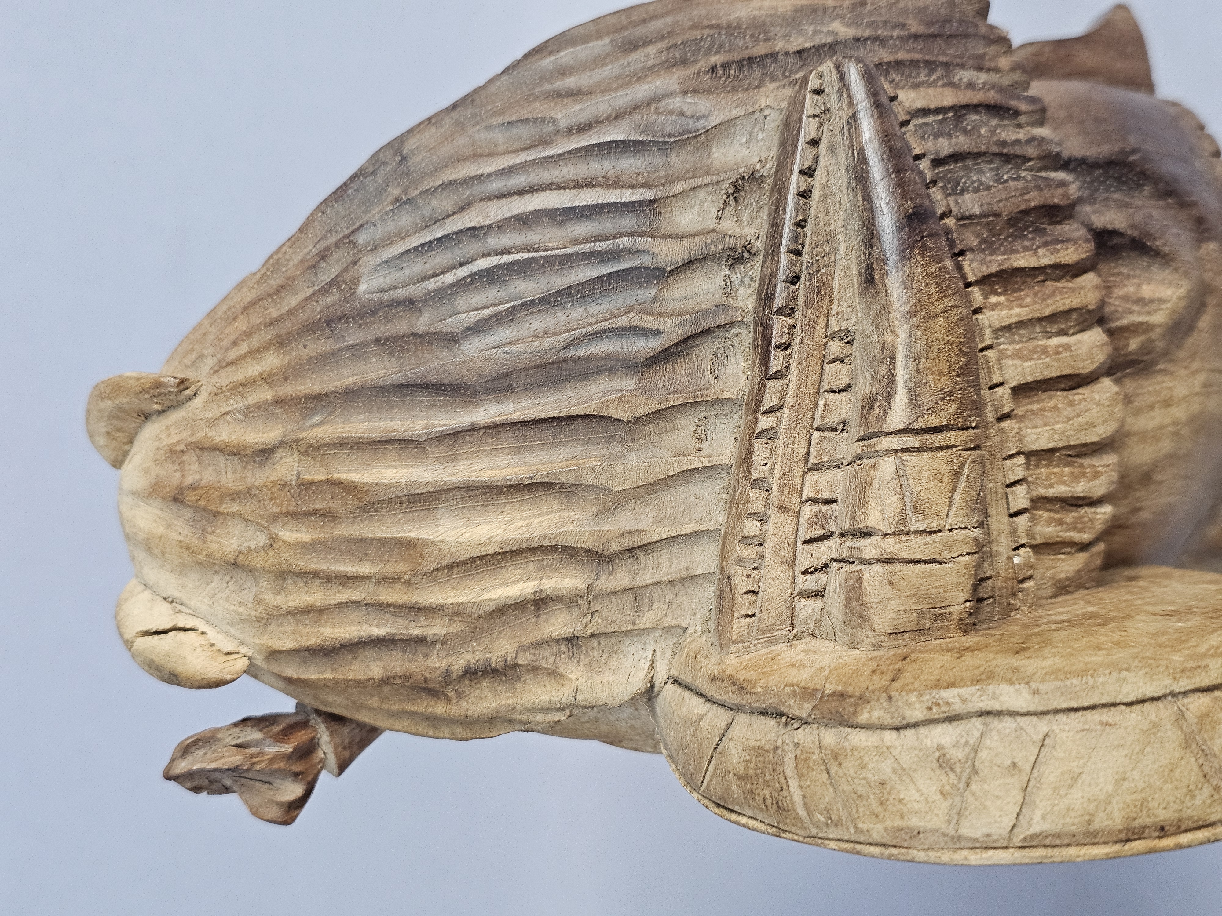 The sculpture is in good condition overall. There is a crack on one horn. There are minor surface marks and wear consistent with age.