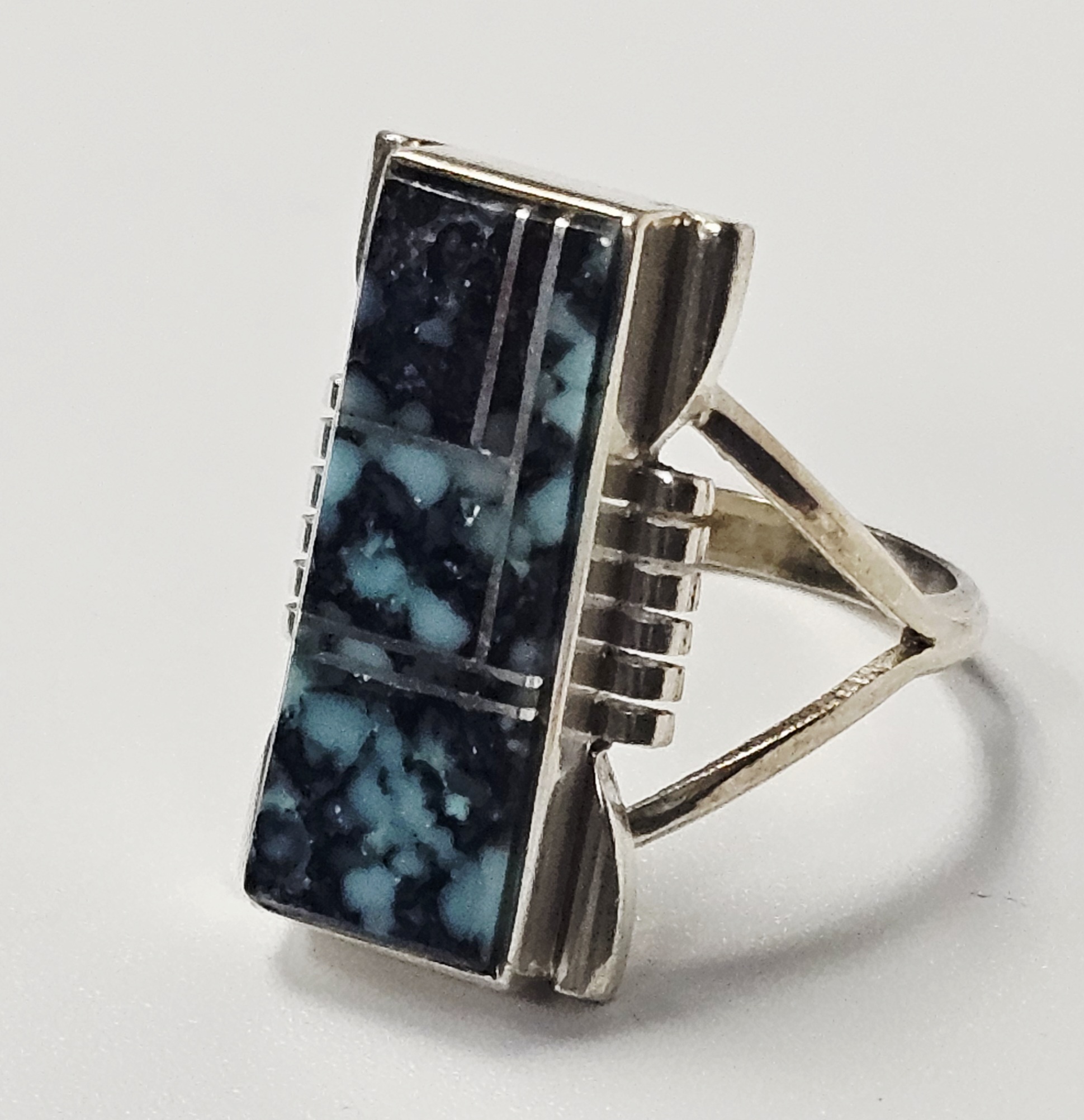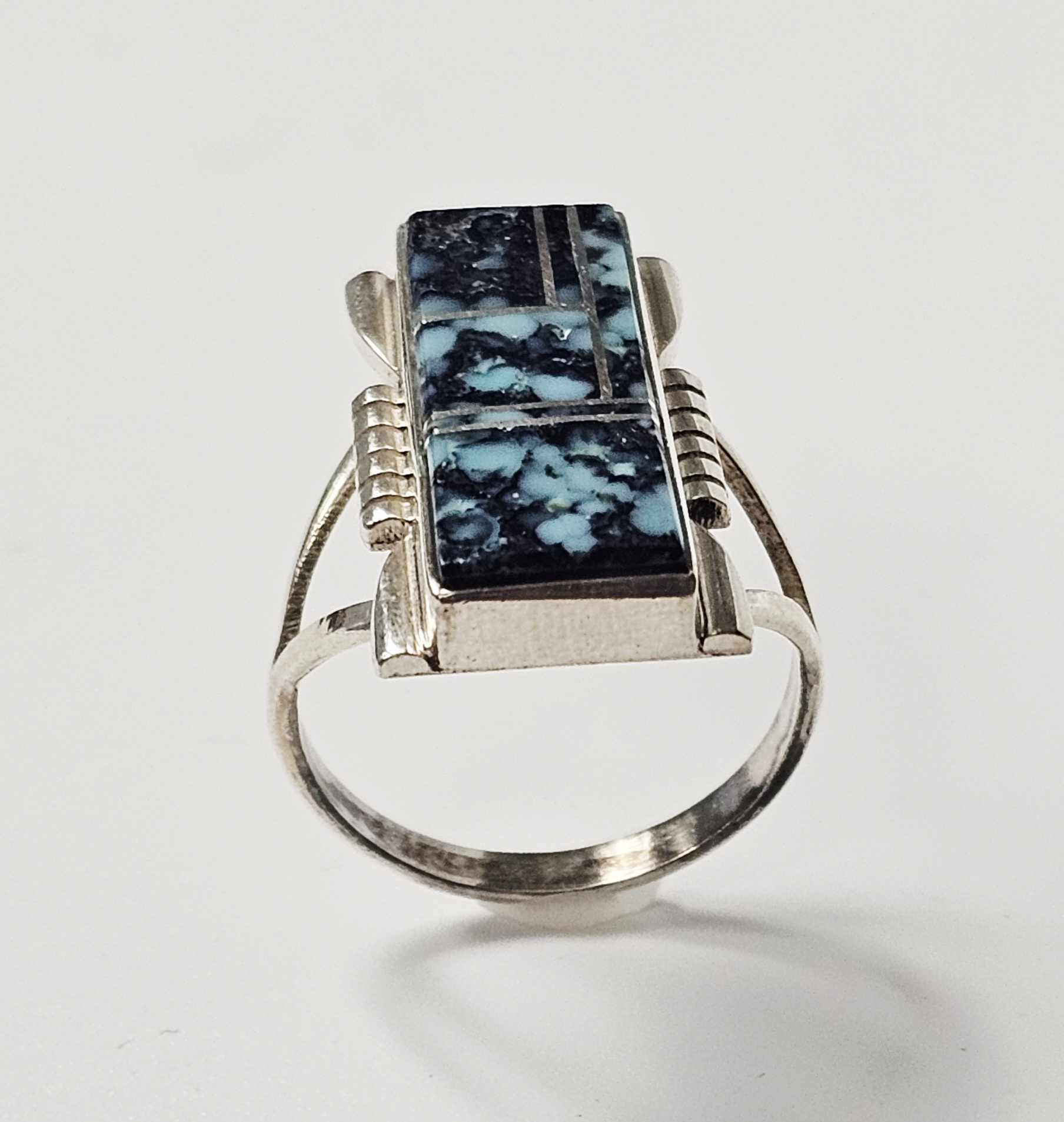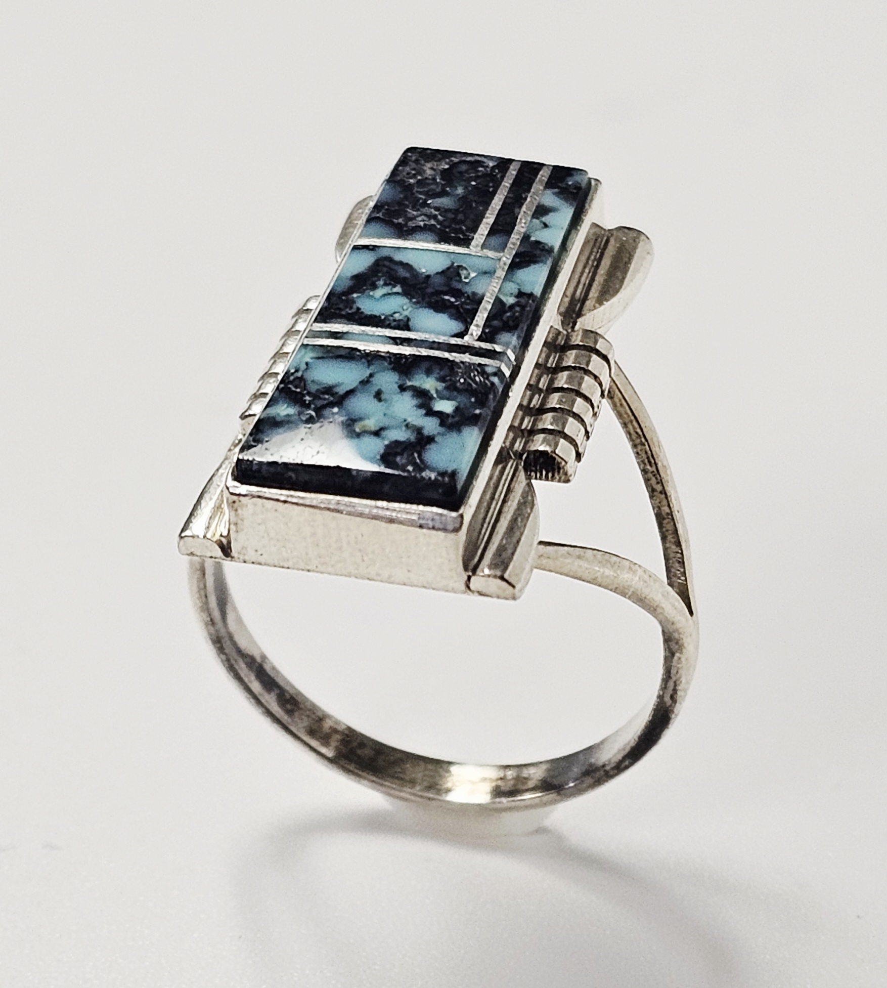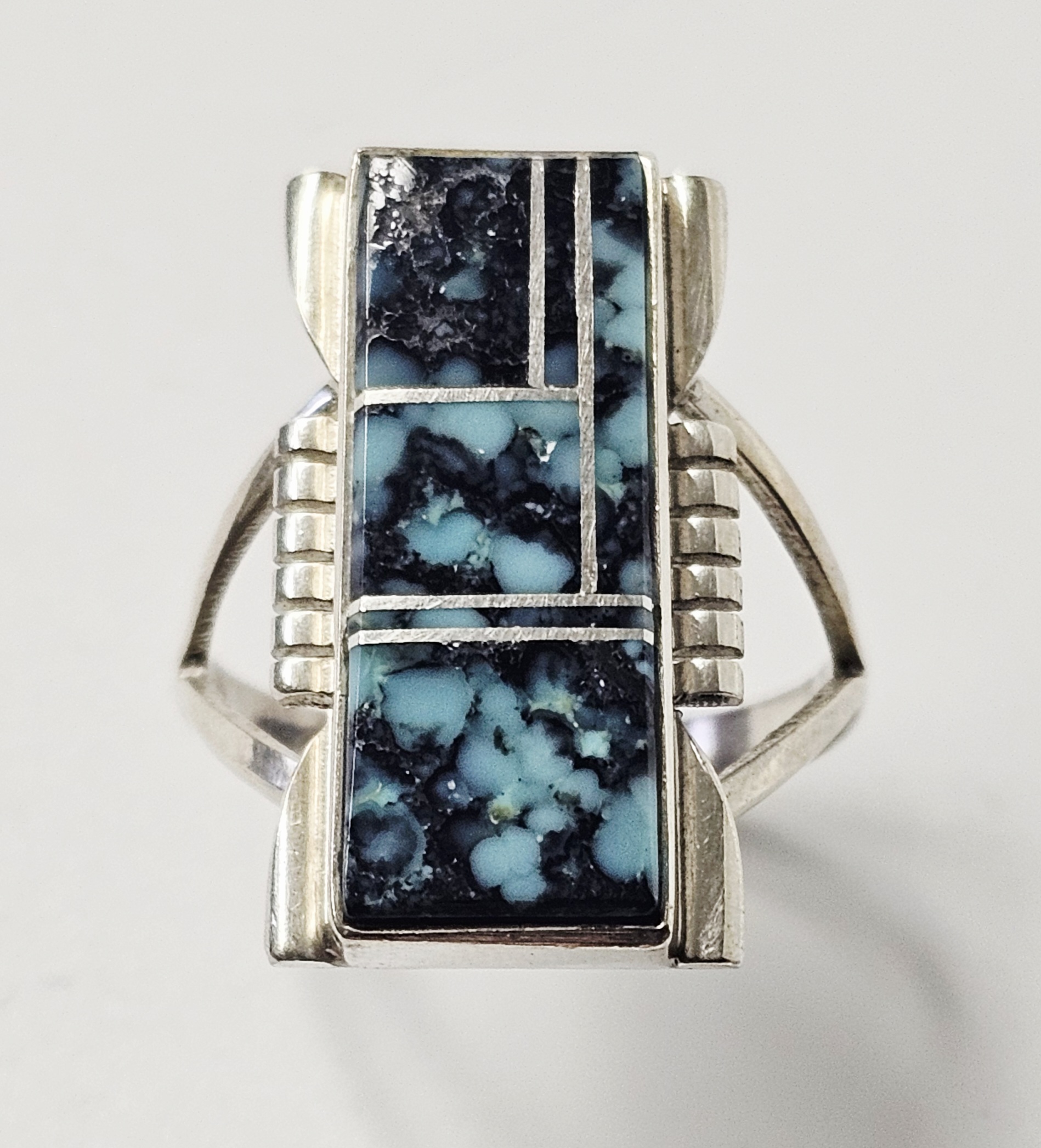 This sterling silver ring features a rectangular face with a geometric inlay of turquoise sections characterized by a dark matrix. The inlay pieces are separated by thin silver channels. The shoulders of the ring head are designed with a stepped, ribbed pattern that transitions into a split-shank band. The reverse of the ring head is stamped with the maker mark A. YAZZIE, the metal purity mark STERLING, and a copyright symbol. Weight: 5.8 grams Size: US 8.5. The item is in good vintage condition. There is light surface wear and minor tarnish commensurate with age and use. The stone inlays appear secure and intact.