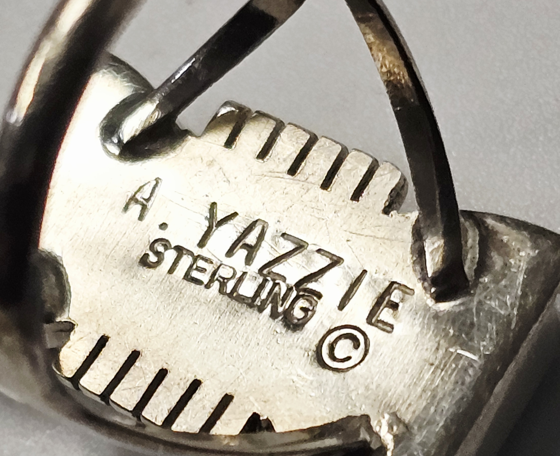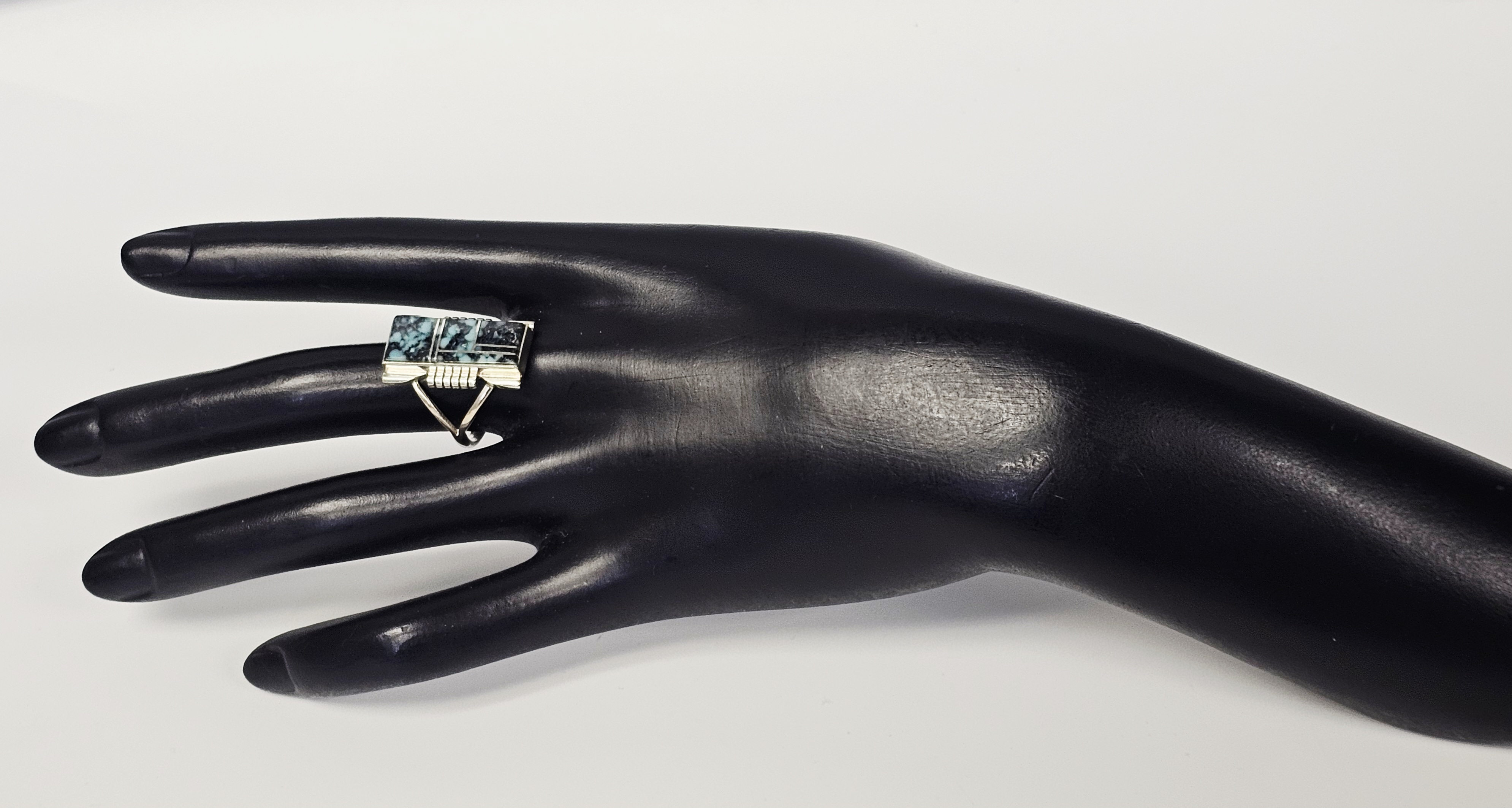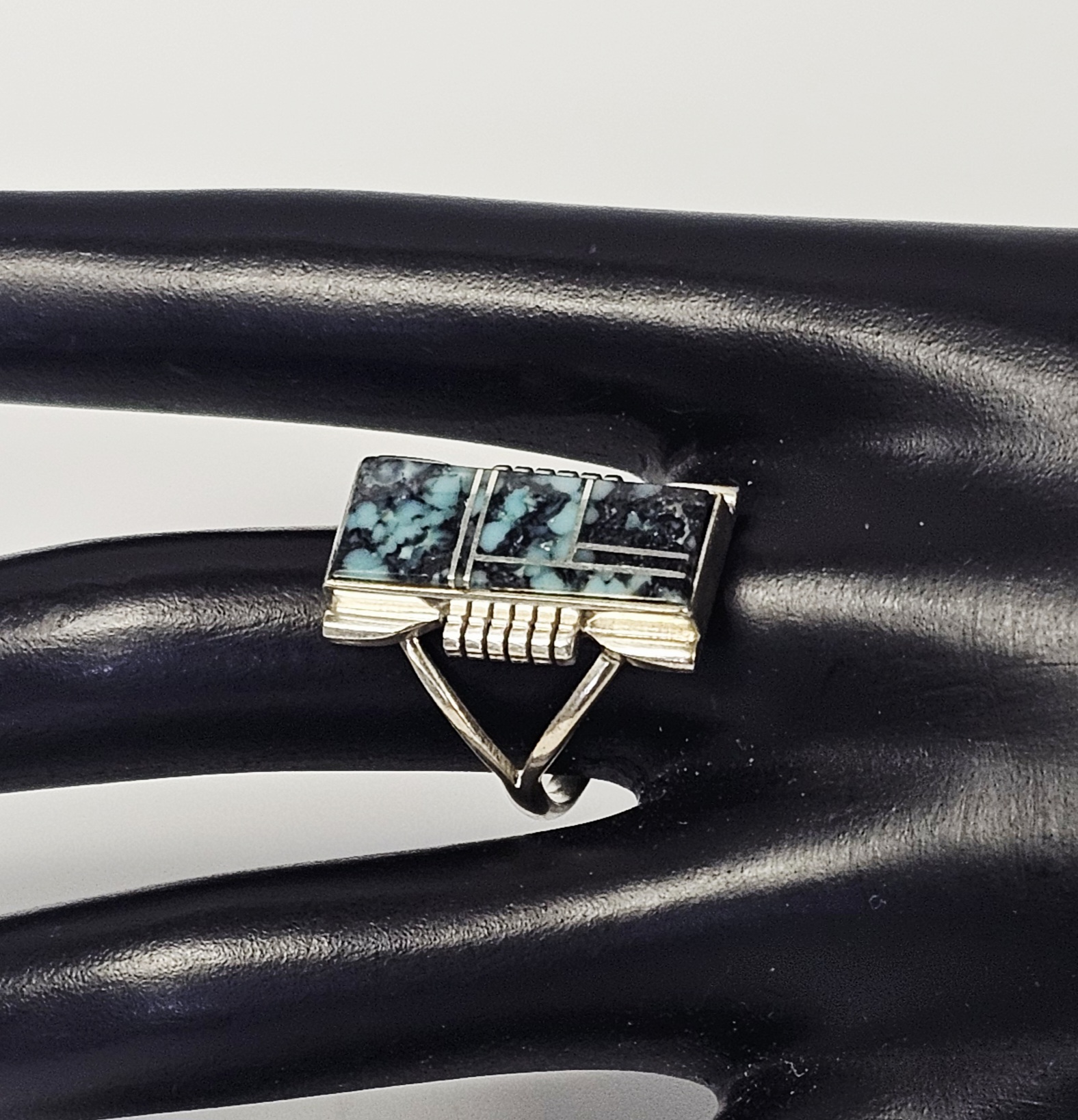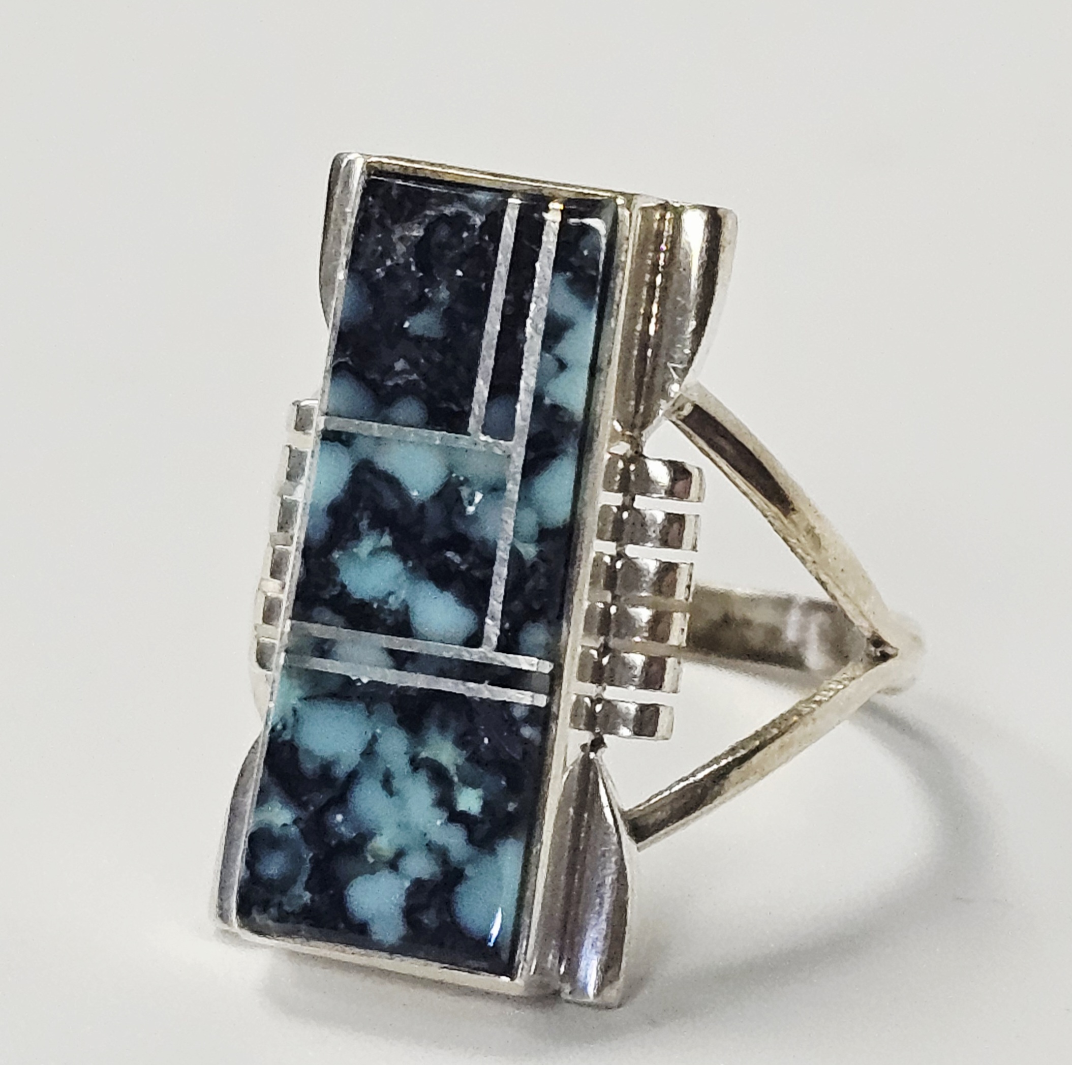 This sterling silver ring features a rectangular face with a geometric inlay of turquoise sections characterized by a dark matrix. The inlay pieces are separated by thin silver channels. The shoulders of the ring head are designed with a stepped, ribbed pattern that transitions into a split-shank band. The reverse of the ring head is stamped with the maker mark A. YAZZIE, the metal purity mark STERLING, and a copyright symbol. Weight: 5.8 grams Size: US 8.5. The item is in good vintage condition. There is light surface wear and minor tarnish commensurate with age and use. The stone inlays appear secure and intact.