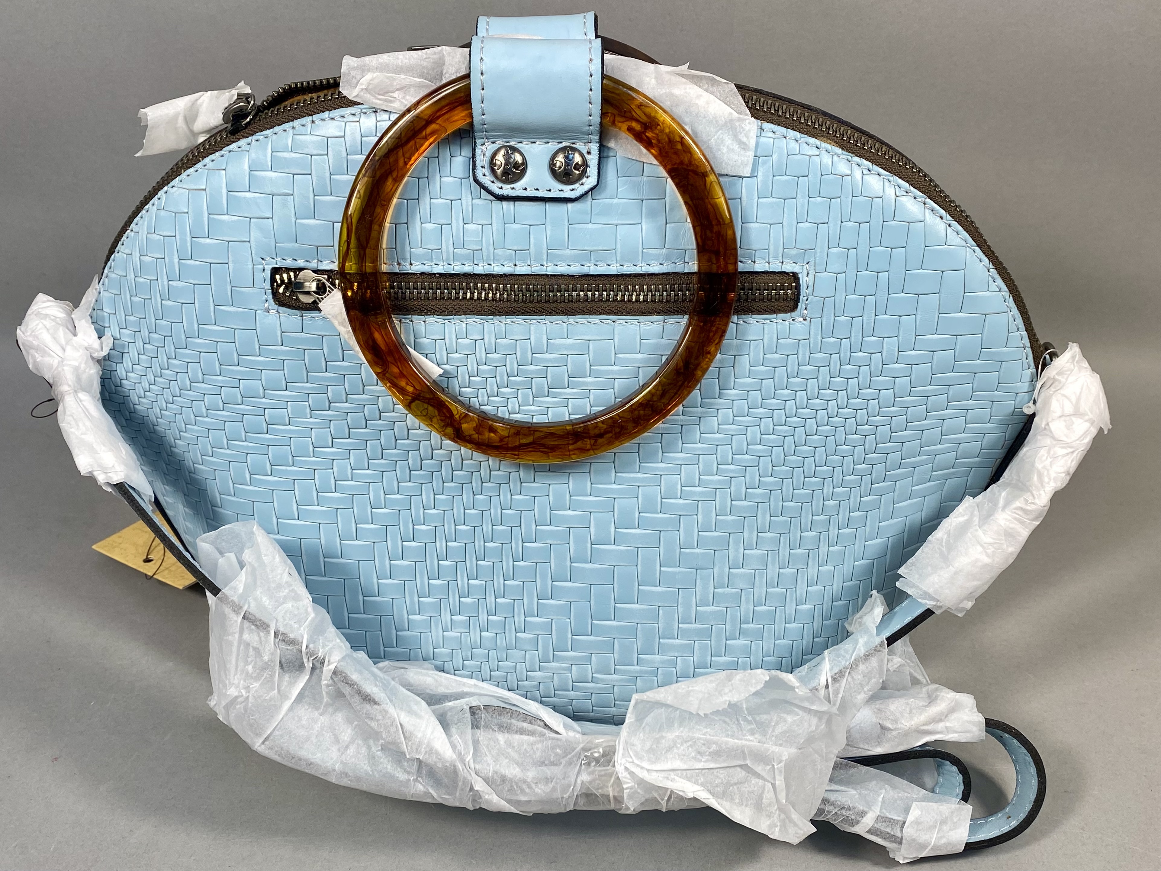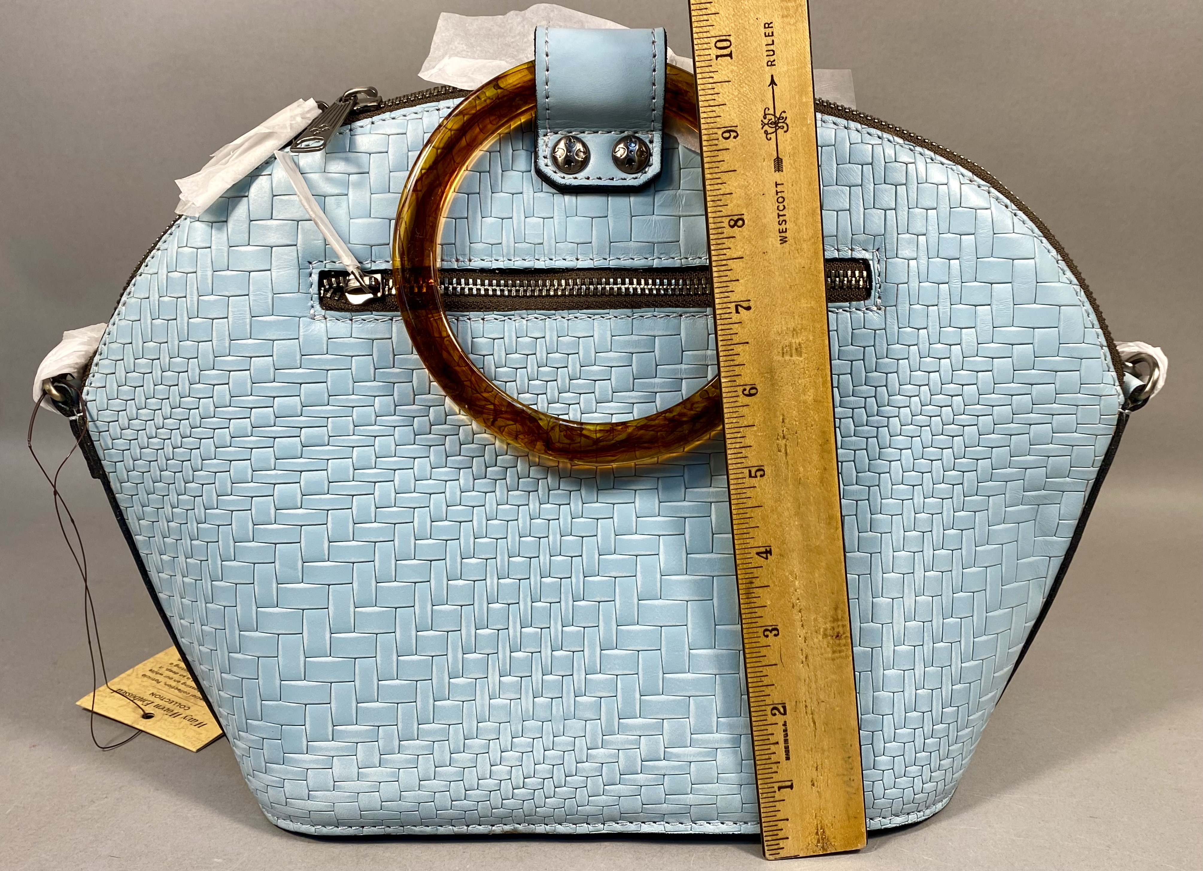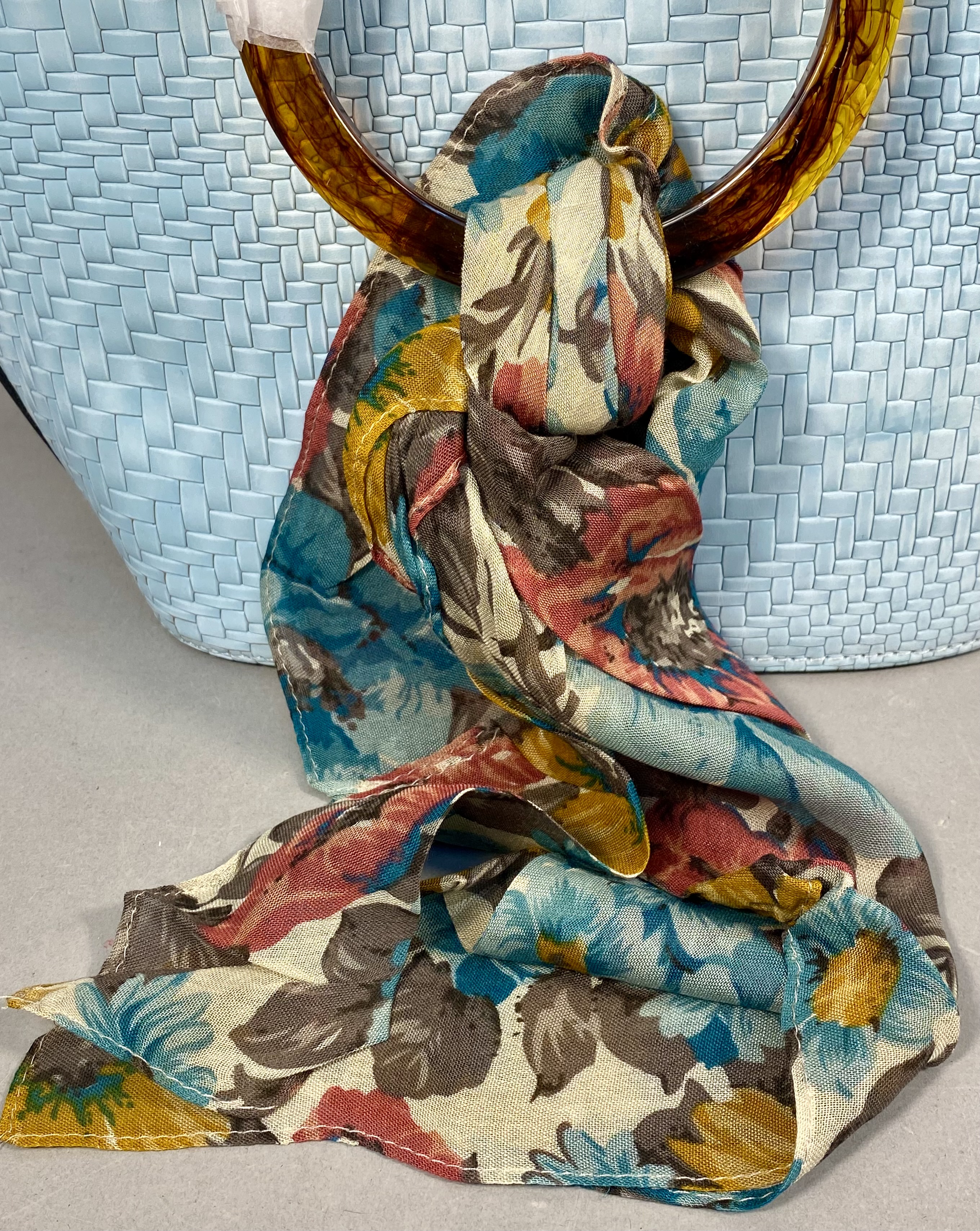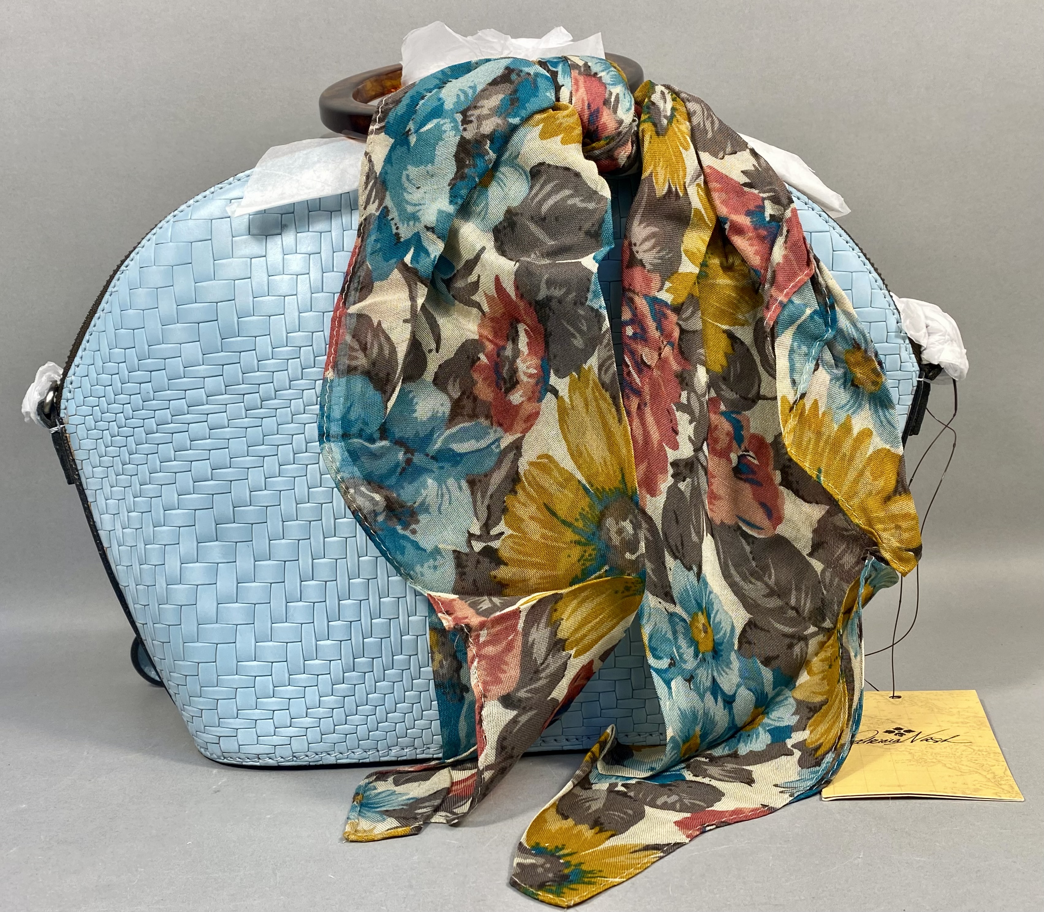 A Patricia Nash Meldola satchel crafted from leather with a Wavy Woven embossed basketweave texture in Pastel Turquoise. The handbag features circular resin top handles with a brown faux-tortoise shell finish and antiqued silver-tone hardware. The exterior includes a top zipper closure and a rear horizontal zipper pocket. The interior is lined with tan faux-suede and contains one zippered pocket and elasticized slip pockets. A coordinating lightweight fabric scarf with a multi-colored floral print in teal, ochre, rust, and brown tones is included. The lot also contains a removable crossbody strap and a branded tan non-woven dust bag. The Patricia Nash script logo and four-petaled flower icon are present on the interior leather patch, the manufacturer hangtag, and the dust bag.