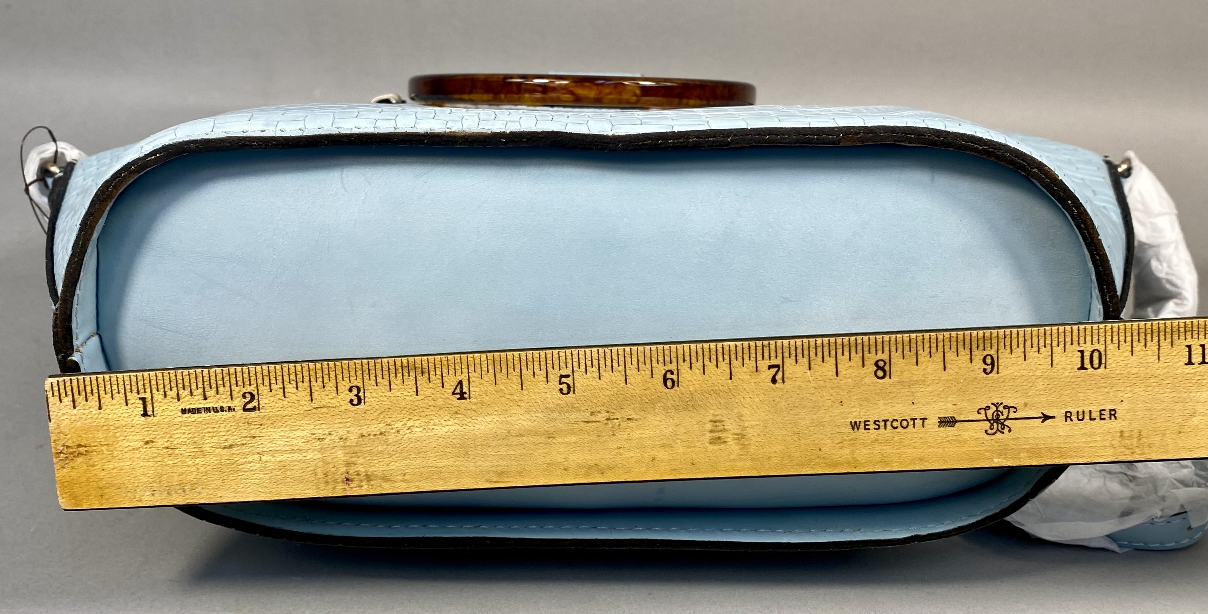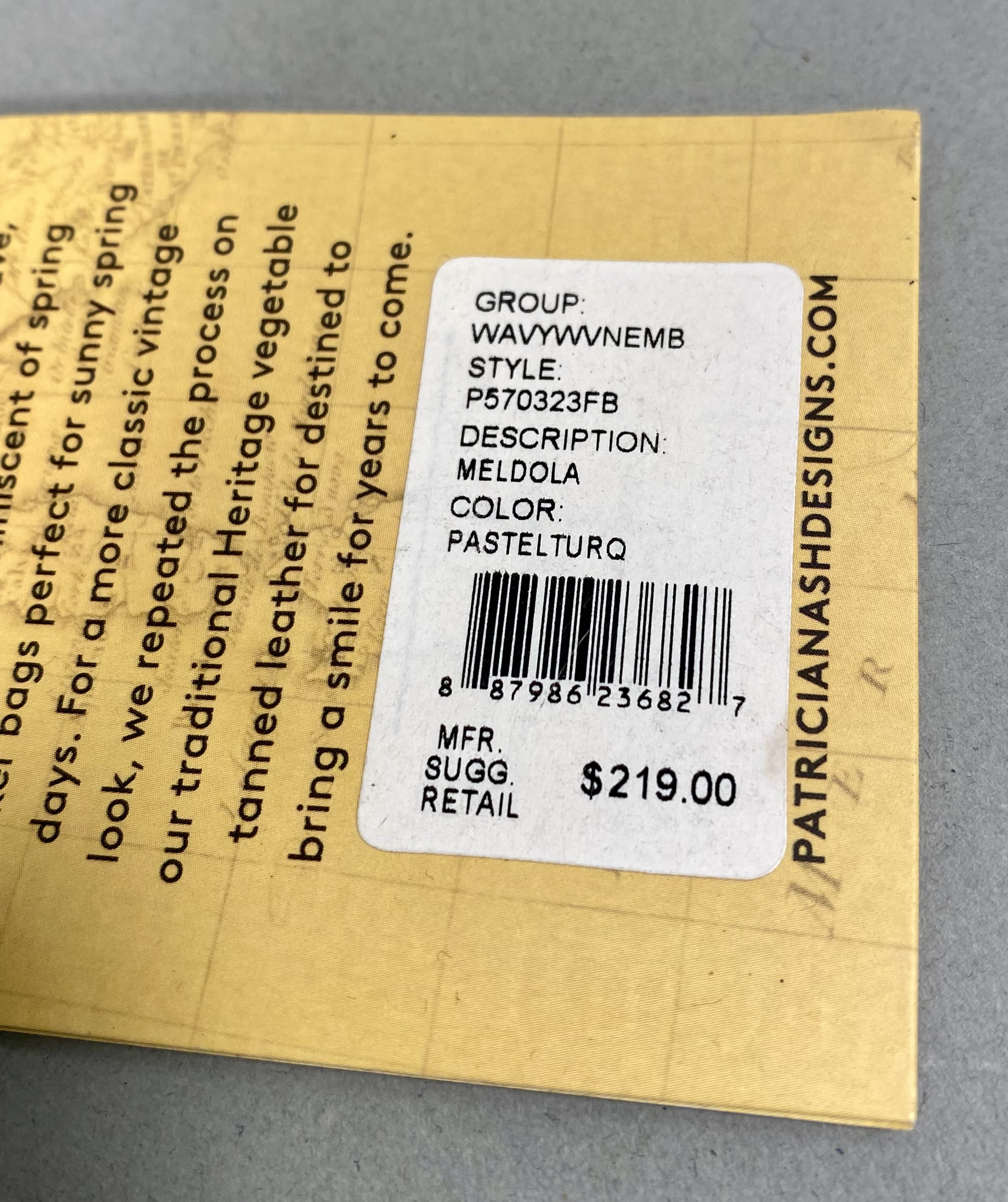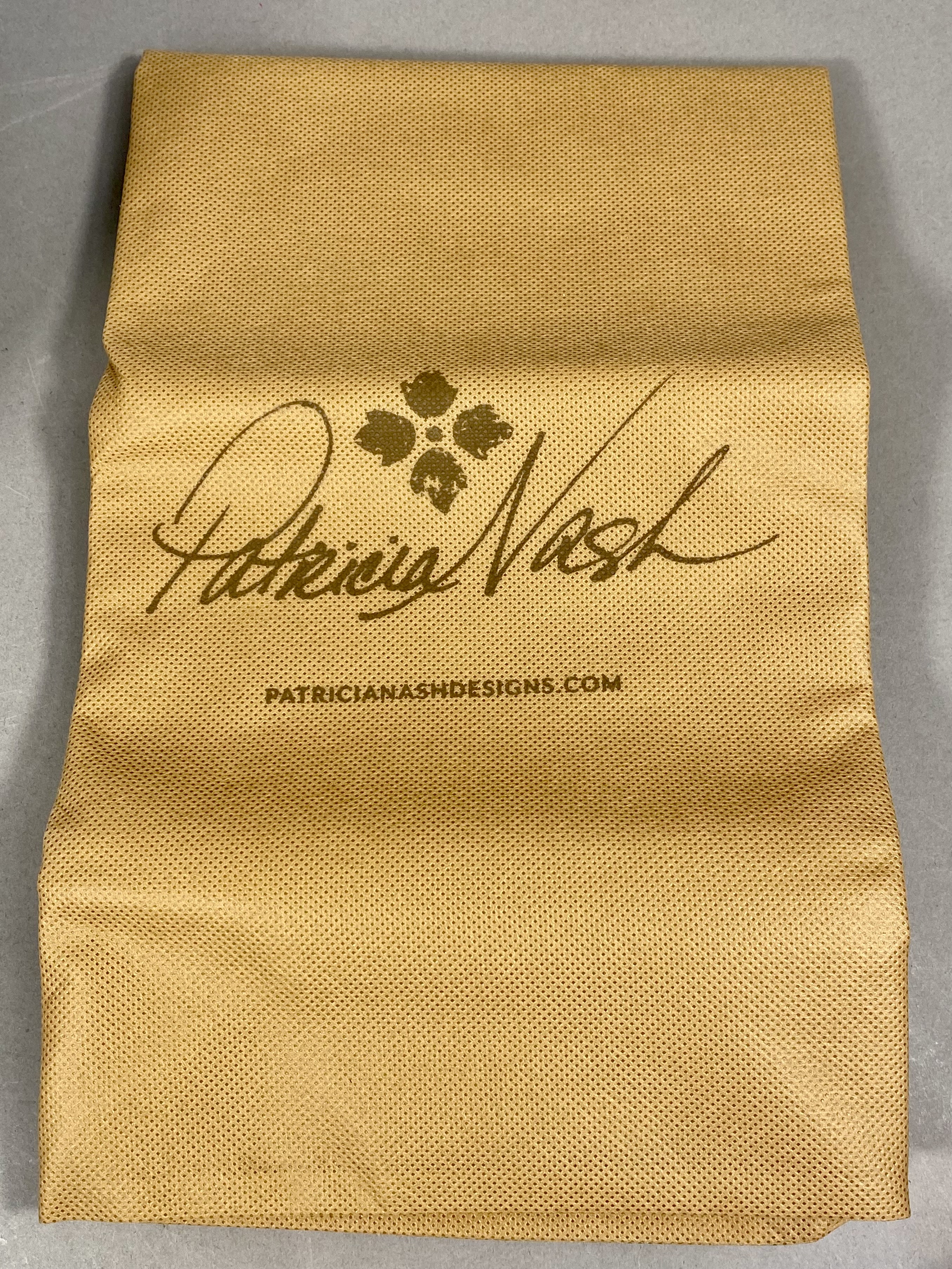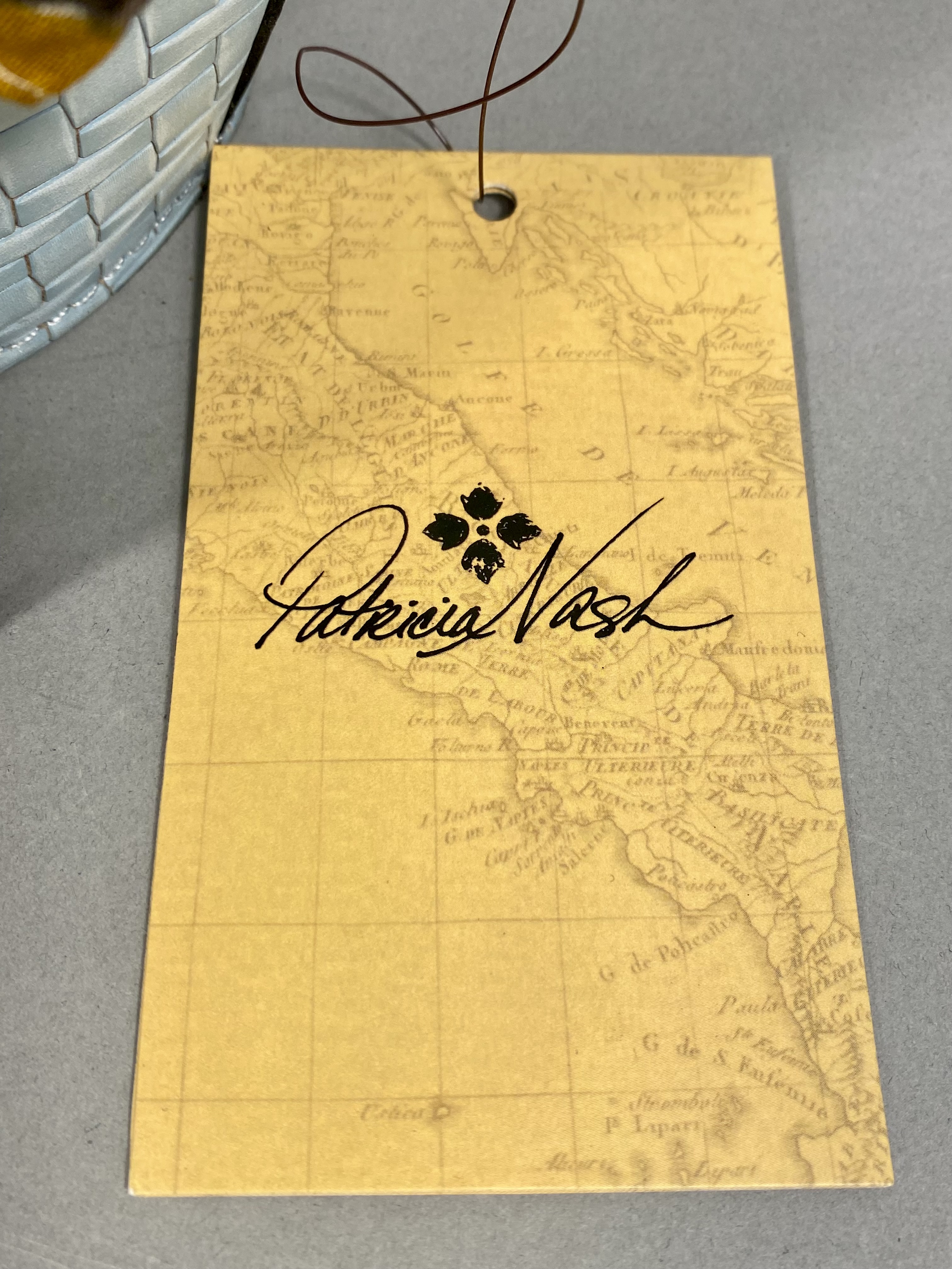 A Patricia Nash Meldola satchel crafted from leather with a Wavy Woven embossed basketweave texture in Pastel Turquoise. The handbag features circular resin top handles with a brown faux-tortoise shell finish and antiqued silver-tone hardware. The exterior includes a top zipper closure and a rear horizontal zipper pocket. The interior is lined with tan faux-suede and contains one zippered pocket and elasticized slip pockets. A coordinating lightweight fabric scarf with a multi-colored floral print in teal, ochre, rust, and brown tones is included. The lot also contains a removable crossbody strap and a branded tan non-woven dust bag. The Patricia Nash script logo and four-petaled flower icon are present on the interior leather patch, the manufacturer hangtag, and the dust bag.