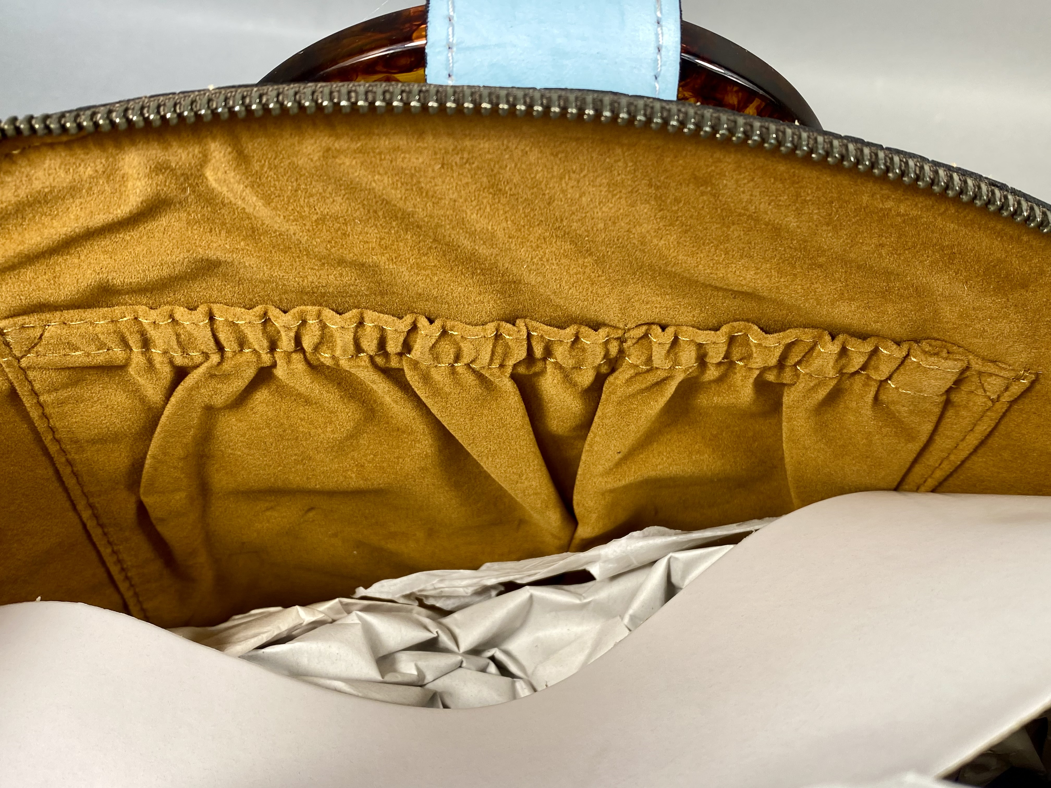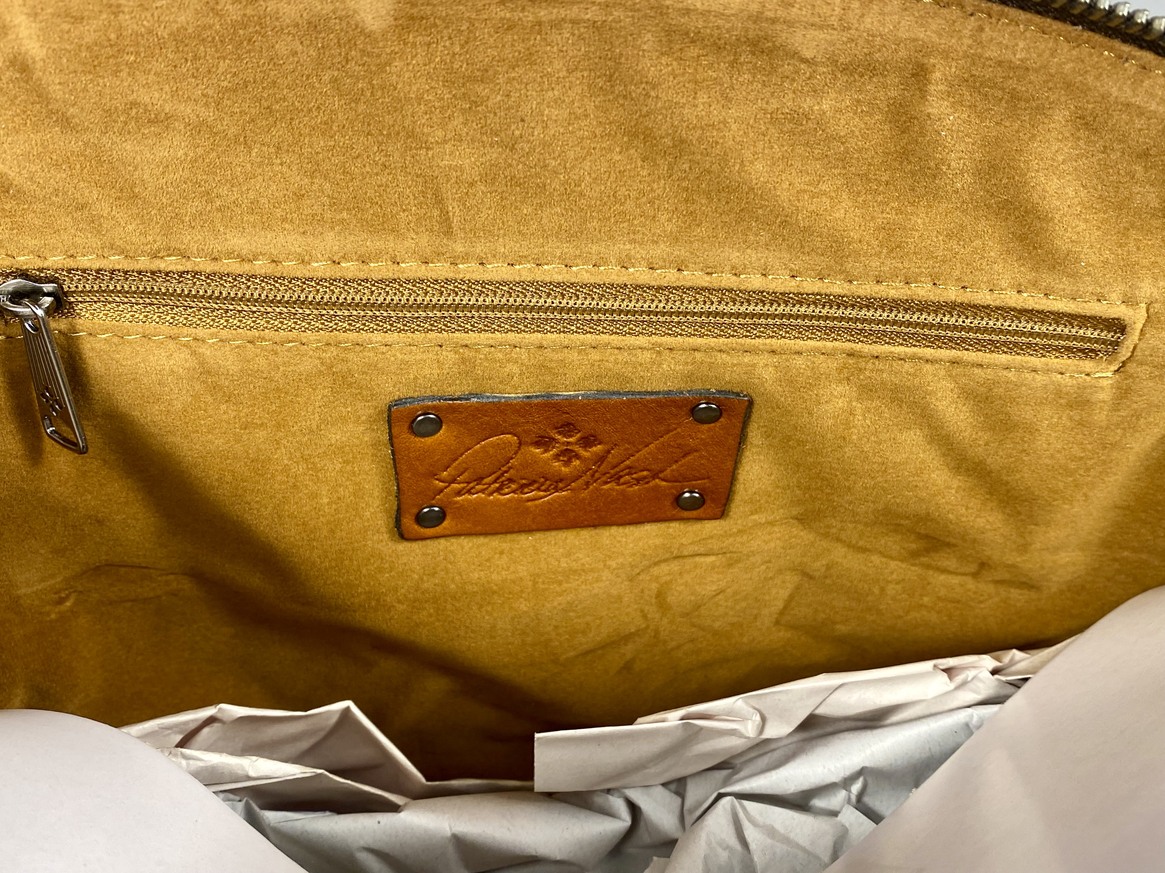 New With Tags (NWT). The item retains its original manufacturer hangtag. Protective paper packaging is present on the zipper pulls and the removable strap. No signs of use, wear, or damage are observed.
