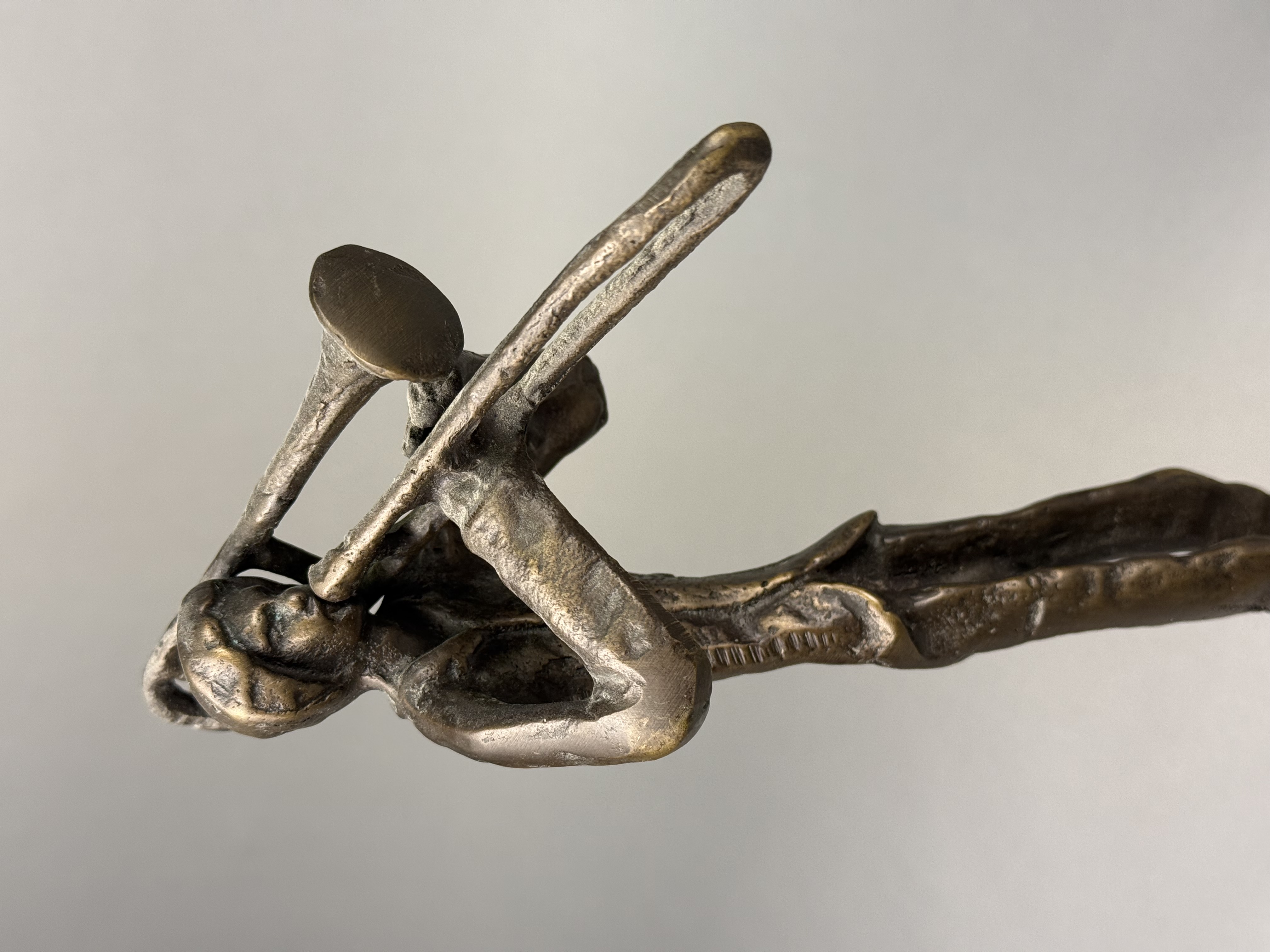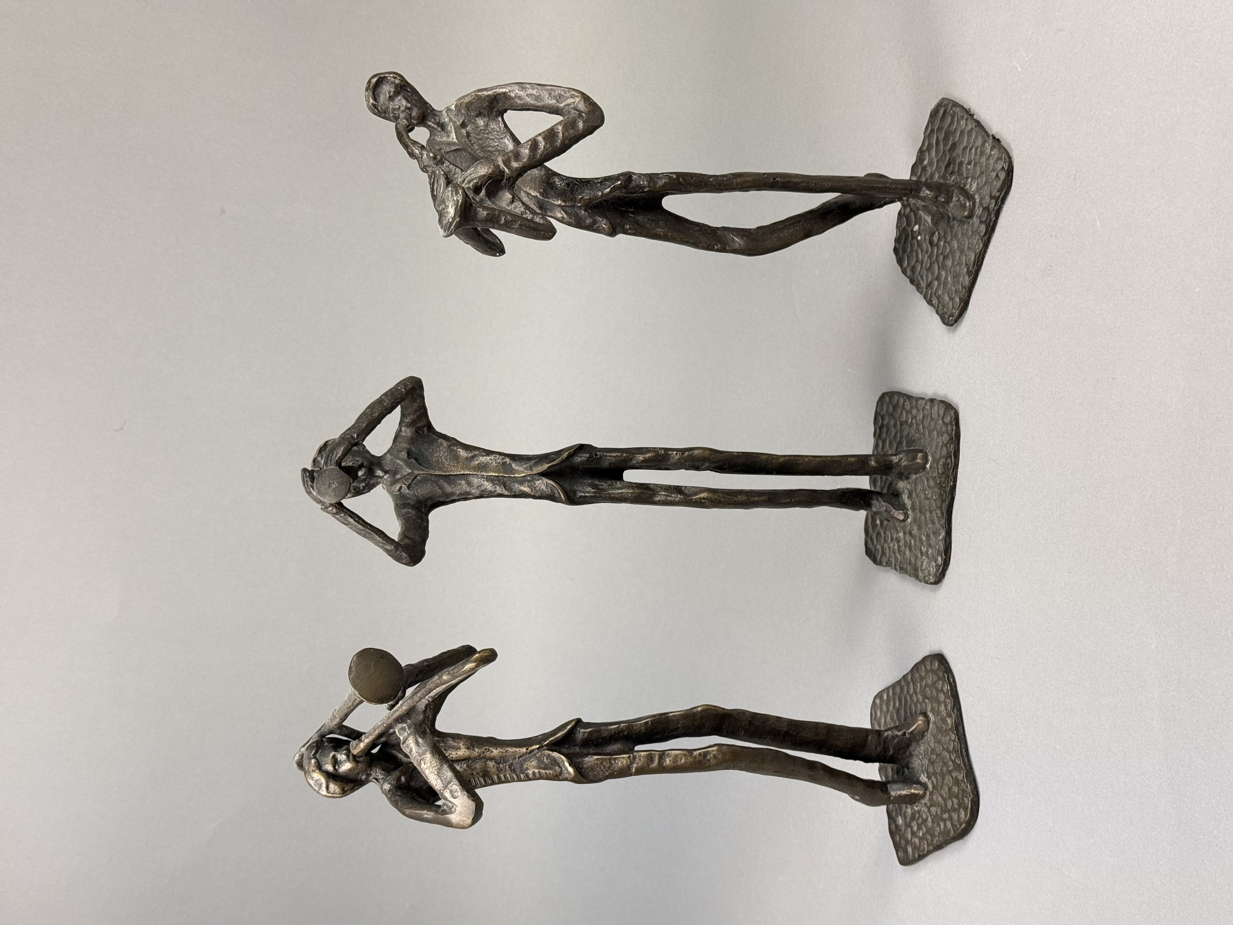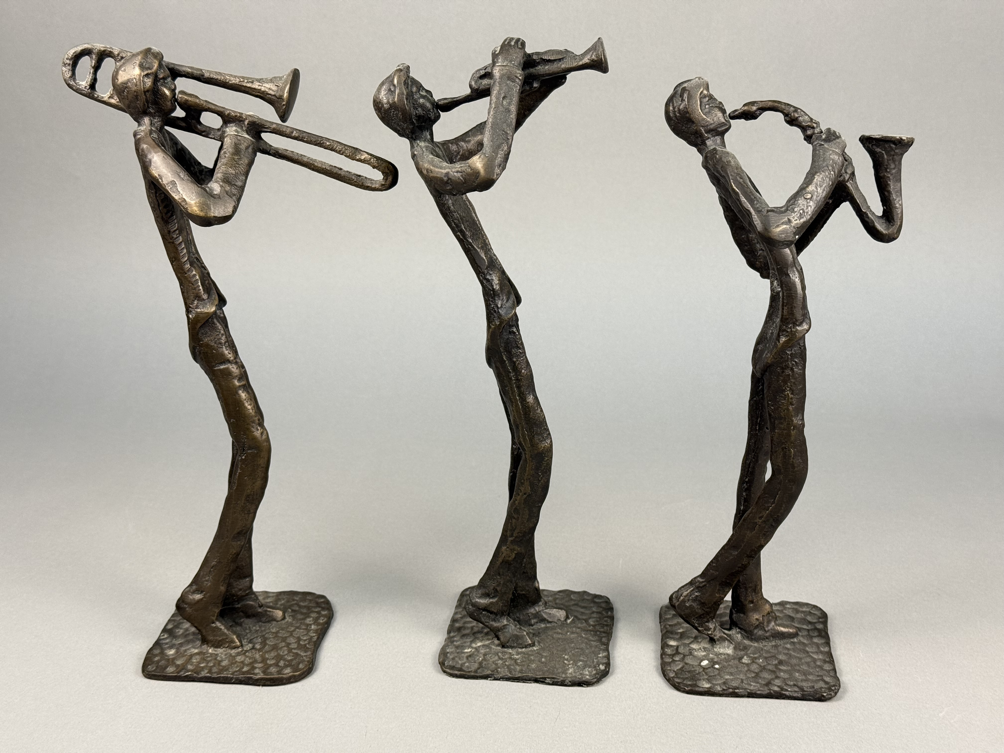 This trio of cast bronze sculptures depicts three jazz musicians, specifically a trombonist, a trumpeter, and a saxophonist. The figures are rendered in a mid-century modern aesthetic, featuring elongated, stylized forms with slender limbs and lean silhouettes. Each piece is constructed from cast bronze with a dark brown patina, accented by lighter golden-toned highlights on the raised and textured surfaces. The sculptures are mounted on integral, thin, square bases that exhibit a hammered or dimpled texture. No signatures, foundry marks, or other identifying symbols are visible on the bodies or the bases of the items. Approximately 11.5 to 12 inches height The sculptures are in good condition with no visible cracks, chips, or signs of repair. The patina is well-preserved with minimal surface wear consistent with age.