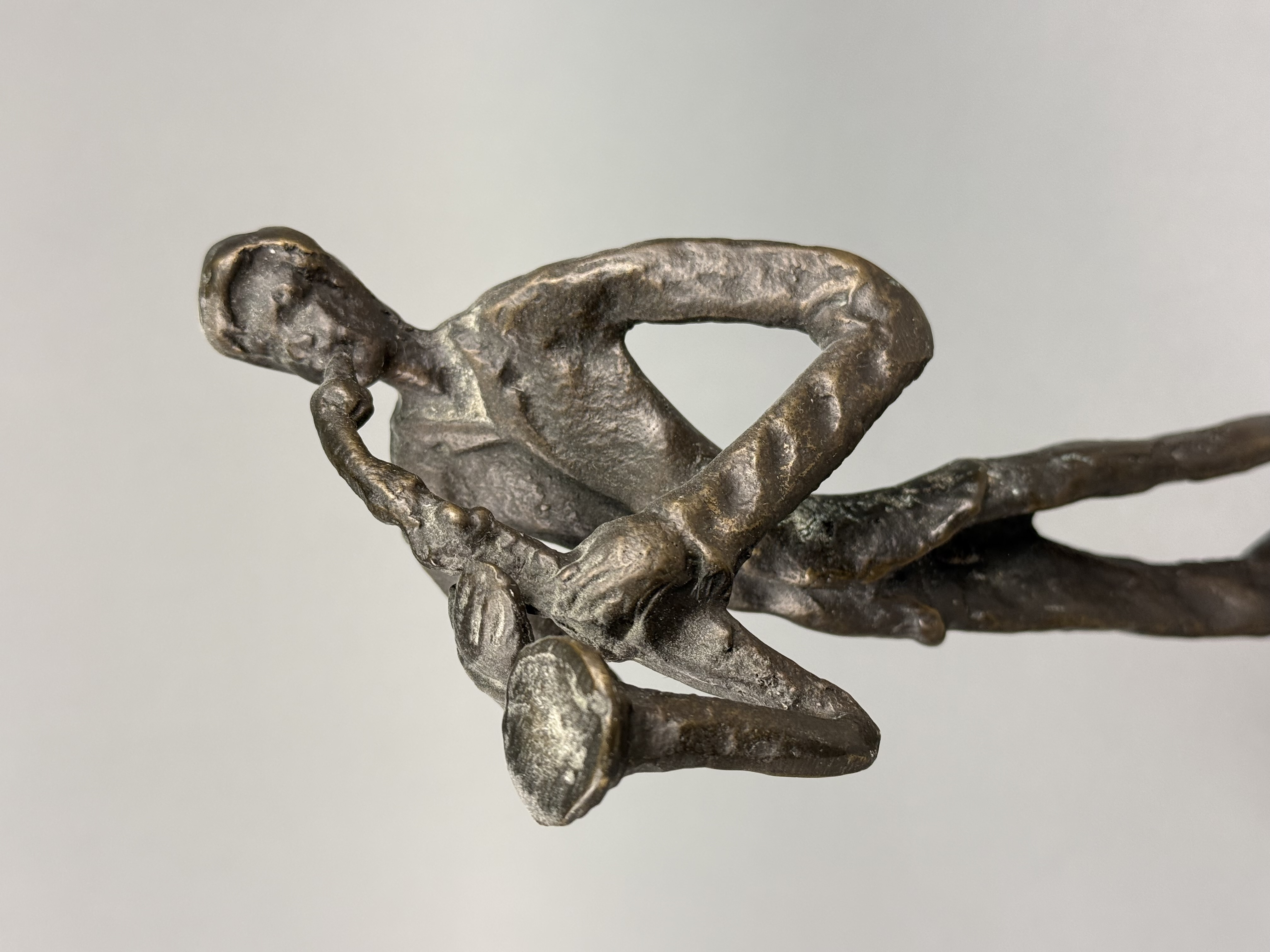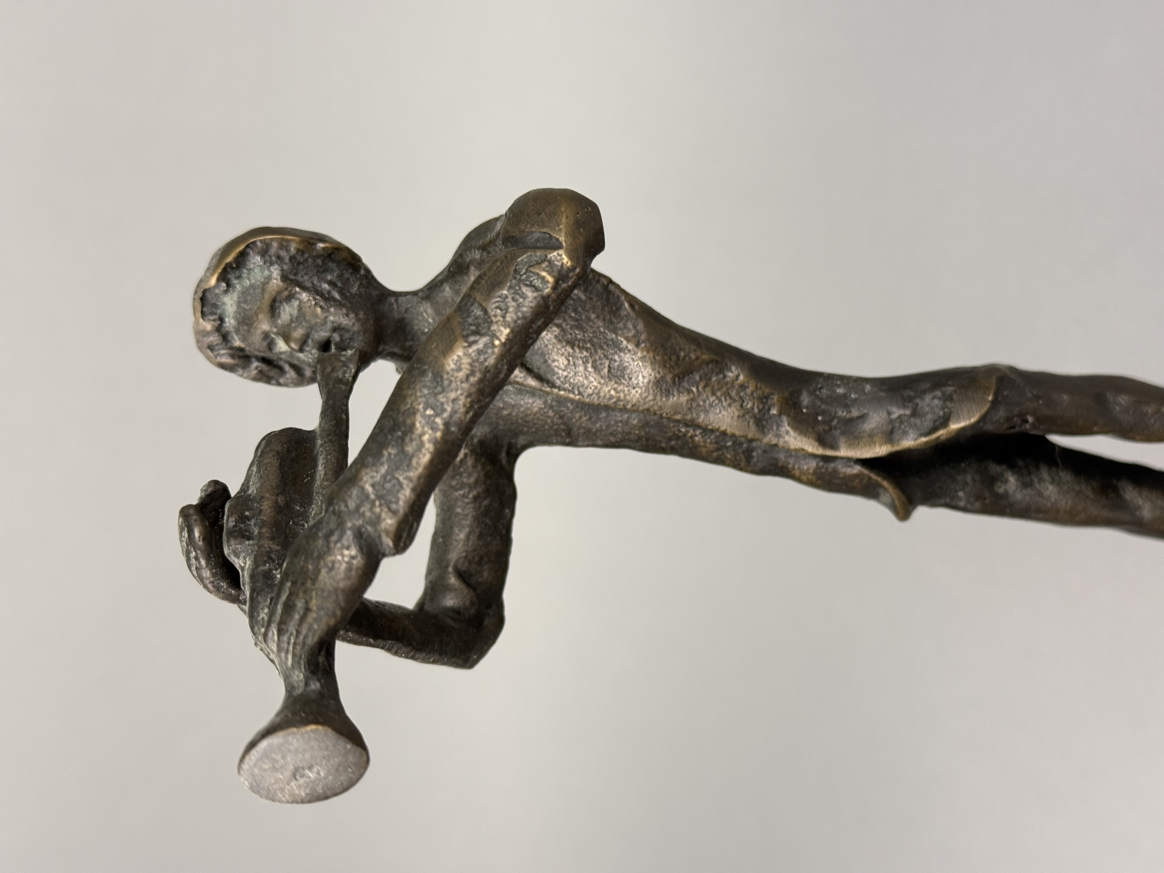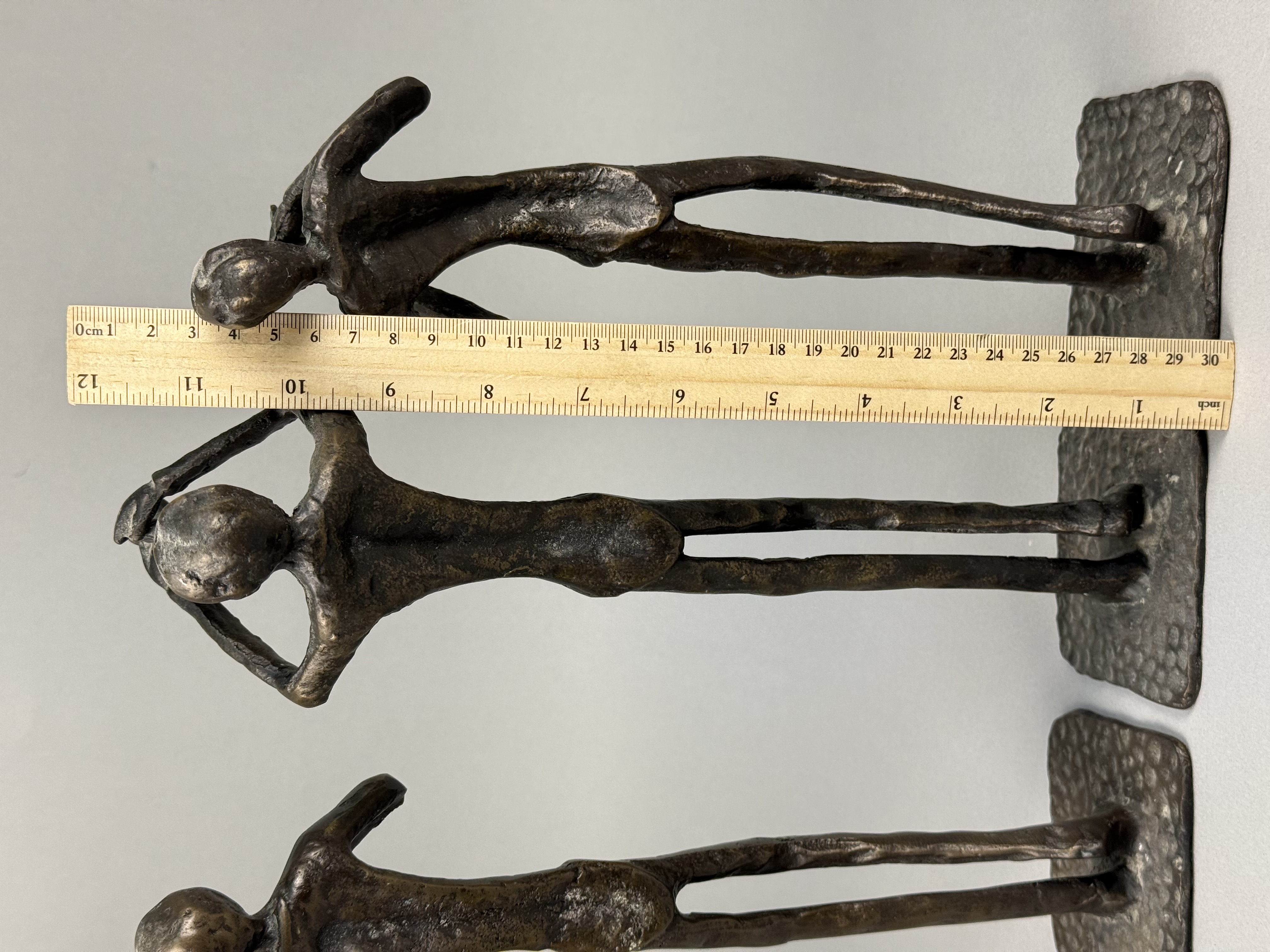 This trio of cast bronze sculptures depicts three jazz musicians, specifically a trombonist, a trumpeter, and a saxophonist. The figures are rendered in a mid-century modern aesthetic, featuring elongated, stylized forms with slender limbs and lean silhouettes. Each piece is constructed from cast bronze with a dark brown patina, accented by lighter golden-toned highlights on the raised and textured surfaces. The sculptures are mounted on integral, thin, square bases that exhibit a hammered or dimpled texture. No signatures, foundry marks, or other identifying symbols are visible on the bodies or the bases of the items. Approximately 11.5 to 12 inches height The sculptures are in good condition with no visible cracks, chips, or signs of repair. The patina is well-preserved with minimal surface wear consistent with age.