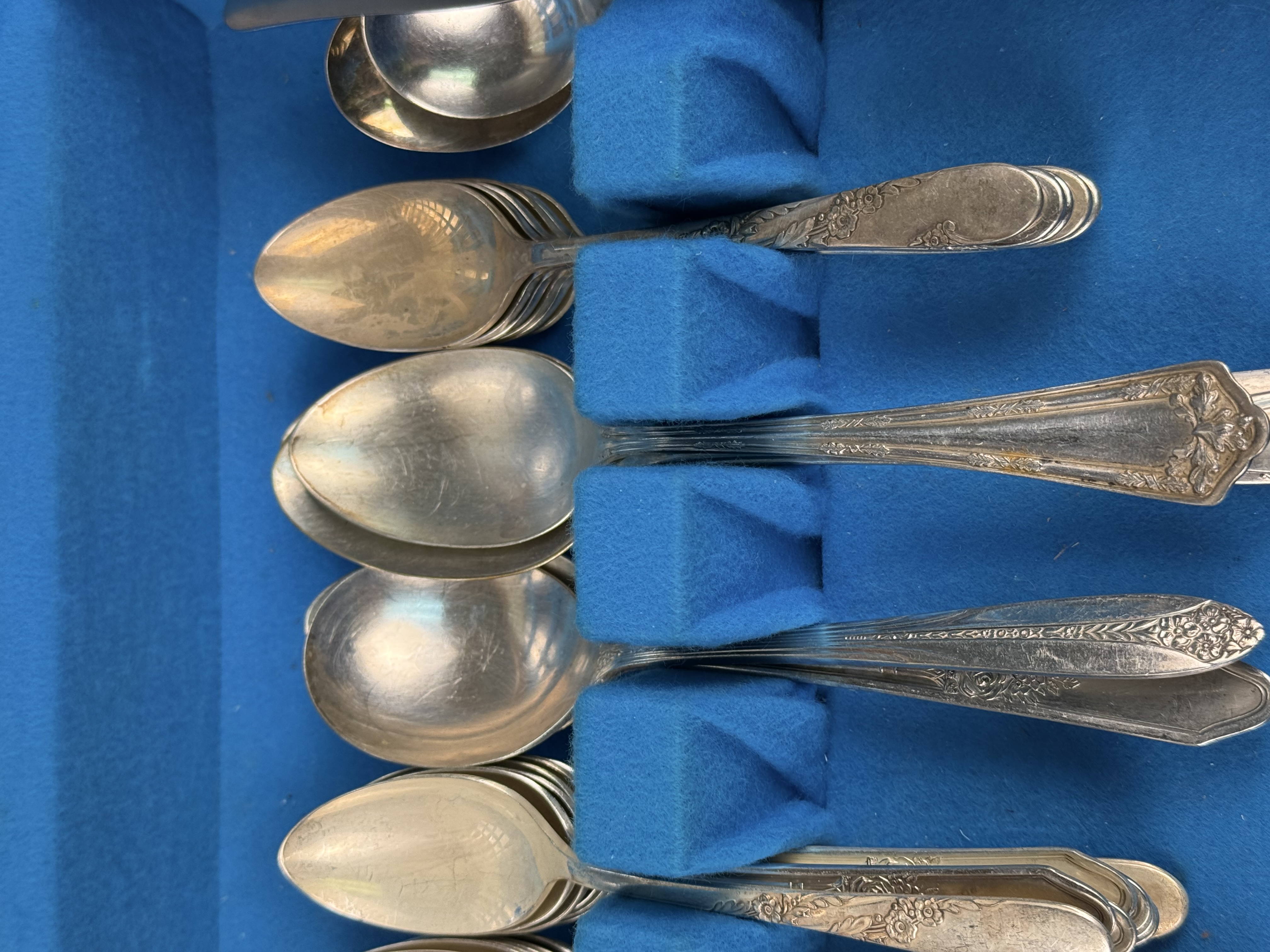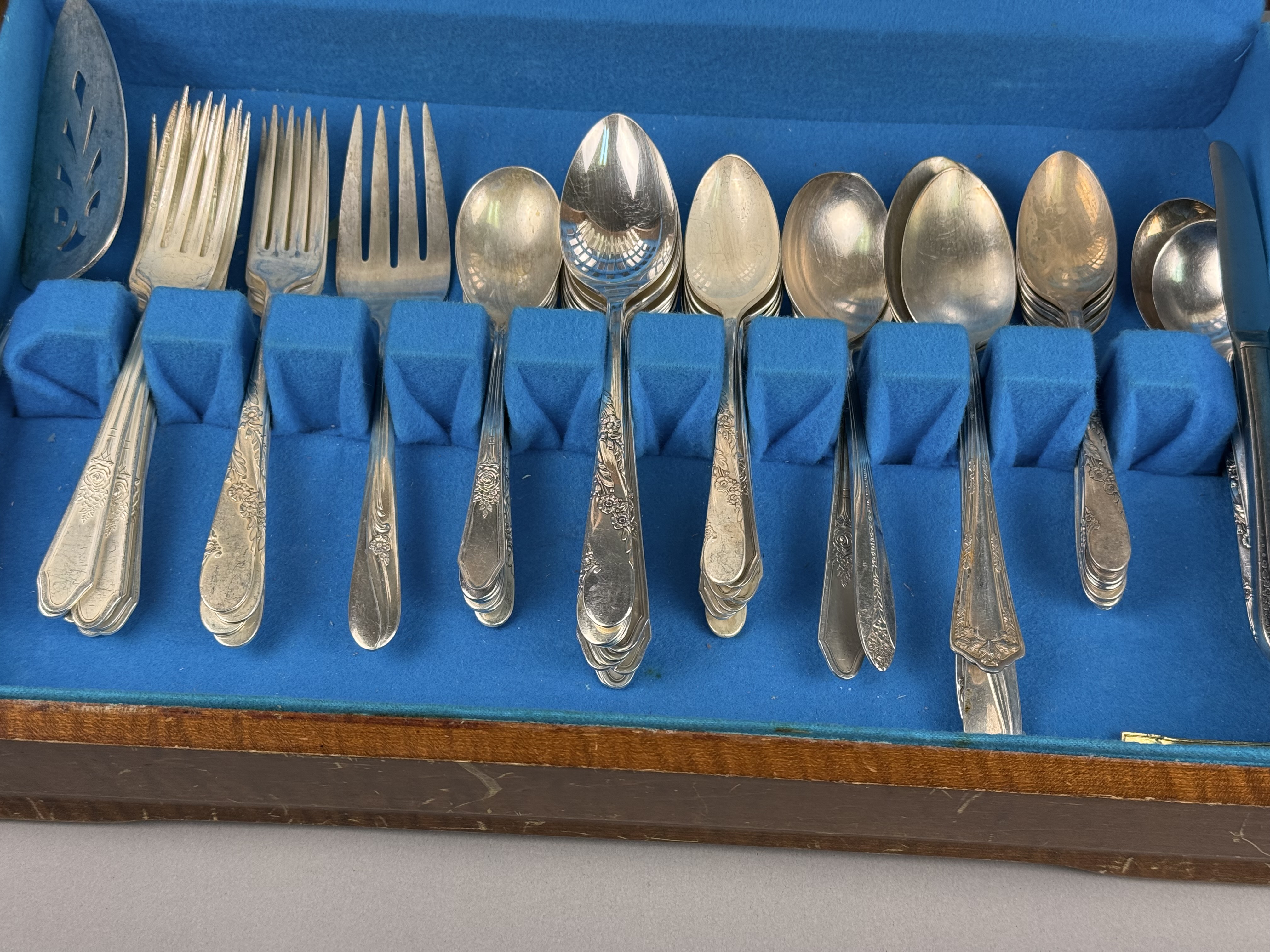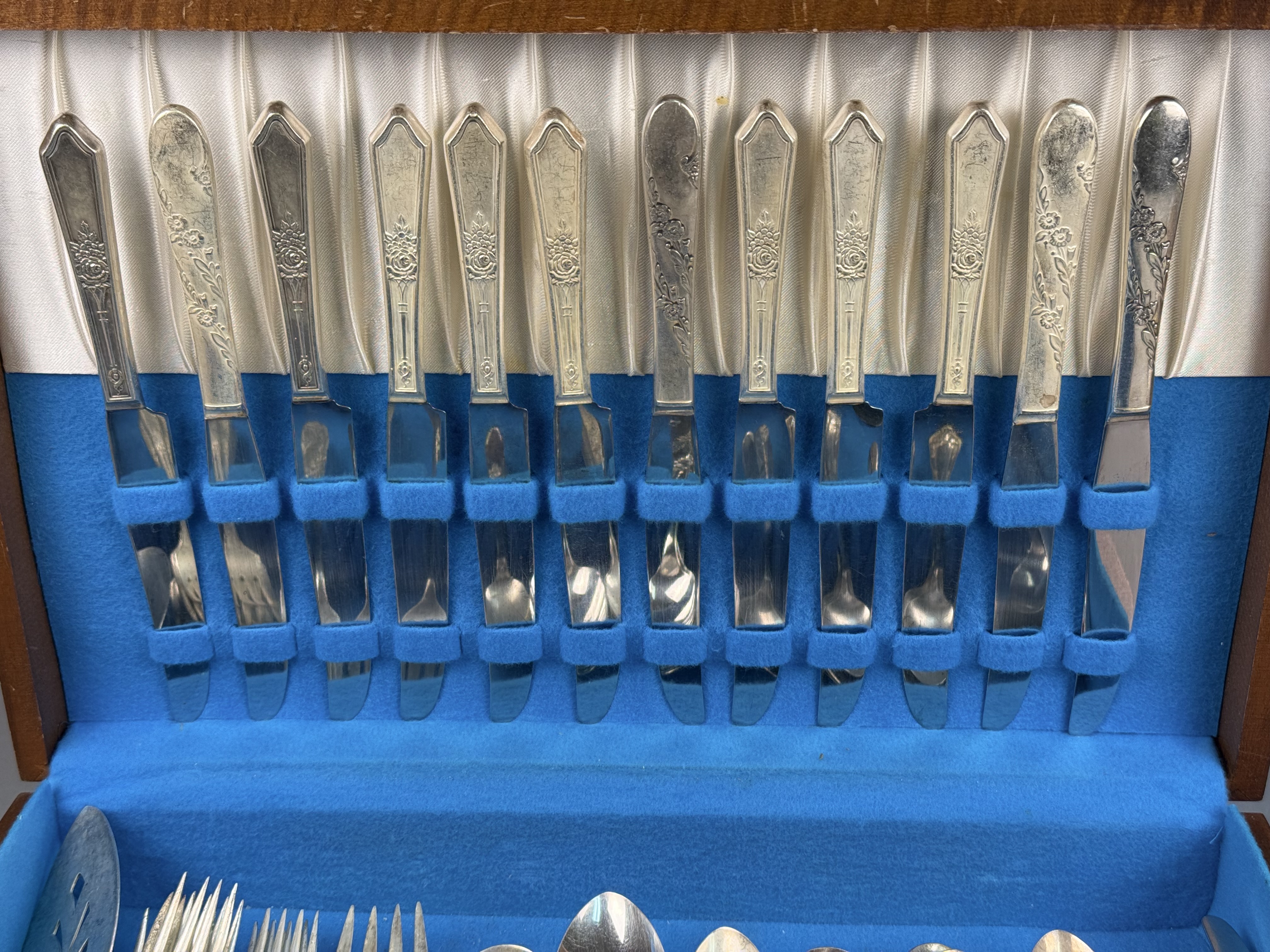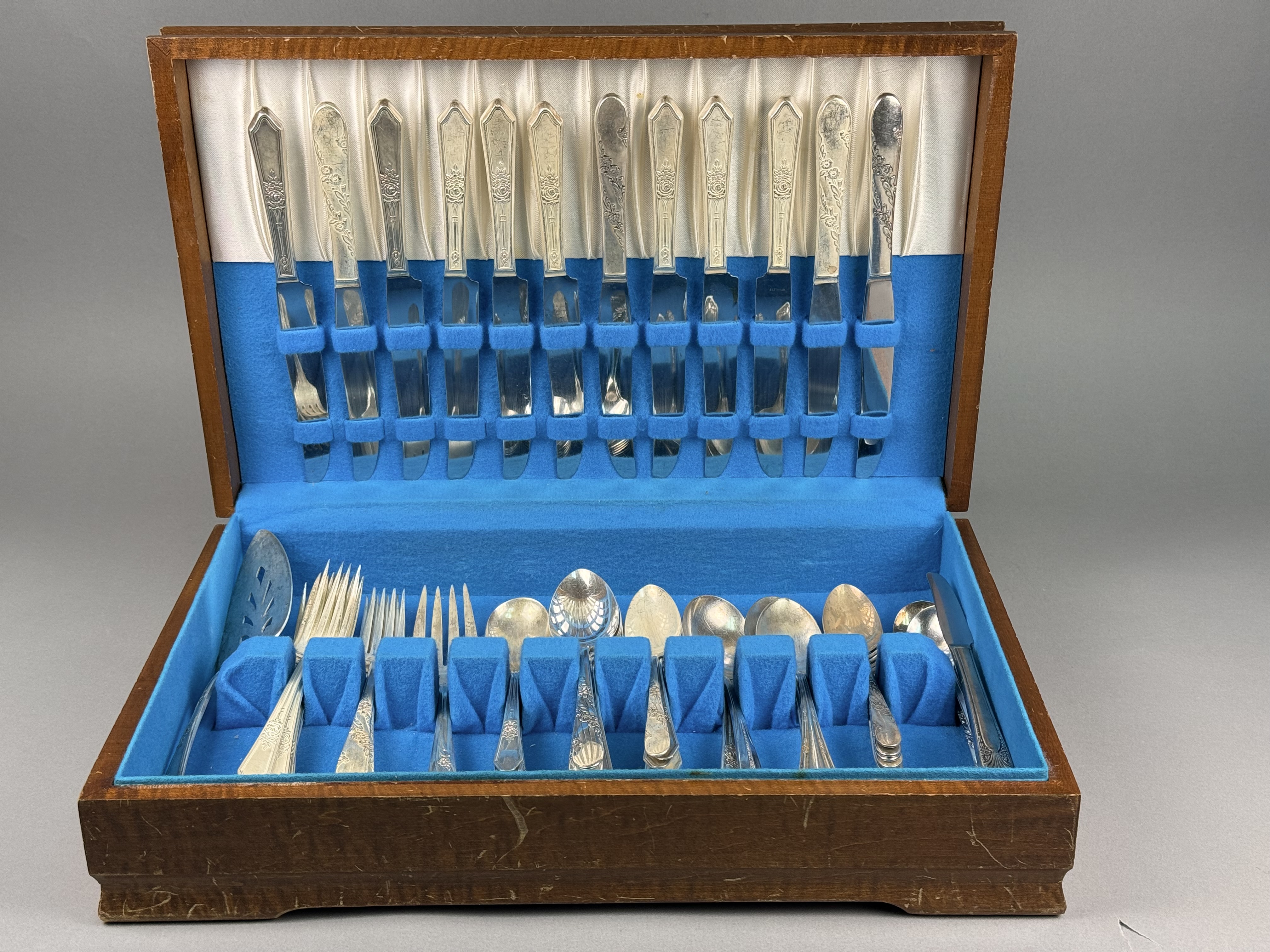 This is an assembled harlequin service of silver plate flatware featuring pieces from multiple manufacturers. Visible maker marks include Tudor Plate Oneida Community, R & B A1, H & T Mfg. Co., New England Silver Plate A1, and National Double Tested Silverplate. The collection includes several distinct patterns, notably the Evening Star floral motif by Tudor Plate, as well as Art Deco-influenced geometric and scrollwork designs. The service is configured for approximately 12 place settings and includes dinner knives, dinner forks, salad forks, teaspoons, soup spoons, and a pierced serving piece. The items are contained within a wooden storage chest featuring a blue felt and white satin-lined interior. No monograms are present. Wooden chest: 16.5 inches x 11 inches x 3.25 inches The flatware exhibits moderate to heavy tarnishing throughout. The wooden storage chest shows significant surface wear, including deep scratches, scuffs, and extensive areas of finish loss on the exterior. The interior lining shows light soiling.