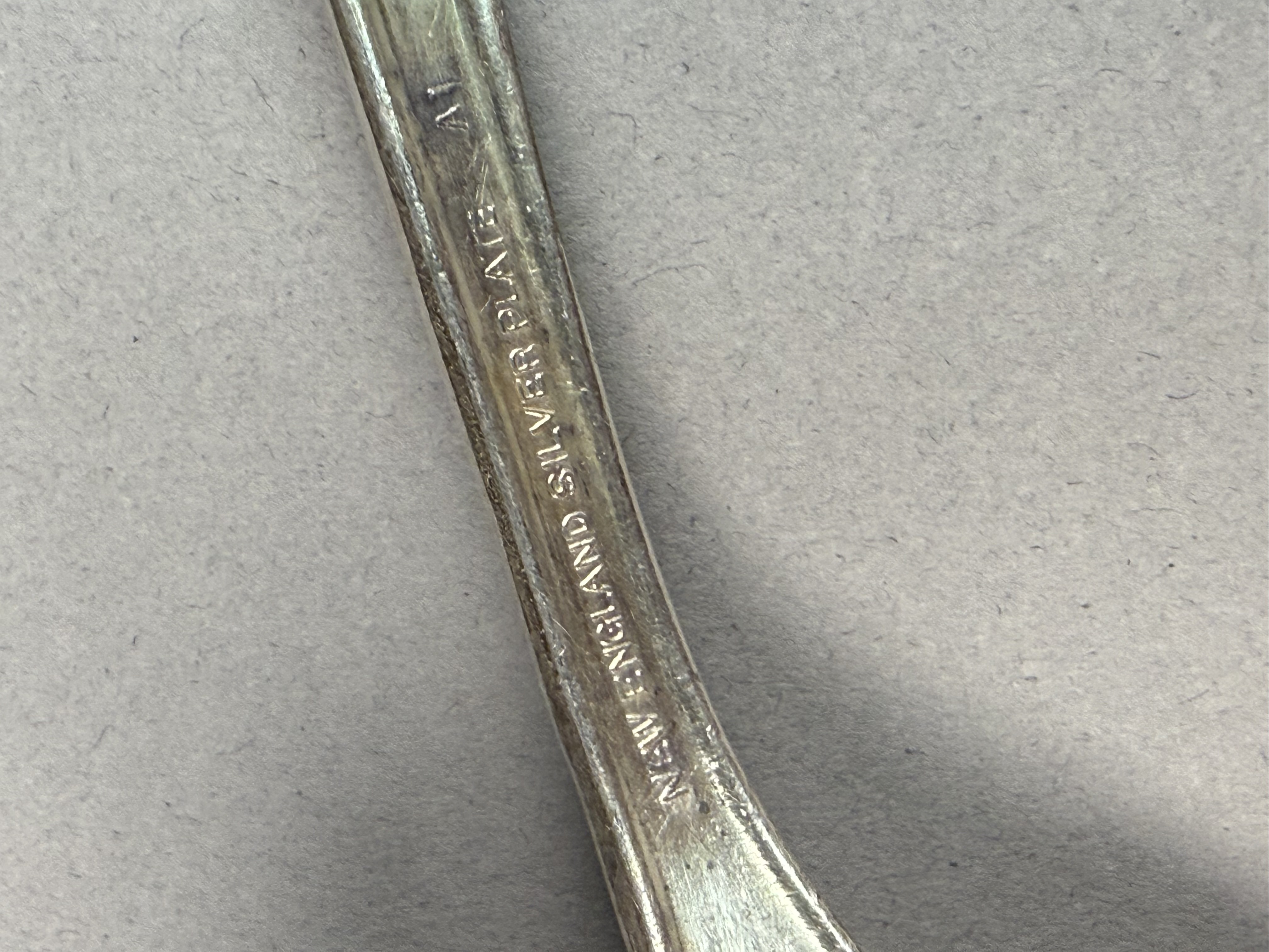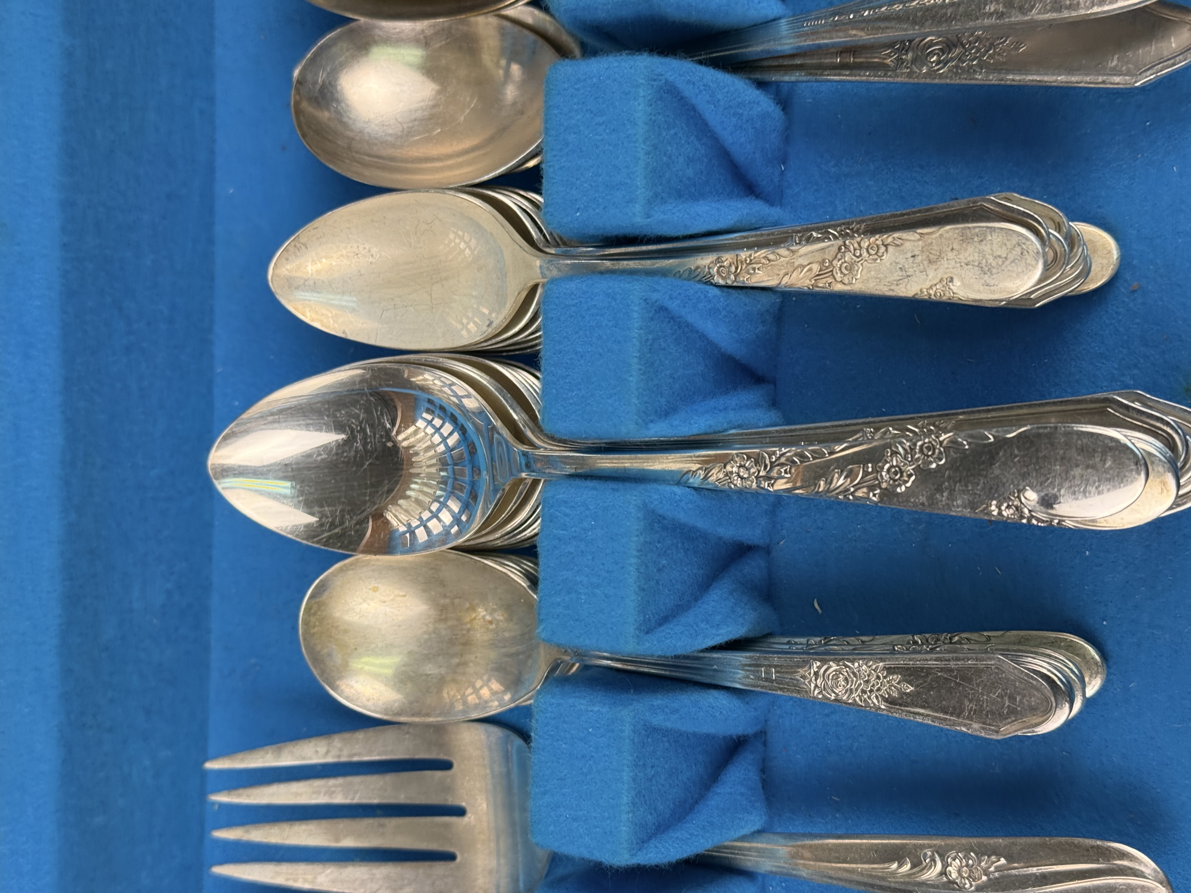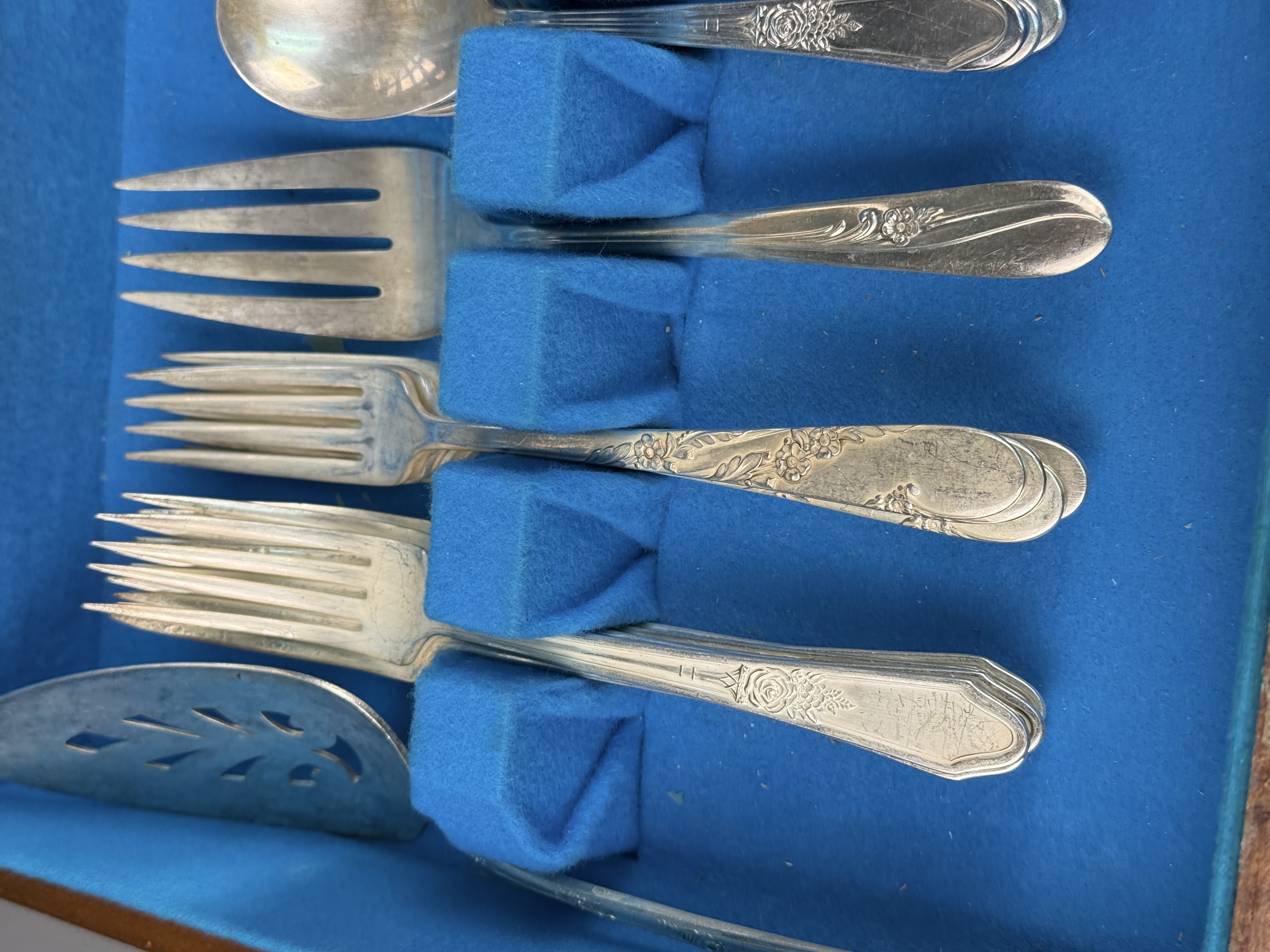 This is an assembled harlequin service of silver plate flatware featuring pieces from multiple manufacturers. Visible maker marks include Tudor Plate Oneida Community, R & B A1, H & T Mfg. Co., New England Silver Plate A1, and National Double Tested Silverplate. The collection includes several distinct patterns, notably the Evening Star floral motif by Tudor Plate, as well as Art Deco-influenced geometric and scrollwork designs. The service is configured for approximately 12 place settings and includes dinner knives, dinner forks, salad forks, teaspoons, soup spoons, and a pierced serving piece. The items are contained within a wooden storage chest featuring a blue felt and white satin-lined interior. No monograms are present. Wooden chest: 16.5 inches x 11 inches x 3.25 inches The flatware exhibits moderate to heavy tarnishing throughout. The wooden storage chest shows significant surface wear, including deep scratches, scuffs, and extensive areas of finish loss on the exterior. The interior lining shows light soiling.