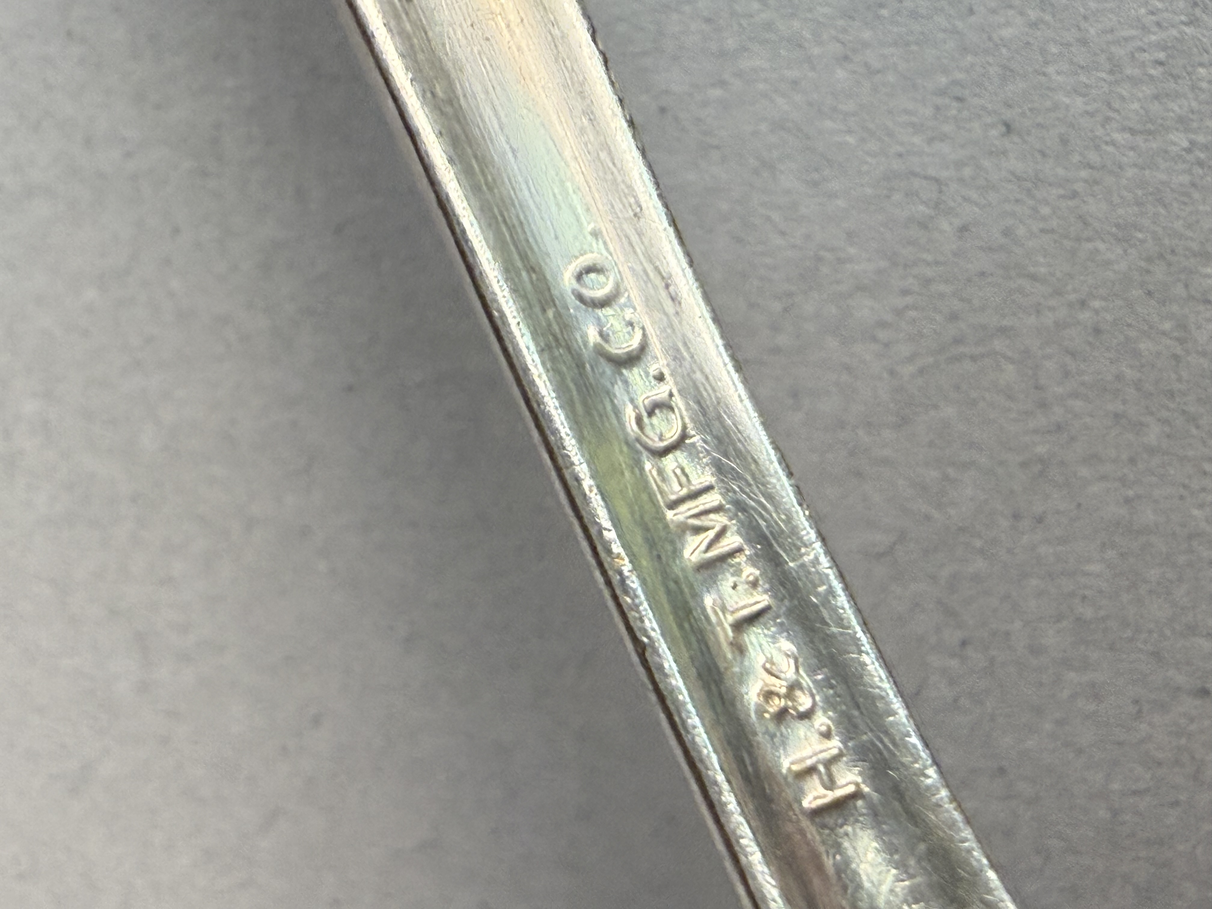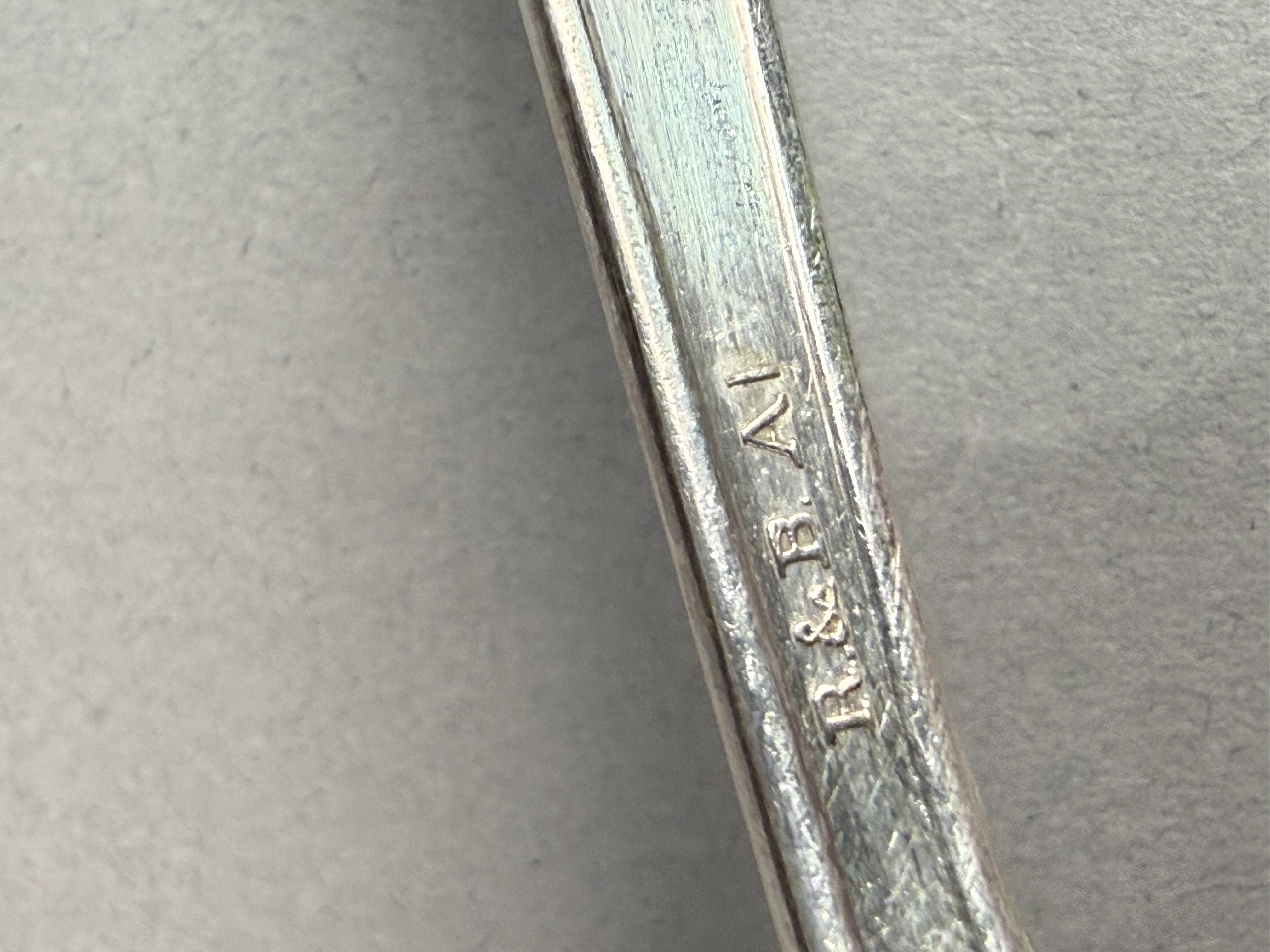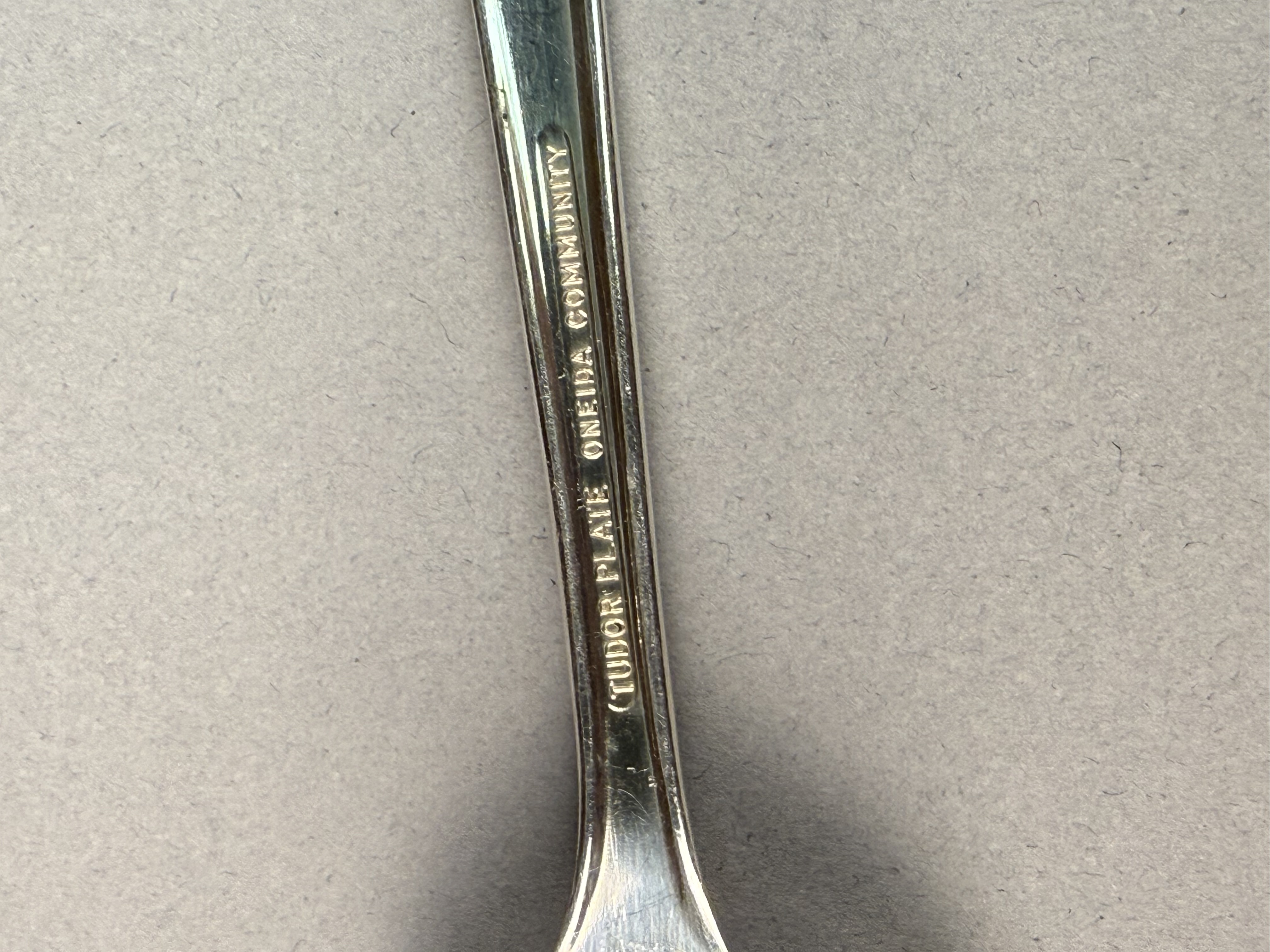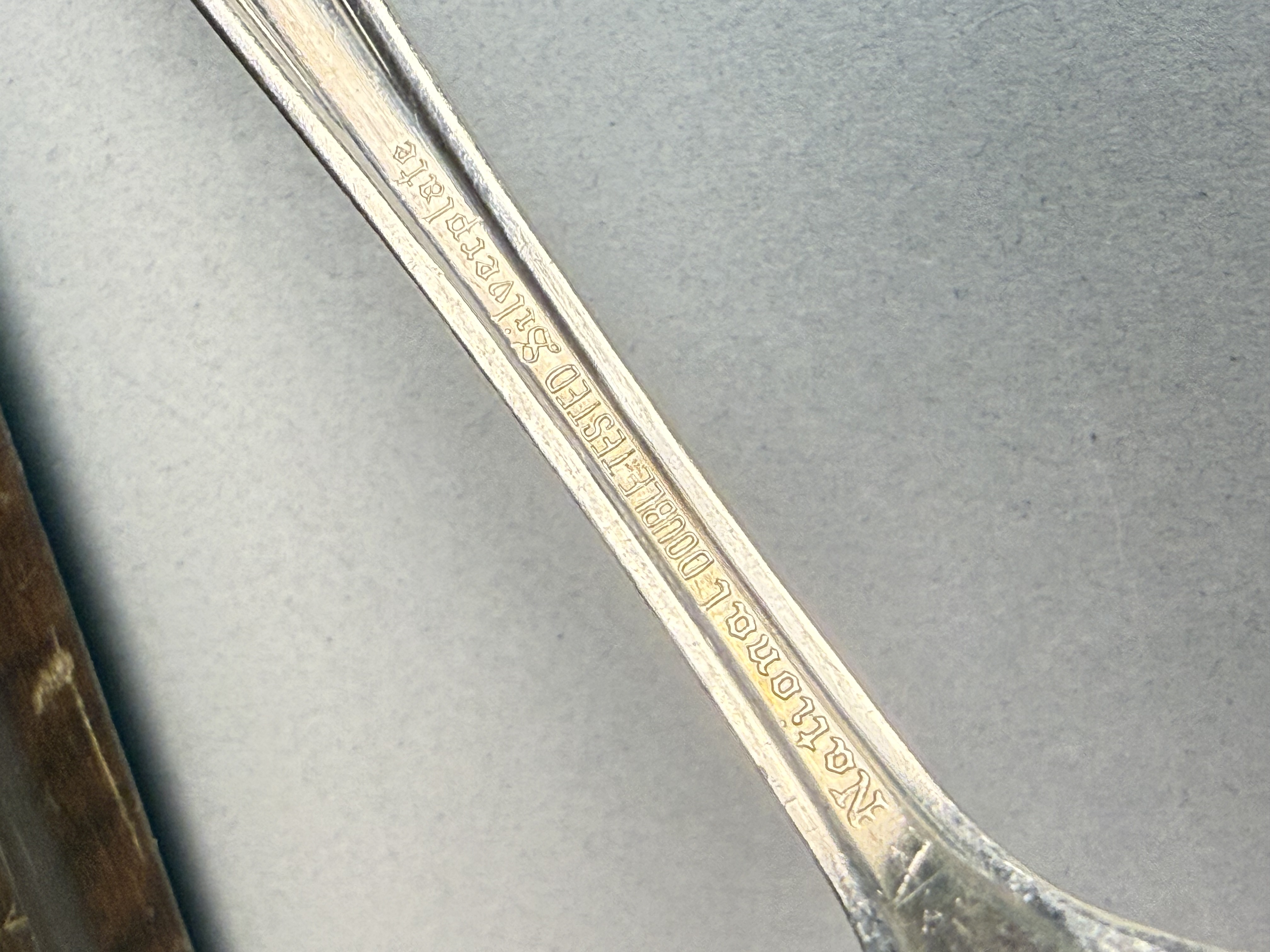 This is an assembled harlequin service of silver plate flatware featuring pieces from multiple manufacturers. Visible maker marks include Tudor Plate Oneida Community, R & B A1, H & T Mfg. Co., New England Silver Plate A1, and National Double Tested Silverplate. The collection includes several distinct patterns, notably the Evening Star floral motif by Tudor Plate, as well as Art Deco-influenced geometric and scrollwork designs. The service is configured for approximately 12 place settings and includes dinner knives, dinner forks, salad forks, teaspoons, soup spoons, and a pierced serving piece. The items are contained within a wooden storage chest featuring a blue felt and white satin-lined interior. No monograms are present. Wooden chest: 16.5 inches x 11 inches x 3.25 inches The flatware exhibits moderate to heavy tarnishing throughout. The wooden storage chest shows significant surface wear, including deep scratches, scuffs, and extensive areas of finish loss on the exterior. The interior lining shows light soiling.