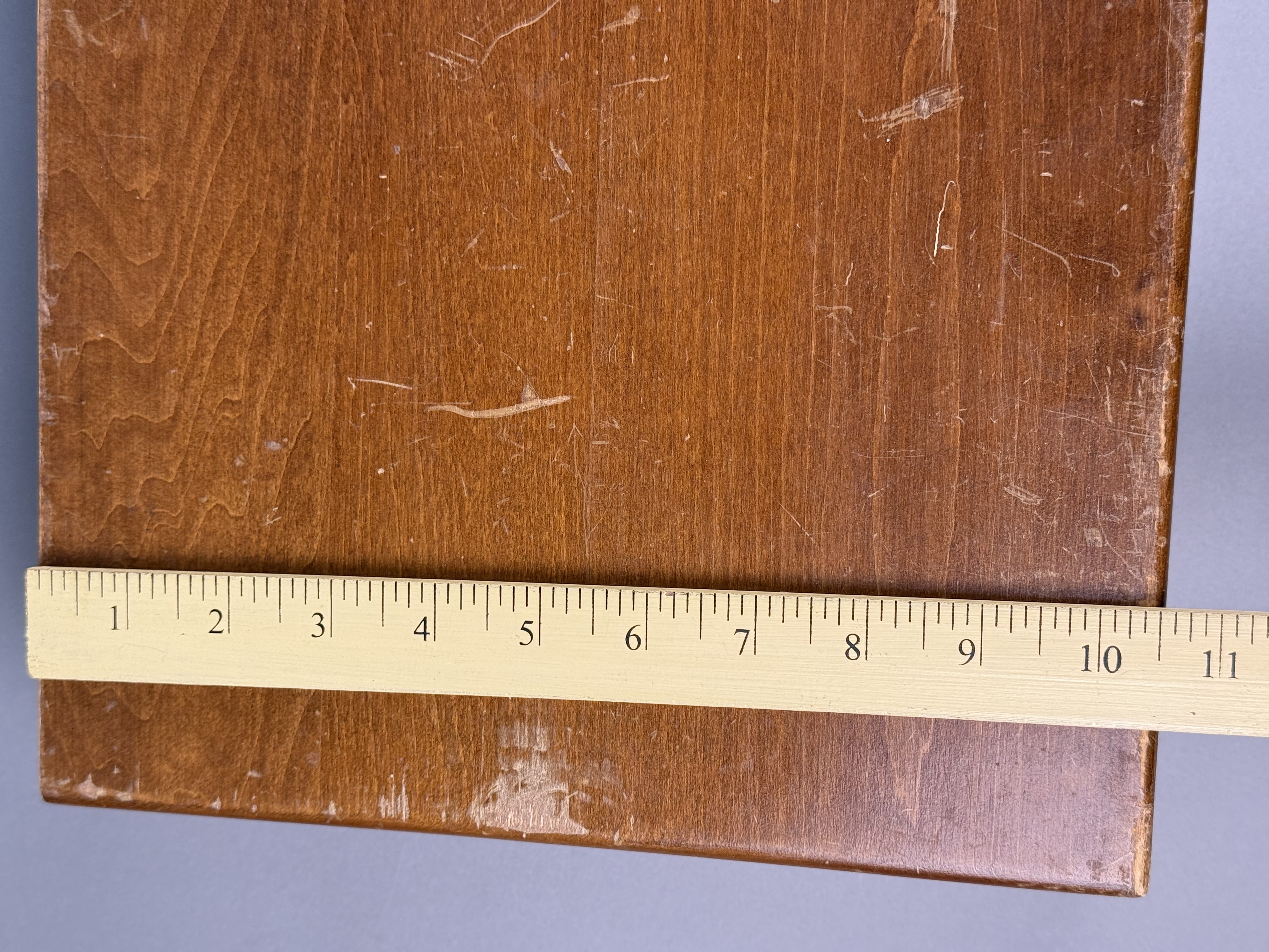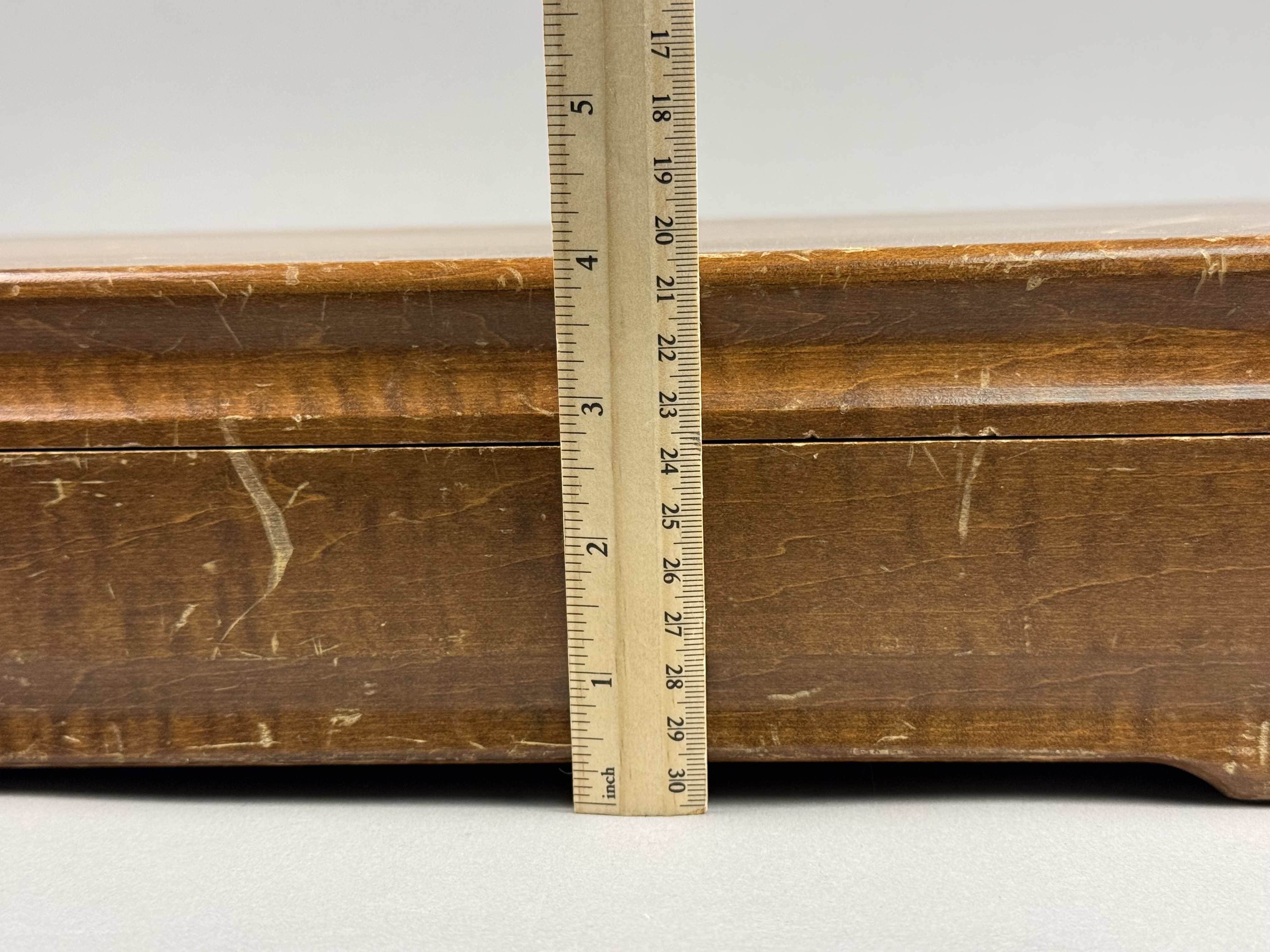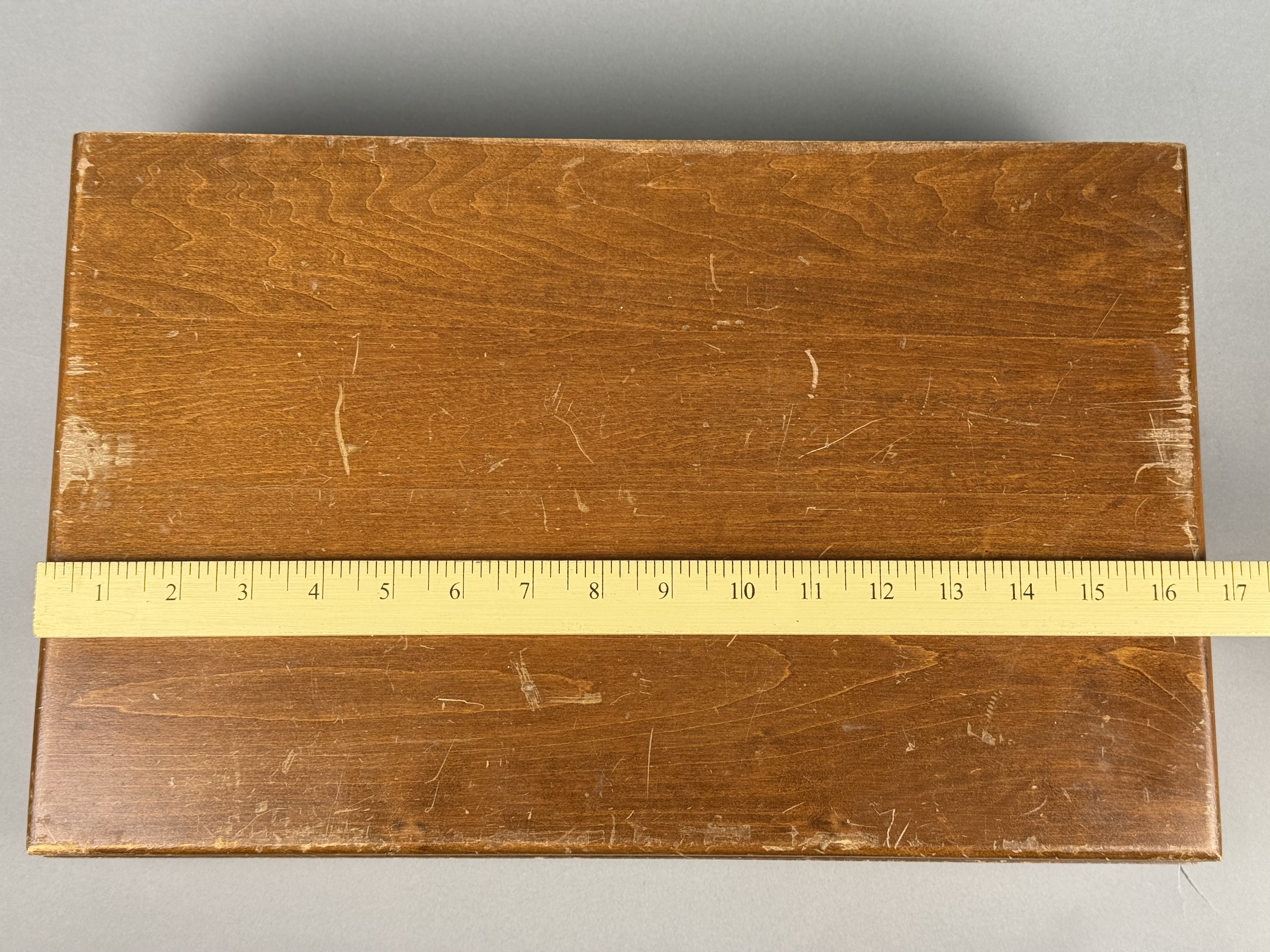 The flatware exhibits moderate to heavy tarnishing throughout. The wooden storage chest shows significant surface wear, including deep scratches, scuffs, and extensive areas of finish loss on the exterior. The interior lining shows light soiling.