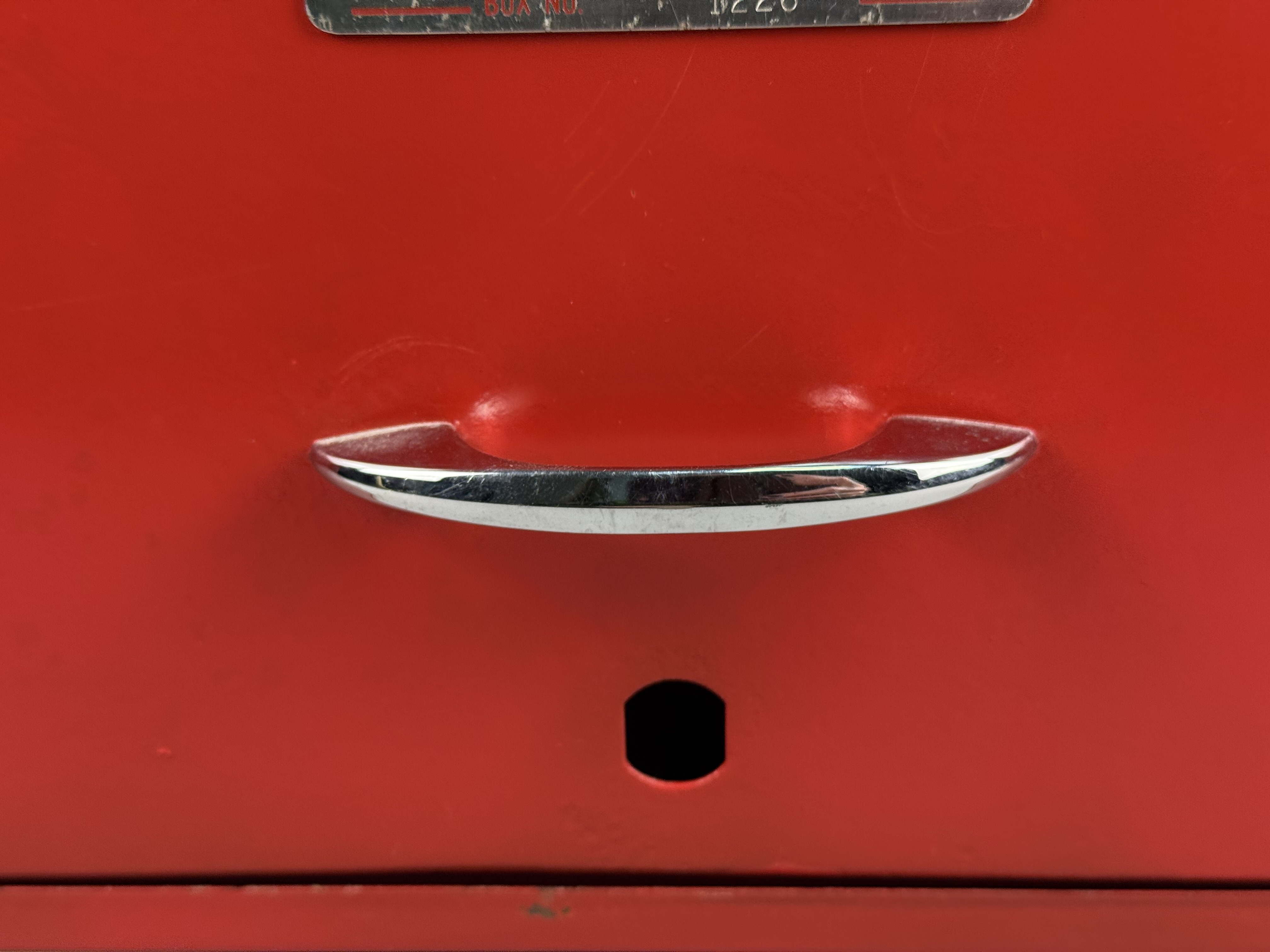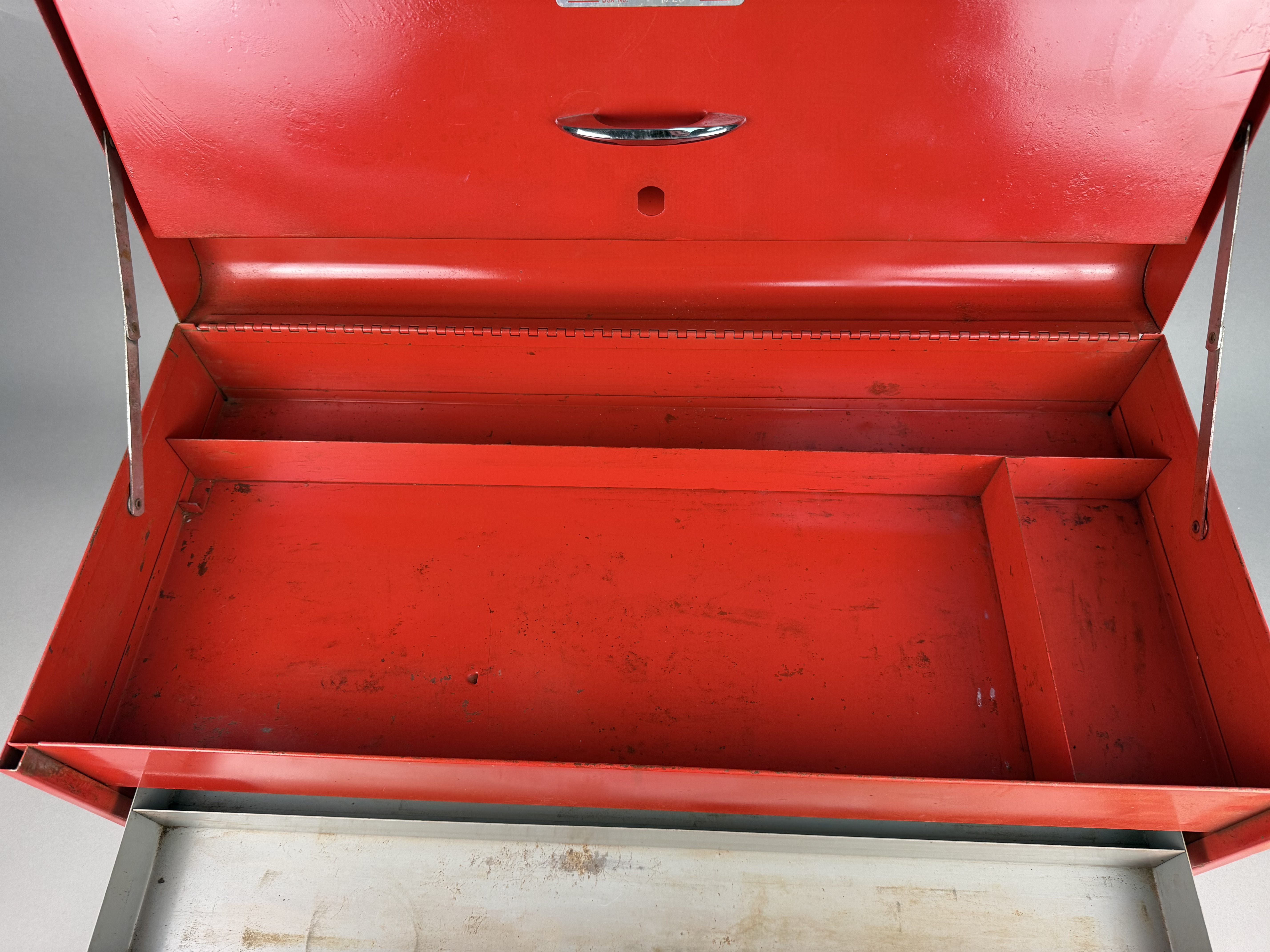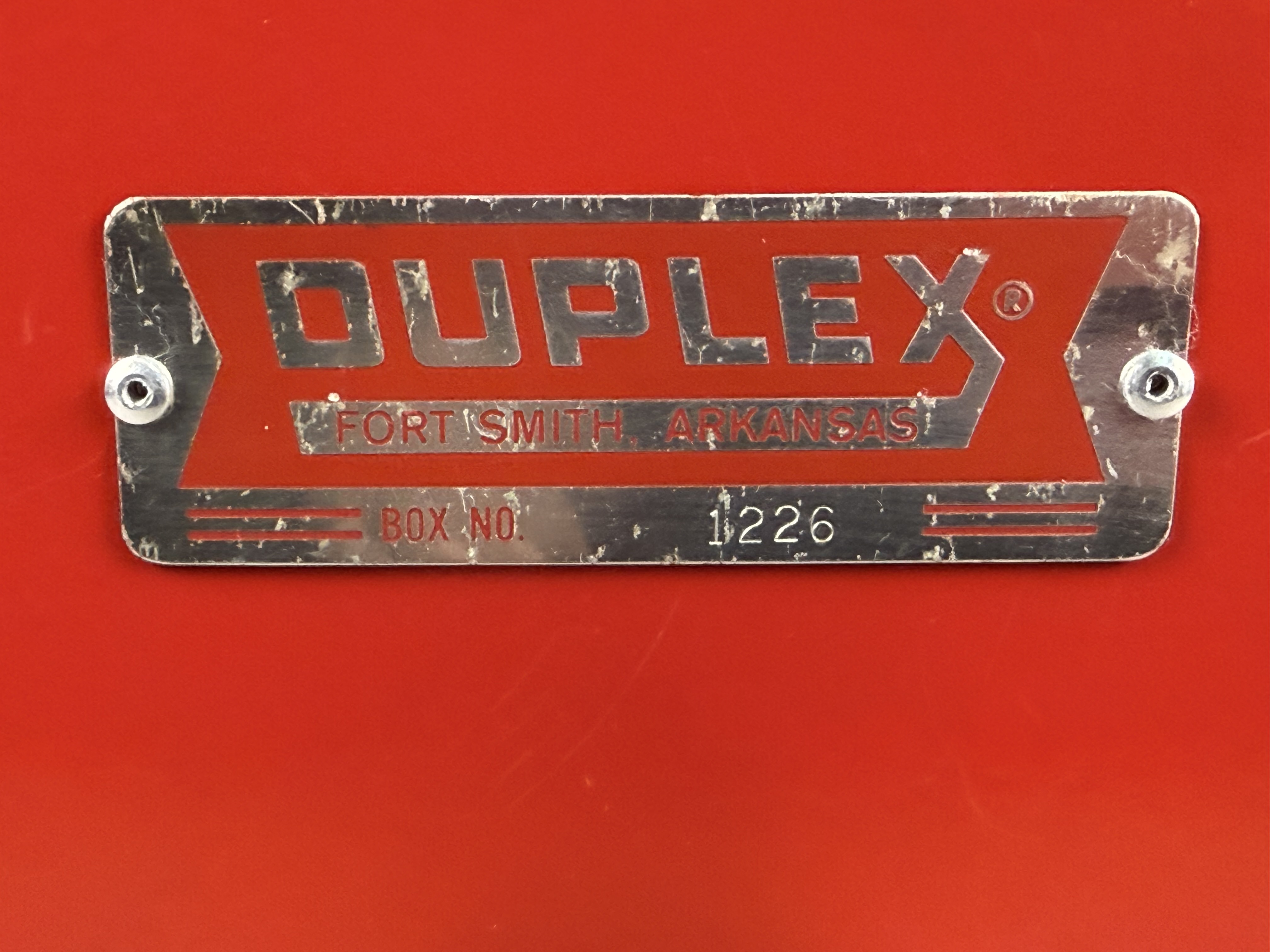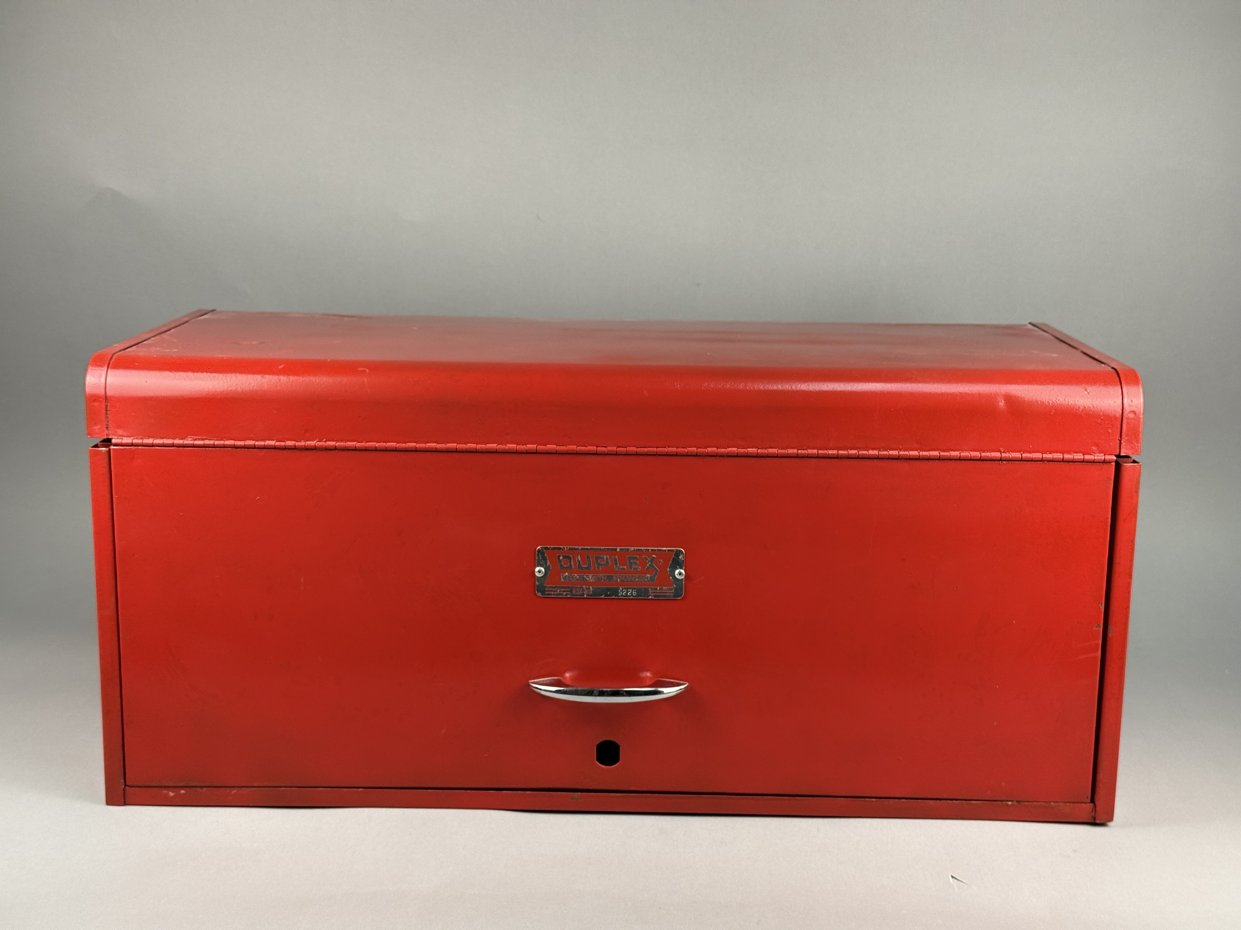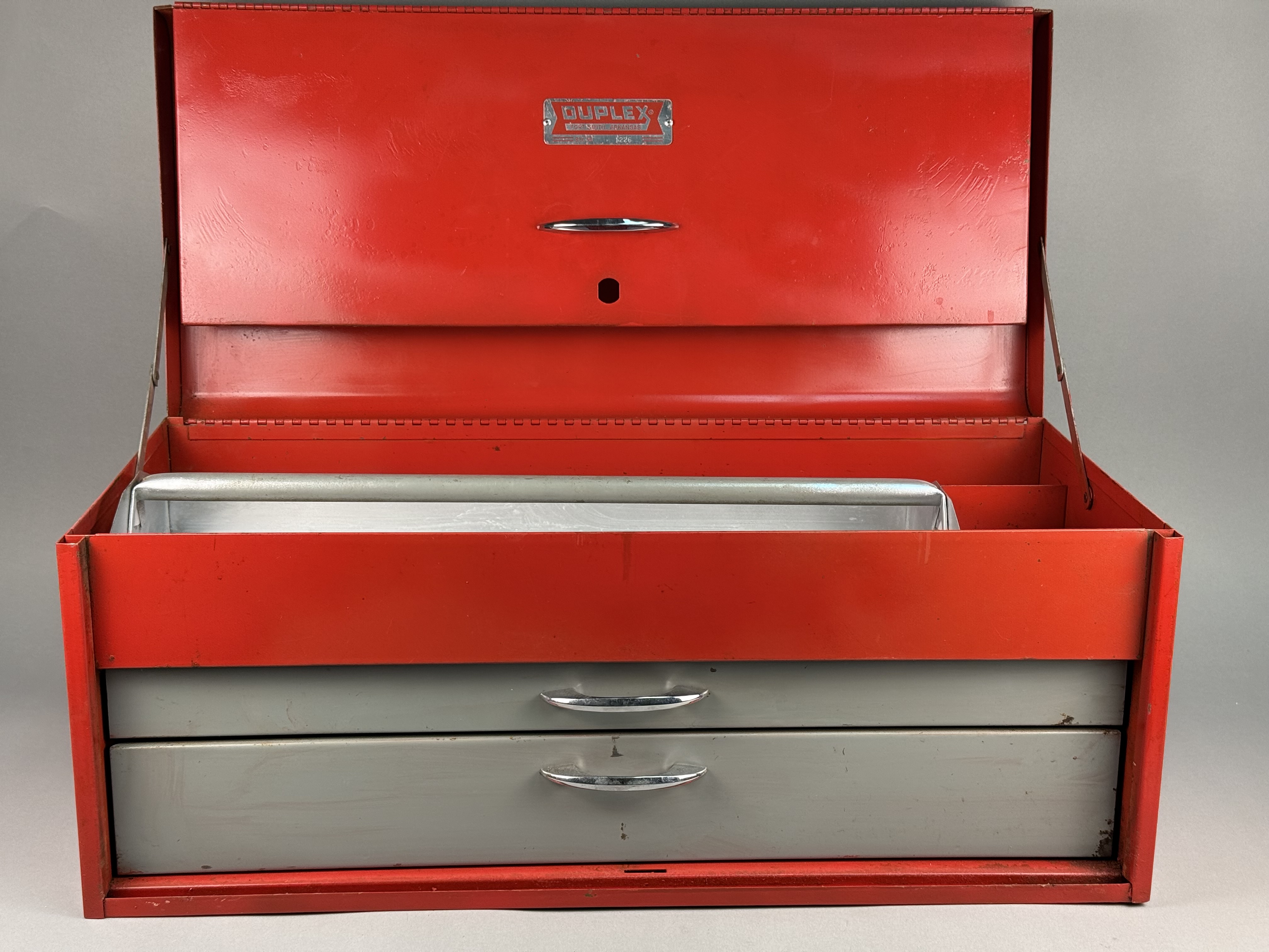 A Duplex brand metal toolbox, model number 1226, manufactured in Fort Smith, Arkansas. The piece features a red painted exterior with a hinged top lid and a drop-down front panel. The interior configuration includes a removable light gray metal tray with a tubular handle and two pull-out gray metal drawers. The drawers and front panel are fitted with chrome-plated handles. A metal nameplate is affixed to the front panel and the interior lid, displaying the DUPLEX logo, FORT SMITH, ARKANSAS, and BOX NO. 1226. The unit is equipped with fold-down red metal carrying handles on the sides. Width: 25.75 inches The toolbox shows signs of age and use. The exterior red finish has surface scratches, scuffs, and areas of paint loss. The interior surfaces, drawers, and removable tray exhibit oxidation and staining. The chrome-plated hardware shows minor surface wear and pitting.