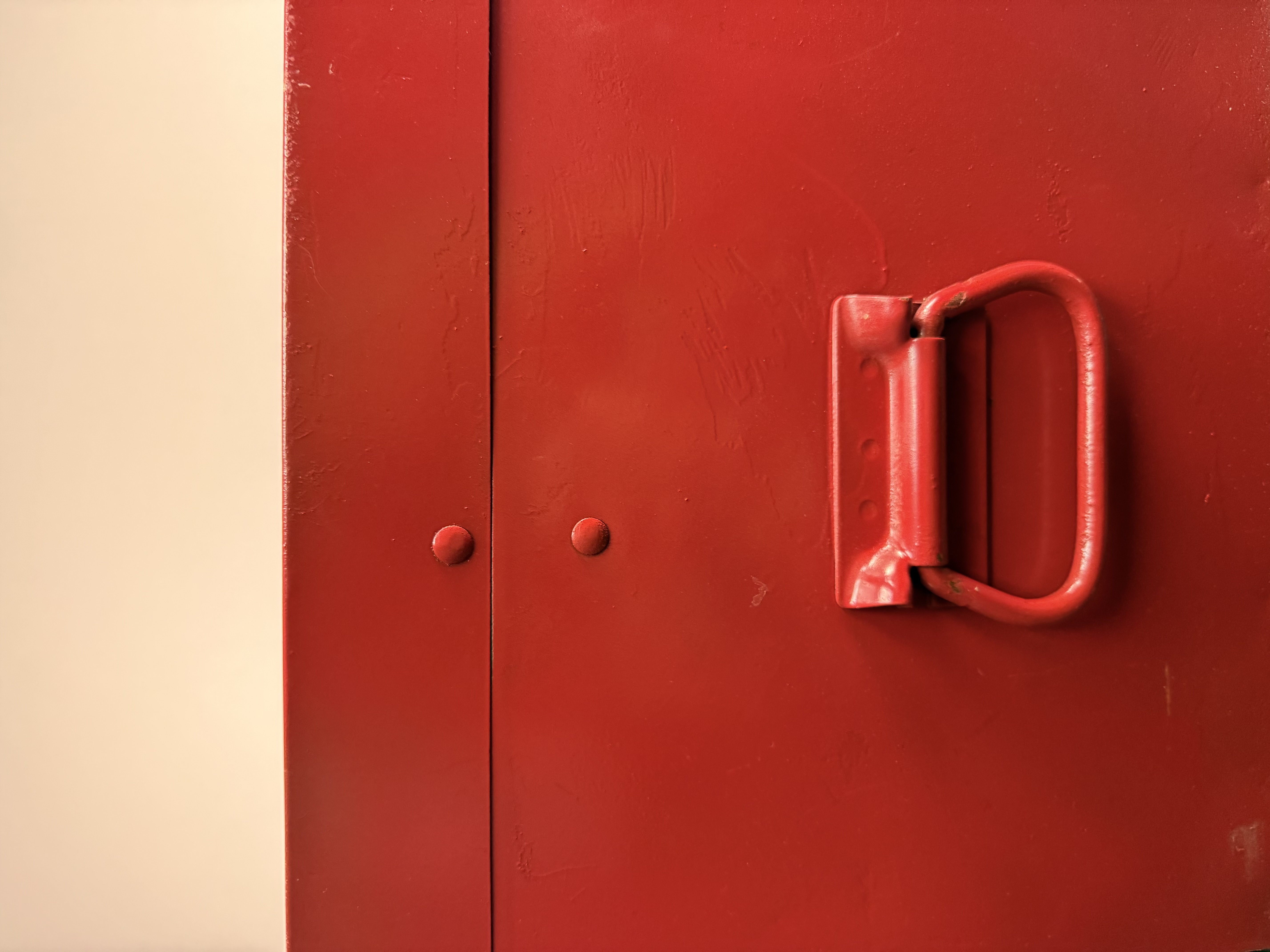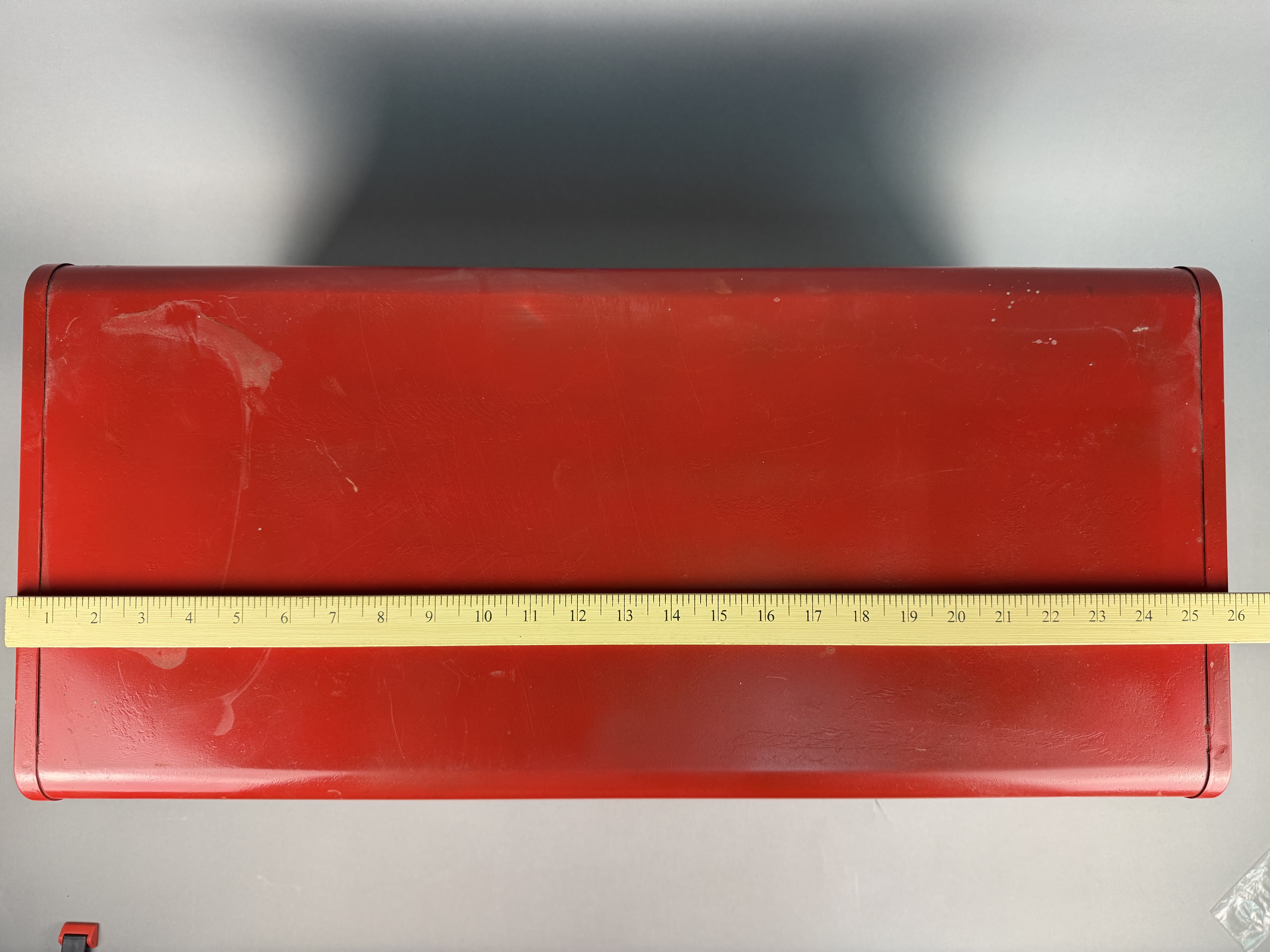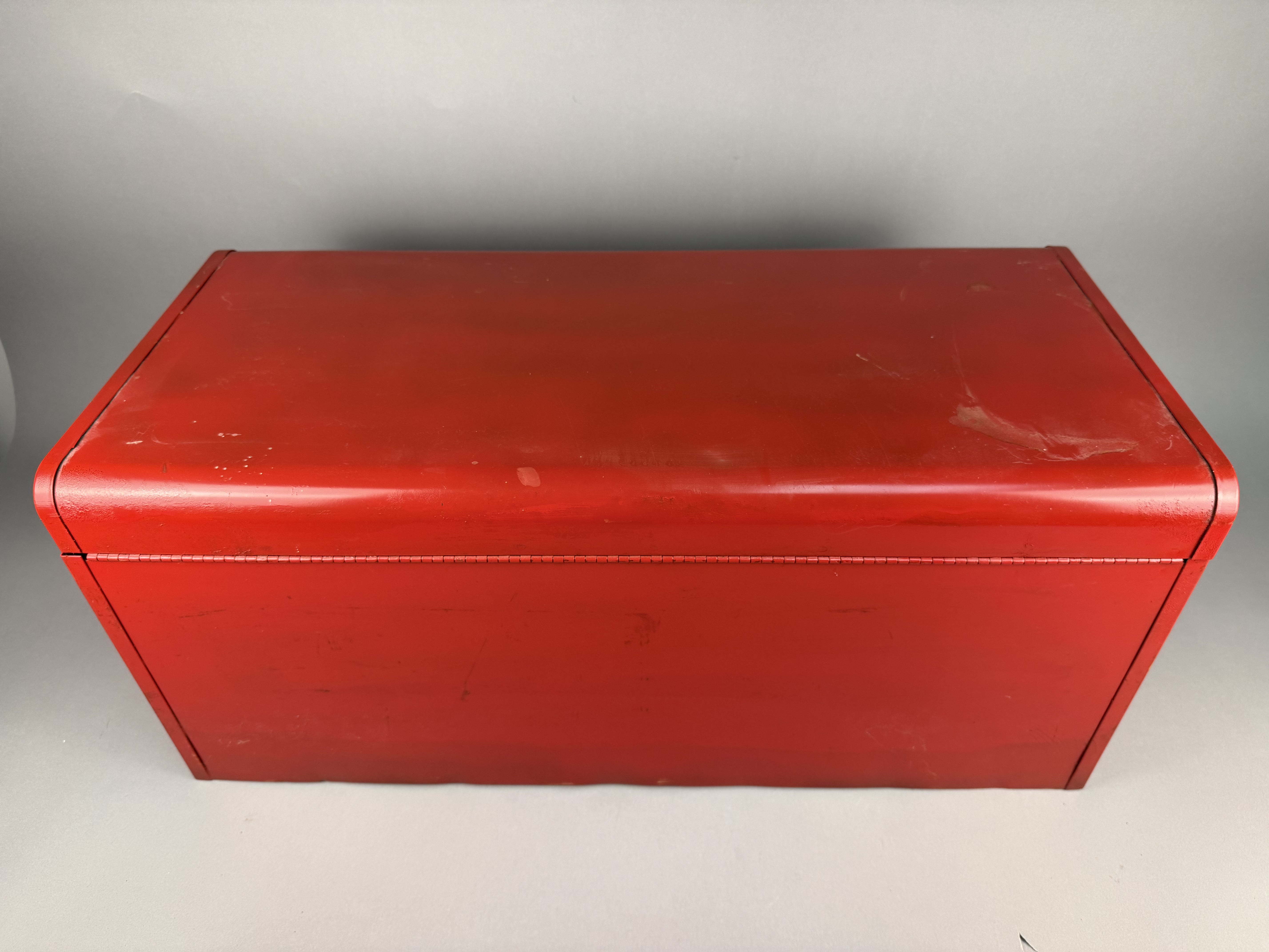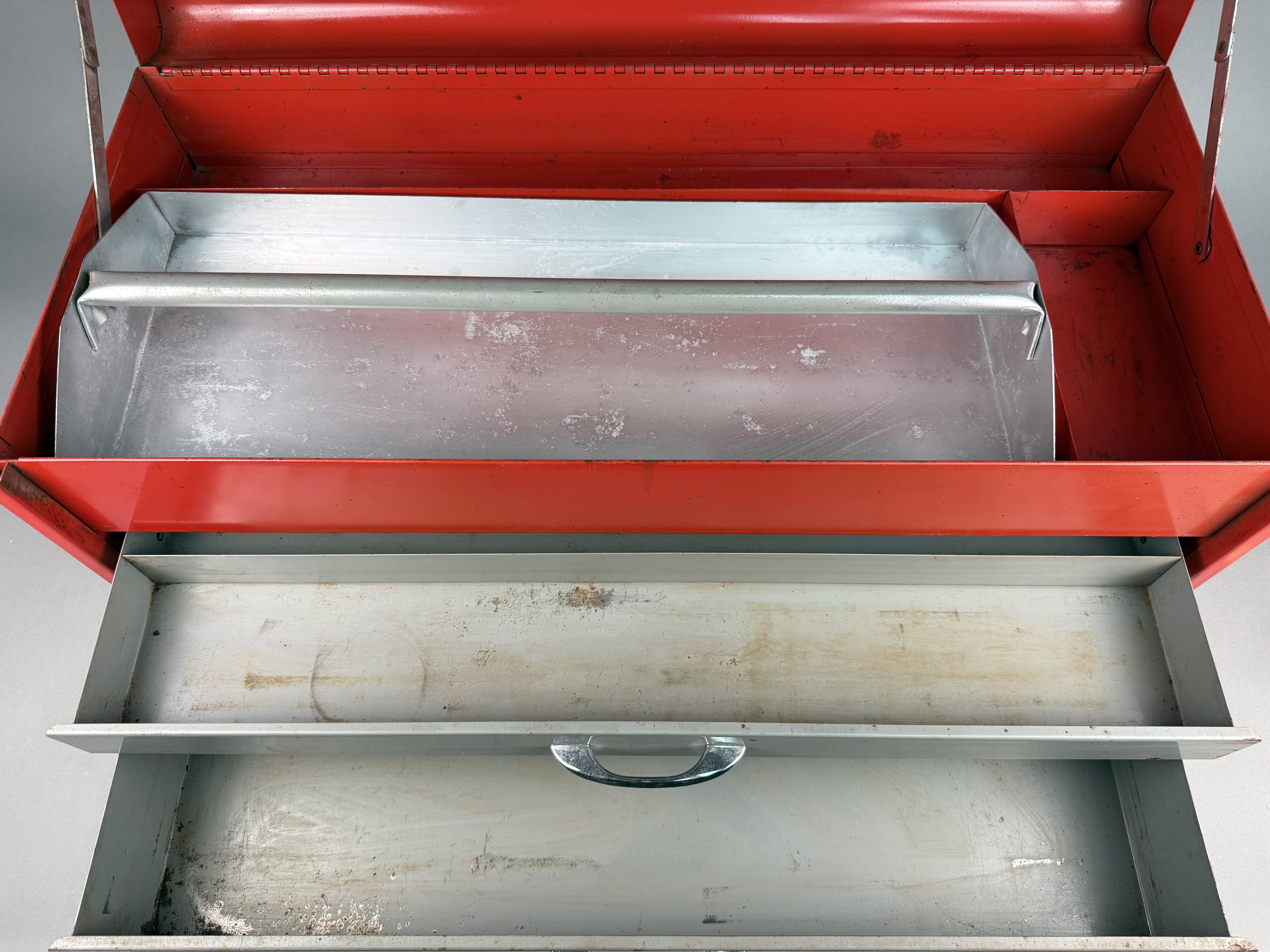 The toolbox shows signs of age and use. The exterior red finish has surface scratches, scuffs, and areas of paint loss. The interior surfaces, drawers, and removable tray exhibit oxidation and staining. The chrome-plated hardware shows minor surface wear and pitting.