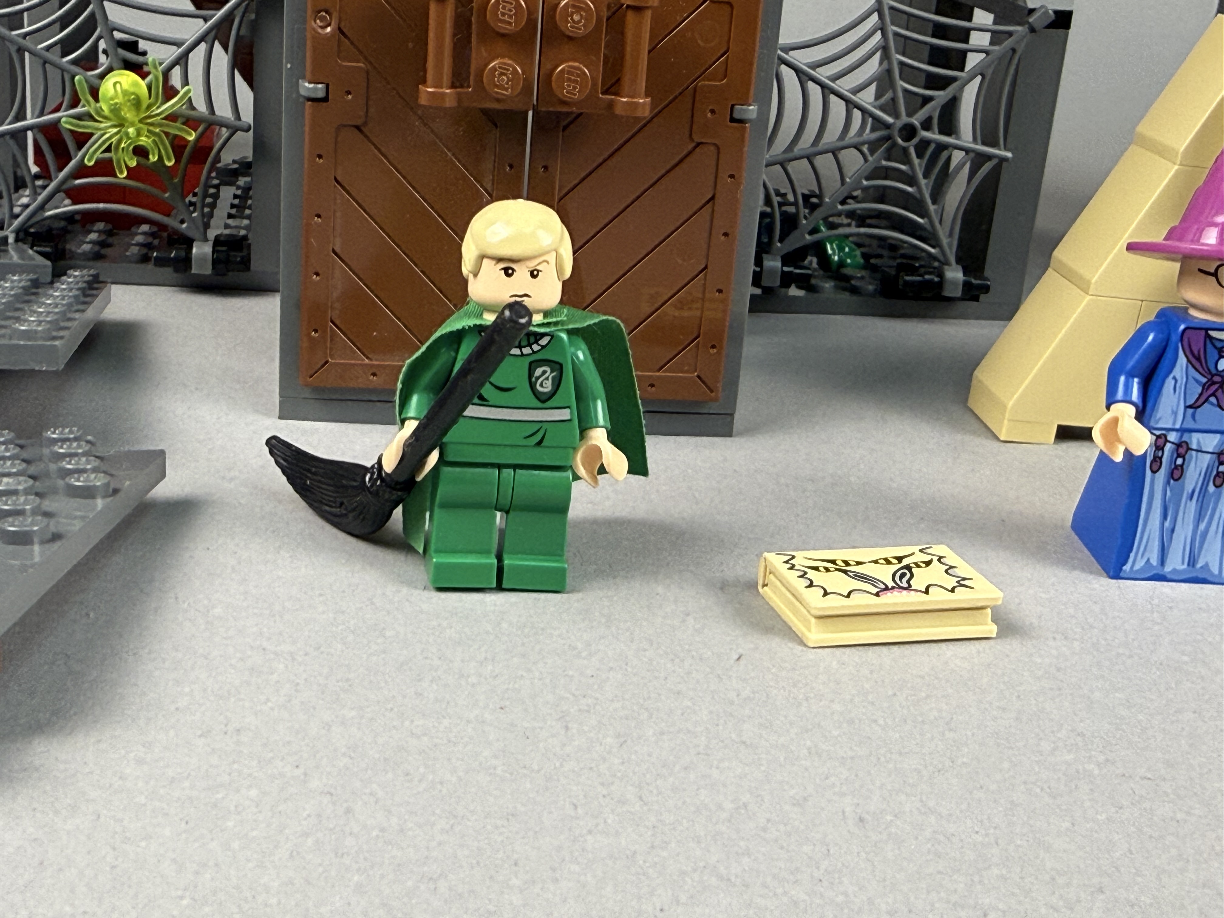 LEGO Harry Potter Hogwarts Castle set, identified as set number 4757, released in 2004. This building block construction set is manufactured from molded plastic. The assembly features mechanical play functions including swinging main doors and a revolving interior section within the tower structure. The manufacturer name LEGO is embossed on the connecting studs and the interior of various components. The lot consists of the castle structures and a collection of minifigures and themed accessories. Minifigures include Harry Potter with glasses, Hermione Granger with Time-Turner torso detail, Ron Weasley (missing hair), Professor Albus Dumbledore in purple robes, Professor Sybill Trelawney in blue robes, Draco Malfoy in green Slytherin Quidditch robes with a broomstick, and two Dementor figures with grey fabric cloaks and translucent green heads. Included accessories feature a printed Monster Book of Monsters tile, spiders, webs, and various interior furniture pieces including a trunk and desks. Tallest tower section: 11.5 inches This set is in used, assembled condition. Surface dust is present throughout the structures. Set is incomplete. The original box and instructions are not included.