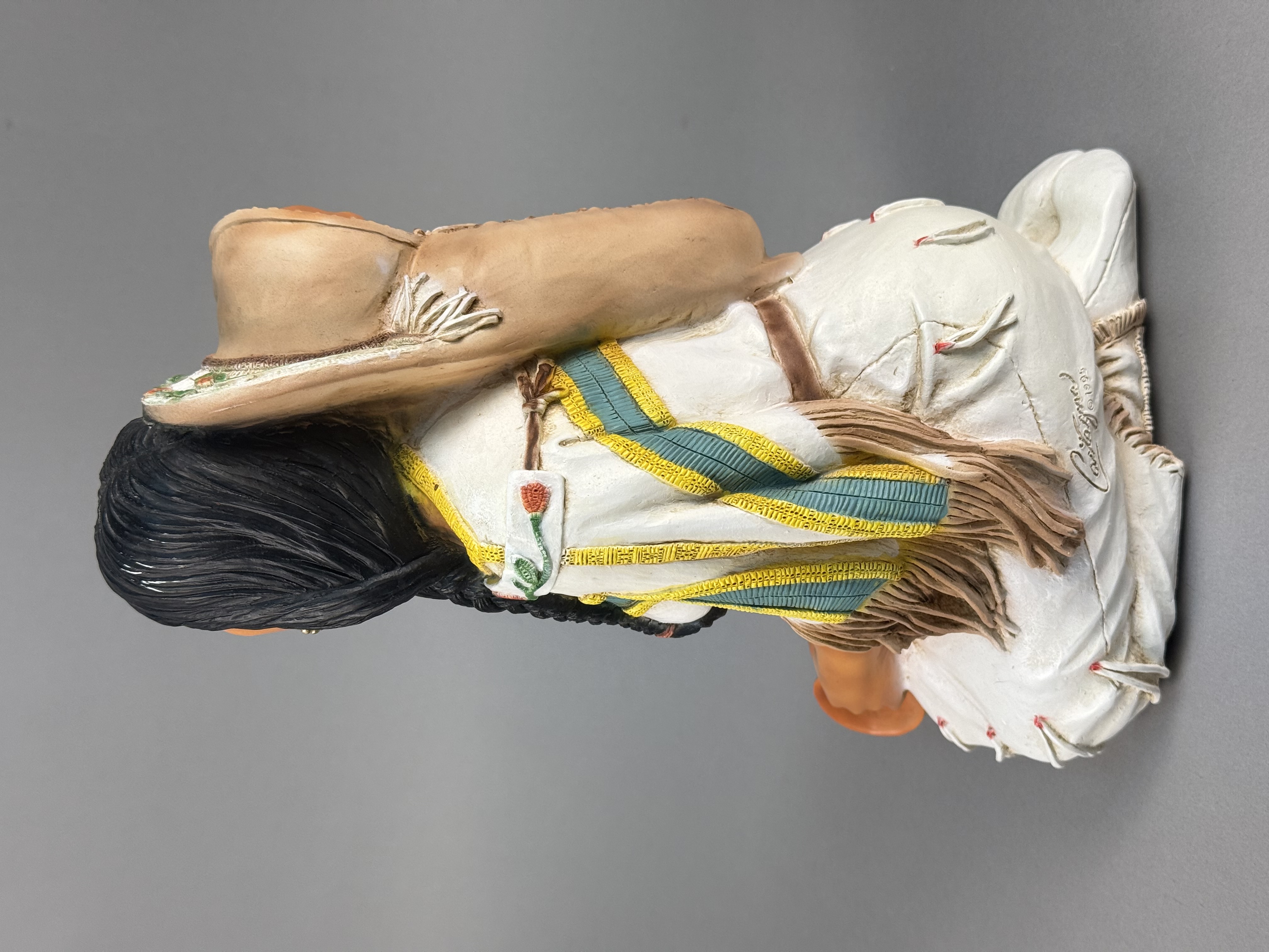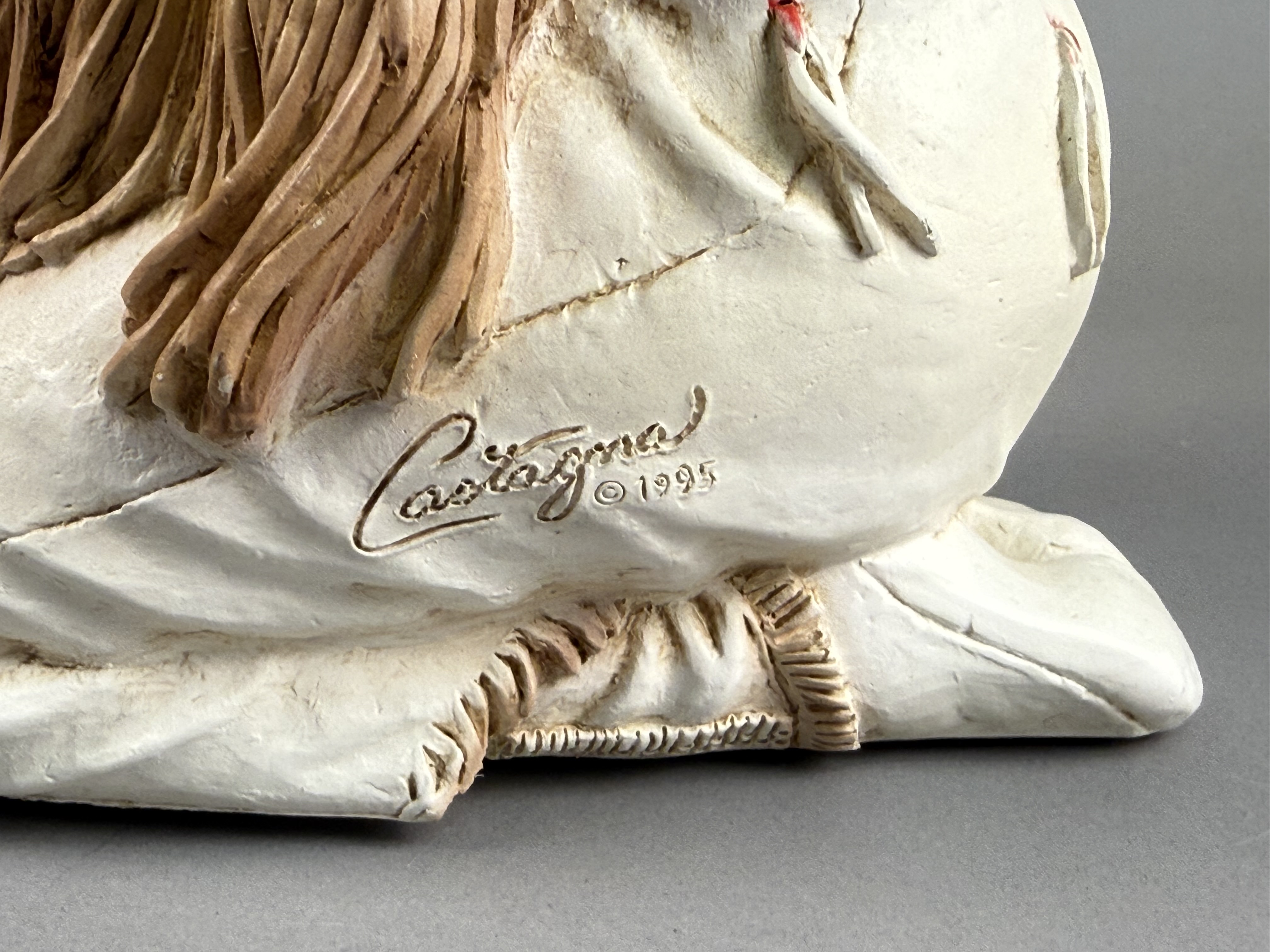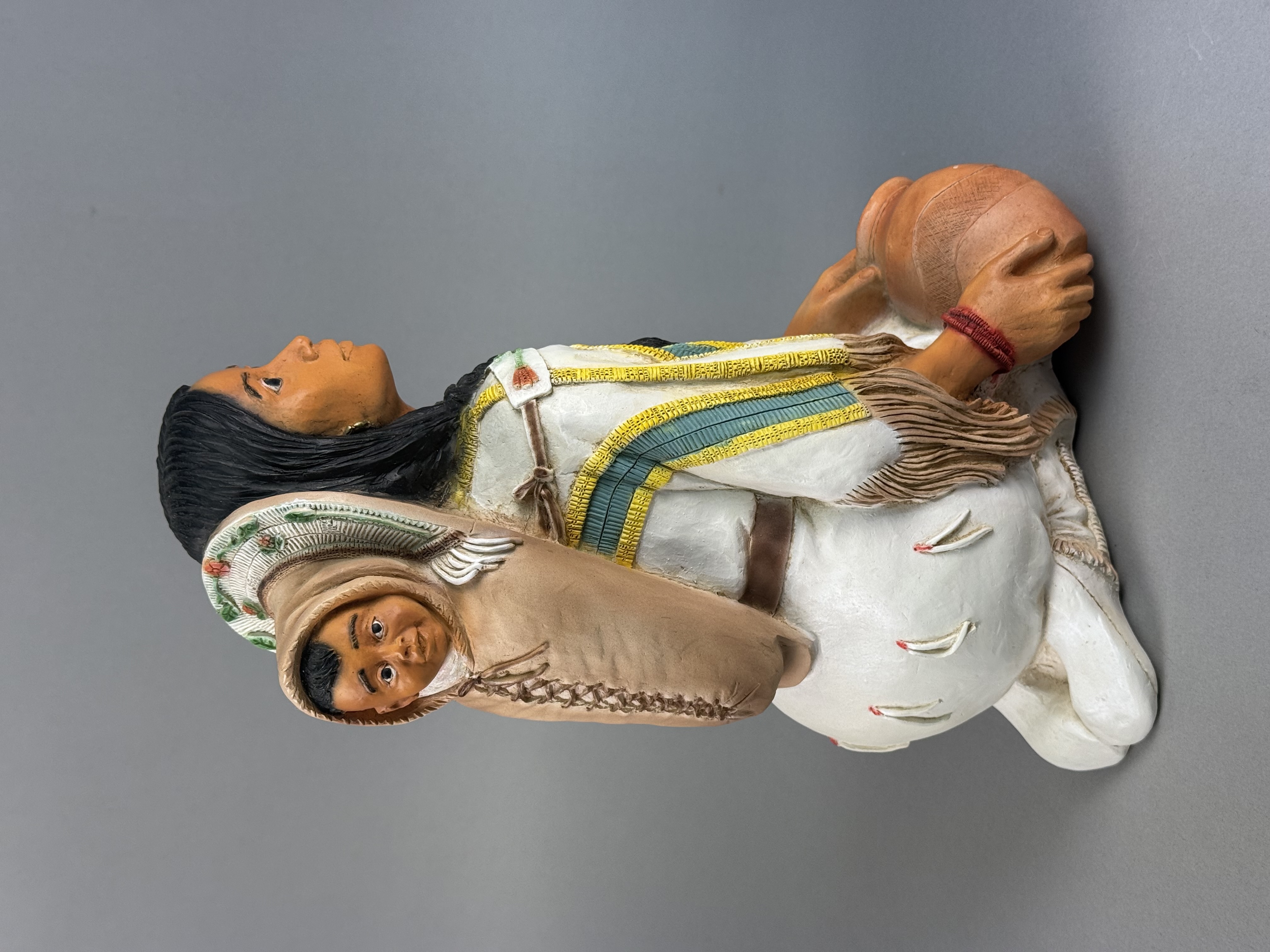 A painted figurine from the Castagna Infrangible Line depicting a seated Indigenous North American woman. The figure is shown in traditional-style fringed clothing decorated with teal and yellow geometric patterns and floral accents. She holds a small earthenware-style pot in her hands and carries an infant in a papoose on her back. The figurine is constructed from a painted resin composite material. An incised signature on the side of the base reads Castagna 1995. The underside of the base retains a black and gold circular foil label that reads MOD DEP. Infrangible Line Castagna MADE IN ITALY. Length: 11.75 inches The figurine is in excellent condition with no visible chips, cracks, or repairs. The manufacturer foil label on the base shows some wear and tearing.