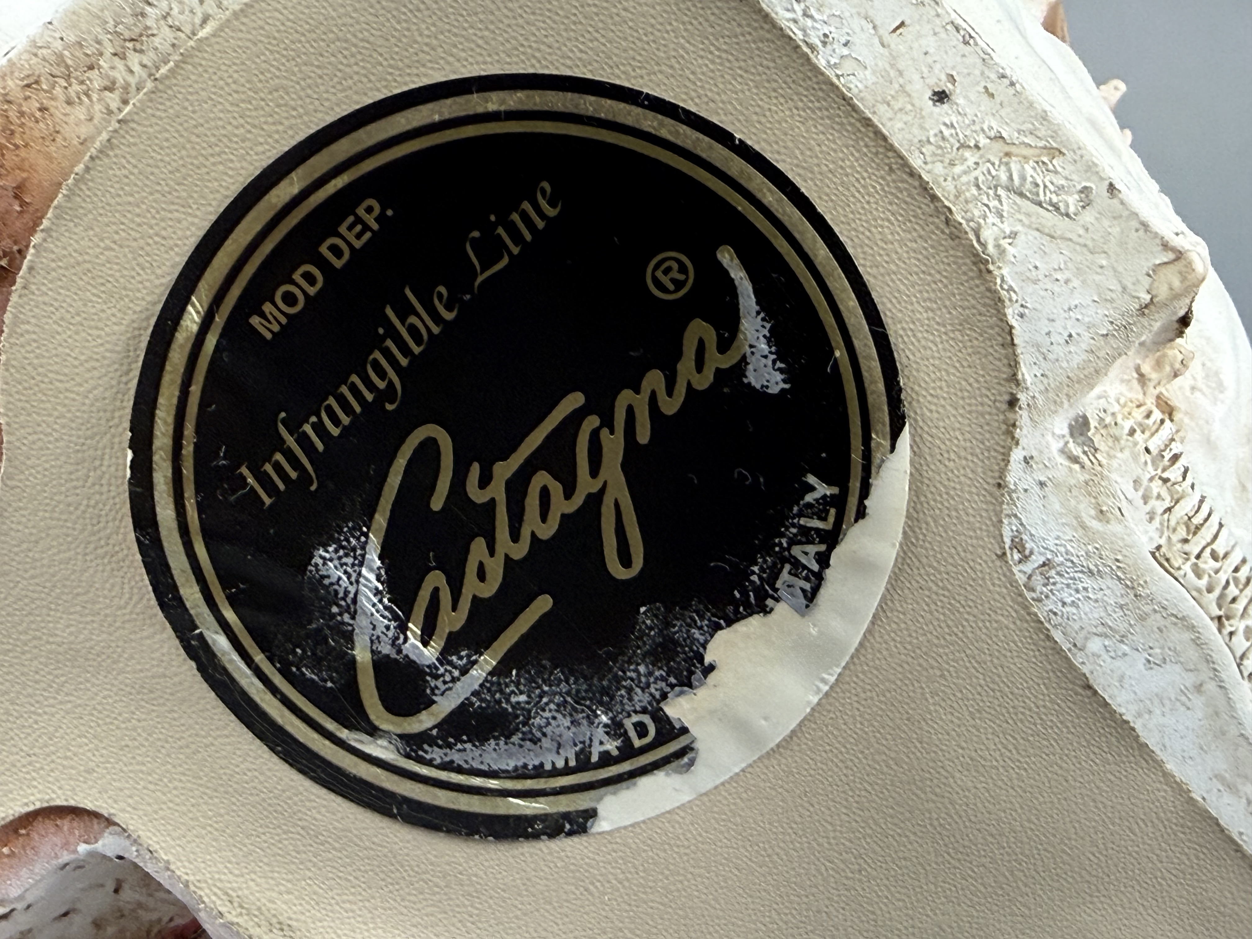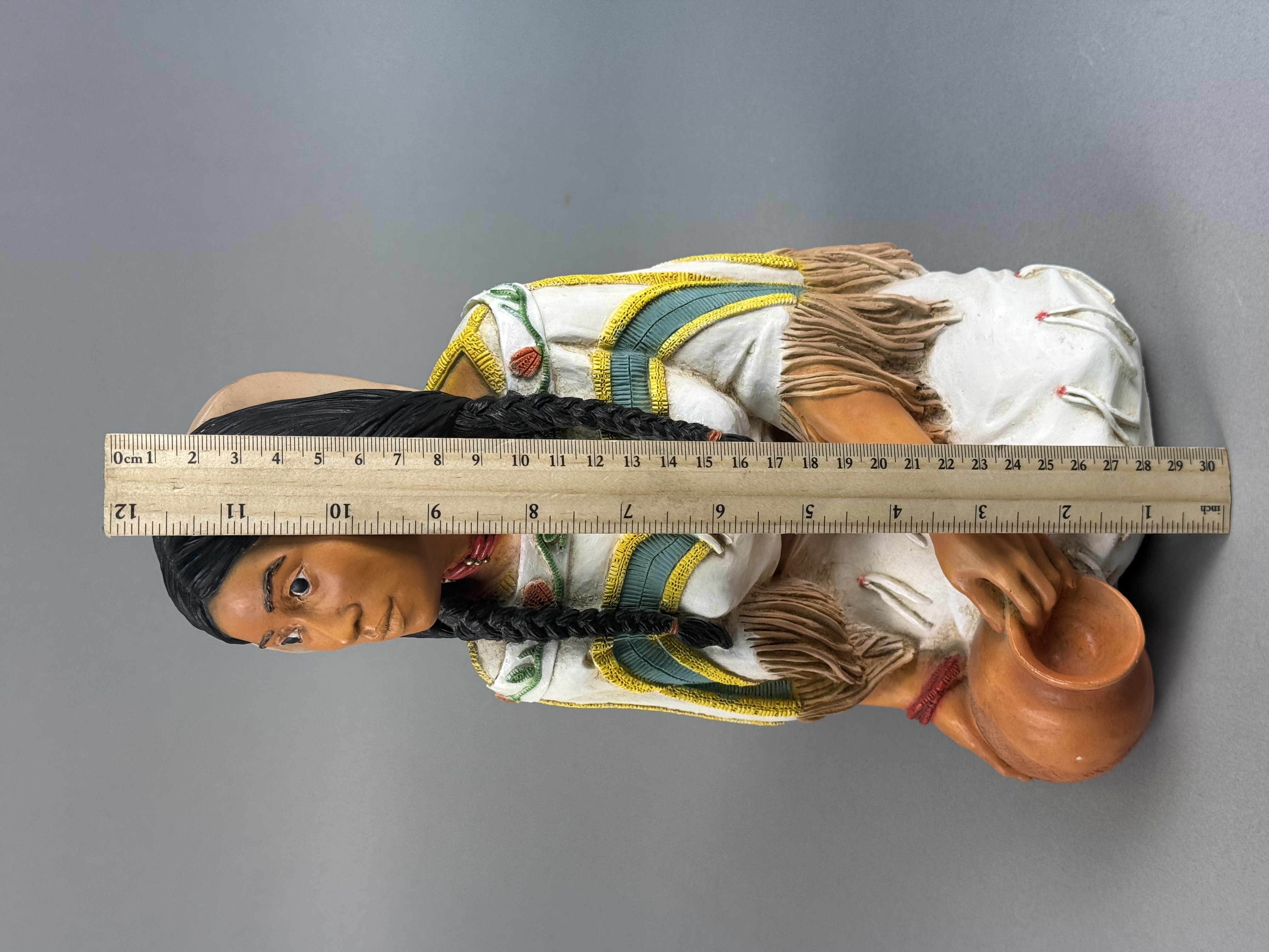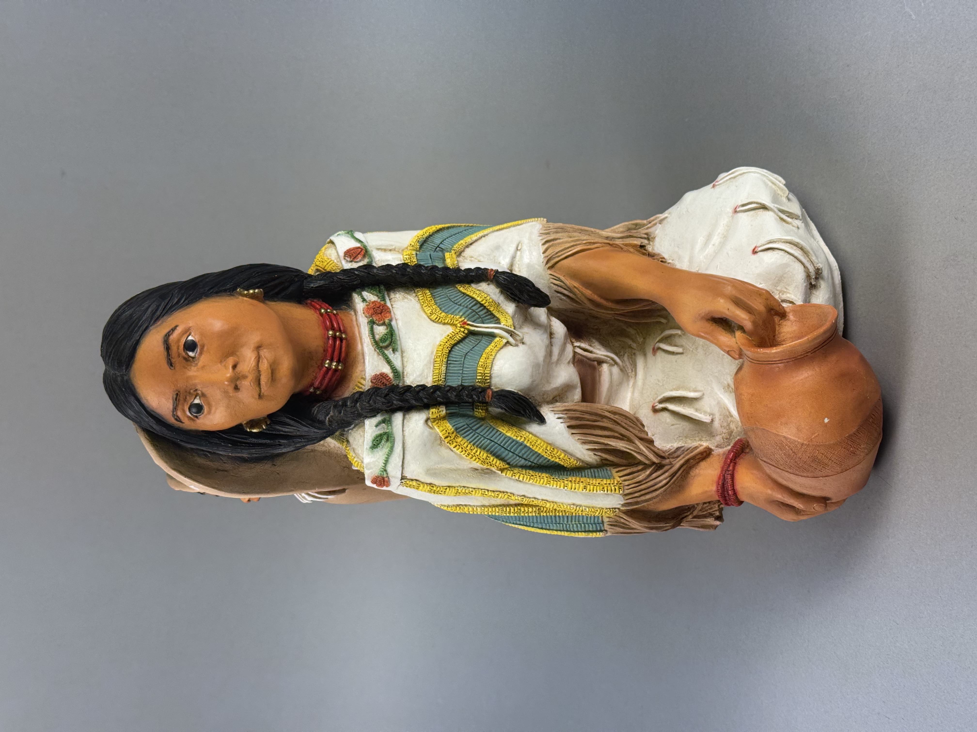 A painted figurine from the Castagna Infrangible Line depicting a seated Indigenous North American woman. The figure is shown in traditional-style fringed clothing decorated with teal and yellow geometric patterns and floral accents. She holds a small earthenware-style pot in her hands and carries an infant in a papoose on her back. The figurine is constructed from a painted resin composite material. An incised signature on the side of the base reads Castagna 1995. The underside of the base retains a black and gold circular foil label that reads MOD DEP. Infrangible Line Castagna MADE IN ITALY. Length: 11.75 inches The figurine is in excellent condition with no visible chips, cracks, or repairs. The manufacturer foil label on the base shows some wear and tearing.