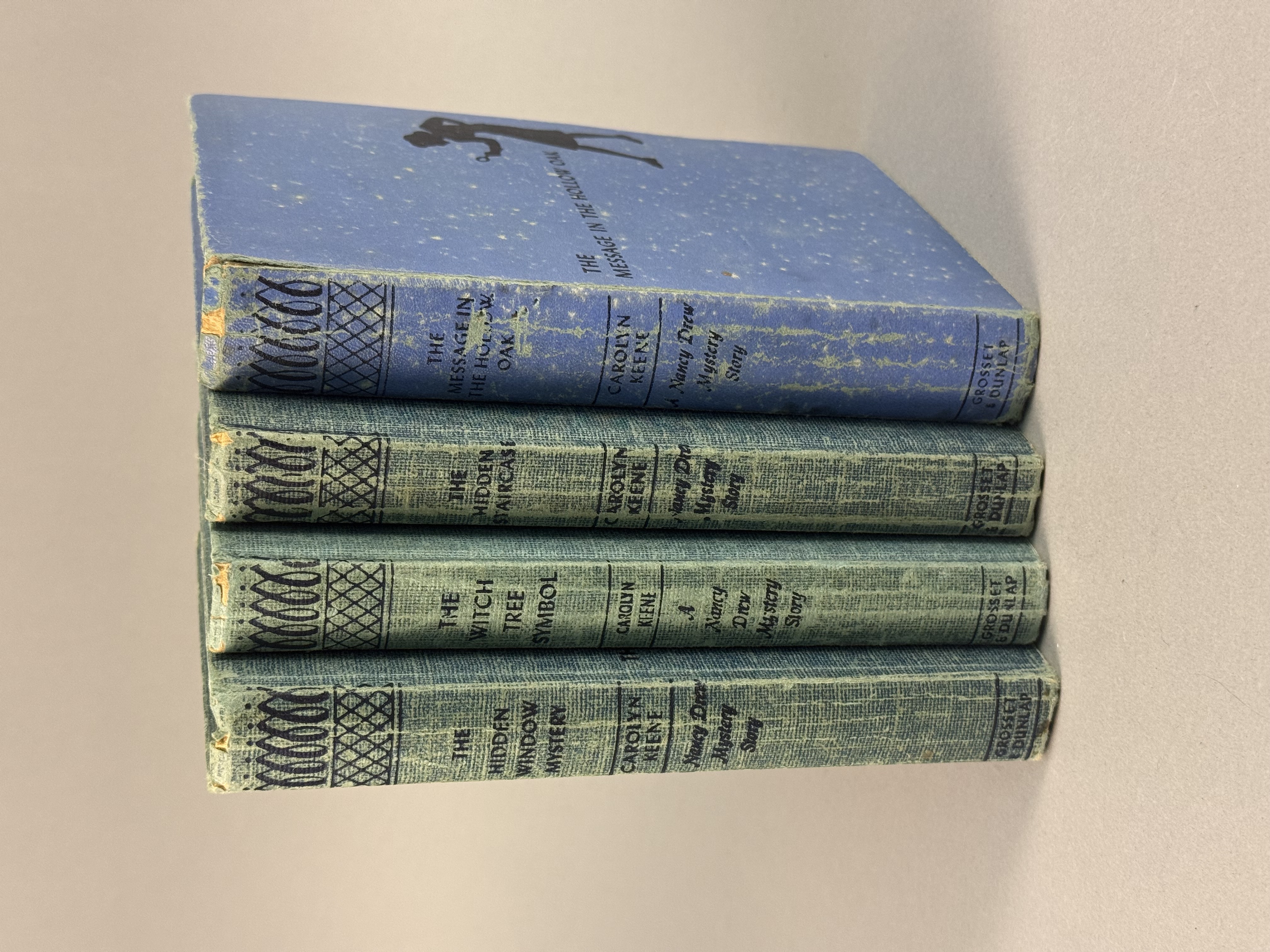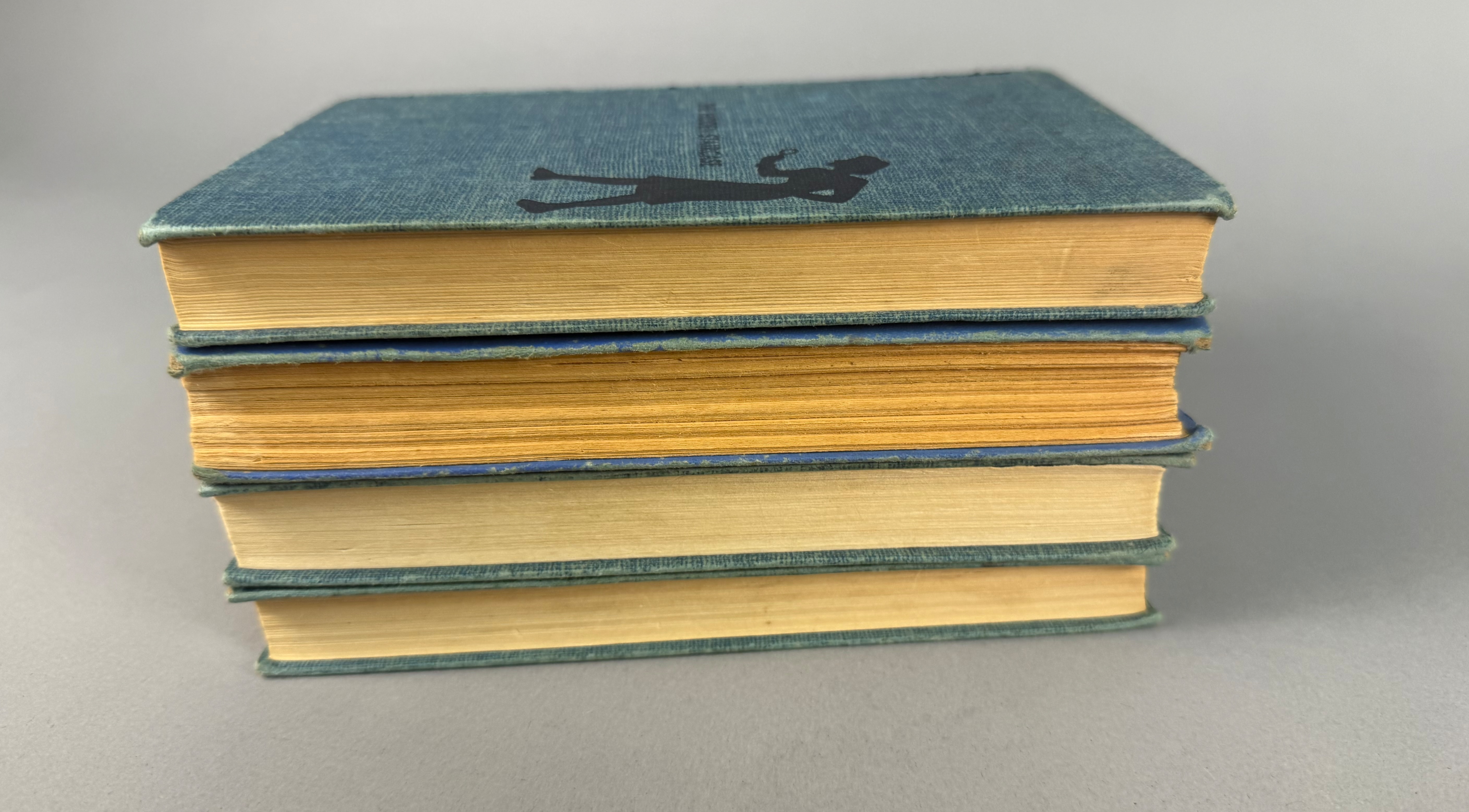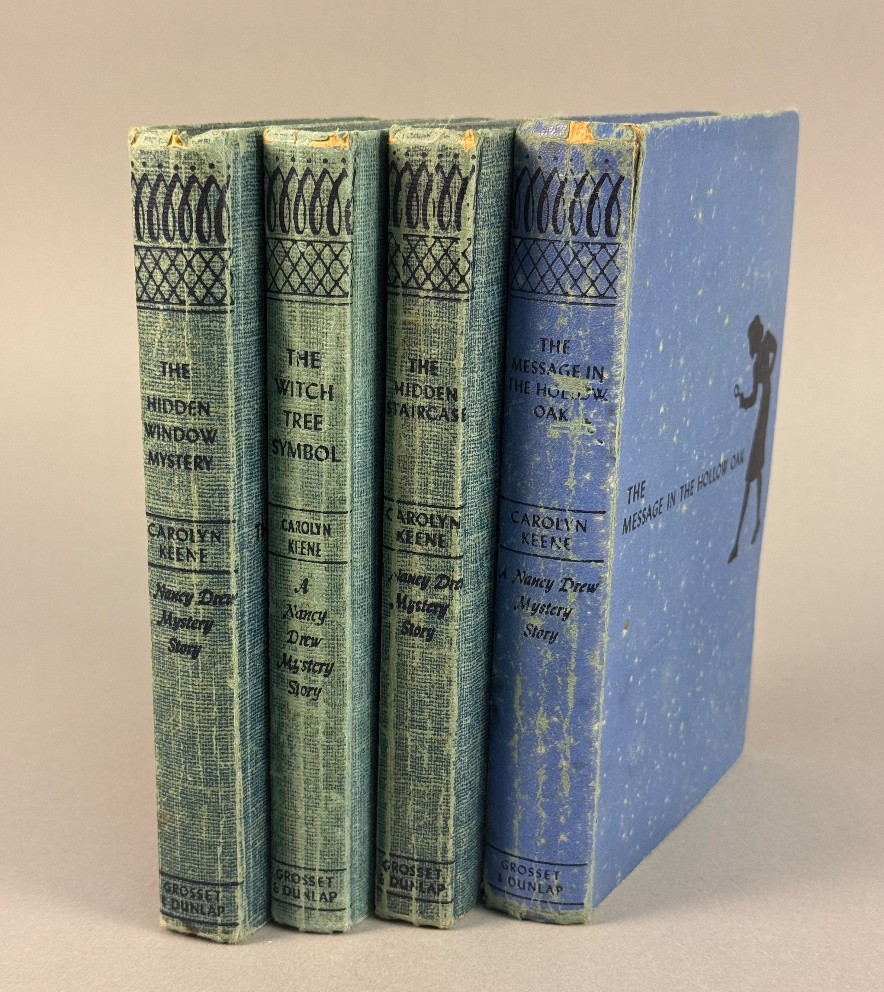 A collection of Nancy Drew Mystery Stories by Carolyn Keene, published by Grosset & Dunlap. The group includes the following titles: The Hidden Staircase (copyright 1930), The Message in the Hollow Oak (copyright 1935), The Witch Tree Symbol (copyright 1955), and The Hidden Window Mystery (copyright 1956). Three volumes are bound in the publisher’s teal tweed-patterned cloth, and one volume is bound in light blue cloth. All four volumes feature the dark blue stamped silhouette of a girl with a magnifying glass on the front cover and spine. Each book contains a black-and-white frontispiece illustration. Height: 7.5 inches Width: 5.25 inches Fair to good. The books are offered without dust jackets. There is visible tanning and foxing to the text block edges and internal pages. The cloth bindings show shelf wear, including rubbing and fraying at the spine ends and corners. Staining and fading are present on the covers, most notably on the light blue volume. Spines remain intact with legible titles.