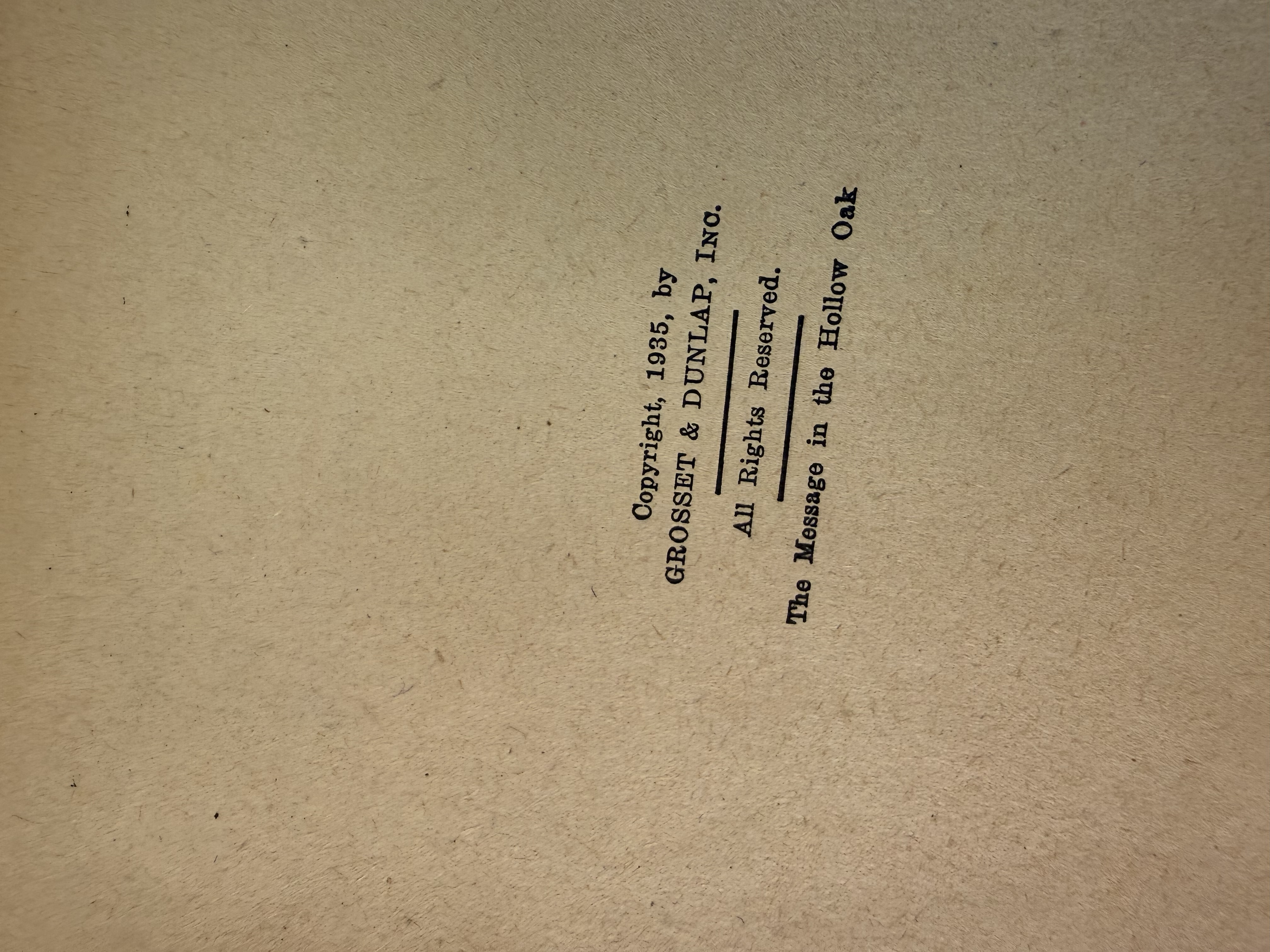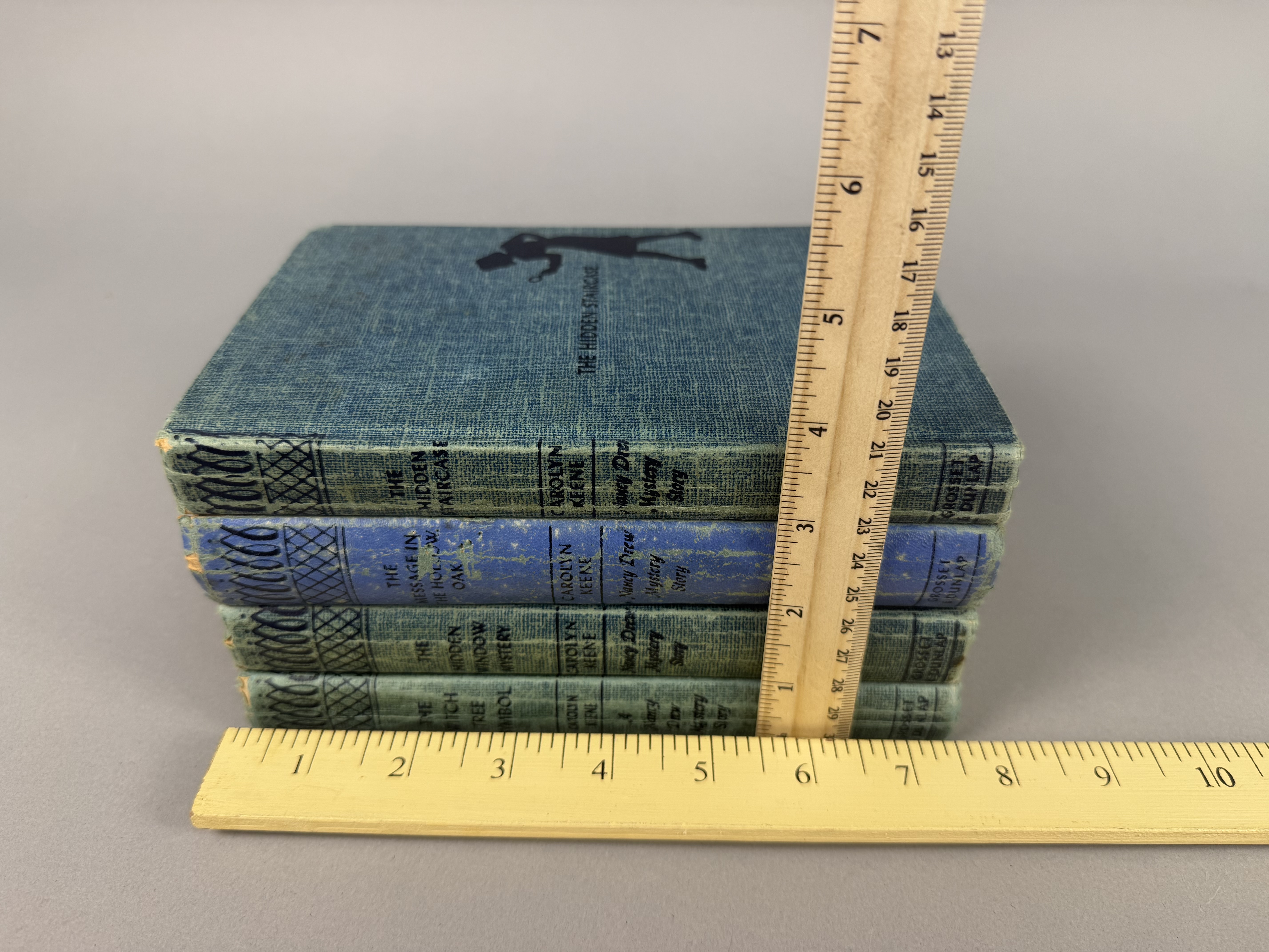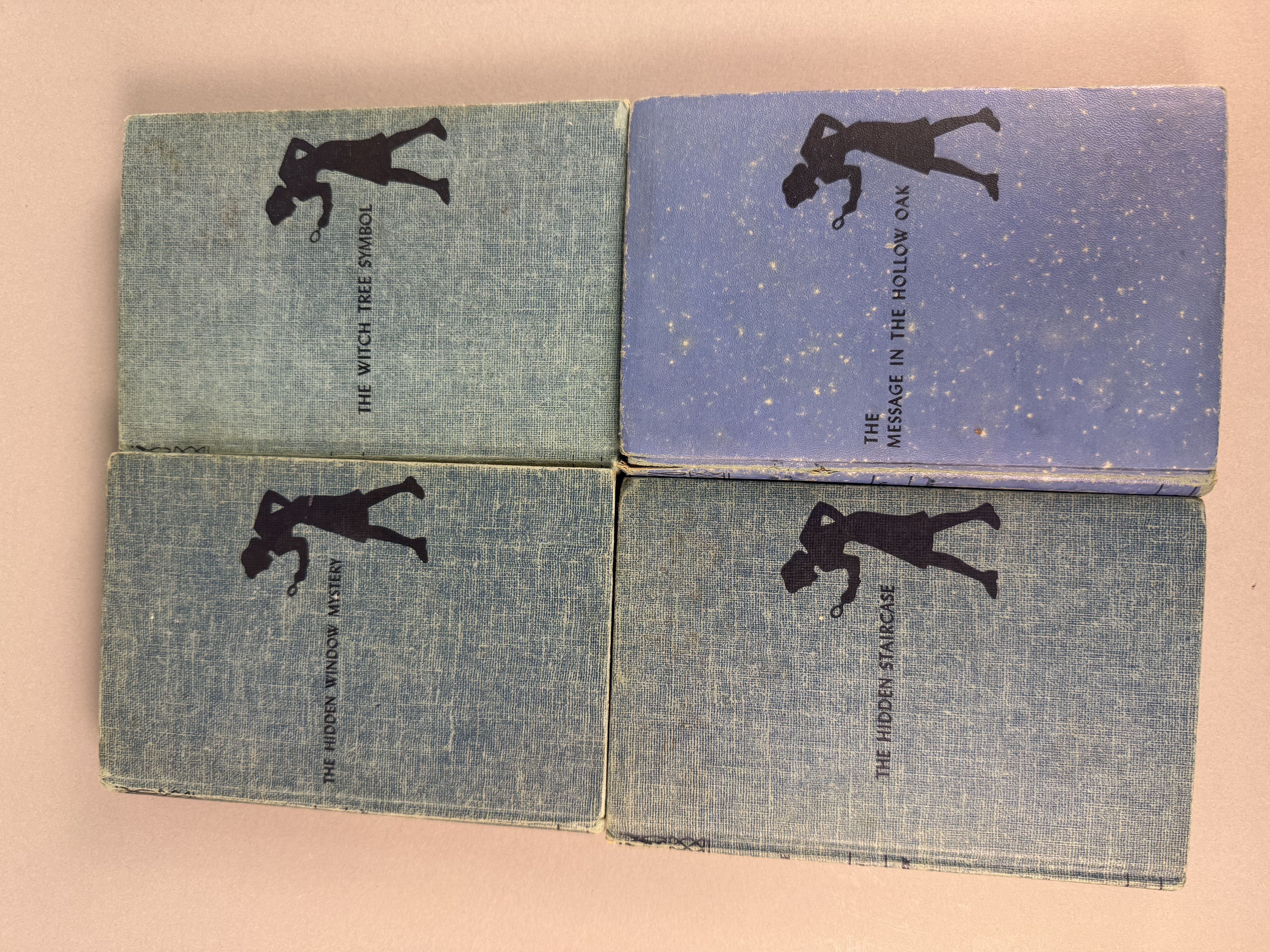 A collection of Nancy Drew Mystery Stories by Carolyn Keene, published by Grosset & Dunlap. The group includes the following titles: The Hidden Staircase (copyright 1930), The Message in the Hollow Oak (copyright 1935), The Witch Tree Symbol (copyright 1955), and The Hidden Window Mystery (copyright 1956). Three volumes are bound in the publisher’s teal tweed-patterned cloth, and one volume is bound in light blue cloth. All four volumes feature the dark blue stamped silhouette of a girl with a magnifying glass on the front cover and spine. Each book contains a black-and-white frontispiece illustration. Height: 7.5 inches Width: 5.25 inches Fair to good. The books are offered without dust jackets. There is visible tanning and foxing to the text block edges and internal pages. The cloth bindings show shelf wear, including rubbing and fraying at the spine ends and corners. Staining and fading are present on the covers, most notably on the light blue volume. Spines remain intact with legible titles.